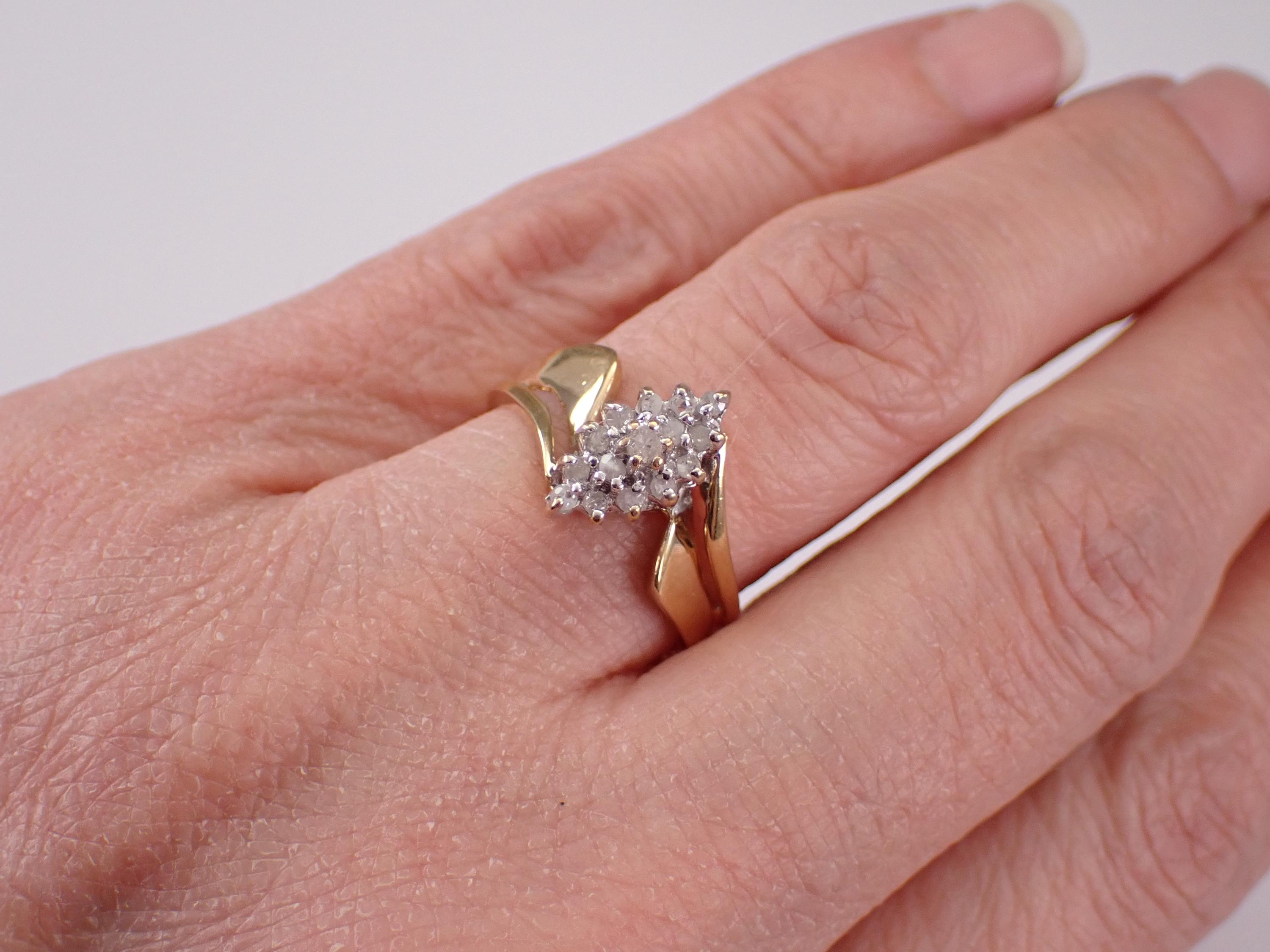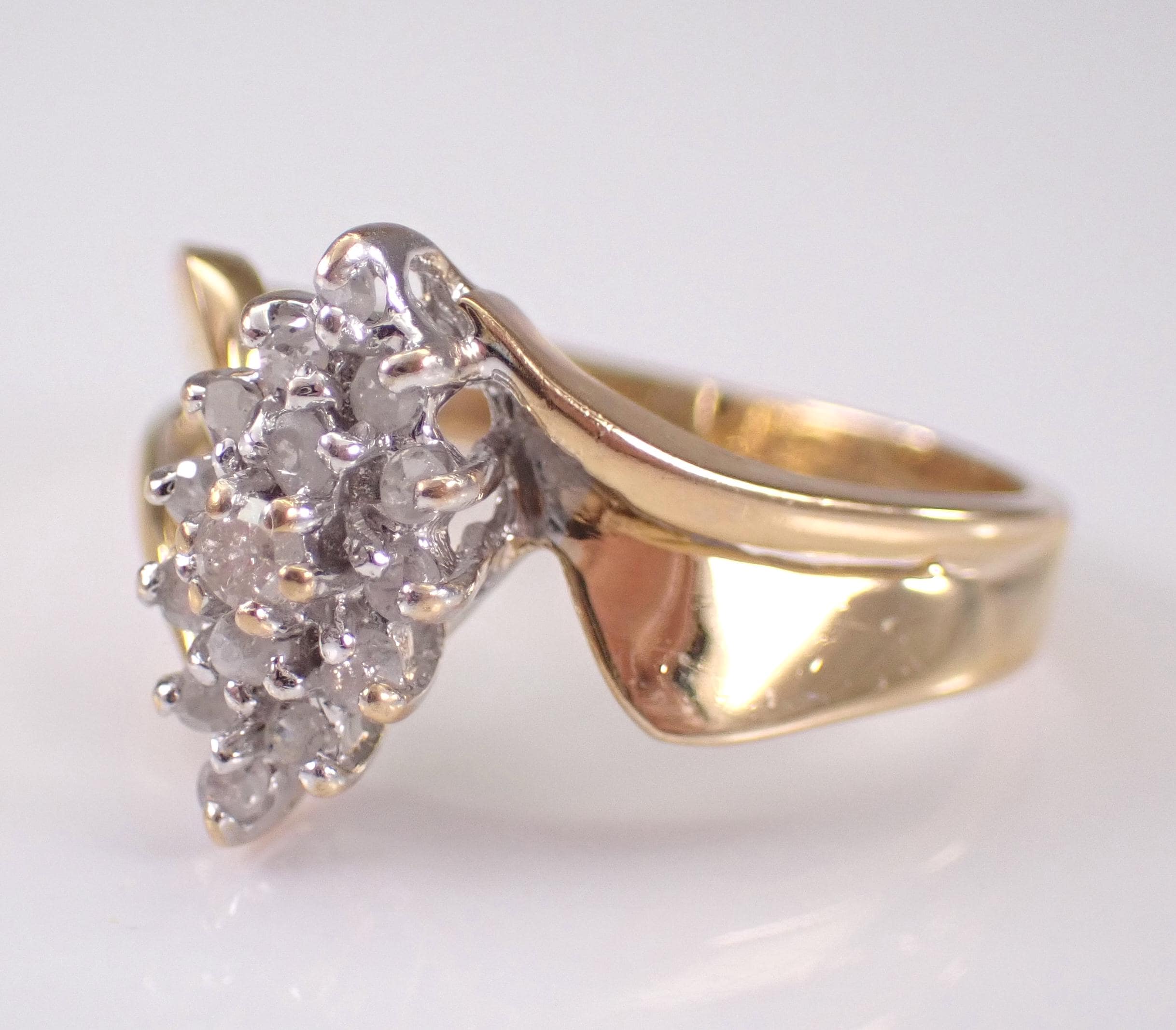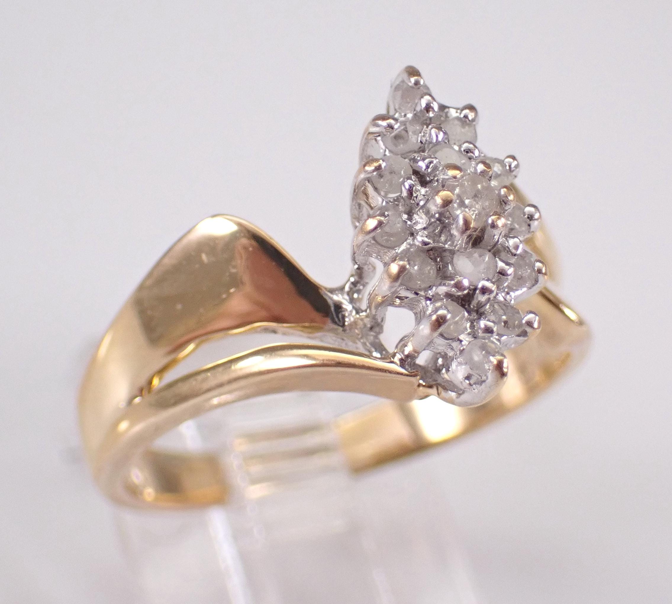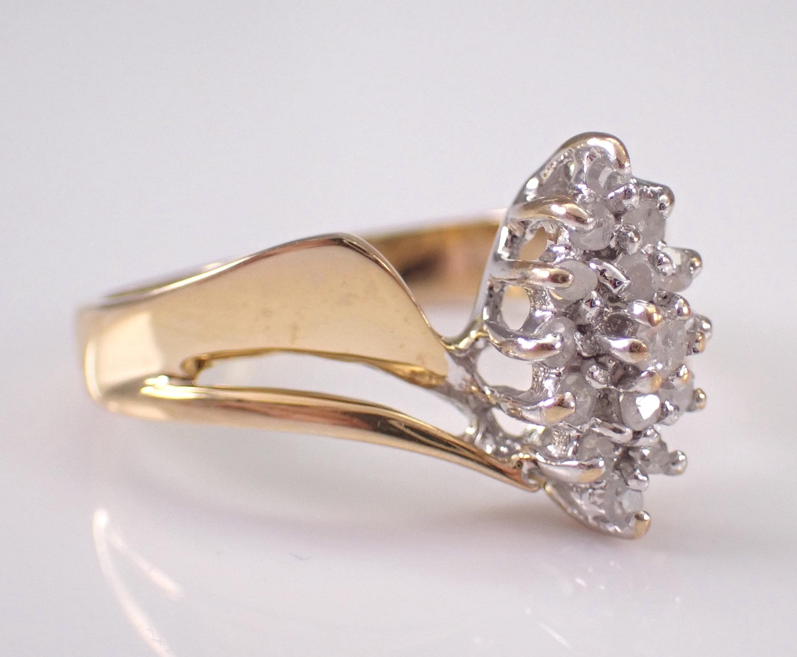 Vintage Yellow Gold Diamond Cluster Ring. This ring is set with fifteen Round Diamonds. These diamonds are H color, I2/I3 clarity and weigh a total .20 carats. The ring is 10KT Yellow Gold, weighs 3.0 grams, measures 12 mm along the finger and is a finger size 7 1/4, which can be resized (please inquire about sizing with the finger size you need). I will ship this ring promptly in a gift box.