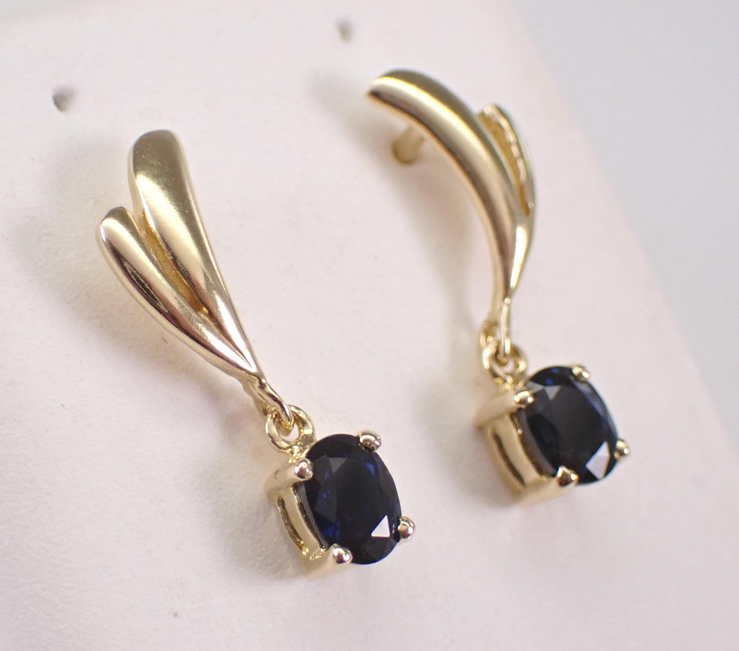 18K Yellow Gold Sapphire Dangle Earrings. There are two genuine Oval Sapphires set to dangle off each earring. These Sapphires measure 5 X 4 mm each and weigh a total of 1 carat. These earrings are 18KT Yellow Gold and weigh a total of 2.0 grams. These earrings are for pierced ears, measure 18 mm in length and have a friction post backings that are 14K Gold. I will ship these earrings promptly in a gift box.