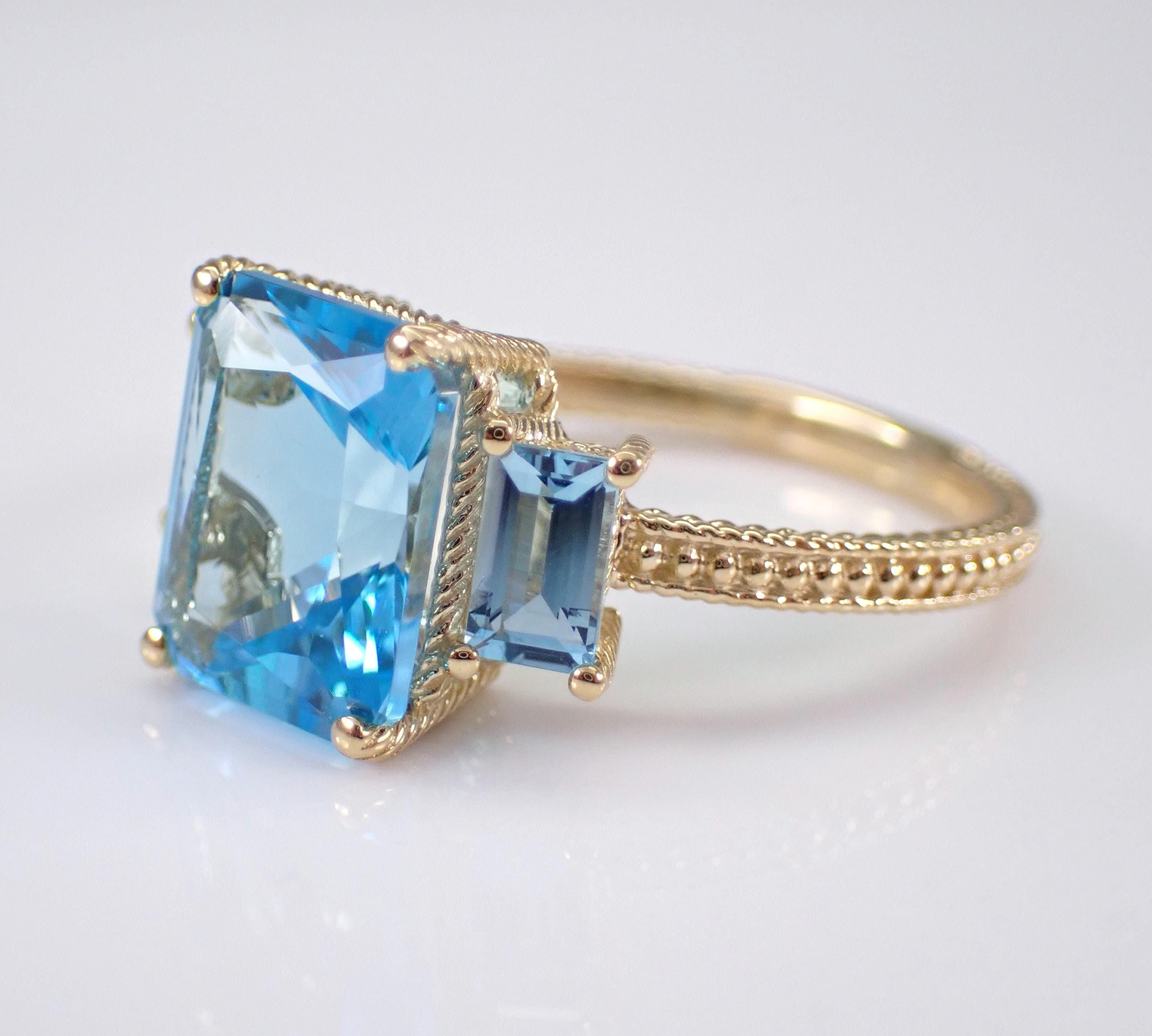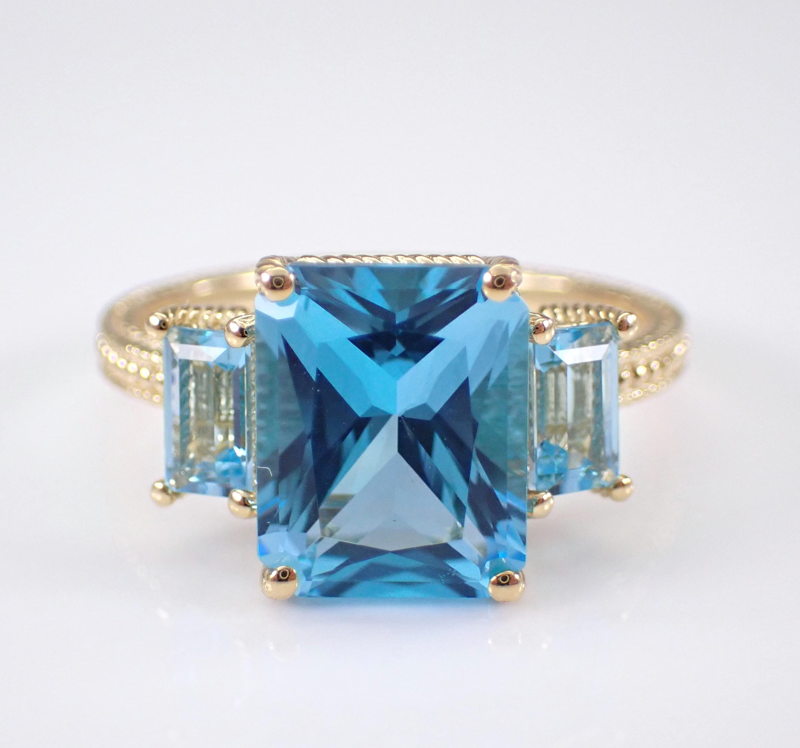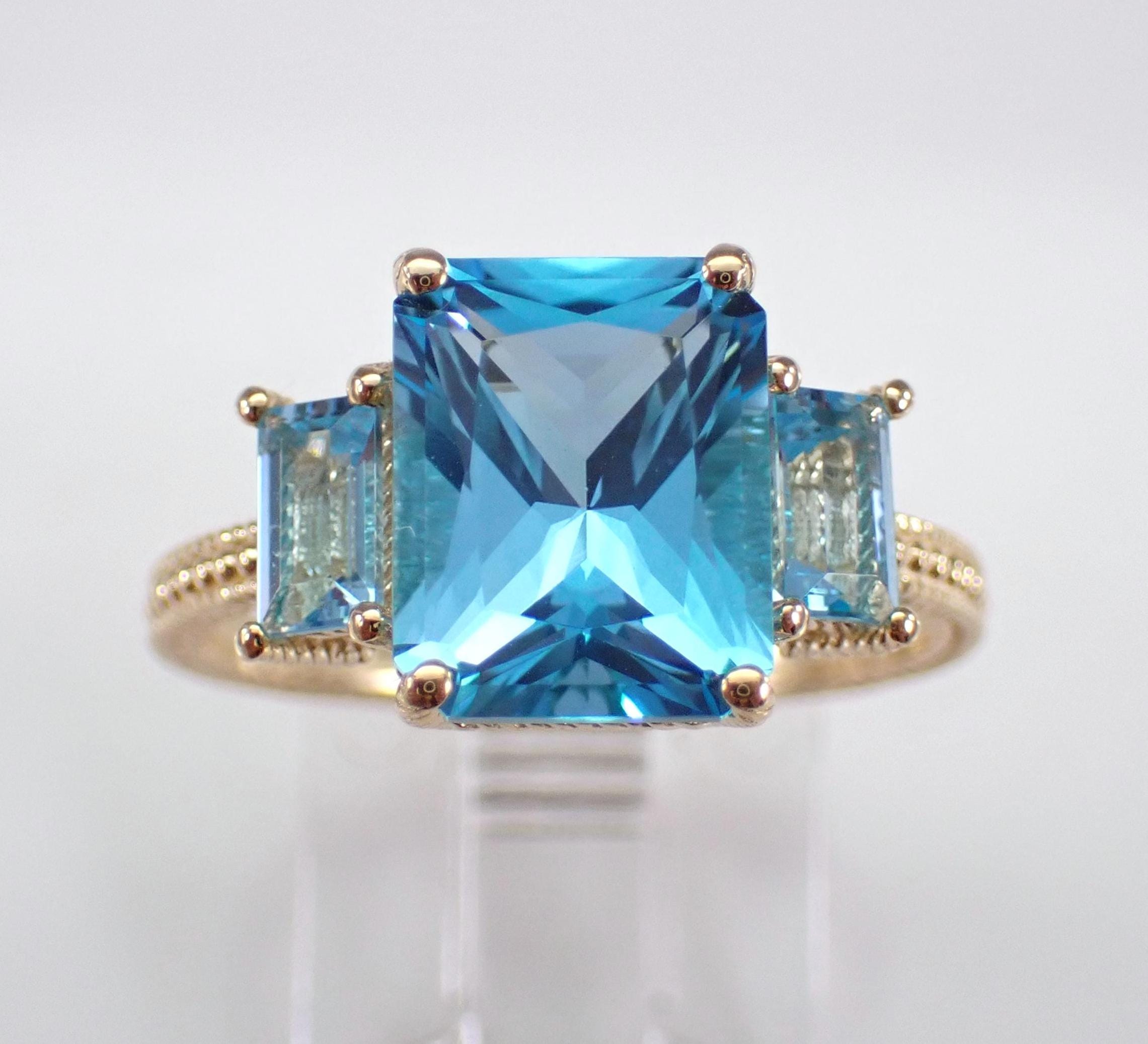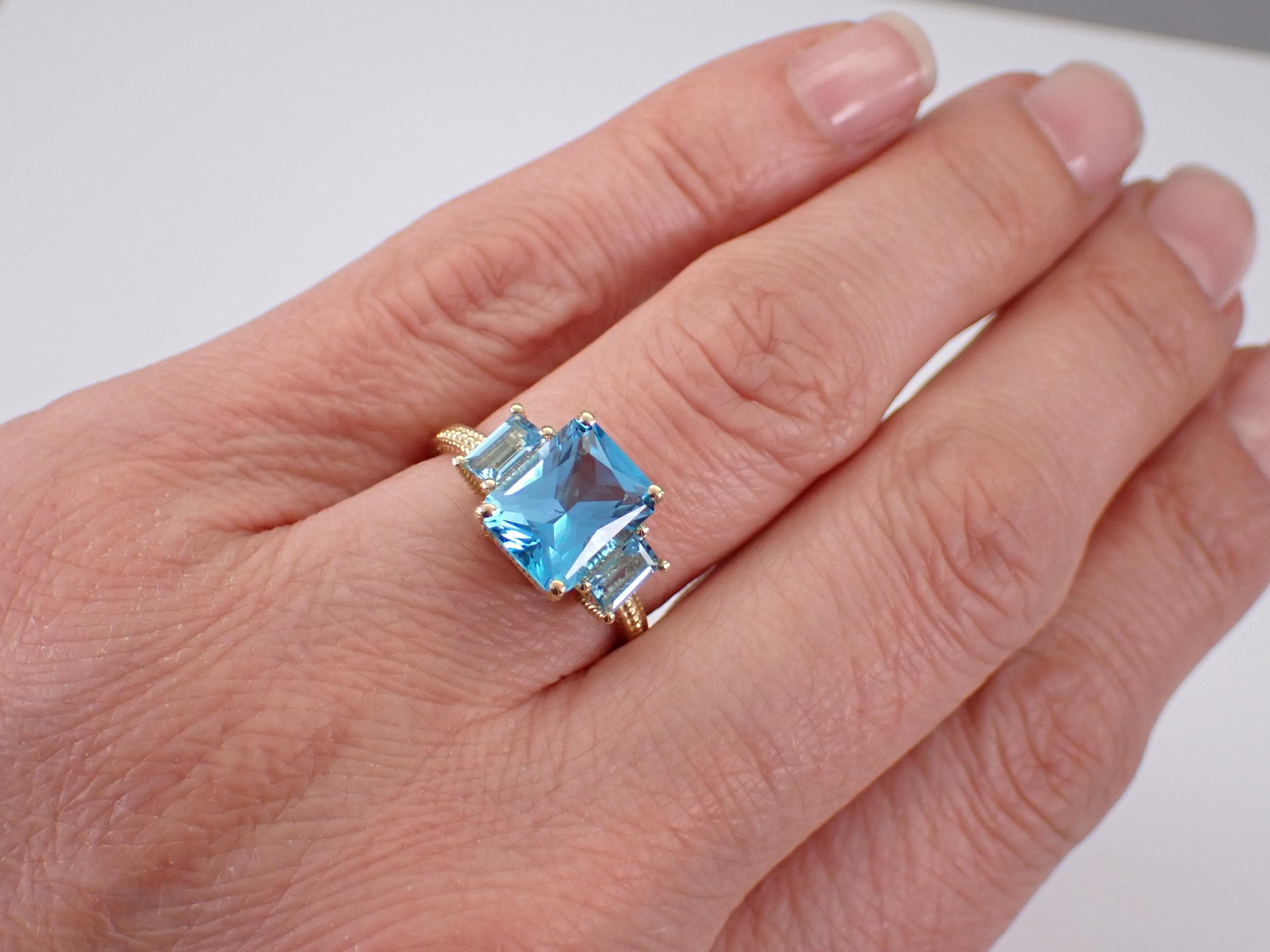 14K Yellow Gold Blue Topaz Three Stone Engagement Ring. This ring is set with one natural Radiant Cut Blue Topaz in the center and two Emerald Cut Blue Topaz on the sides. The center Blue Topaz measures 10 X 8 mm, the side Blue Topaz measure 5 X 3 mm each and all the gemstone combine to a total weight of 4 1/2 carats. This ring is 14KT Yellow Gold, weighs 3.6 grams and is a finger size 7, which can be resized (please inquire about sizing with the finger size you need). This ring will be accompanied by an appraisal by a GIA Certified Diamond Grader with the retail replacement value of $1,485.00. I will ship this ring promptly in a gift box.