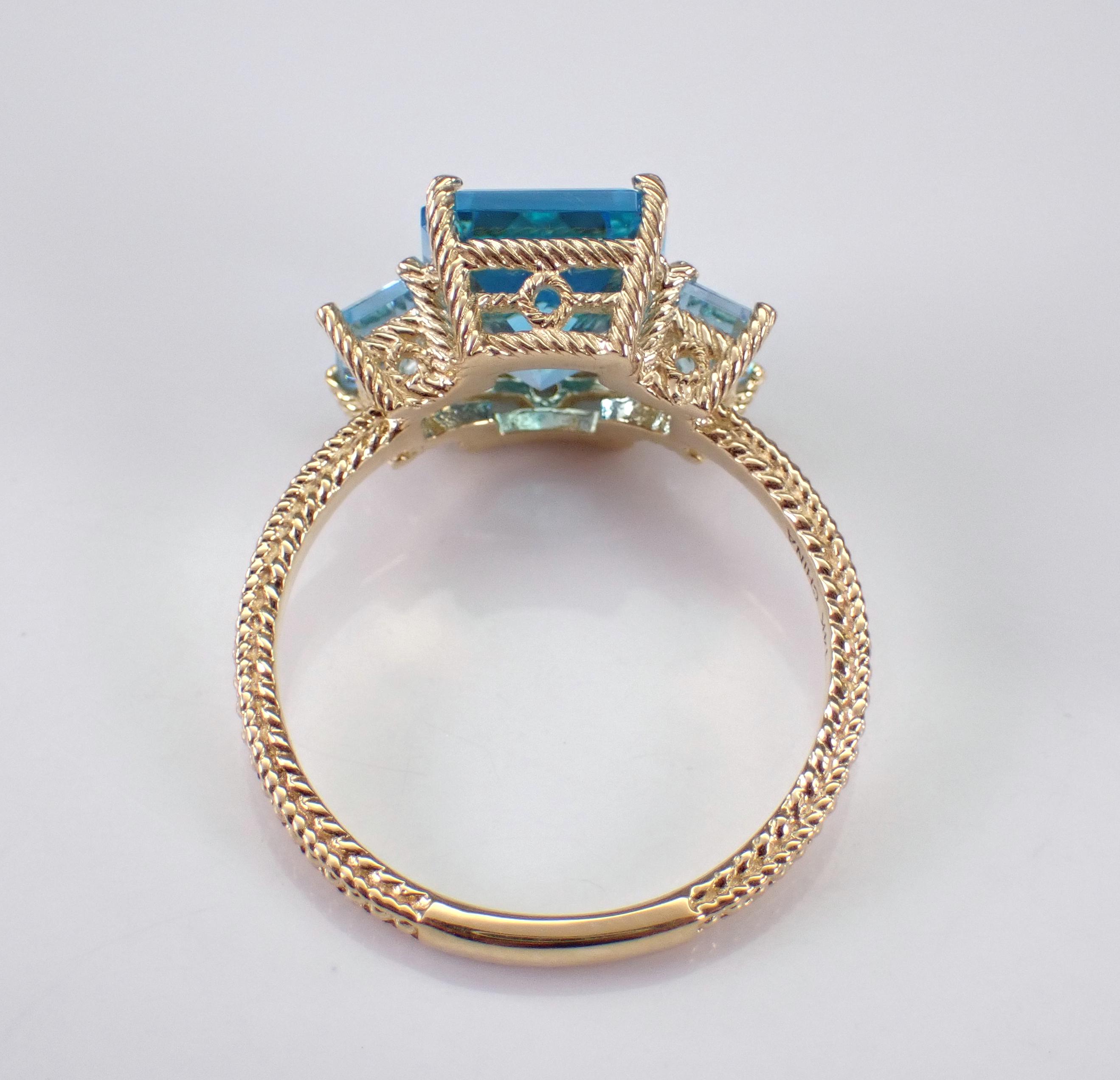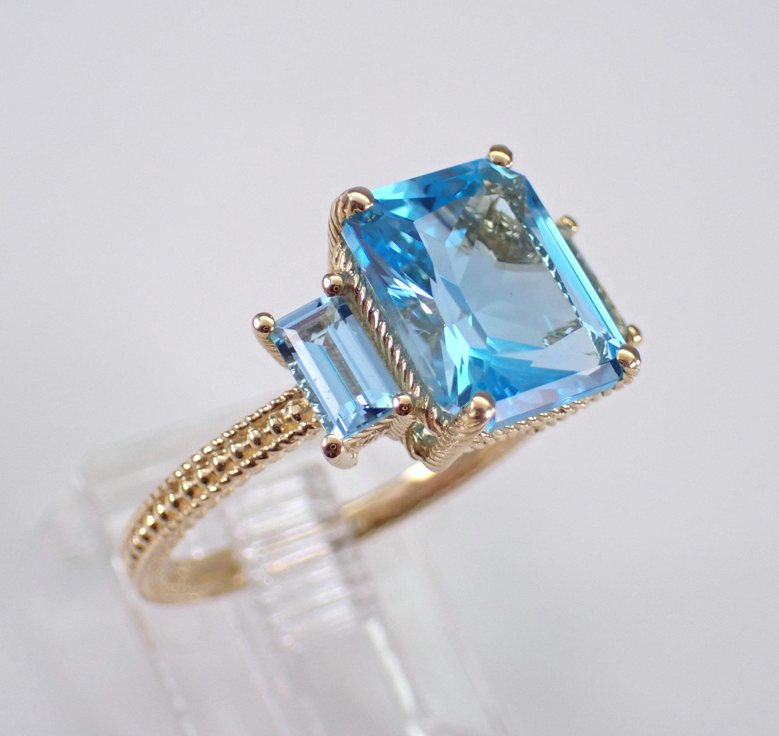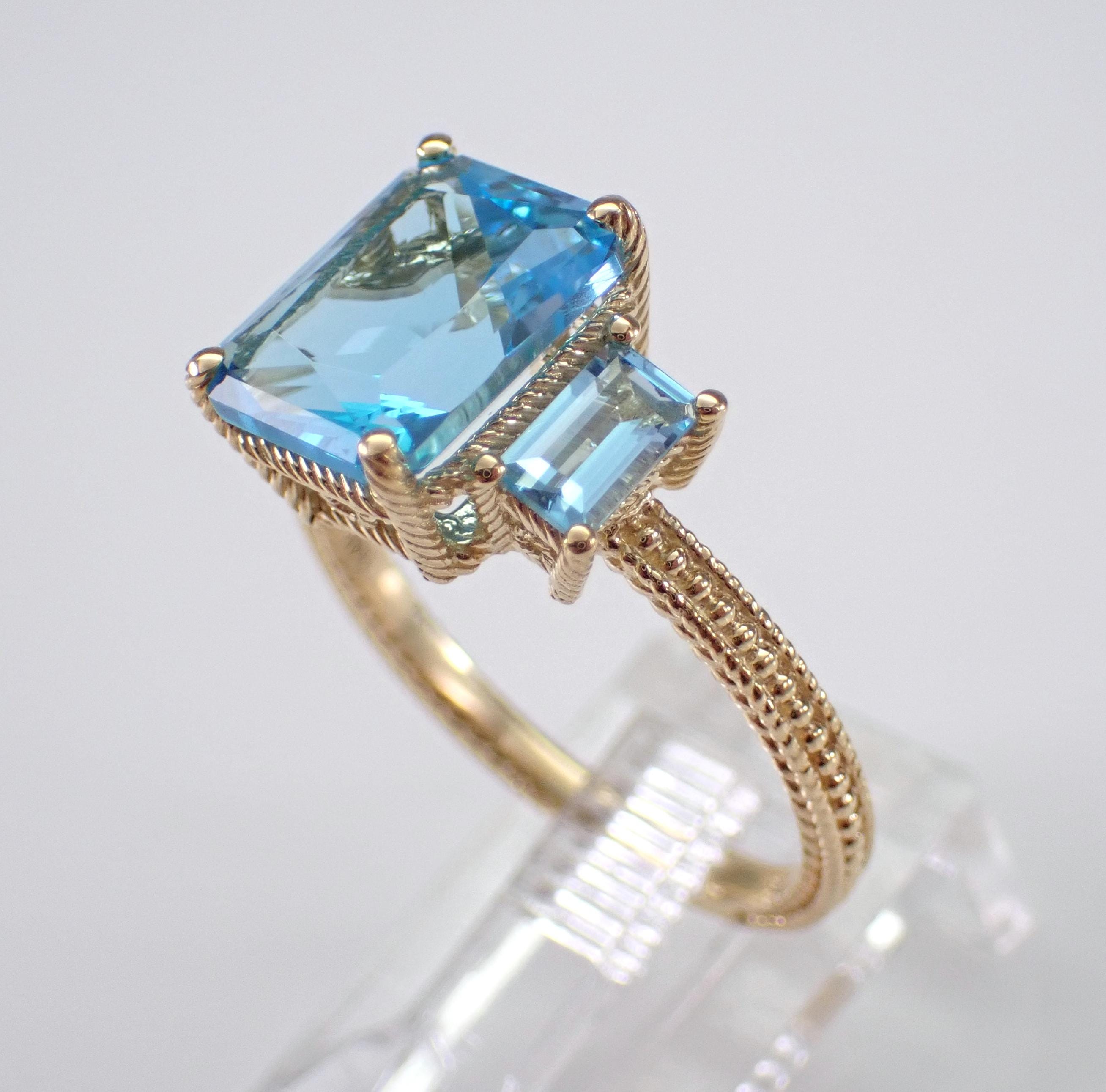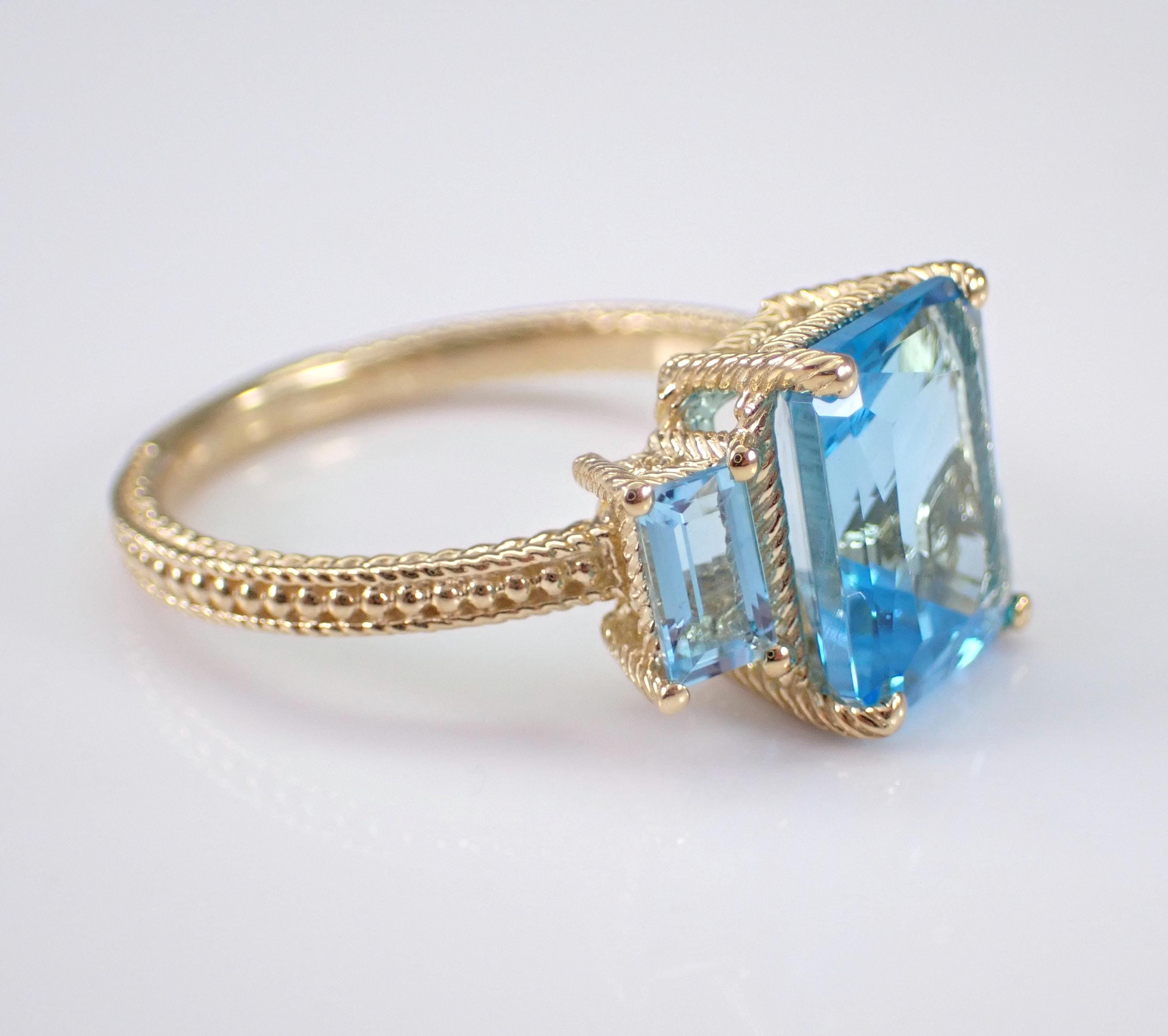 14K Yellow Gold Blue Topaz Three Stone Engagement Ring. This ring is set with one natural Radiant Cut Blue Topaz in the center and two Emerald Cut Blue Topaz on the sides. The center Blue Topaz measures 10 X 8 mm, the side Blue Topaz measure 5 X 3 mm each and all the gemstone combine to a total weight of 4 1/2 carats. This ring is 14KT Yellow Gold, weighs 3.6 grams and is a finger size 7, which can be resized (please inquire about sizing with the finger size you need). This ring will be accompanied by an appraisal by a GIA Certified Diamond Grader with the retail replacement value of $1,485.00. I will ship this ring promptly in a gift box.