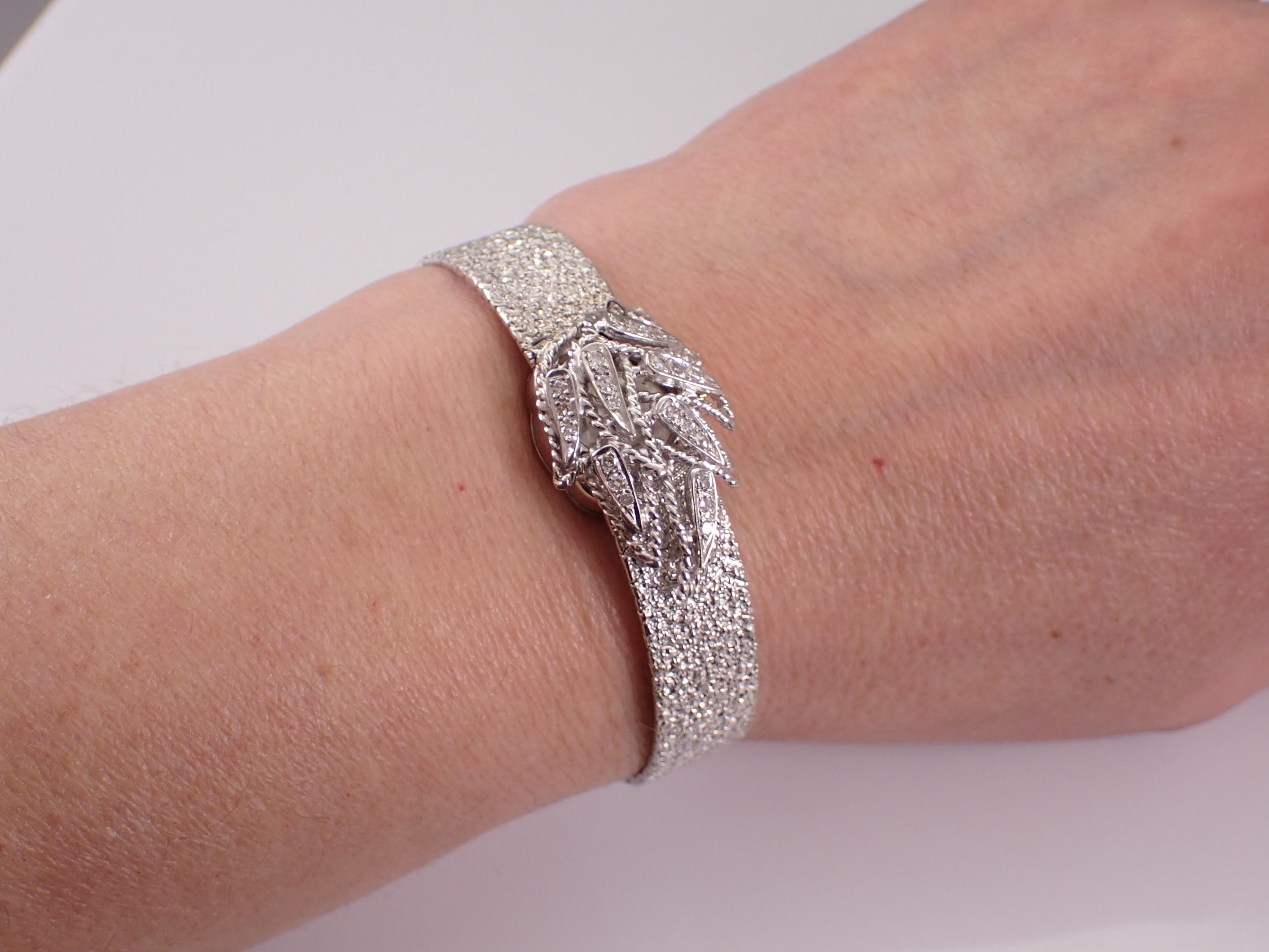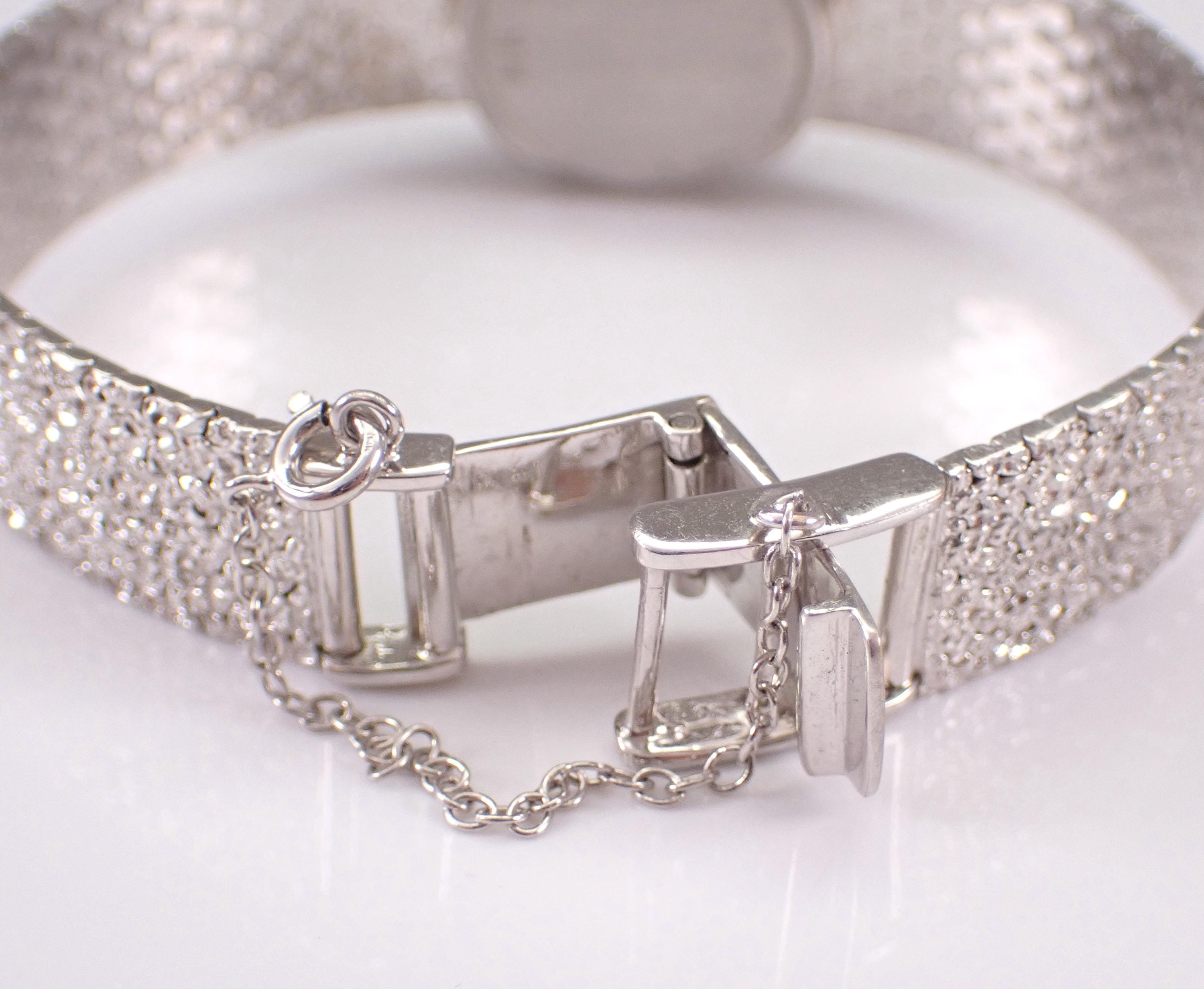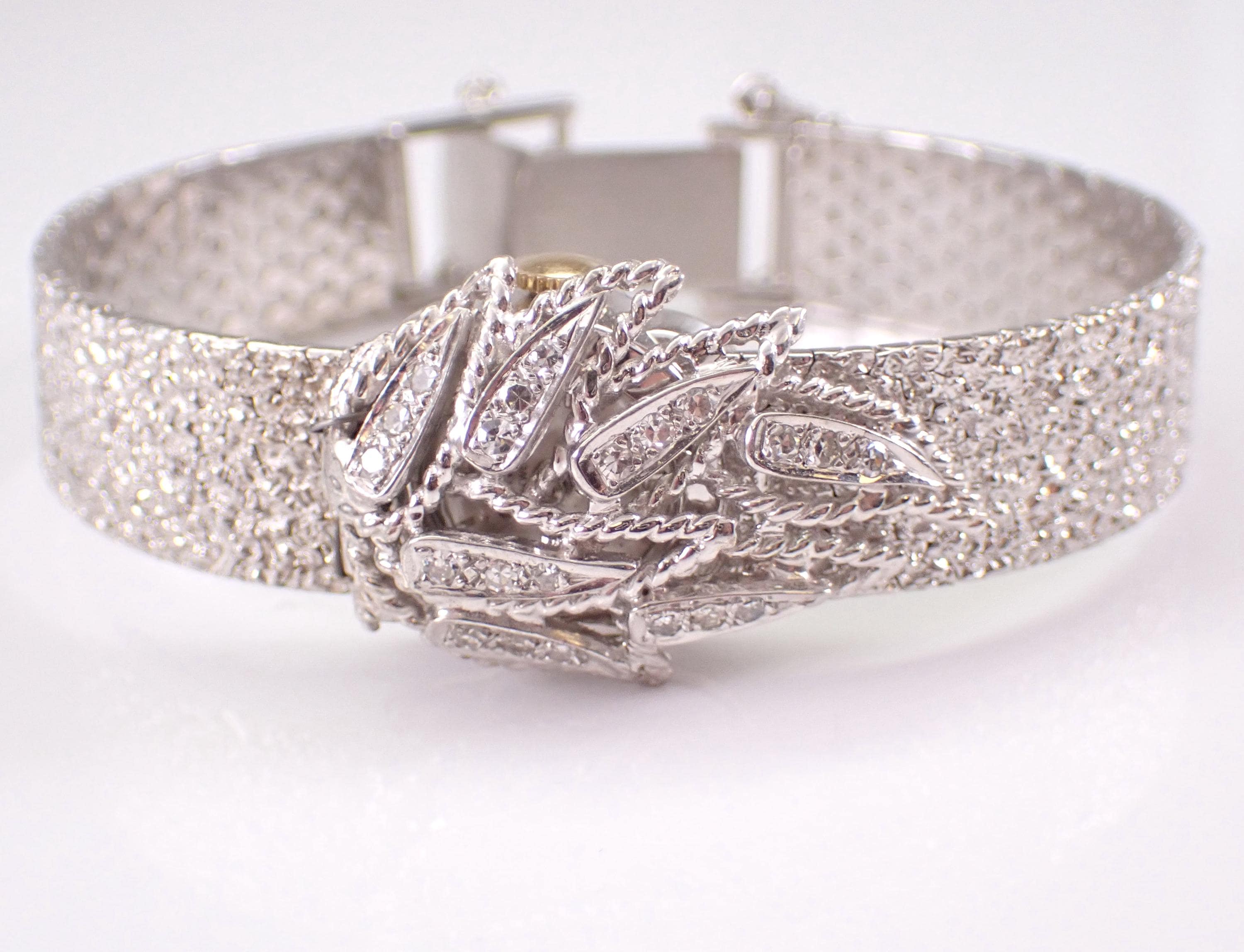 Vintage Antique Cortina Diamond Bracelet Watch, dating back to the 1940's. Hand wound Mechanical movement needs an overhaul as the watch DOES NOT work. The watch is crafted in a 14 Karat White Gold and is set with twenty-one genuine Round Diamonds. These diamonds are G color, SI clarity and weigh a total of .30 carats. This watch is very unique and has a flip top that opens on a hinge to reveal the watch. The watch dial measures 15mm in diameter. This watch weighs 31.8 grams and measure 6 1/8" in full length. The watch also has a safety chain for added security. It will ship in a gift box (not original box), accompanied by an appraisal for insurance and authentication purposes.