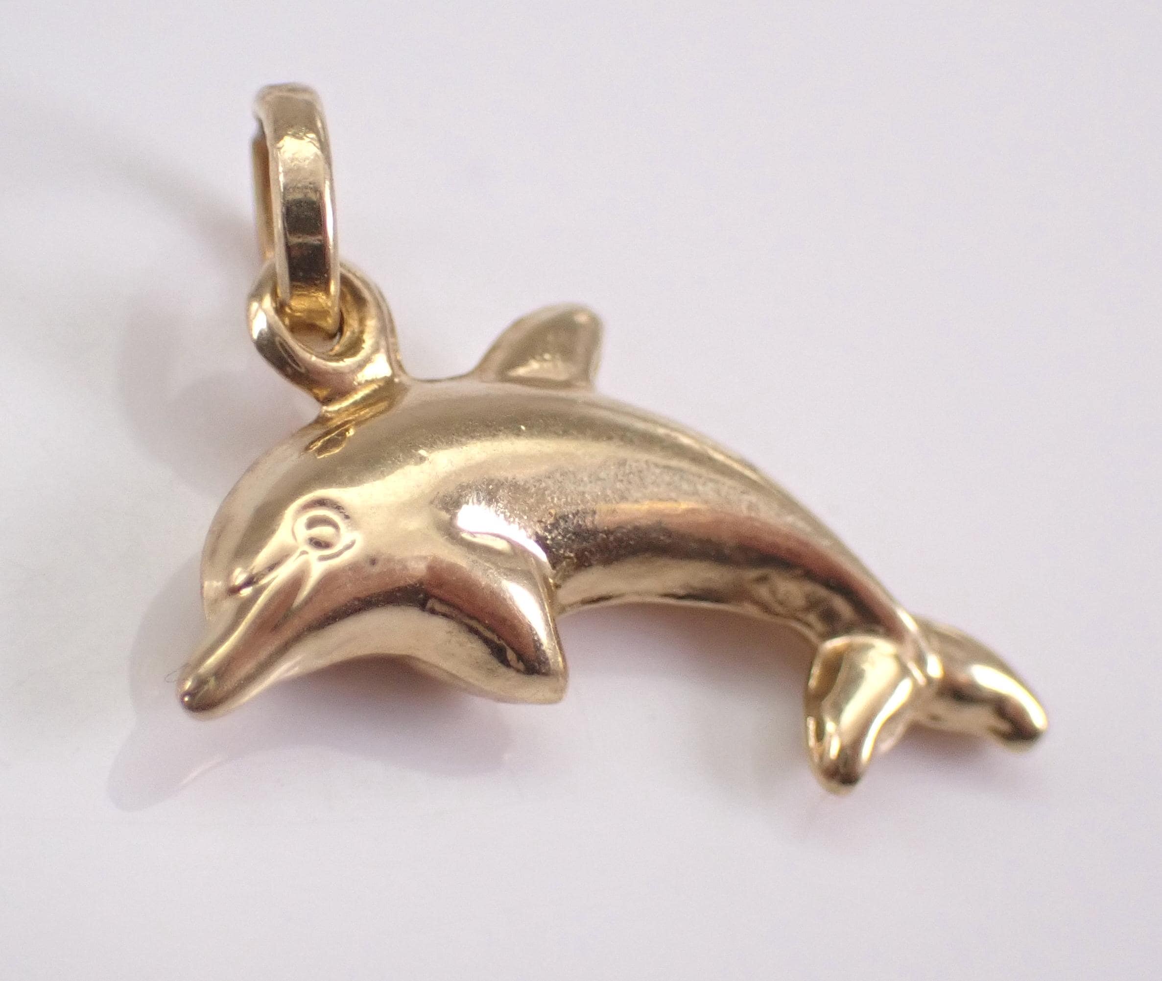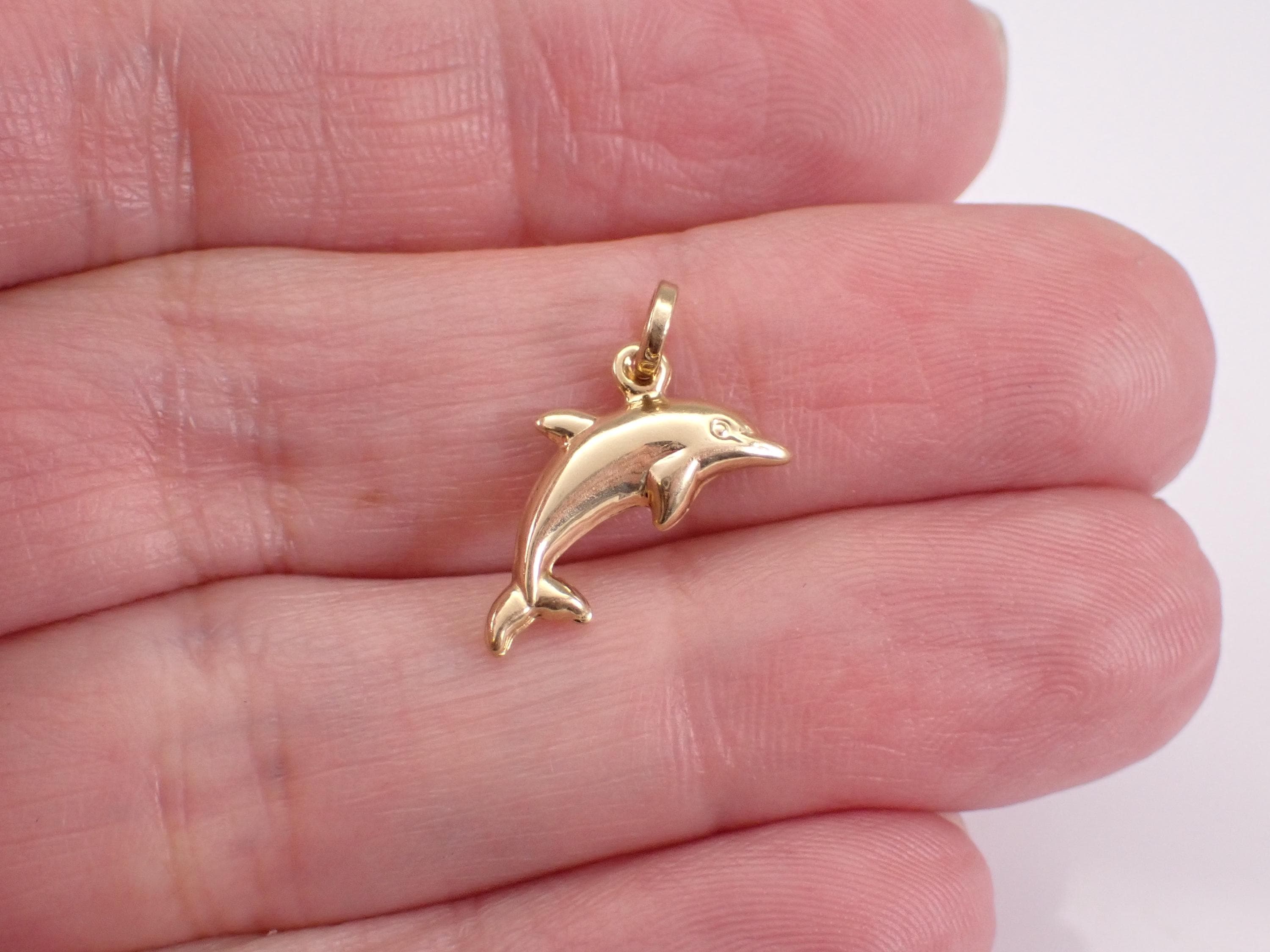 Vintage 14K Yellow Gold Dolphin Charm Pendant. This charm is 14K Yellow gold and weighs .5 grams. This charm measures 15 mm in length. This is a very unique charm, same on both sides, that will make a perfect gift for anyone. I will ship this pendant promptly in a gift pouch.