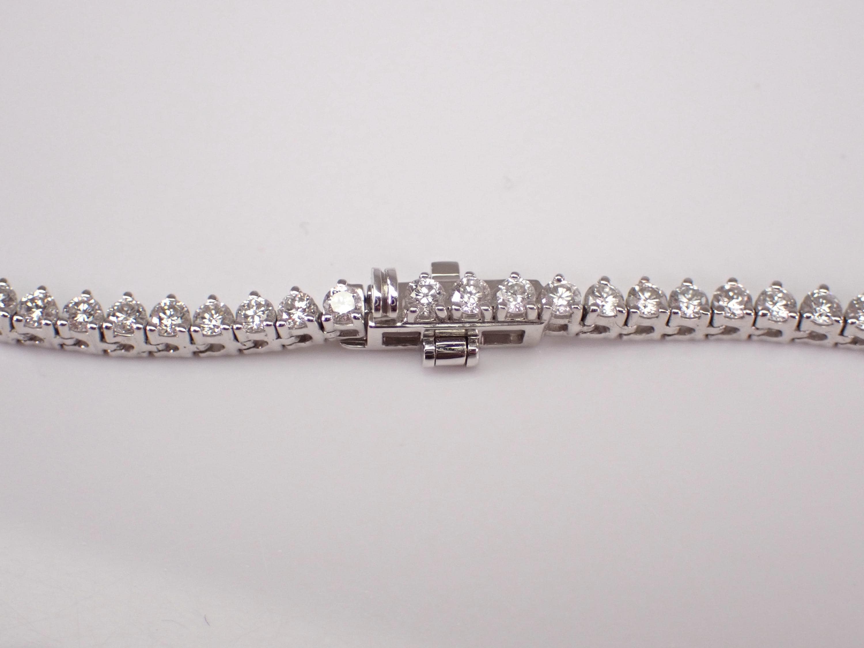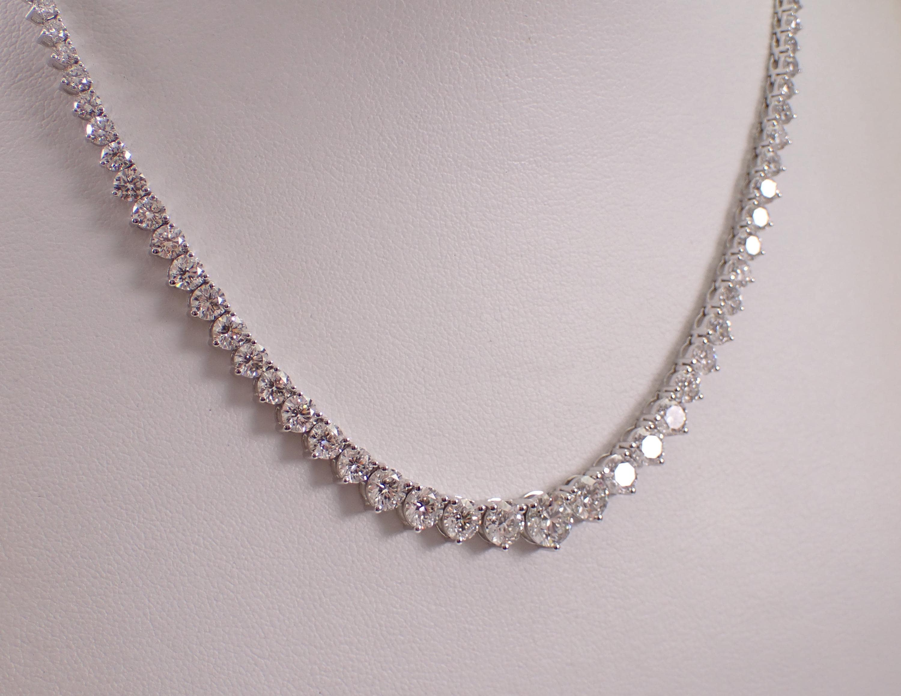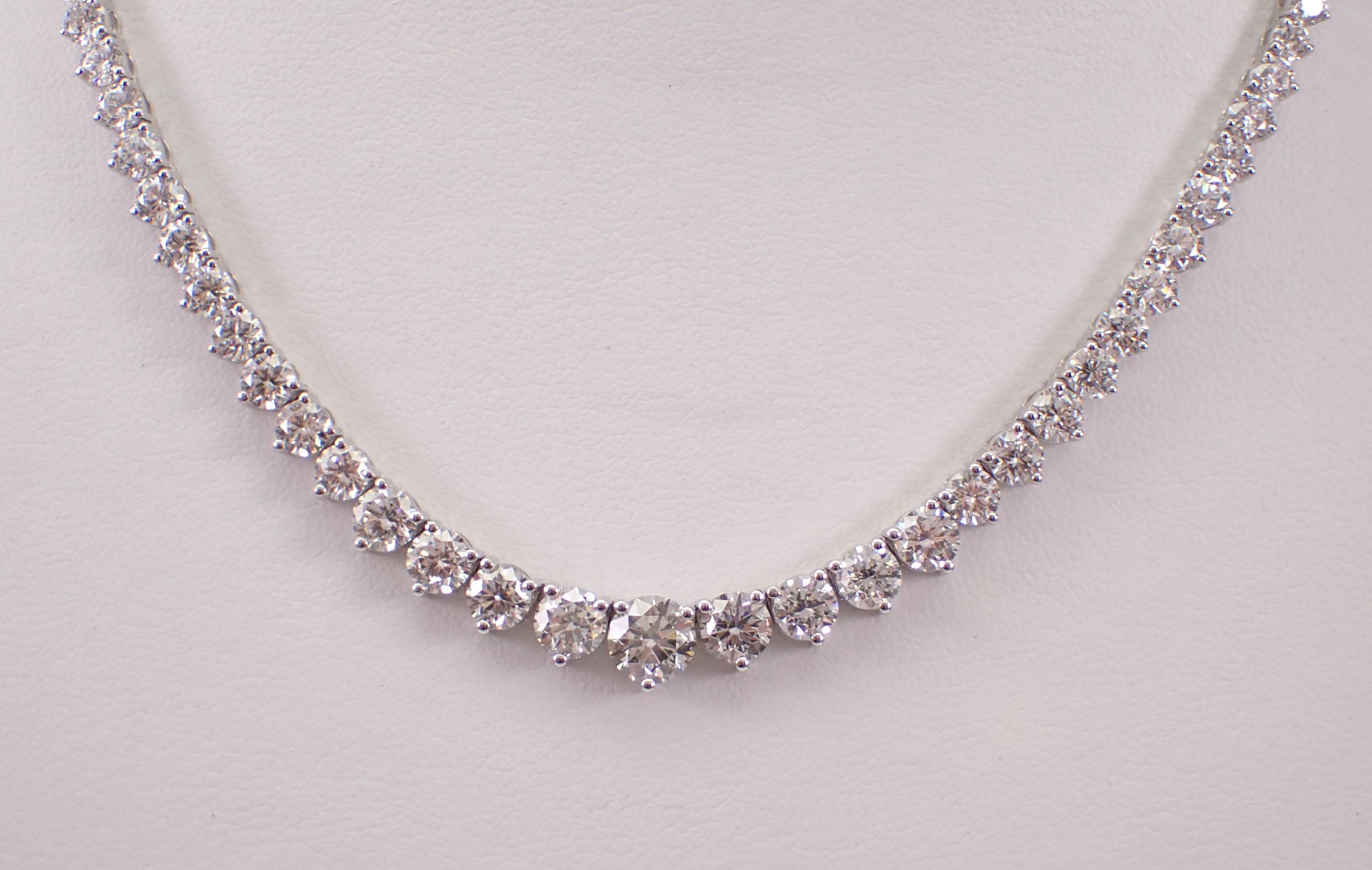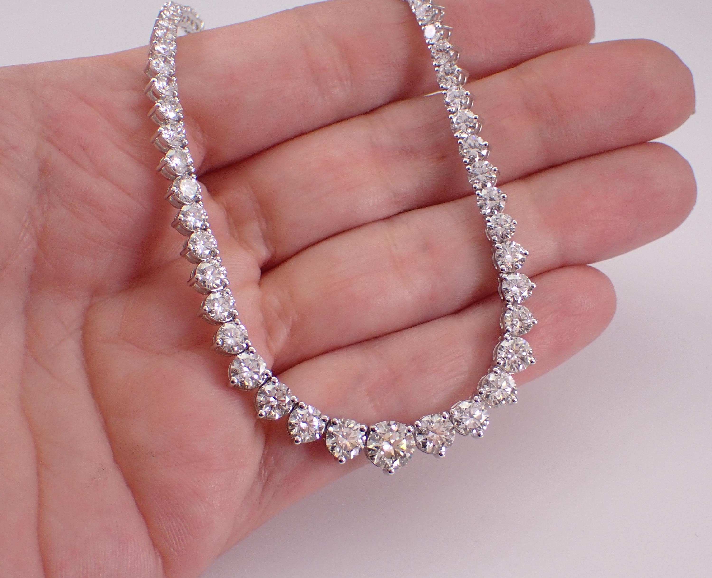 14K White Gold Diamond Riviera Tennis Necklace. This necklace is set with Lab Grown Round Brilliant Diamonds. These diamonds are graduated in size with the largest in the front, F color, VS1 clarity and weigh a total of 15.33 carats. This necklace is 14KT White Gold and measures 16" in length. This necklace weighs 18.0 grams and will be accompanied by an appraisal for insurance and authentication purposes. I will ship this necklace promptly in a beautiful gift box.