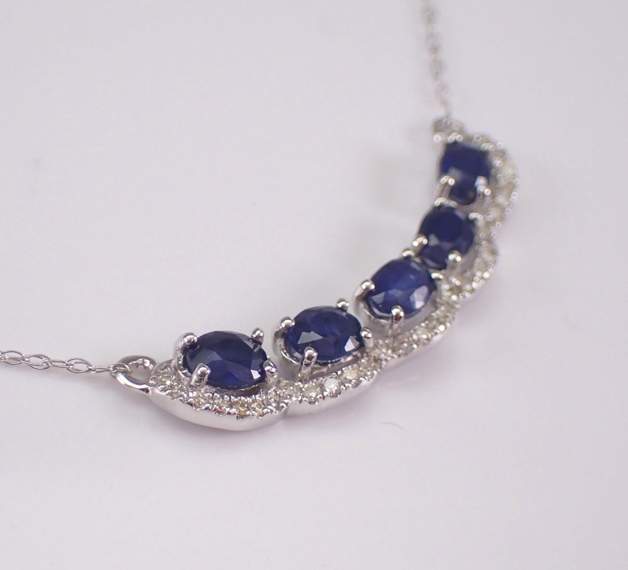 14K White Gold Sapphire and Diamond Bar Necklace. This necklace is set with five genuine Oval Sapphires and thirty-two natural Round Brilliant Diamonds. These Sapphires measure 5 X 3 mm each and amount to a total weight of 1 1/4 carat. The diamonds are H color, I1 clarity and weigh a total of 1/4 carat. This pendant is 14K White Gold and comes attached to a 14K White Gold chain that measures 18.5" in overall length. This necklace weighs 1.8 grams and the centerpiece measures 25 mm across. This necklace will be accompanied by an appraisal written by a GIA Certified Diamond Grader with the retail replacement value of $1,679.00. I will ship this necklace promptly in a beautiful gift box.