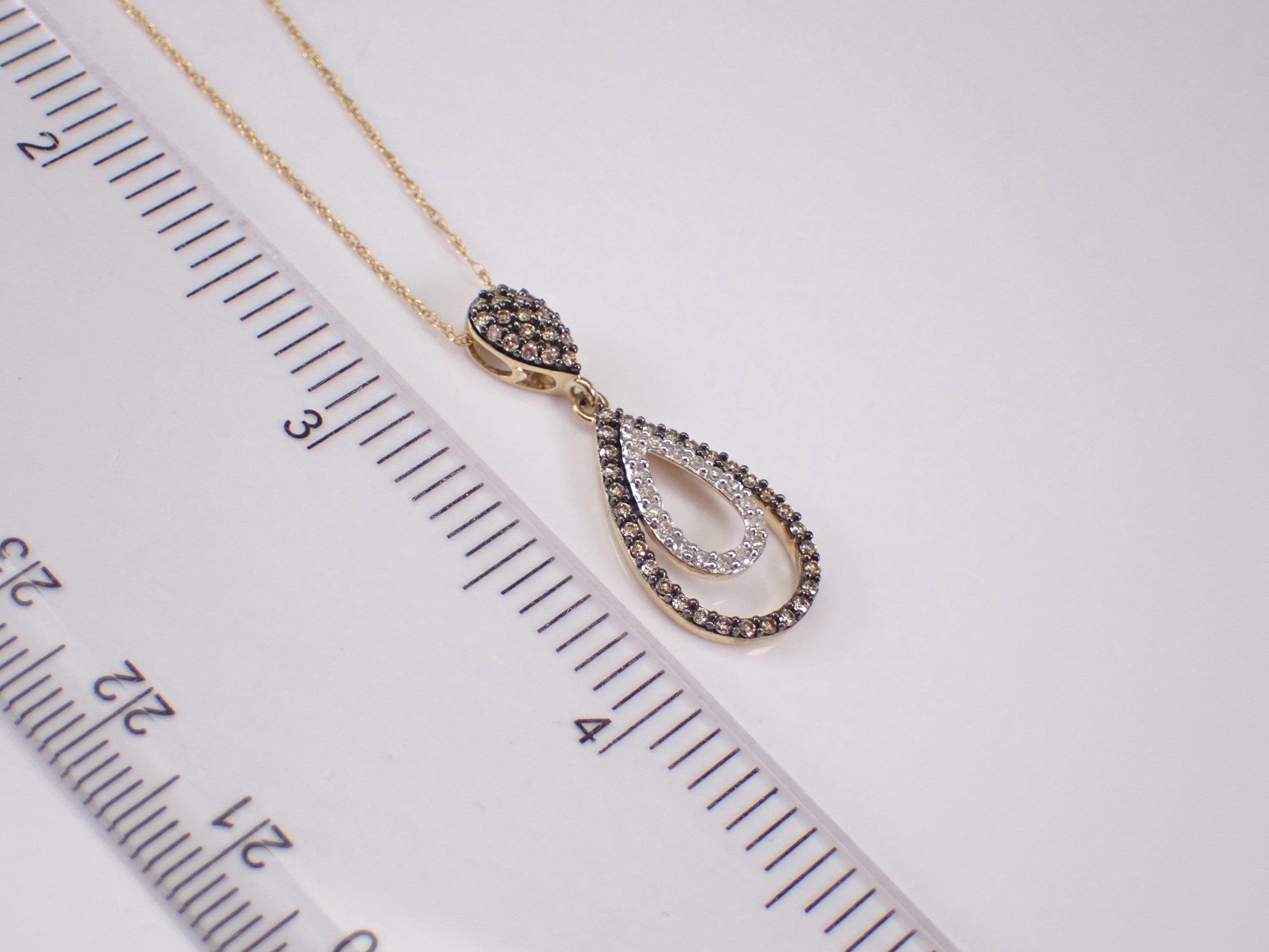 Yellow Gold White and Brown Diamond Teardrop Pendant Necklace with Chain. This pendant is set with eighteen natural round brilliant colorless diamonds and fifty-one Round Brilliant Brown Diamonds. These diamonds are H color (white), SI/I clarity and weigh a total of 1/2 carat. This pendant is 10KT Yellow Gold and comes with an 18" 10KT Yellow Gold chain. Both the pendant and chain weigh a total of 2.0 grams and the pendant measures 29 X 11 mm. This necklace will be accompanied by an appraisal written by a GIA Certified Diamond Grader with the retail replacement value of $1,379.00. I will ship this necklace promptly in a beautiful gift box.