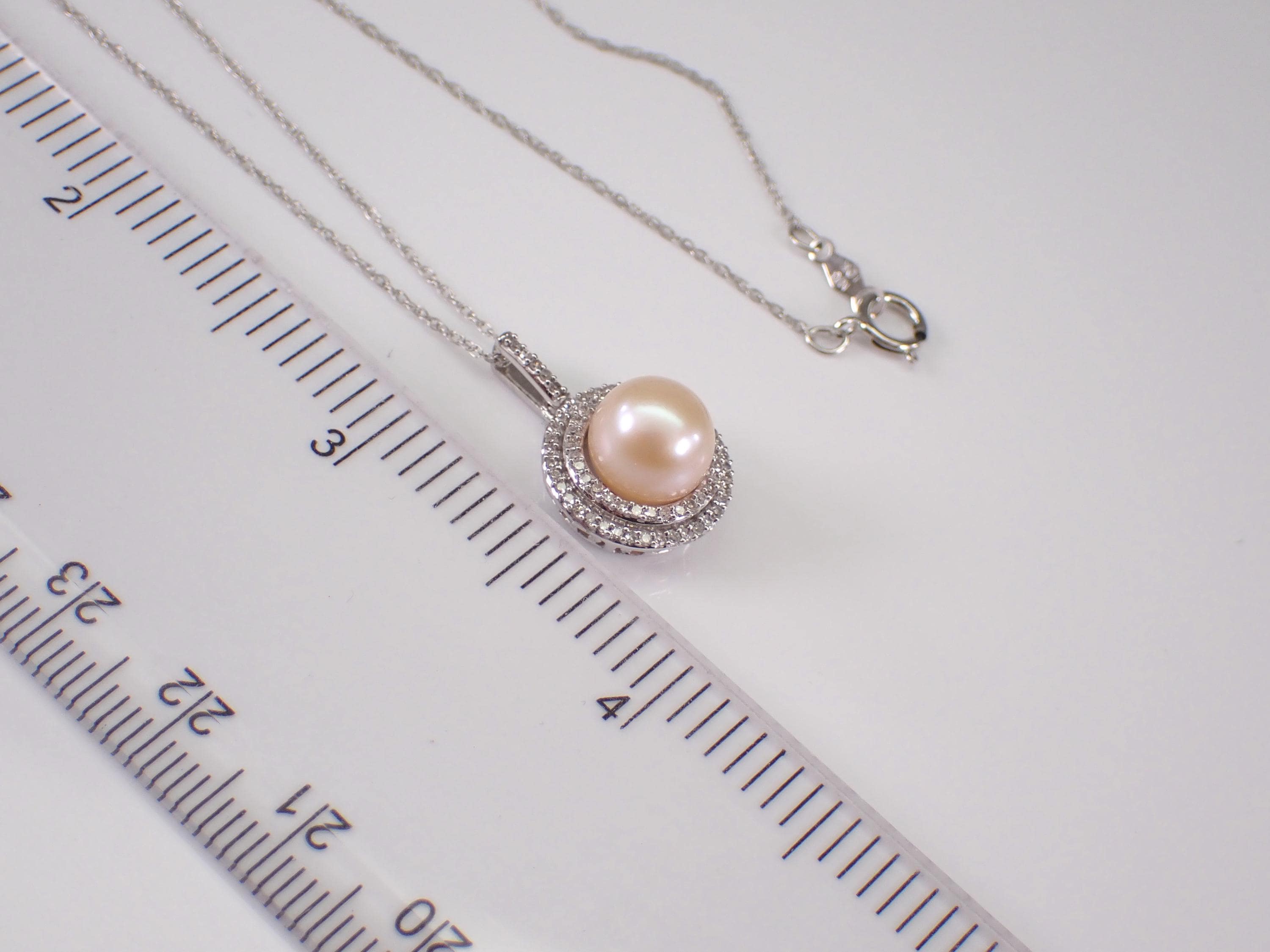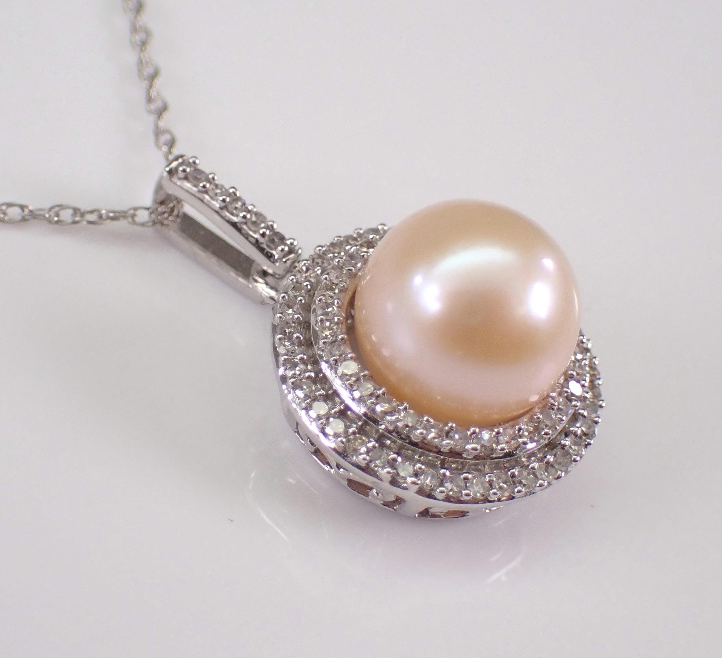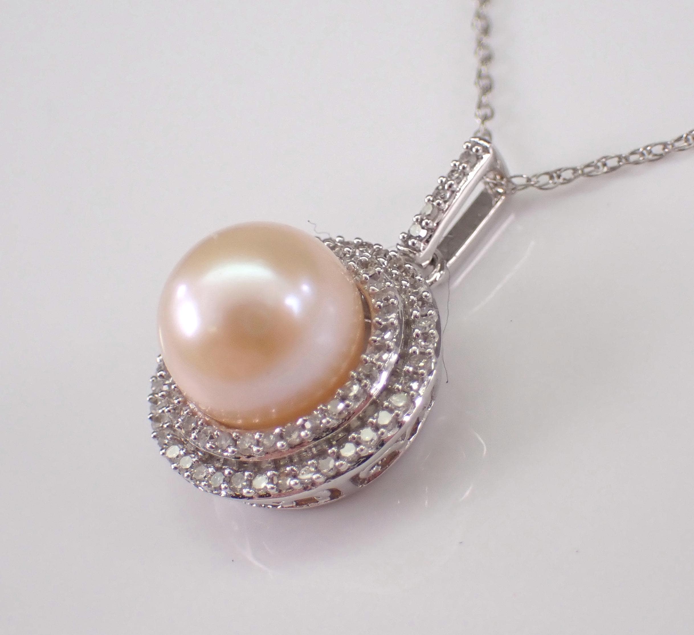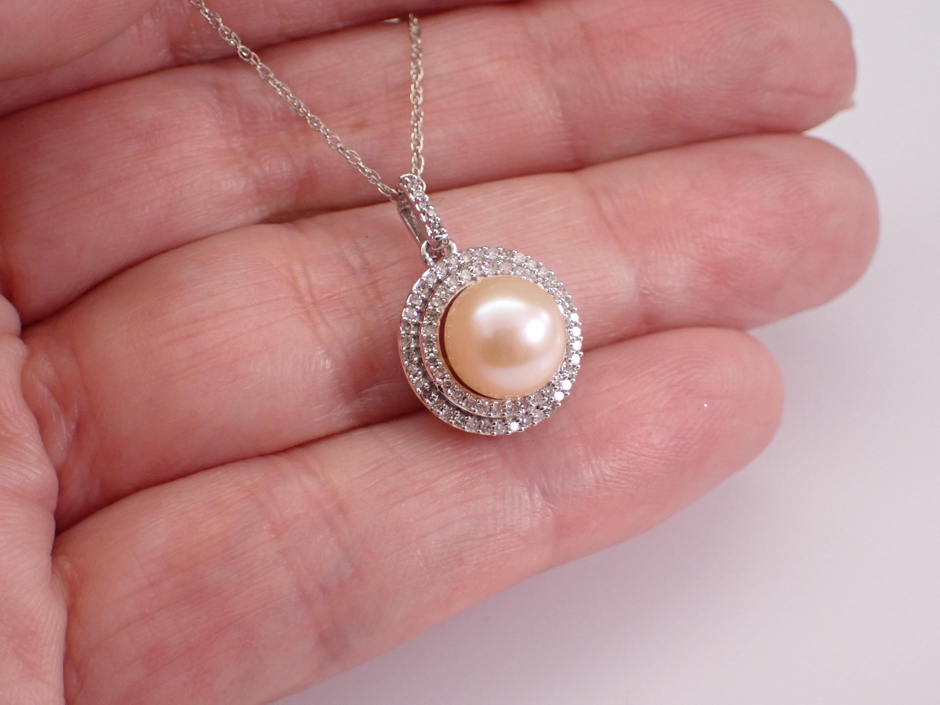 White Gold Diamond and Pearl Halo Pendant Necklace with Chain. This pendant is set with one Round Cultured Pearl and seventy-nine genuine Round Brilliant Diamonds. The diamonds in this pendant are H color, I1 clarity and weigh a total of .35 carat. The pearl in this pendant has a cream colored hue and measures 8 mm in diameter. This pendant is 10K White Gold and comes with an 18" 10KT White Gold chain. The pendant and chain weigh a total of 2.9 grams and the pendant measures 13 mm in diameter. This necklace will be accompanied by an appraisal written by a GIA Certified Diamond Grader with the retail replacement value of $1,475.00. I will ship this necklace promptly in a beautiful gift box.
