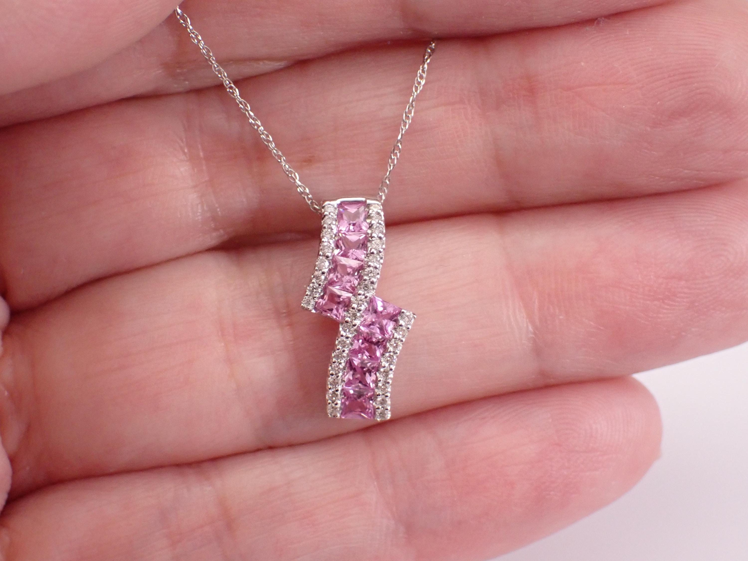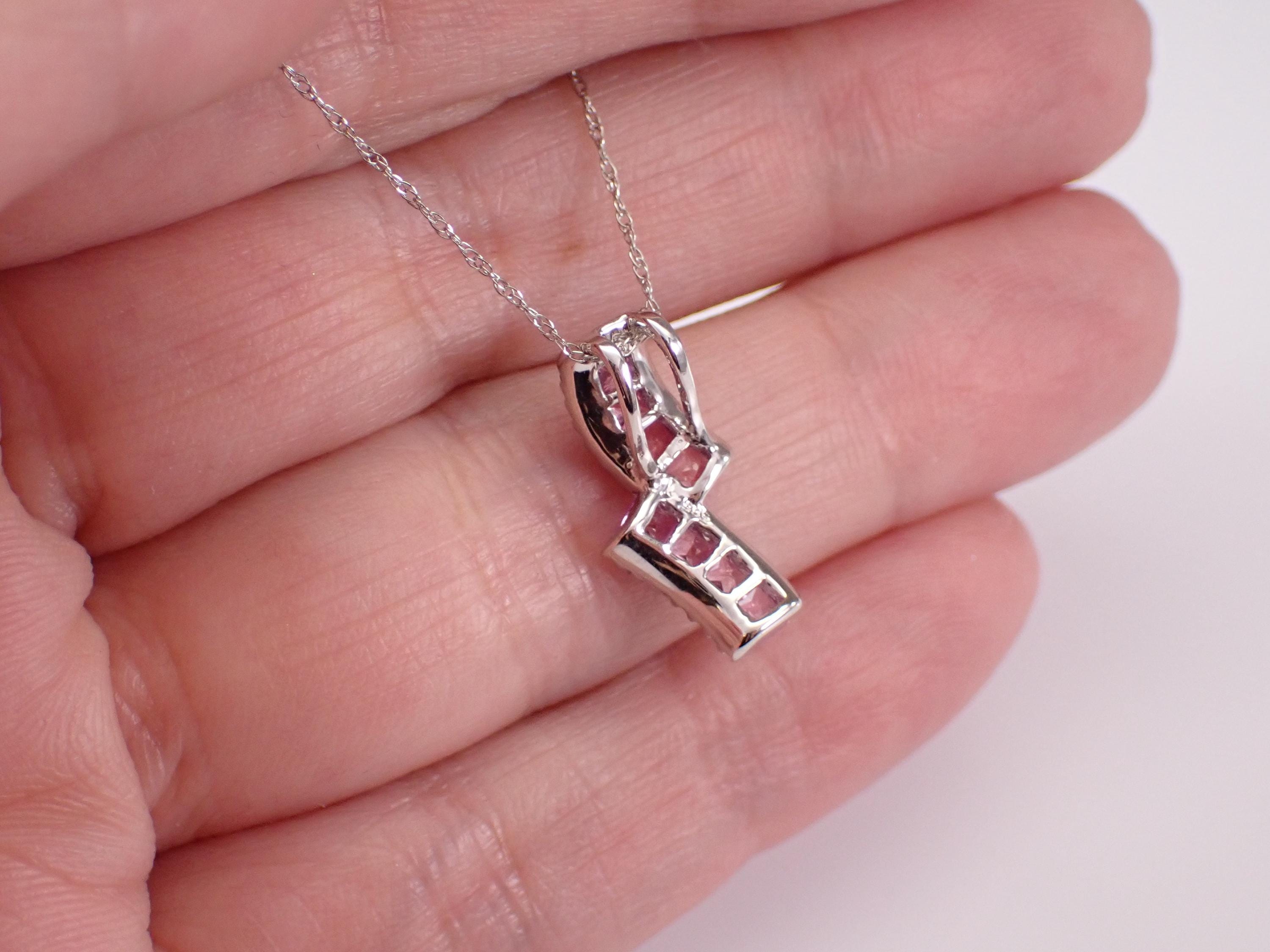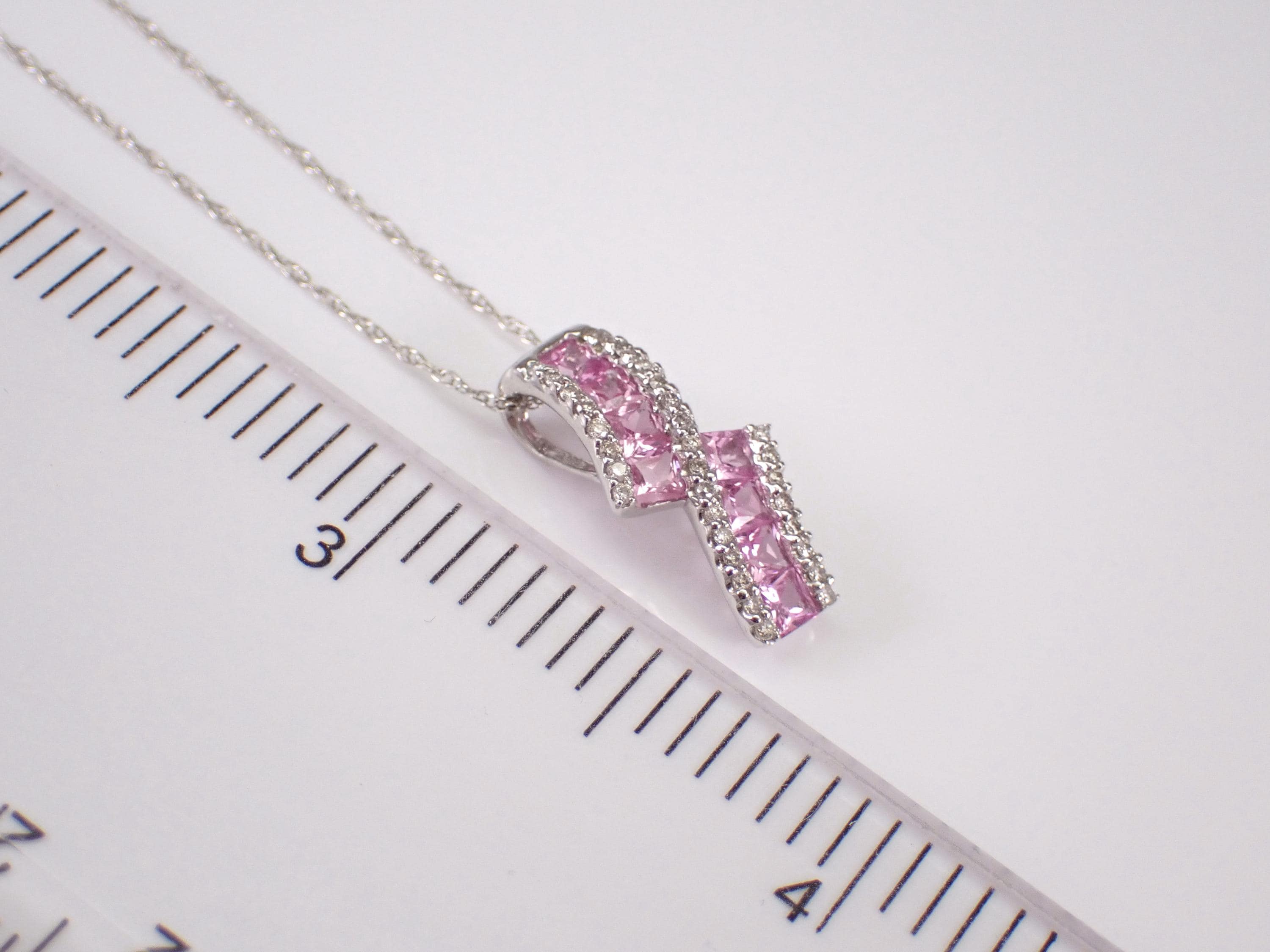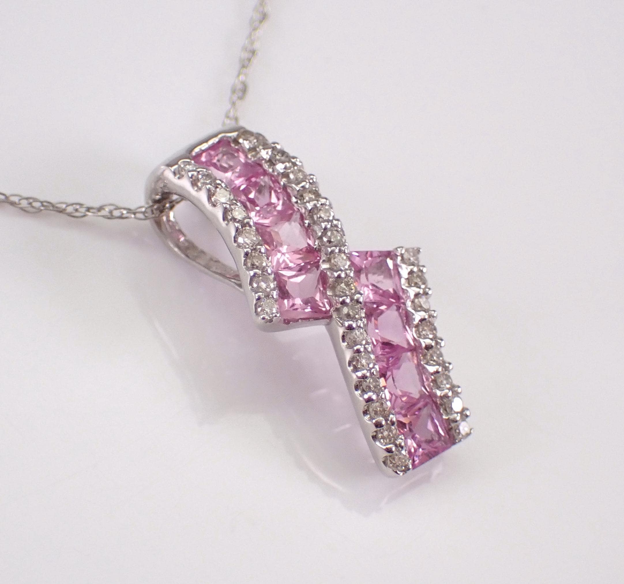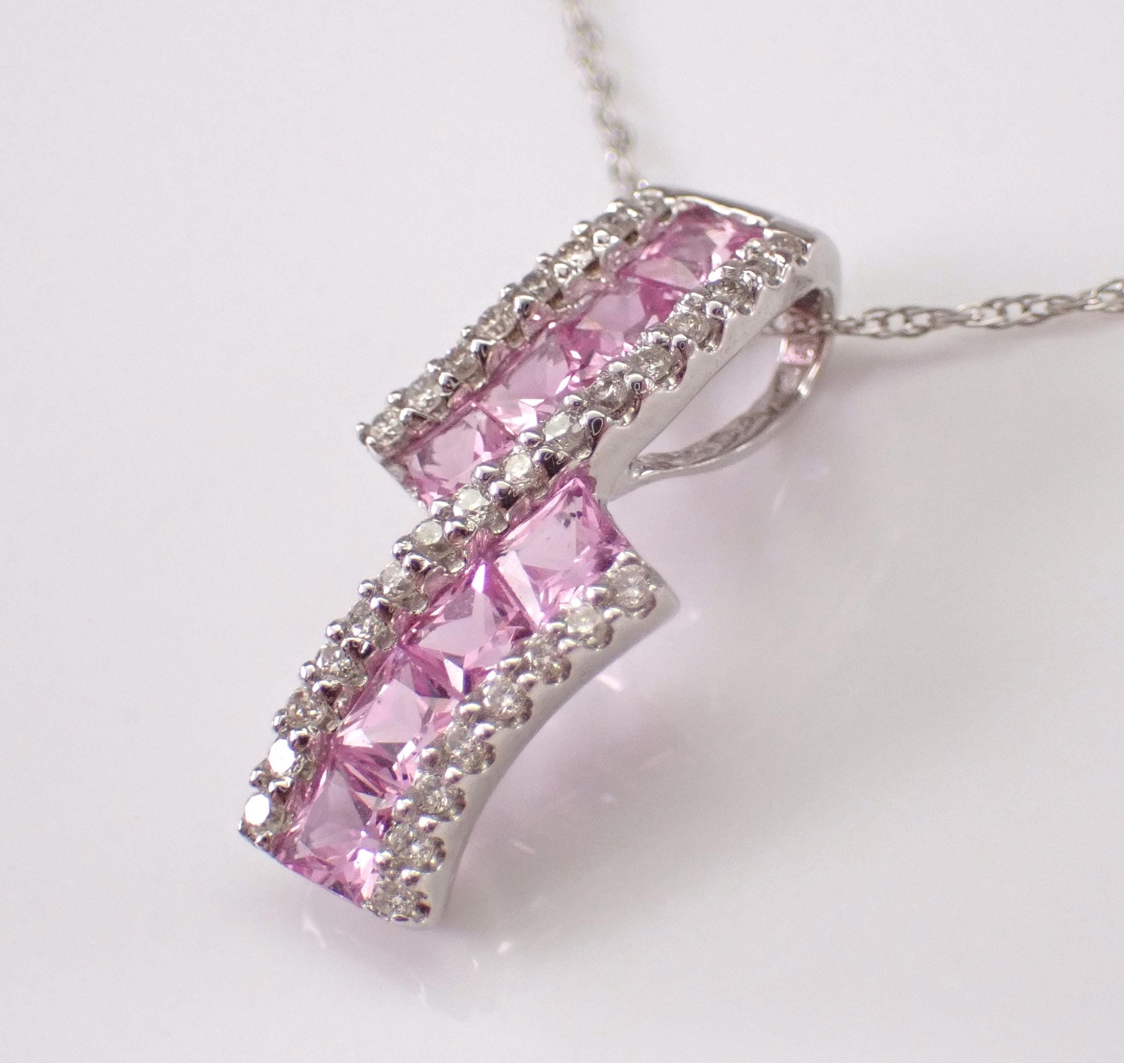 14K White Gold Pink Sapphire and Diamond Pendant with Chain. This pendant is set with eight genuine natural Princess Cut Pink Sapphires. These Pink Sapphires weigh a total of 1/2 carat. There are thirty-two Round Brilliant Diamonds. These diamonds are H color, I1 clarity and weigh a total of .20 carat. This pendant is 14KT White Gold and comes with an 18" 14KT White Gold chain. Both the pendant and chain weigh a total of 2.0 grams and the pendant measures 18 X 9 mm. This necklace will be accompanied by an appraisal written by a GIA Certified Diamond Grader with the retail replacement value of $1,495.00. I will ship this necklace promptly in a beautiful gift box.
