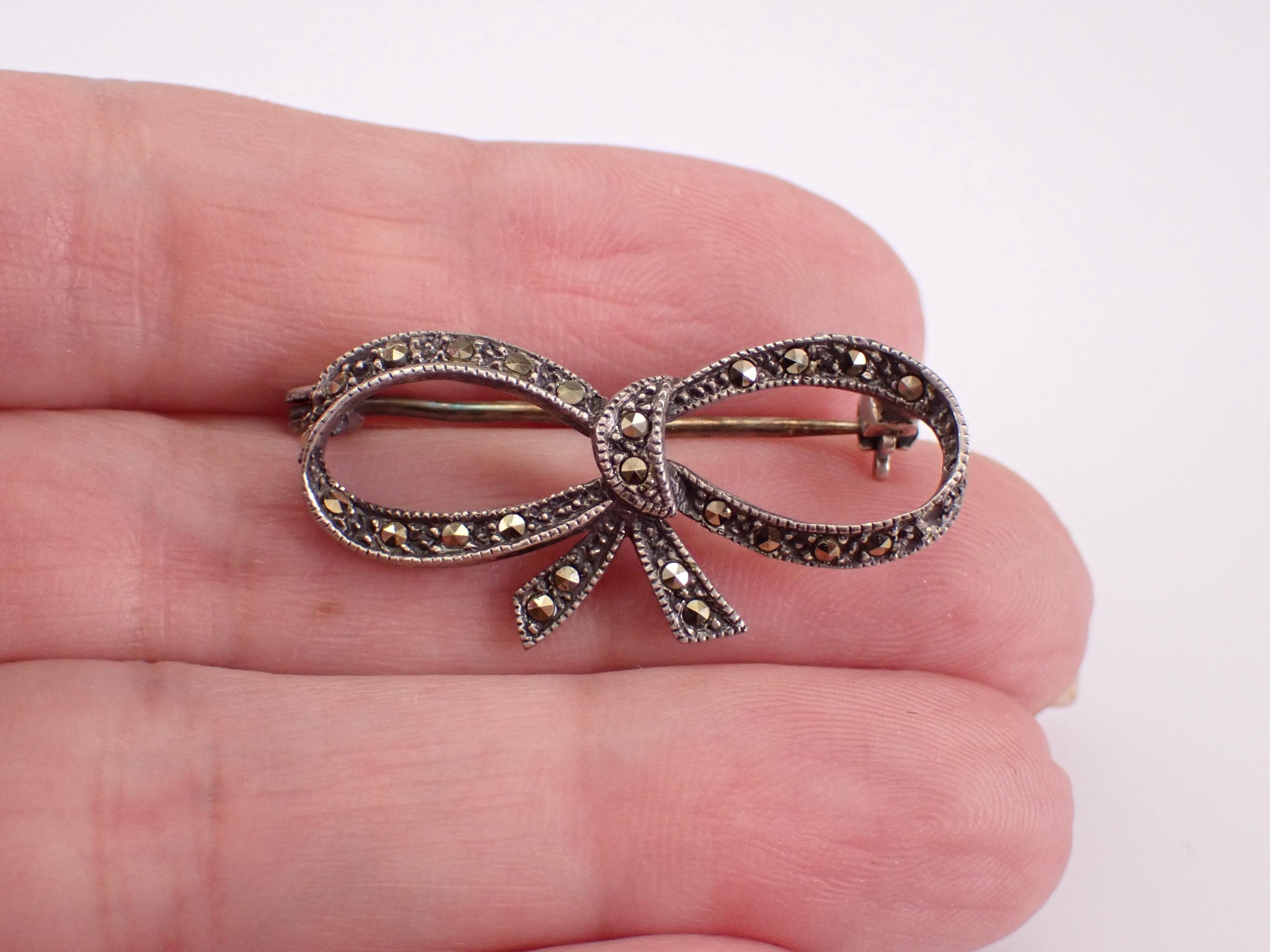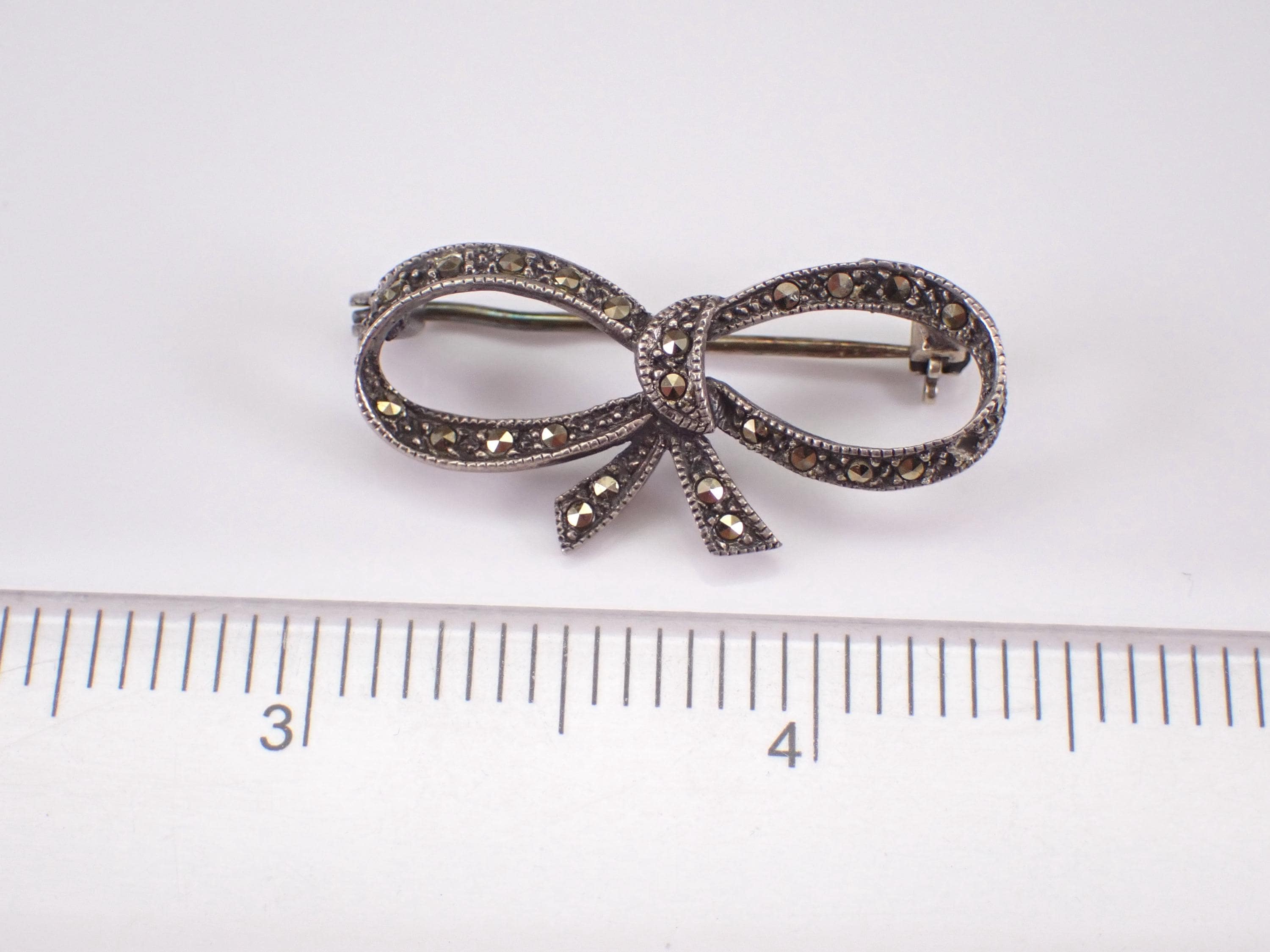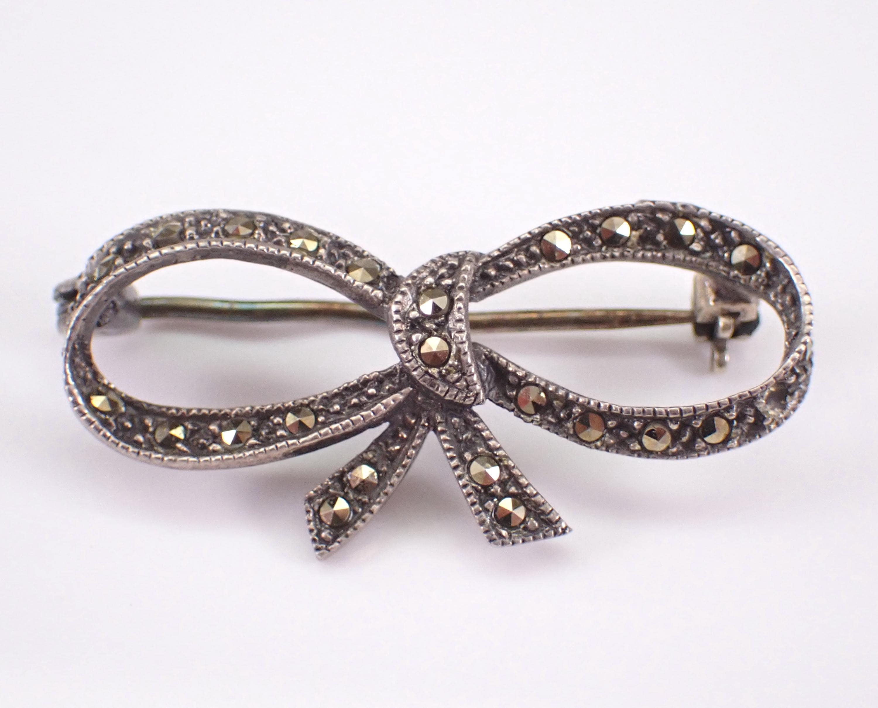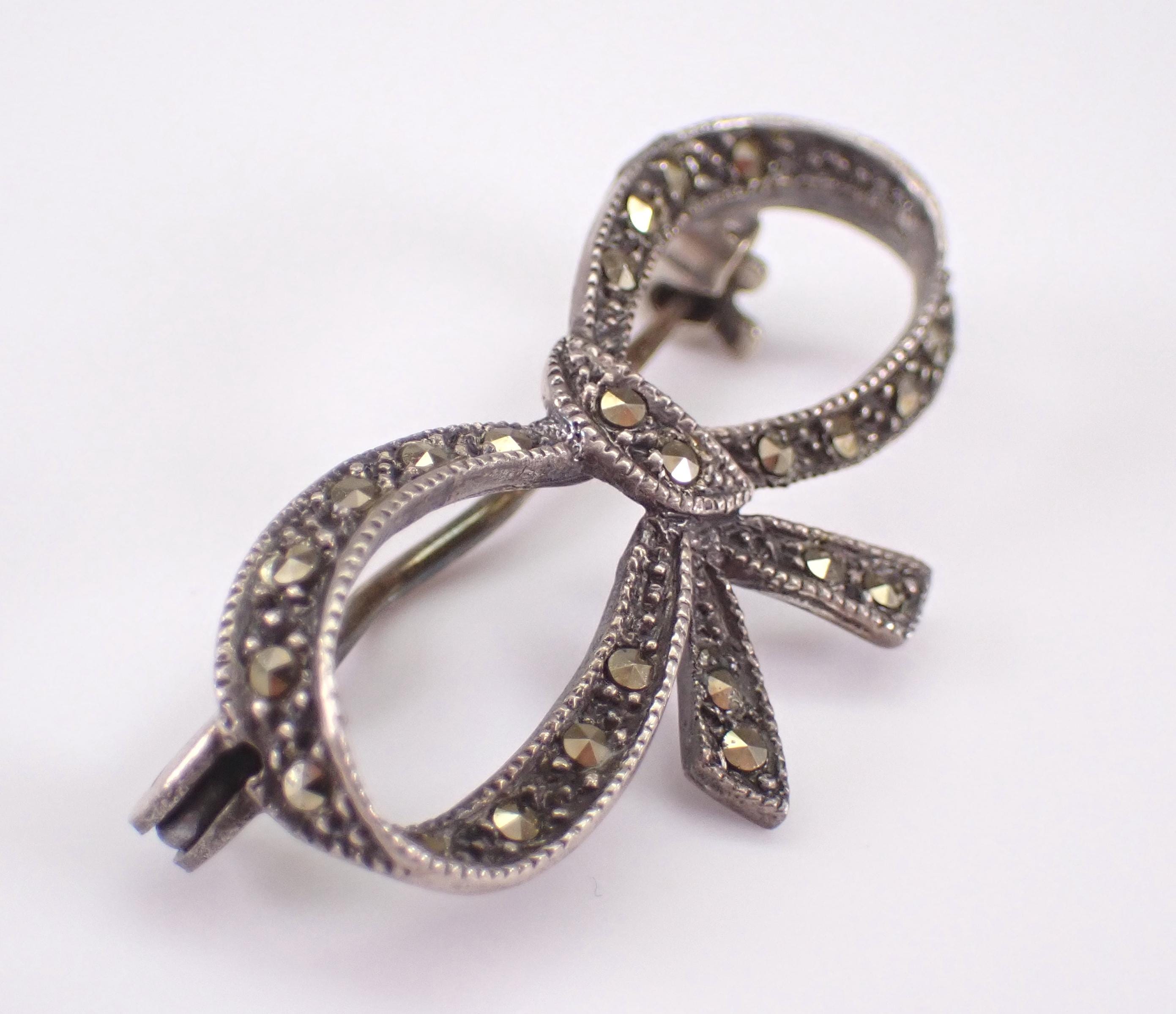 Beautiful and unique Marcasite Bow Tie Brooch crafted in 925 Sterling Silver. This pin is set with marcasite throughout. The brooch measures 16 X 32.5 mm. This brooch weighs 3.1 grams. The pin will be shipped promptly in a gift pouch.