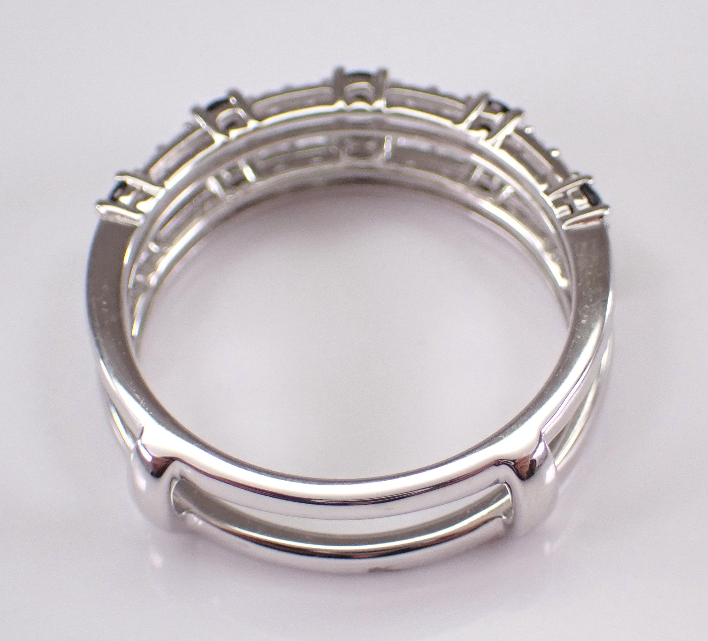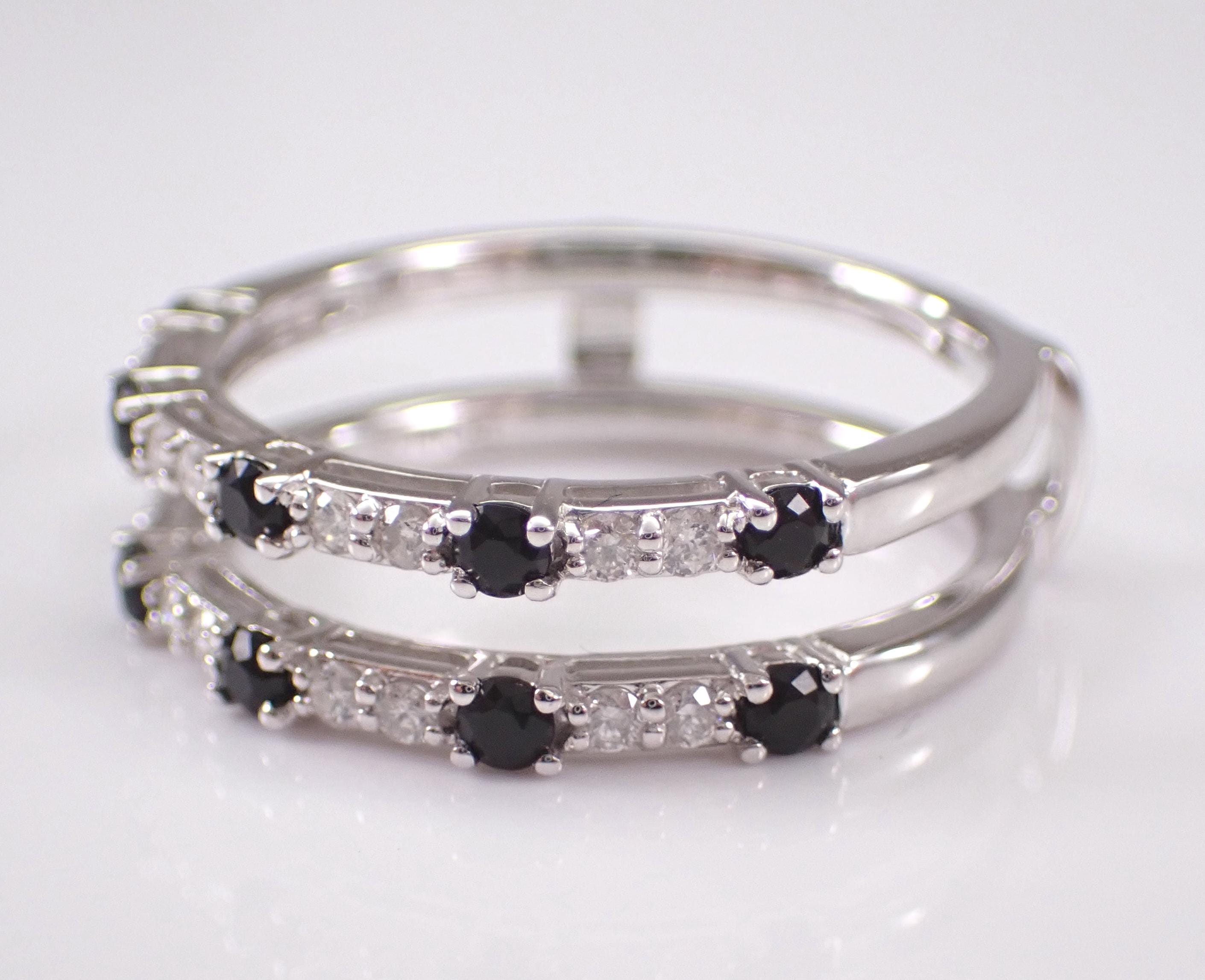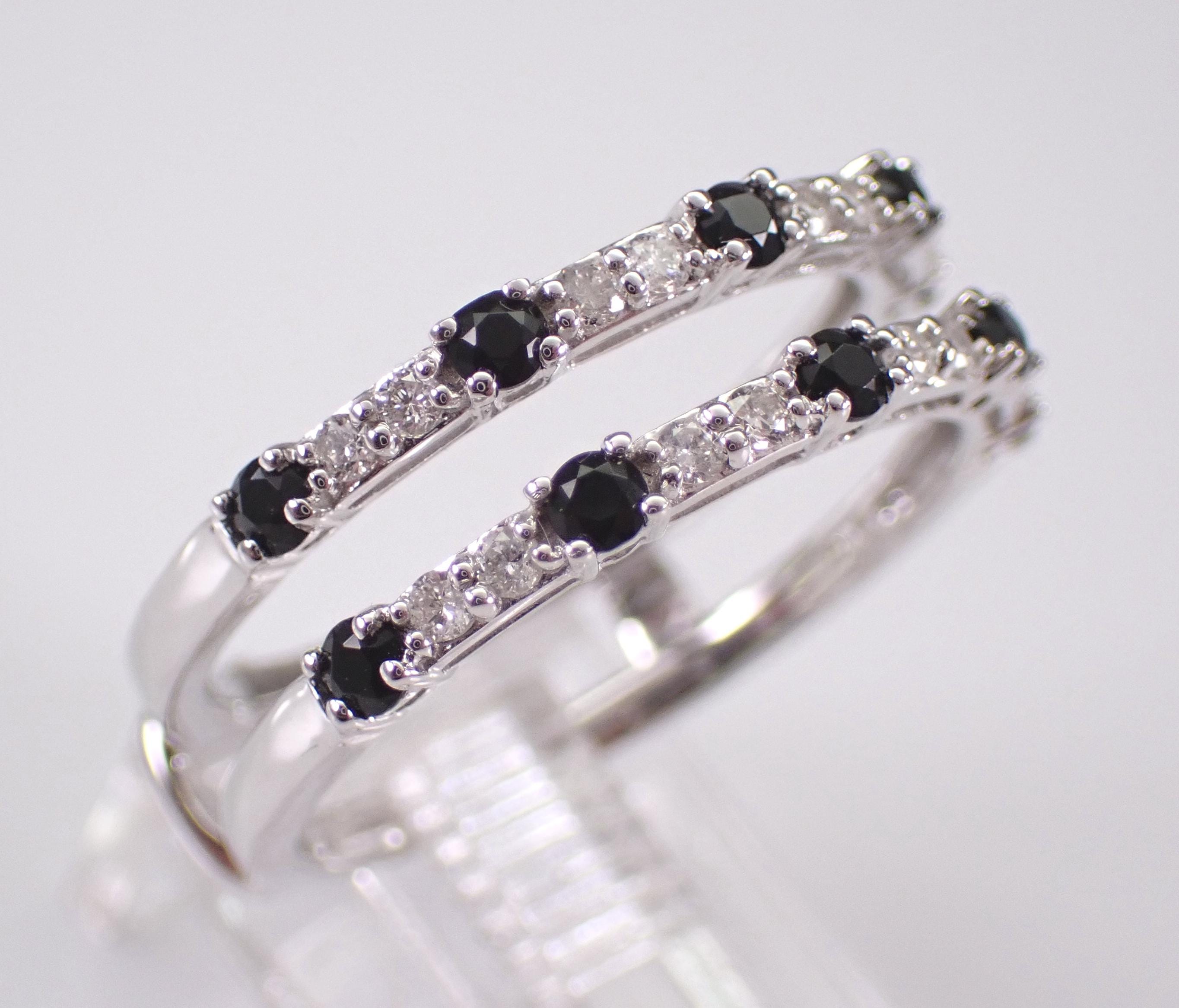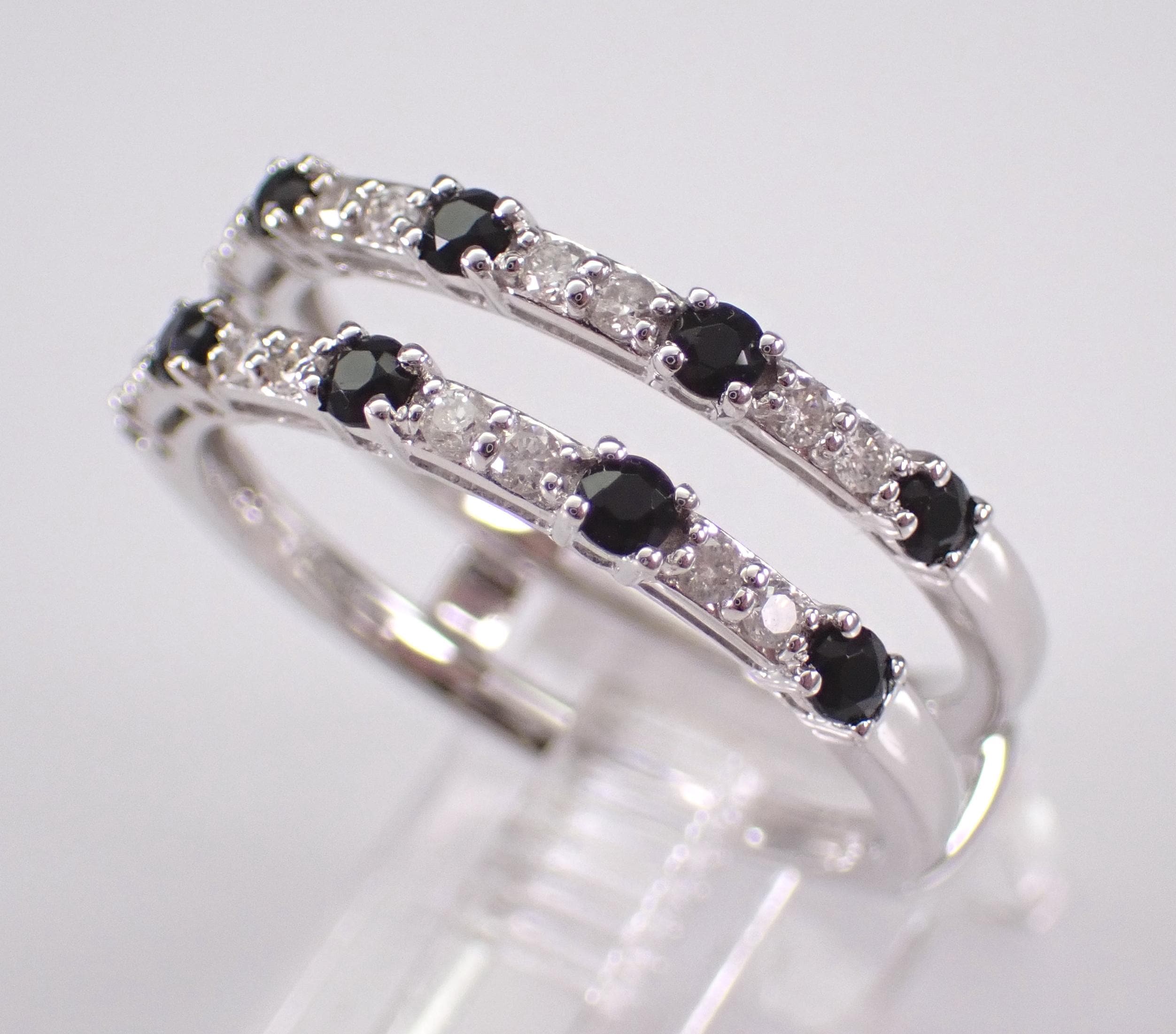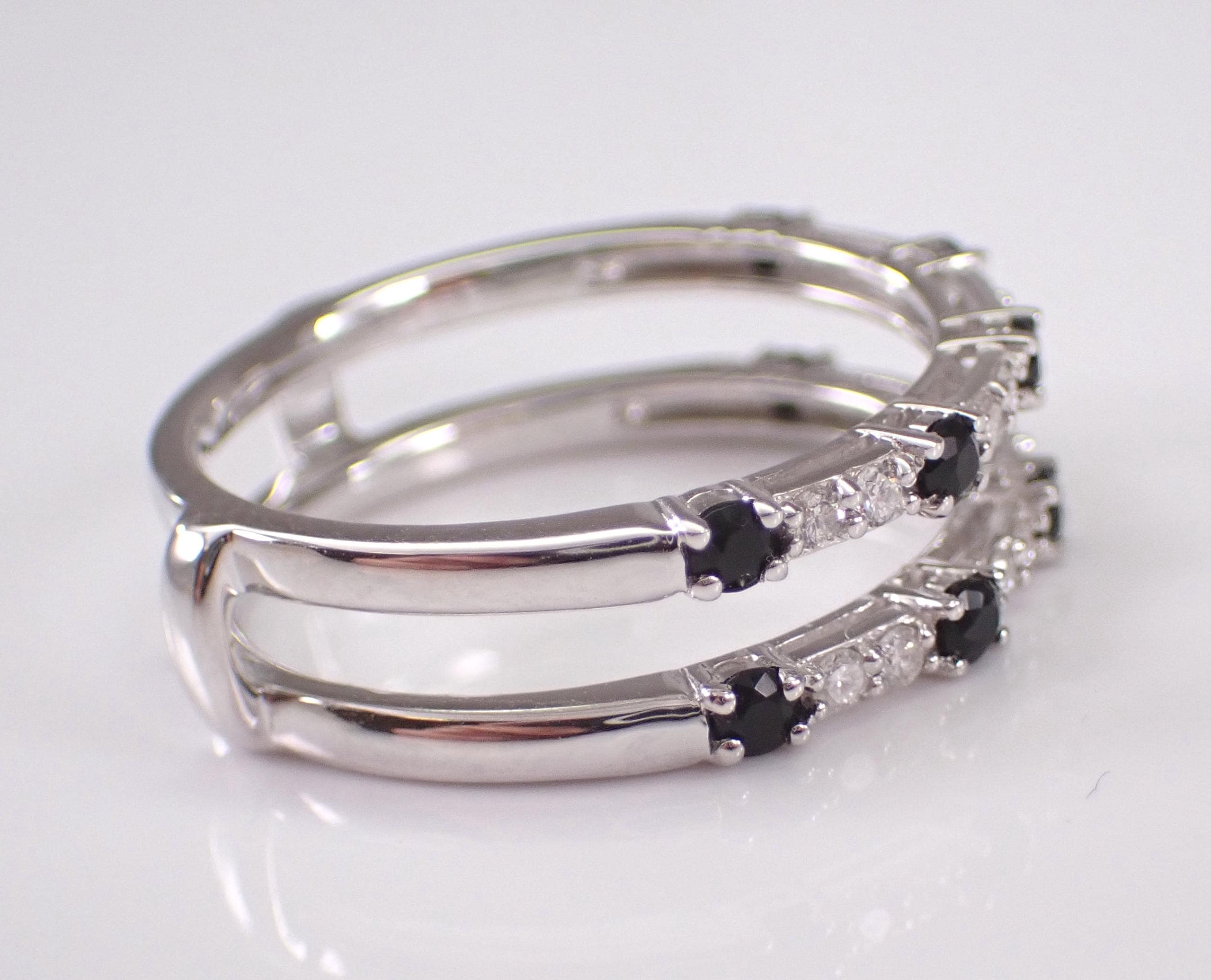 14k White Gold Diamond and Black Spinel Insert Wedding Band. This ring is composed of two bands attached to each other with a space in the center for another ring. This ring(s) is set with sixteen genuine Round Brilliant Diamonds and ten Round Black Spinel. These diamonds are G color, I1 clarity and weigh a total of 1/4 carats. This ring is 14k White Gold, weighs 3.4 grams and is a finger size 7, can be resized. This ring measures 5.5 mm along the finger. This ring will be accompanied by an appraisal with the retail replacement value of $1,679.00. I will ship this ring promptly in a gift box.