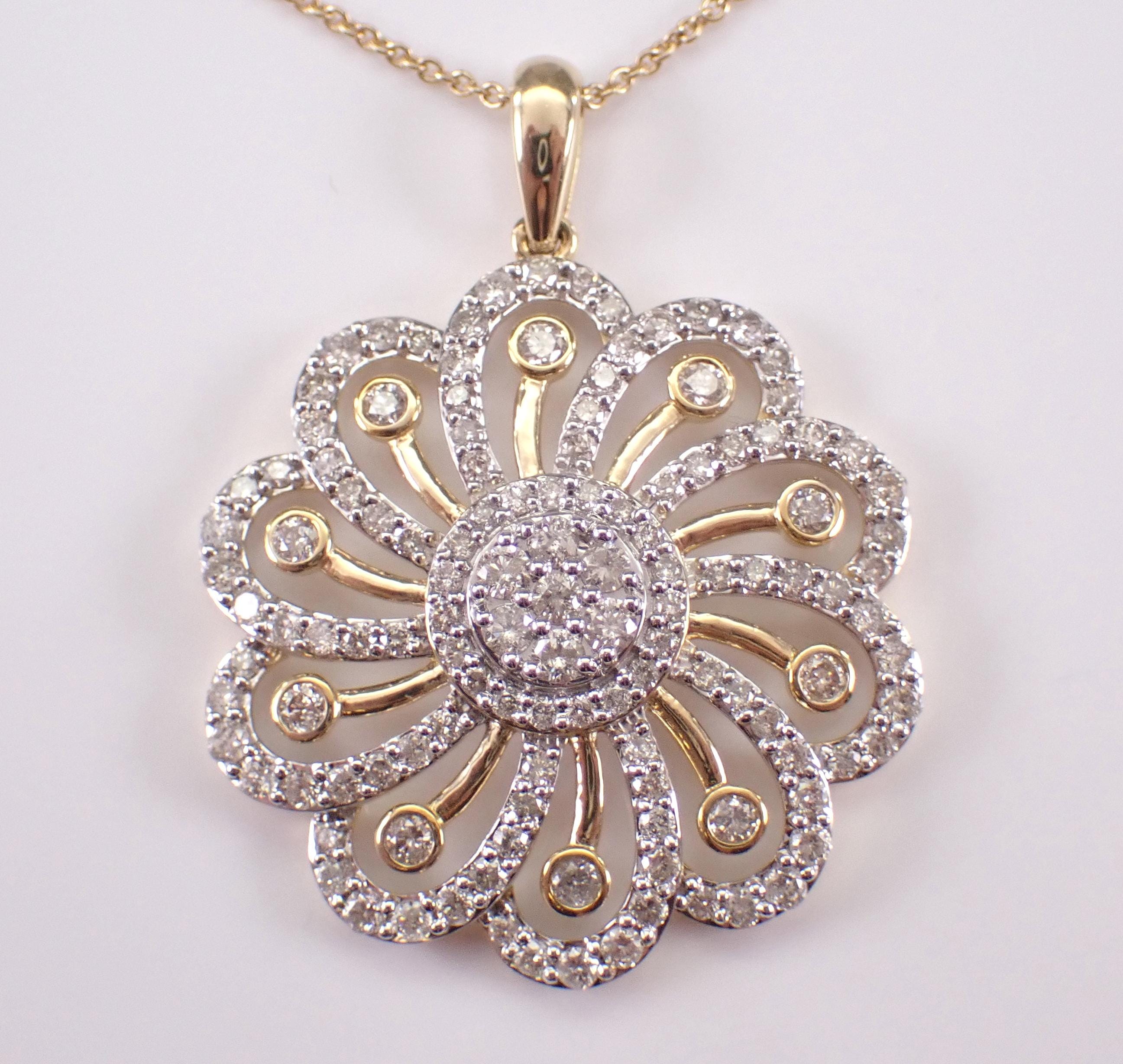 14K Yellow Gold Diamond Flower Pendant Necklace. This pendant is set with one hundred and twenty-six (126) genuine natural round brilliant diamonds. These diamonds are H color, I1 clarity and weigh a total of 2 carats. This pendant is 14KT Yellow Gold (has some white gold accents) and comes with a 14KT Yellow Gold chain which measures 18" in length. Both the pendant and chain weigh a total of 7.2 grams and the pendant measures 28 mm in diameter. This necklace will be accompanied by an appraisal written by a GIA Certified Diamond Grader with the retail replacement value of $5,395.00. I will ship this necklace promptly in a beautiful gift box.