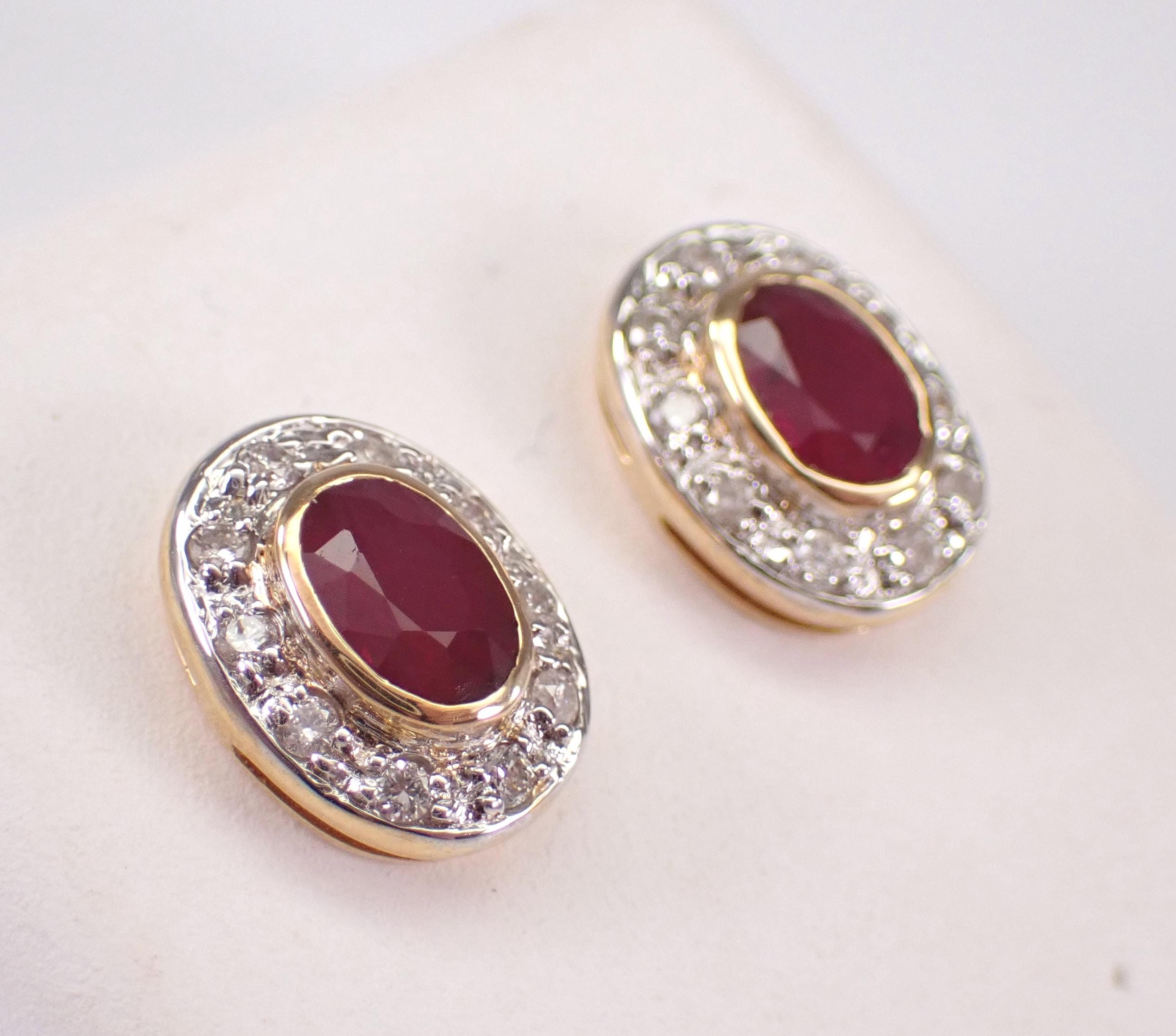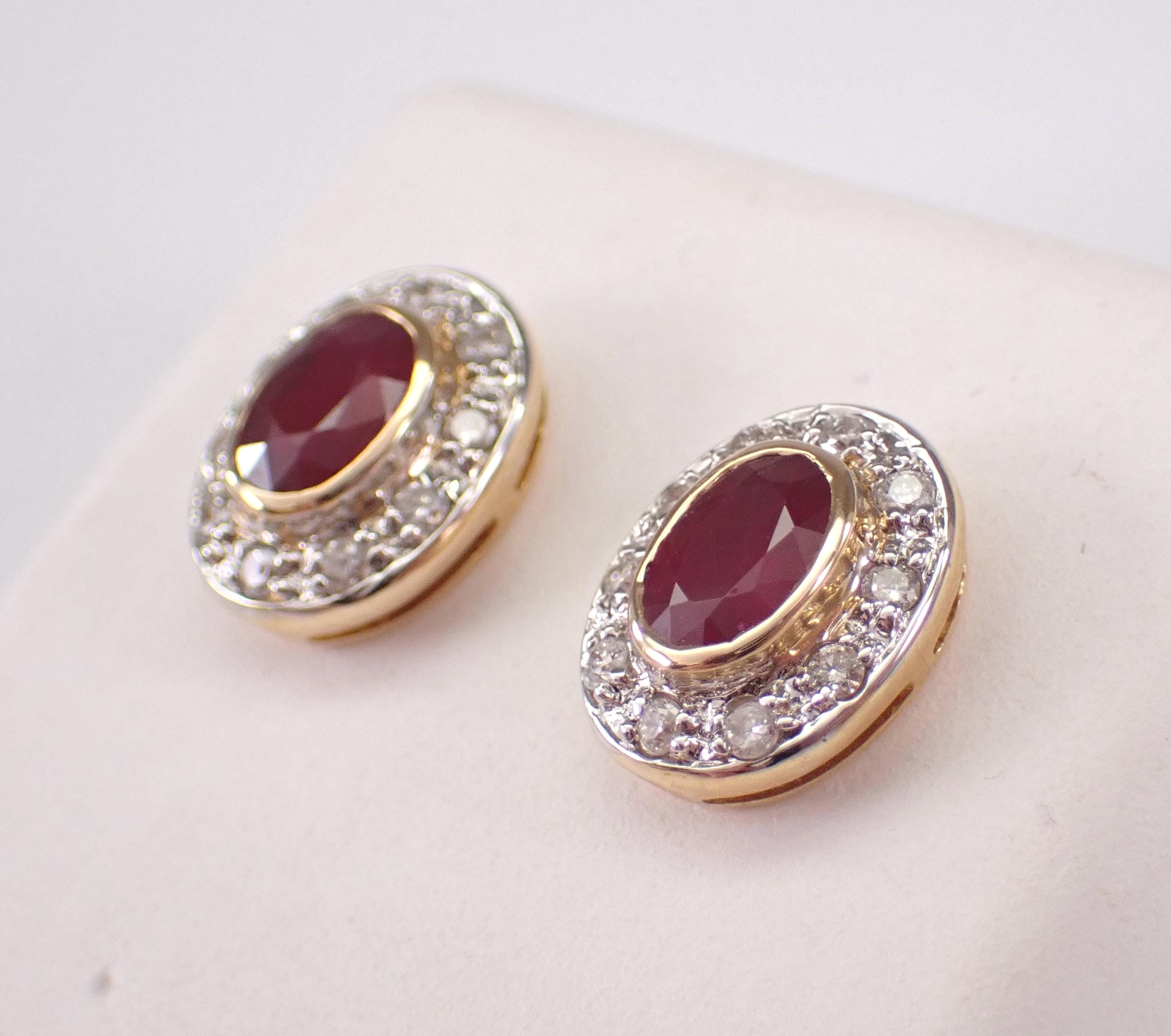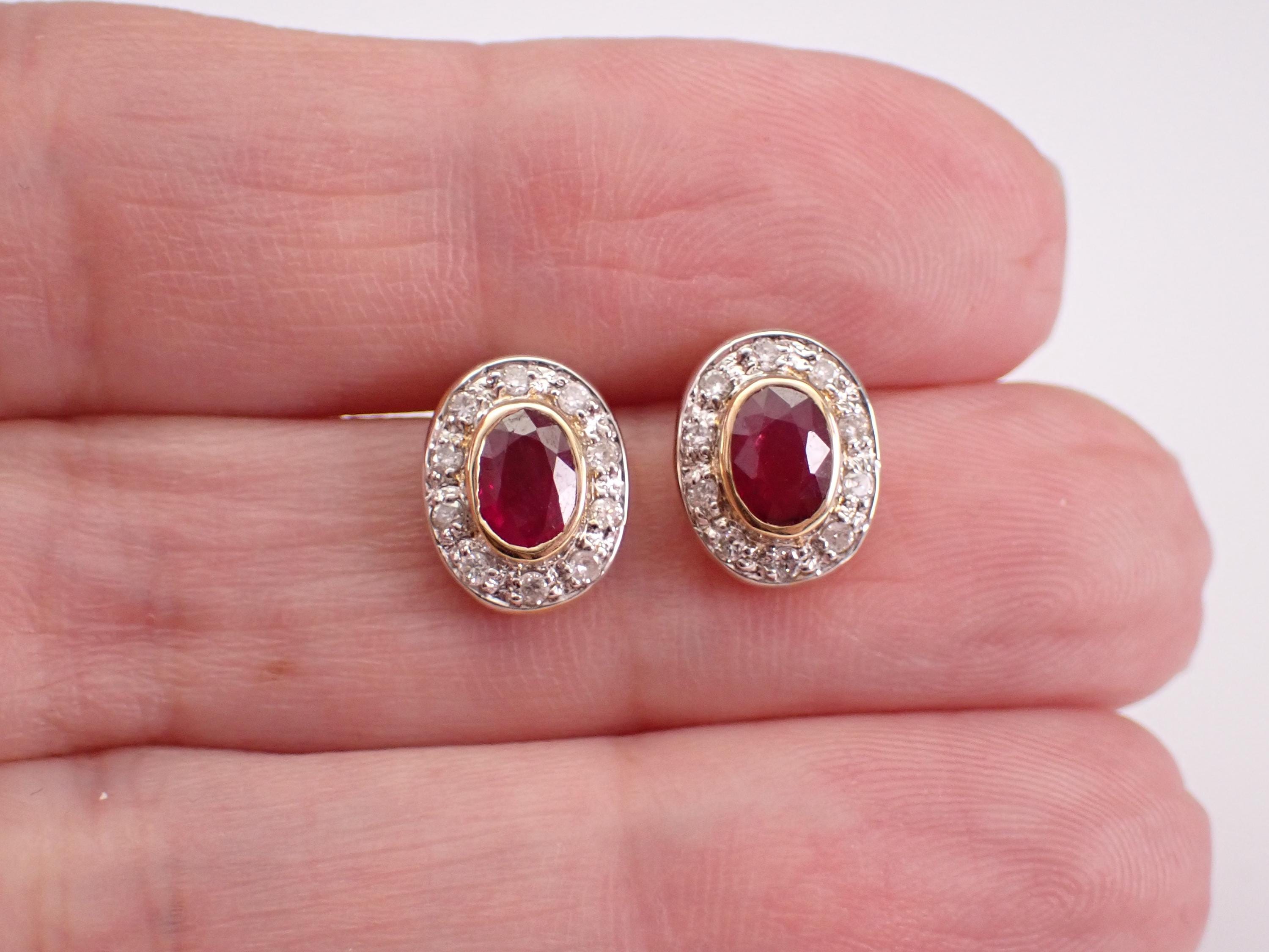 Vintage 14K Yellow Gold Diamond and Ruby Halo Stud Earrings. These earrings are set with a genuine Oval Ruby in each earring. These Rubies measure 5.5 X 3.5 mm each and weigh a total of 1 1/4 carats. There are ten natural Round Brilliant Diamonds set in EACH earring. These Diamonds are H color, SI clarity and amount to a total weight of .25 carat. These earrings are 14K Yellow Gold, weigh 2.6 grams and measure 10.5 X 8 mm each. These earrings are for pierced ears and friction post closures. These earrings will be accompanied by an appraisal written by a GIA Certified Diamond Grader with the retail replacement value of $1,475.00. I will ship these earrings promptly in a gift box.