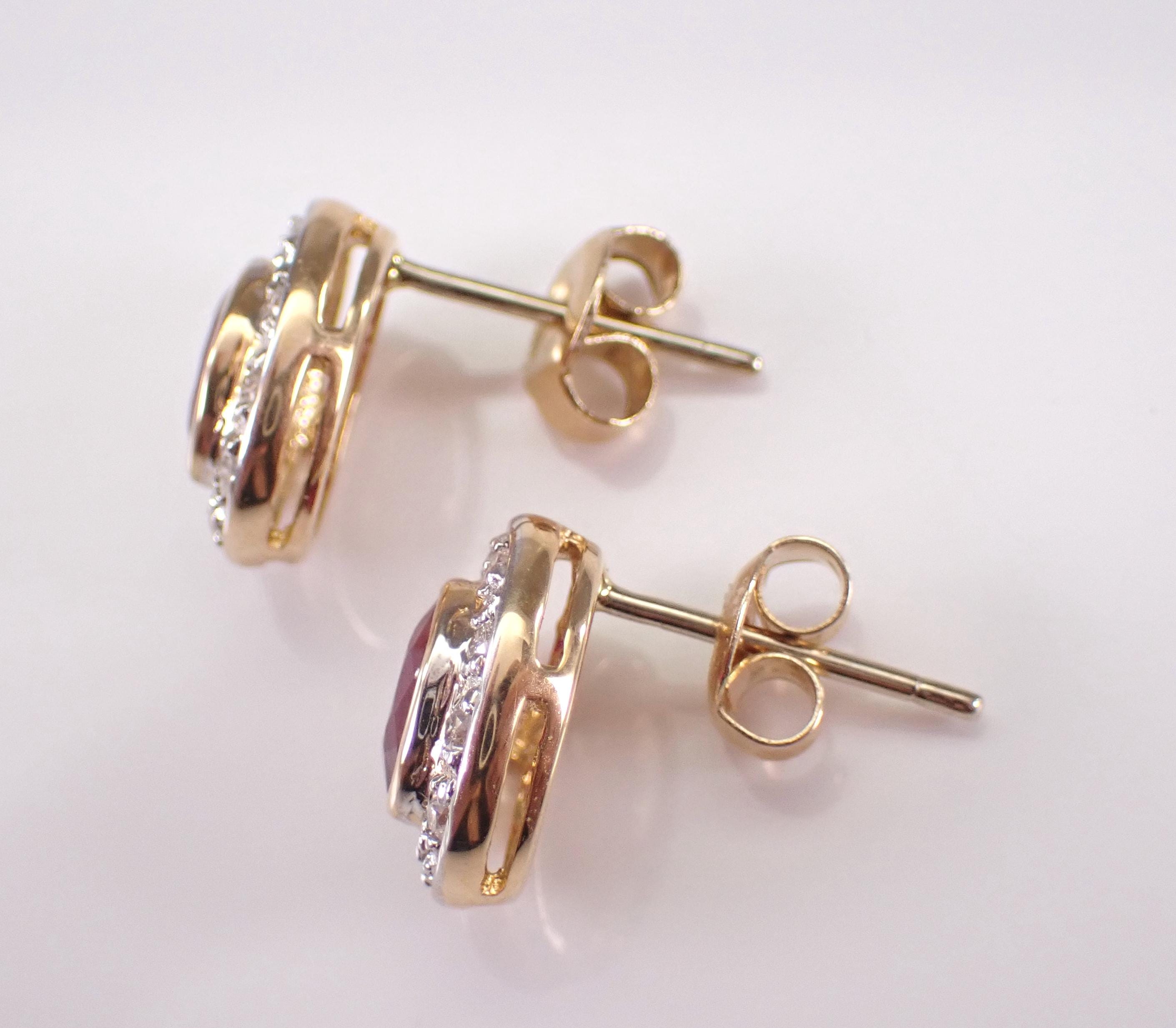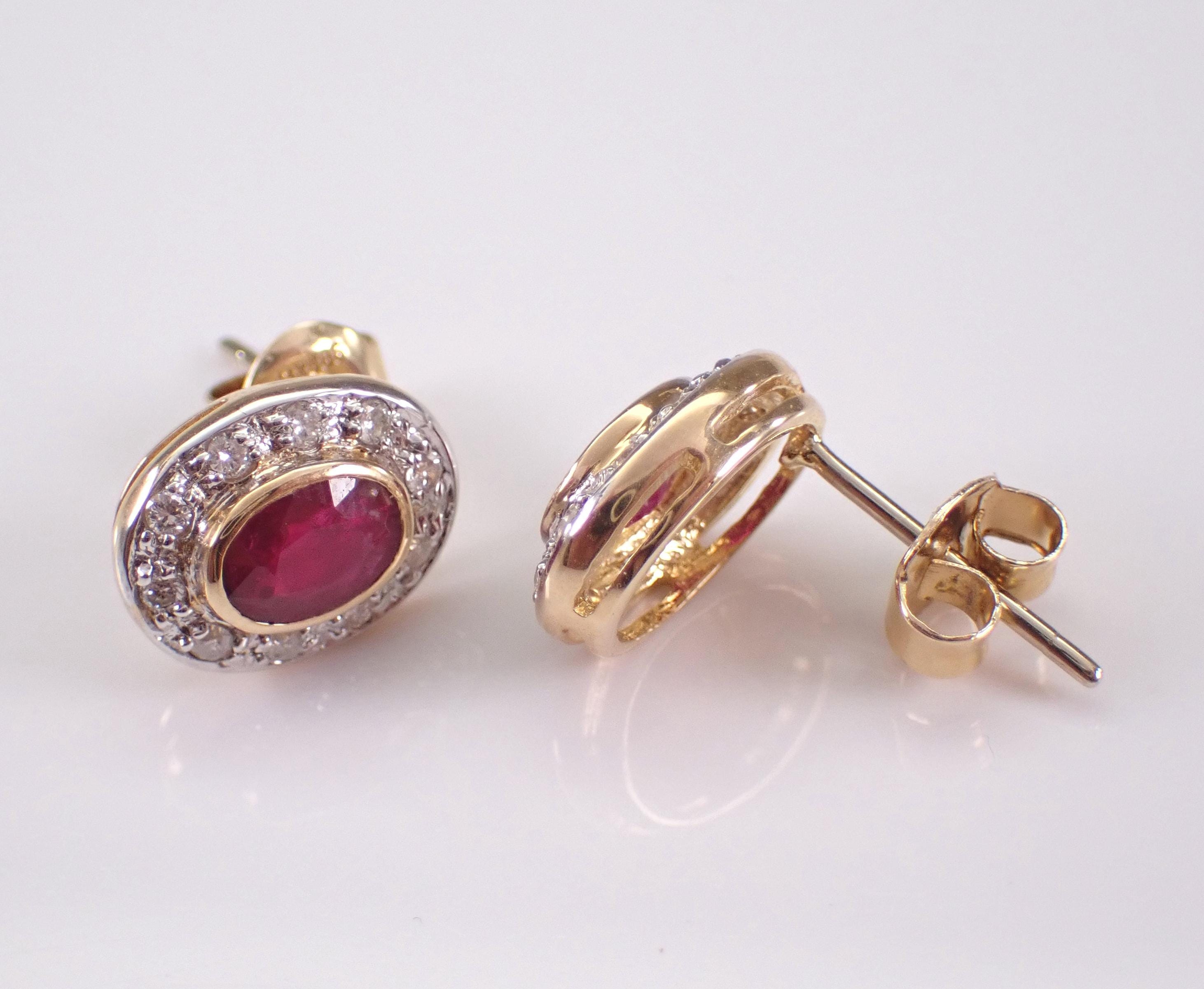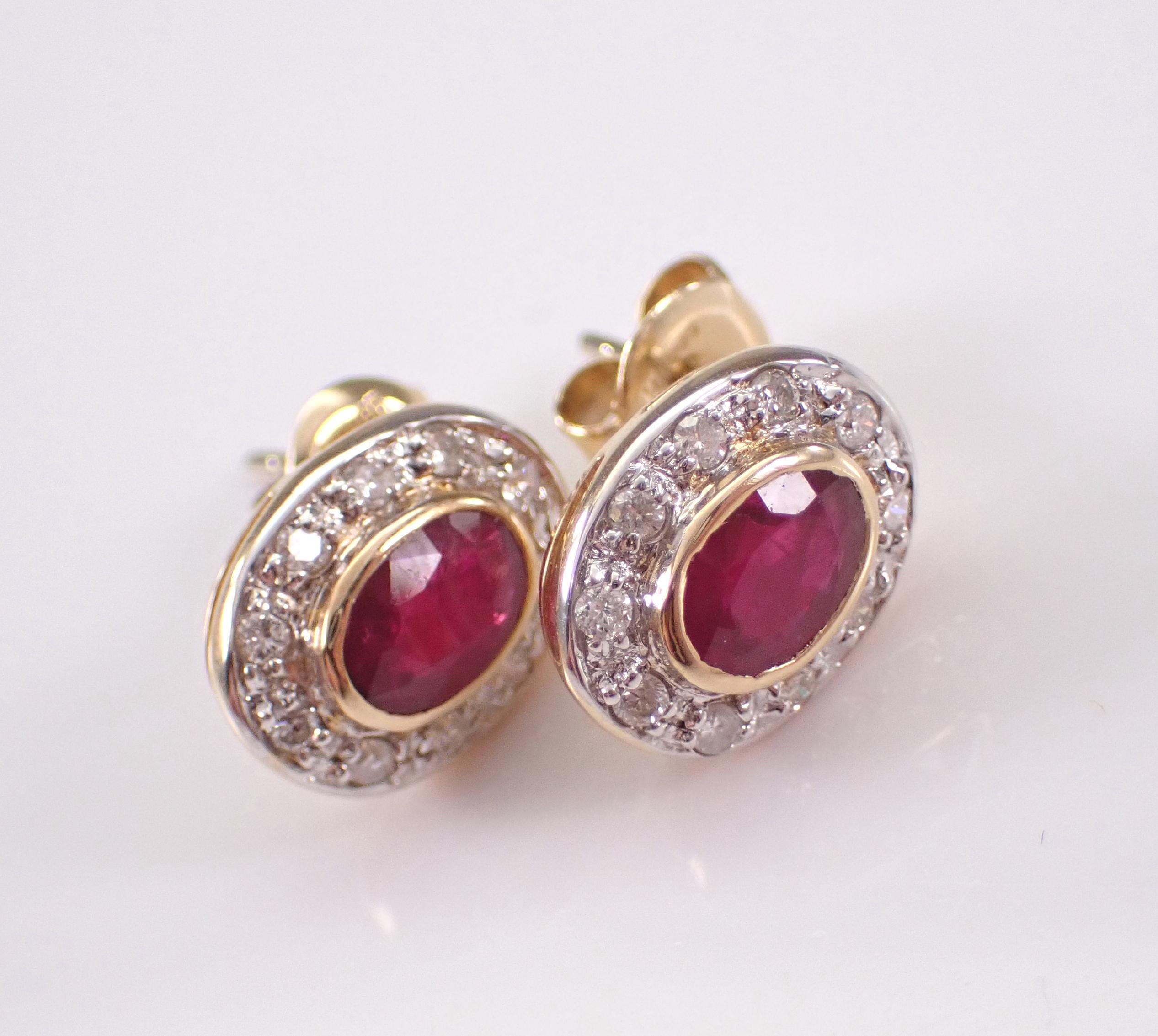 Vintage 14K Yellow Gold Diamond and Ruby Halo Stud Earrings. These earrings are set with a genuine Oval Ruby in each earring. These Rubies measure 5.5 X 3.5 mm each and weigh a total of 1 1/4 carats. There are ten natural Round Brilliant Diamonds set in EACH earring. These Diamonds are H color, SI clarity and amount to a total weight of .25 carat. These earrings are 14K Yellow Gold, weigh 2.6 grams and measure 10.5 X 8 mm each. These earrings are for pierced ears and friction post closures. These earrings will be accompanied by an appraisal written by a GIA Certified Diamond Grader with the retail replacement value of $1,475.00. I will ship these earrings promptly in a gift box.