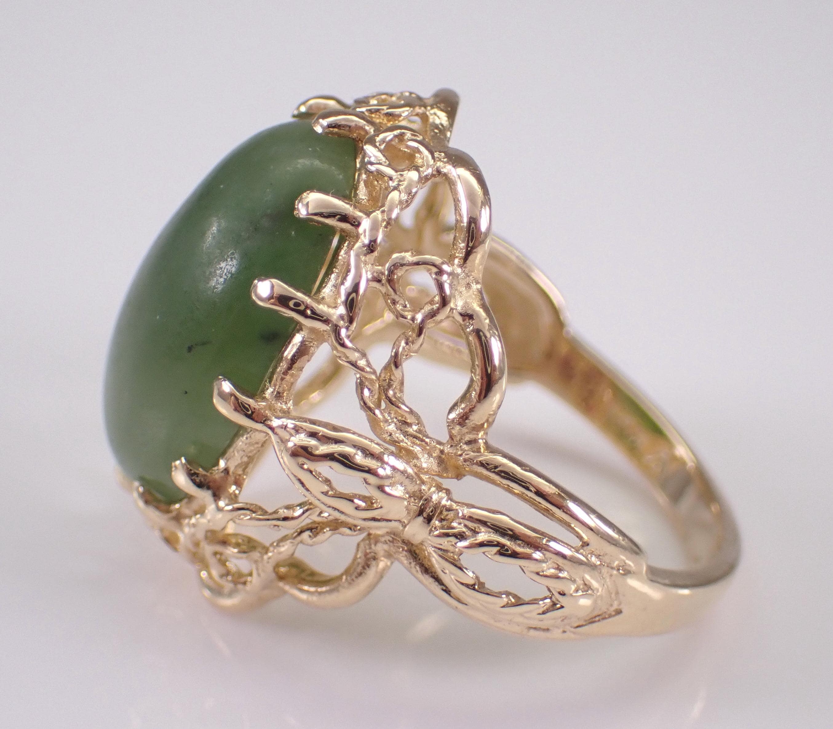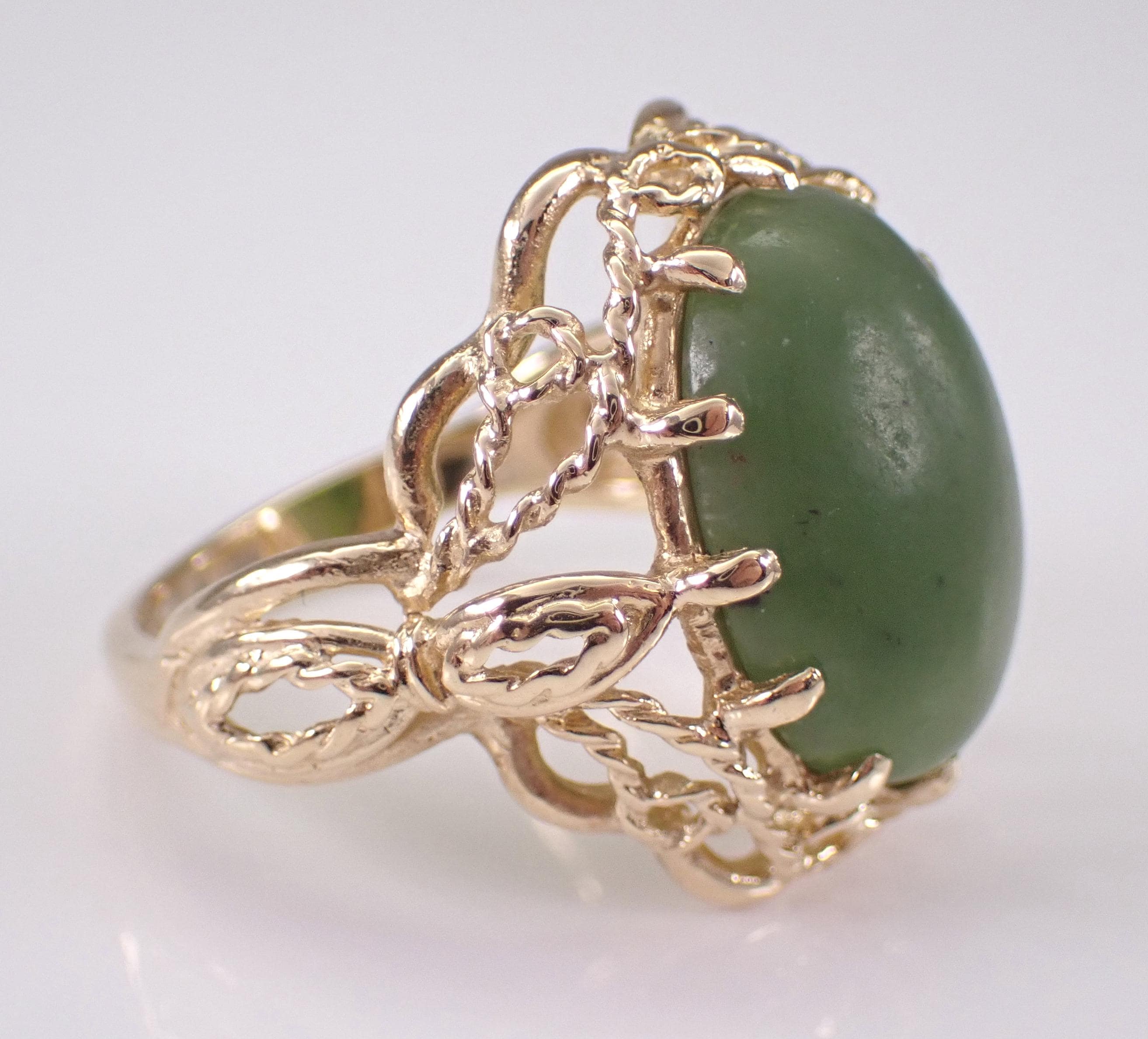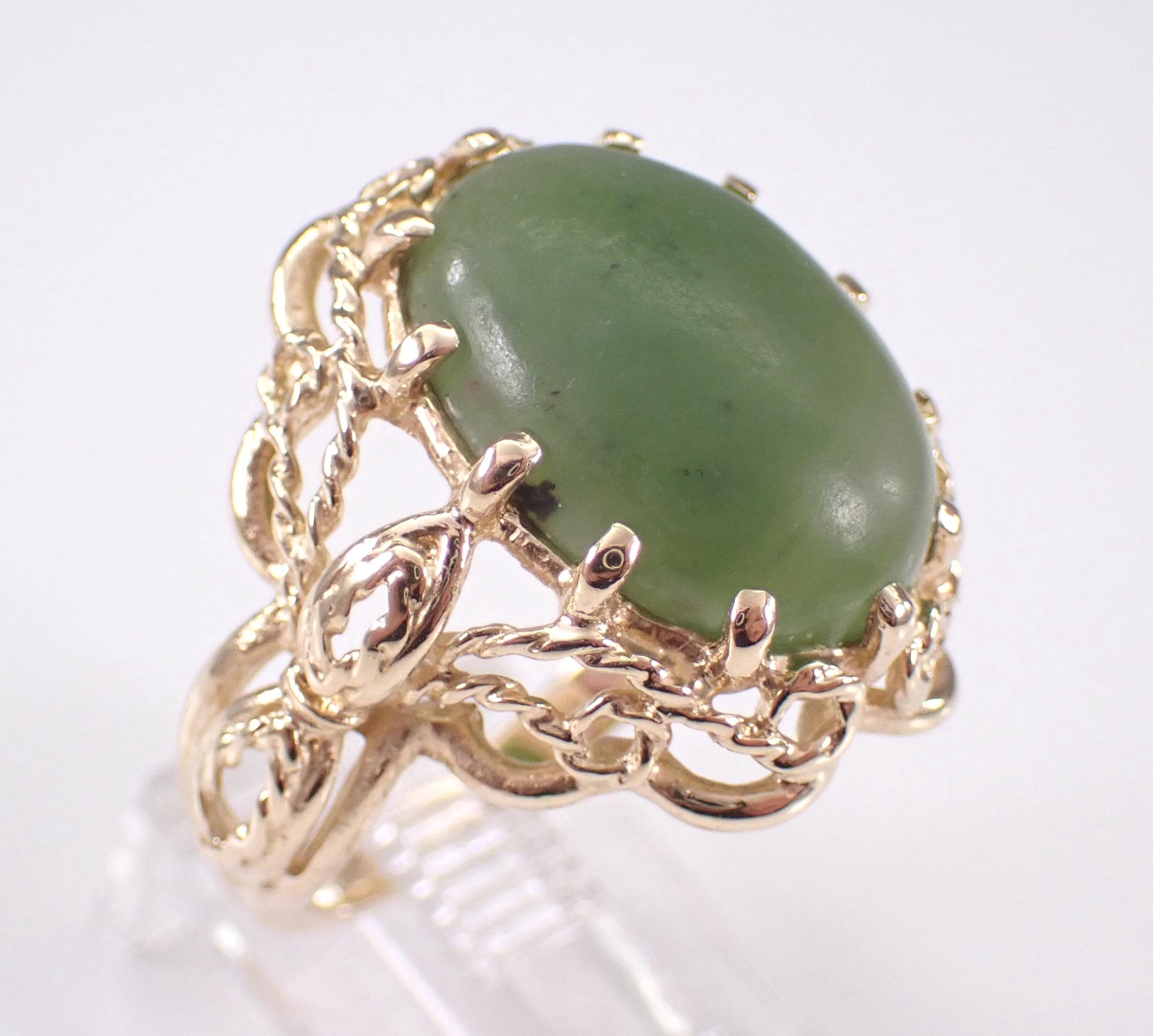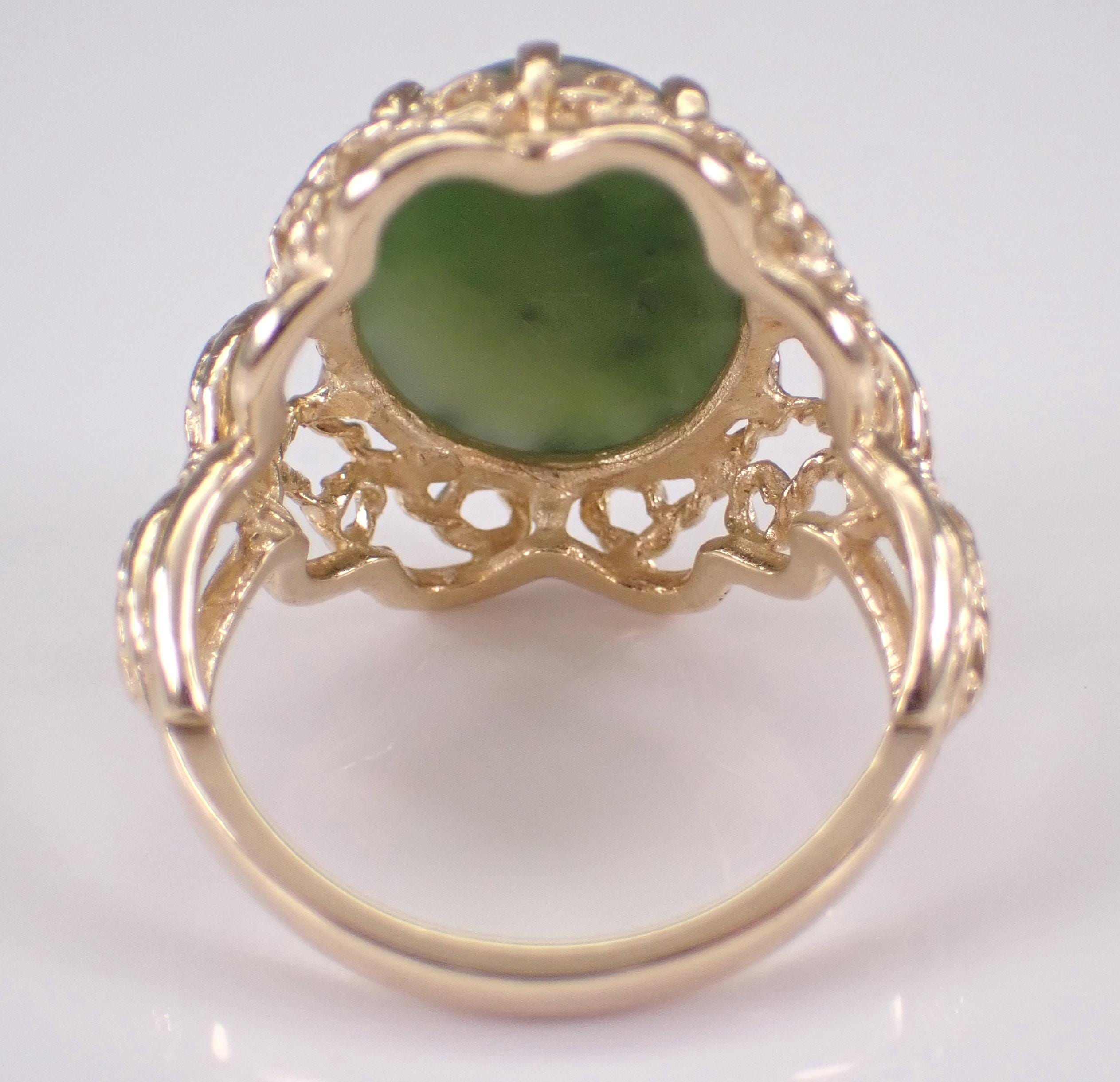 Vintage Estate 14k Yellow Gold Jade Solitaire Ring. This ring is set with one Oval Jade Cabochon in the center. This Jade measures 15.5 X 11.5 mm. This ring is 14KT Yellow Gold, weighs 6.4 grams and is a finger size 7, which can be resized (please inquire about sizing with the finger size you need). This ring has a very decorative design on the shank and dates back to Circa 1960's. This ring will be accompanied by an appraisal by a GIA Certified Diamond Grader for insurance and authentication purposes. I will ship this ring promptly in a gift box.