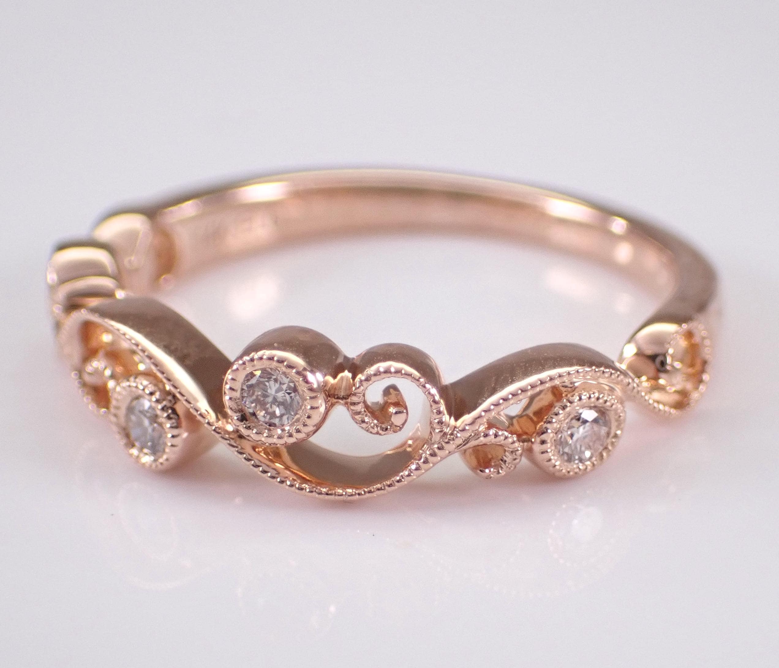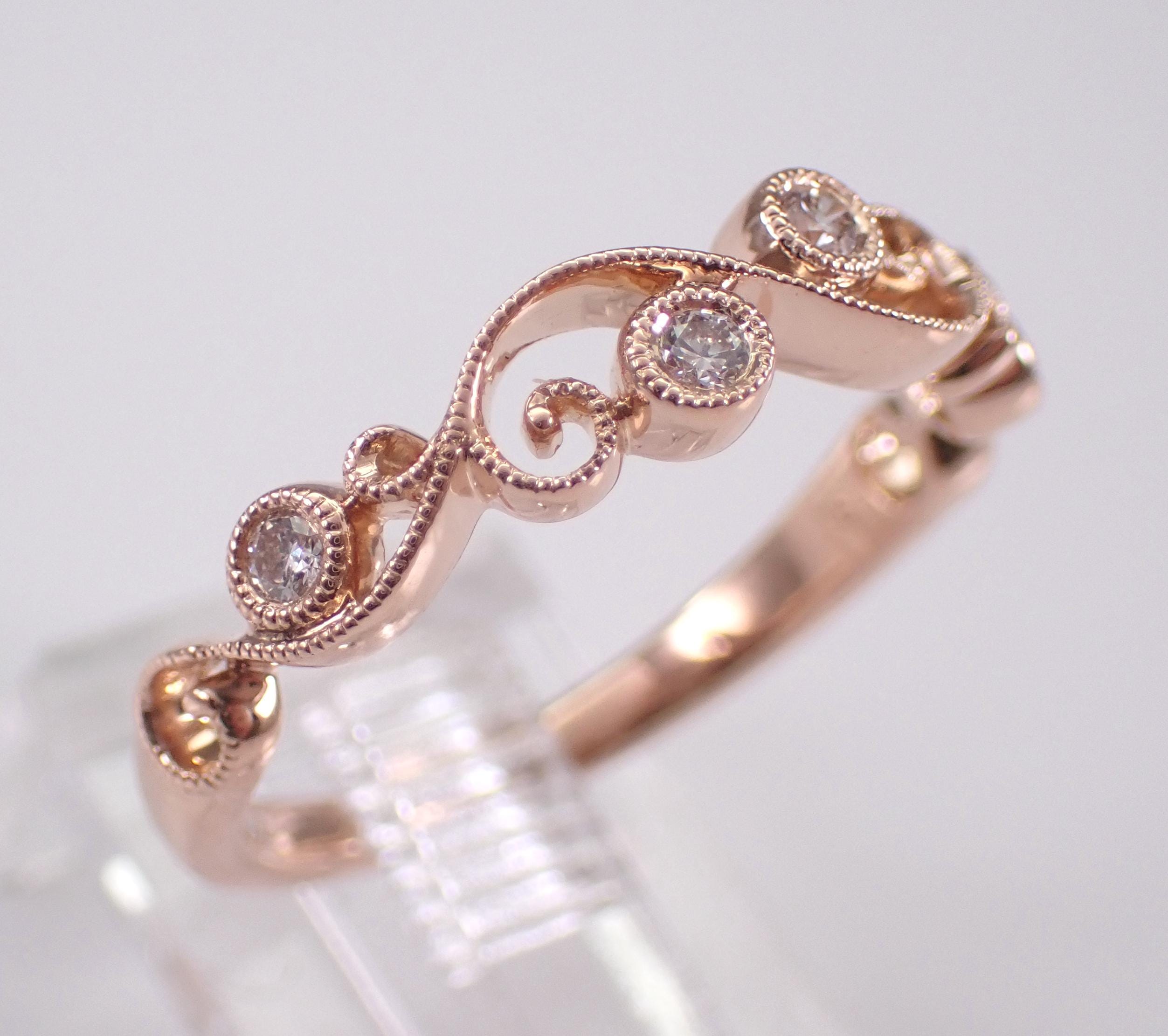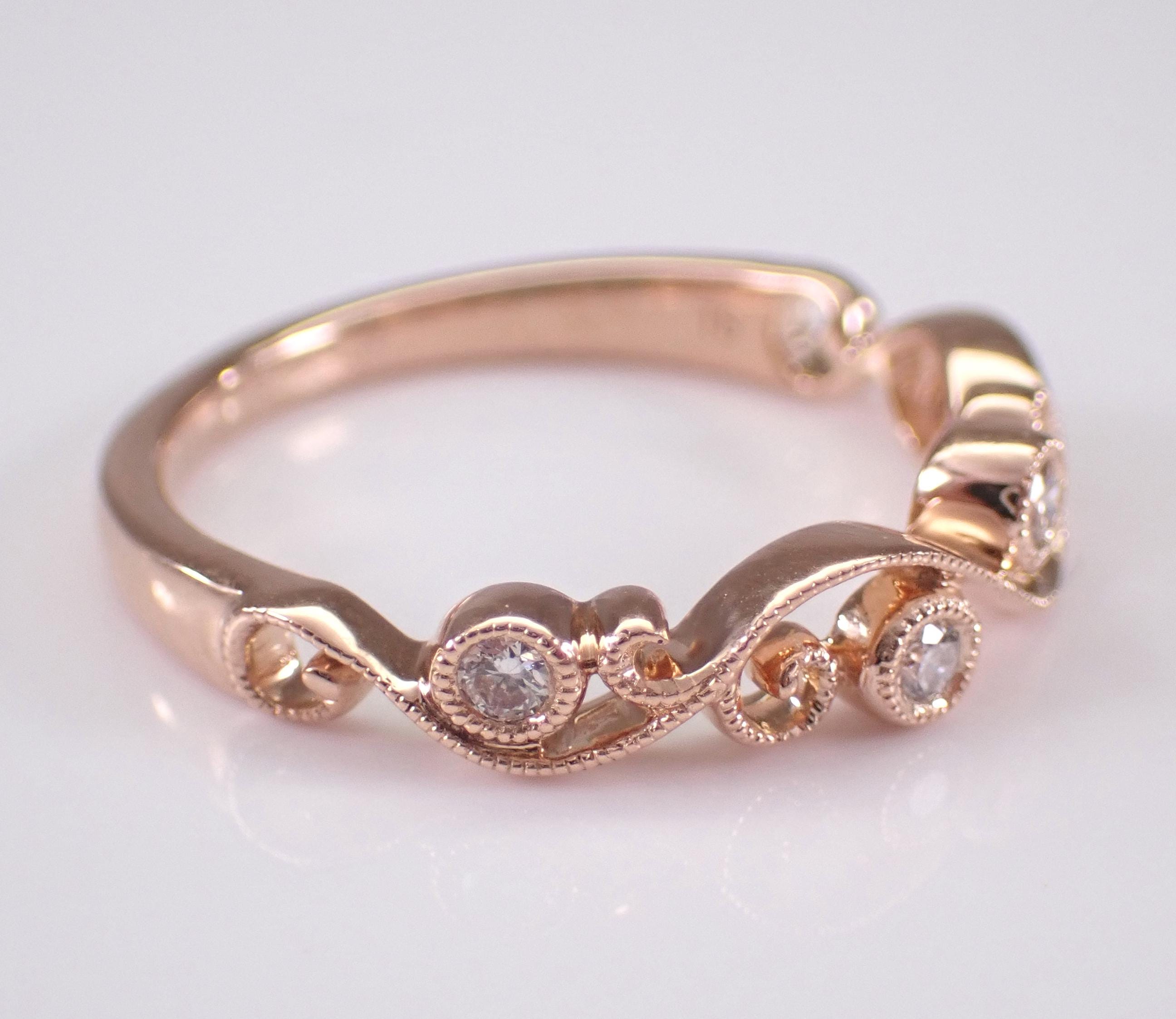 14K Rose Gold Diamond Wedding Ring Anniversary Band. This ring is set with four genuine, natural Round Brilliant diamonds. These diamonds are G color, VS clarity and weigh a total of .13 carat. The ring is 14KT Rose Gold, weighs 2.3 grams, measures 4.2 mm in width and is a finger size 6, can be resized (please inquire about sizing with the finger size you need). This ring will be accompanied by an appraisal by a GIA Certified Diamond Grader with the retail replacement value of $1,679.00. I will ship this ring promptly in a gift box.