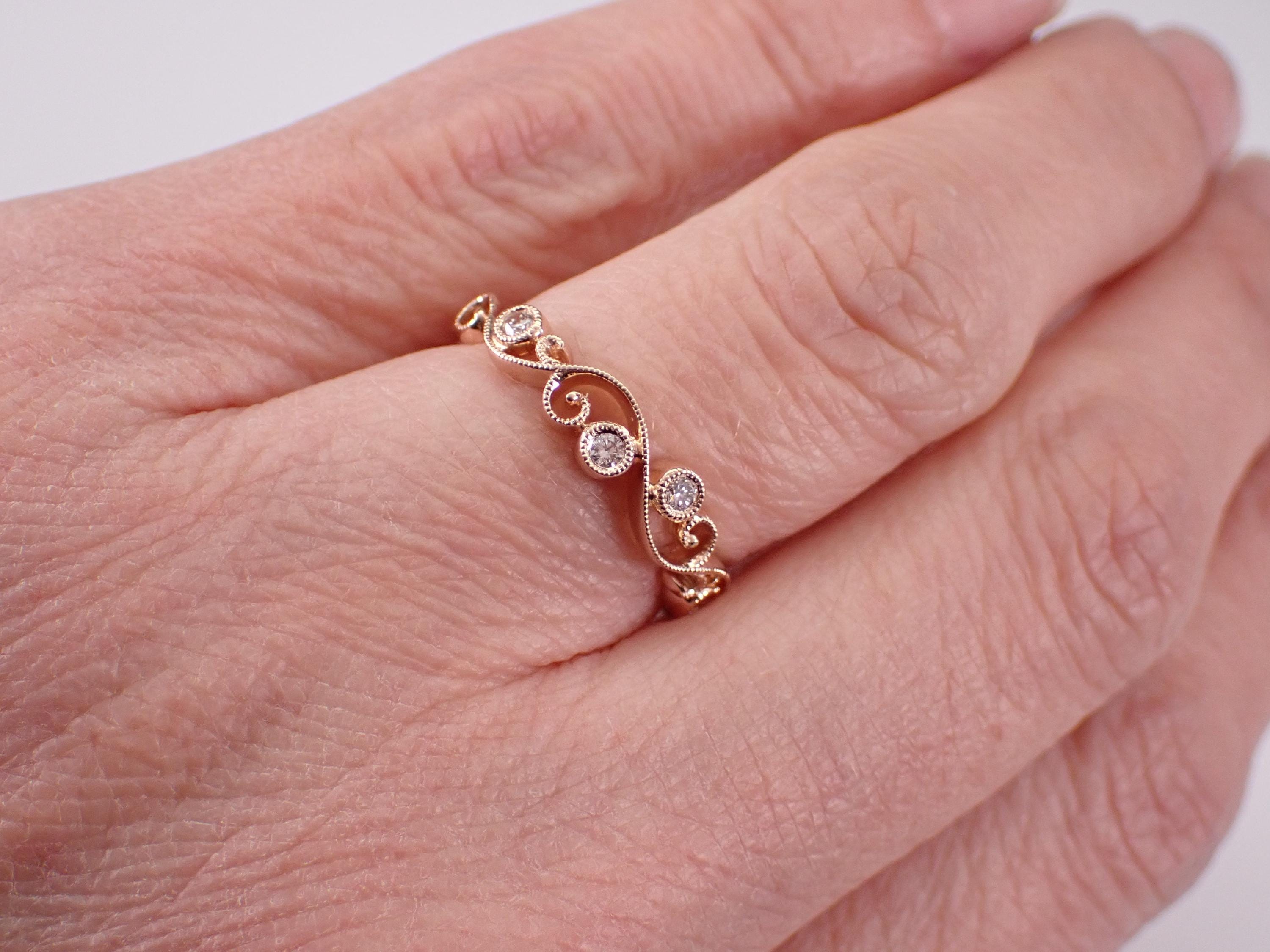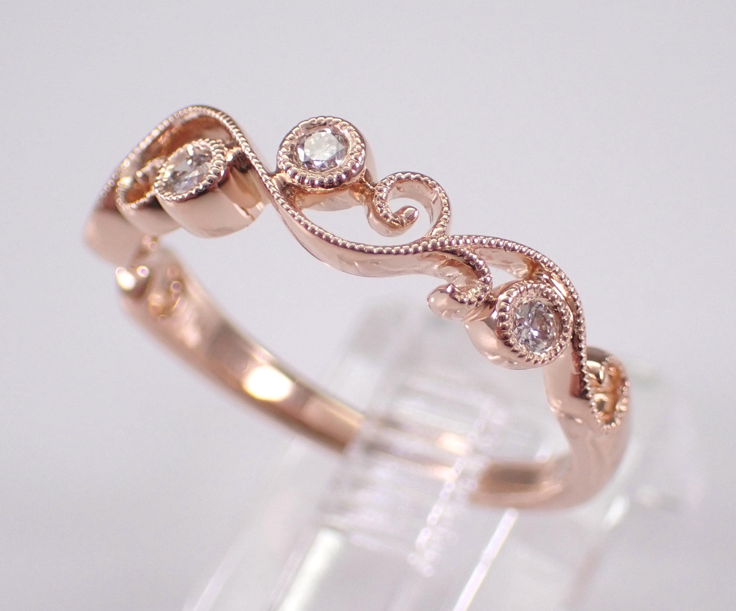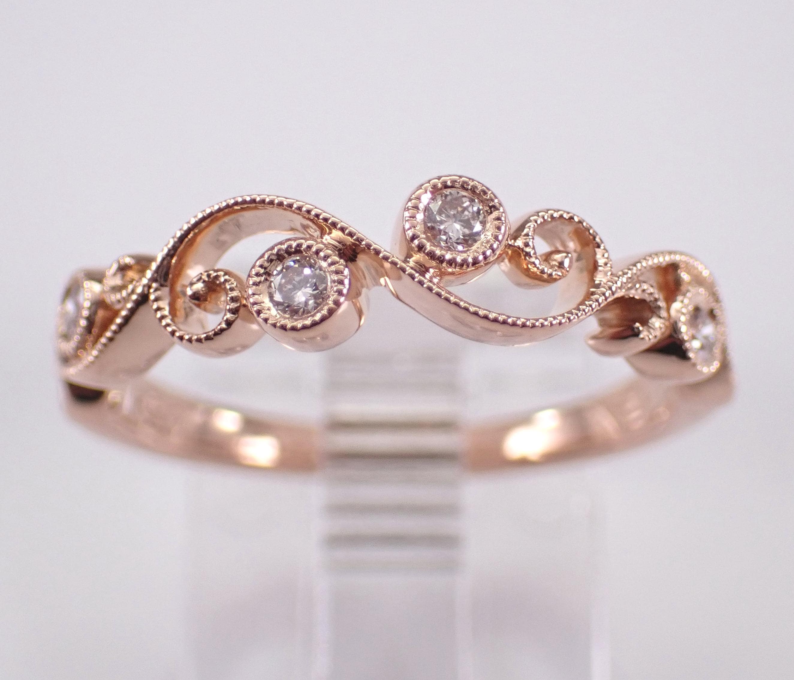 14K Rose Gold Diamond Wedding Ring Anniversary Band. This ring is set with four genuine, natural Round Brilliant diamonds. These diamonds are G color, VS clarity and weigh a total of .13 carat. The ring is 14KT Rose Gold, weighs 2.3 grams, measures 4.2 mm in width and is a finger size 6, can be resized (please inquire about sizing with the finger size you need). This ring will be accompanied by an appraisal by a GIA Certified Diamond Grader with the retail replacement value of $1,679.00. I will ship this ring promptly in a gift box.