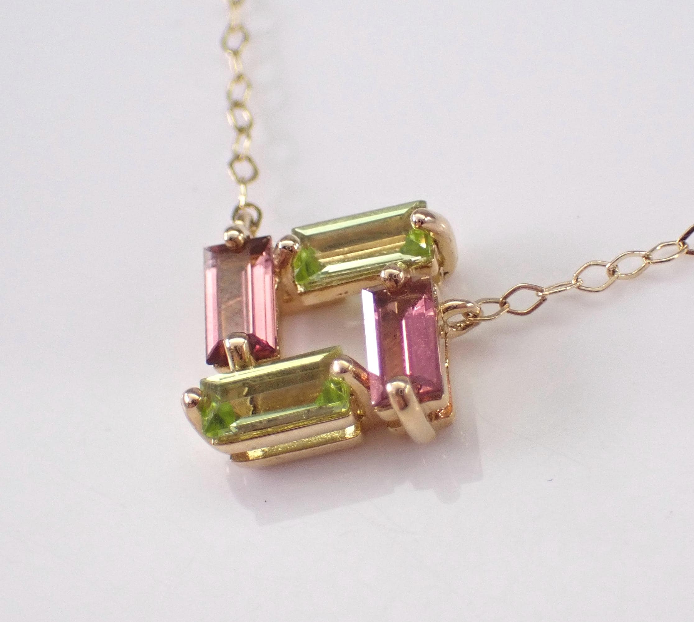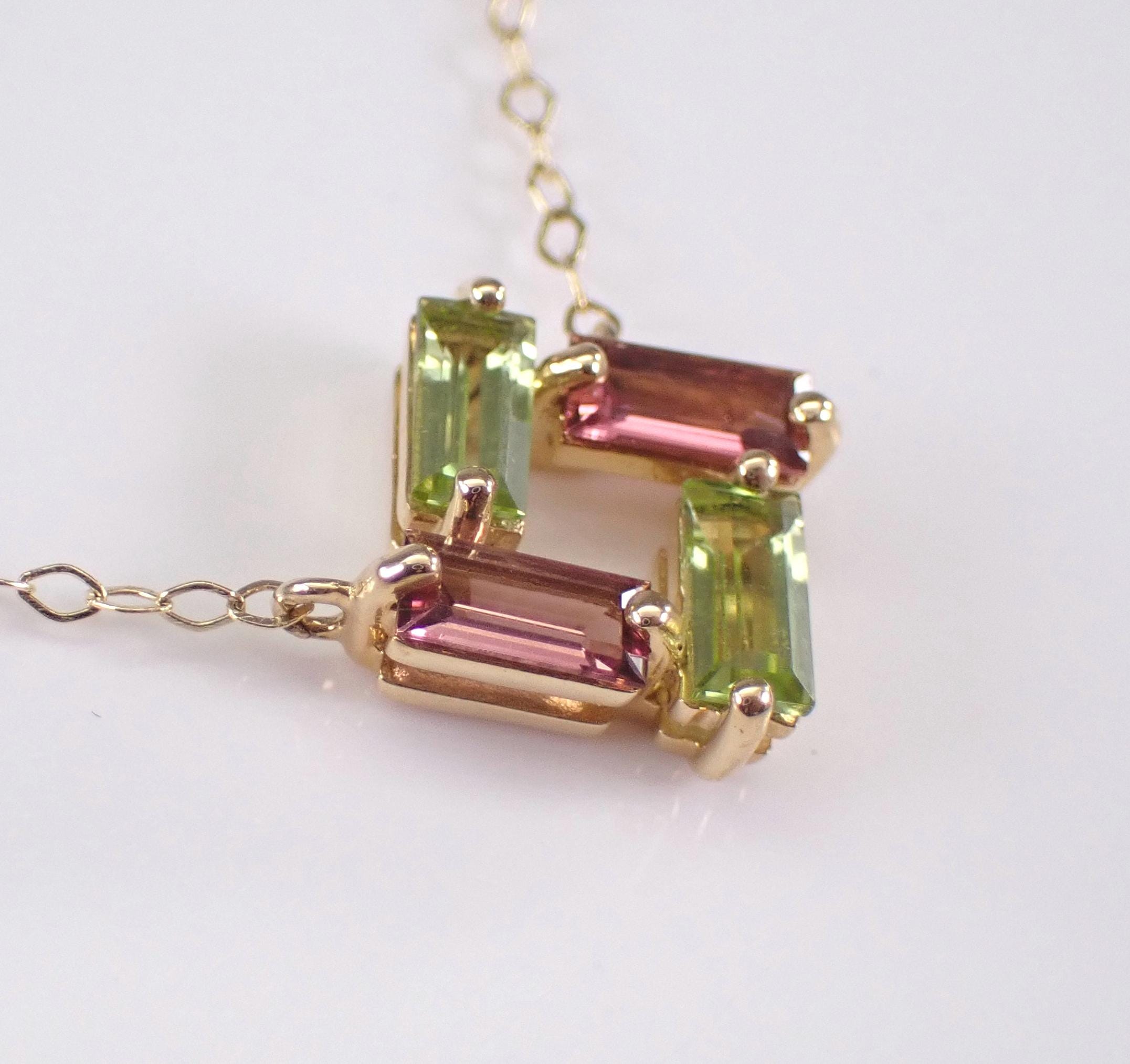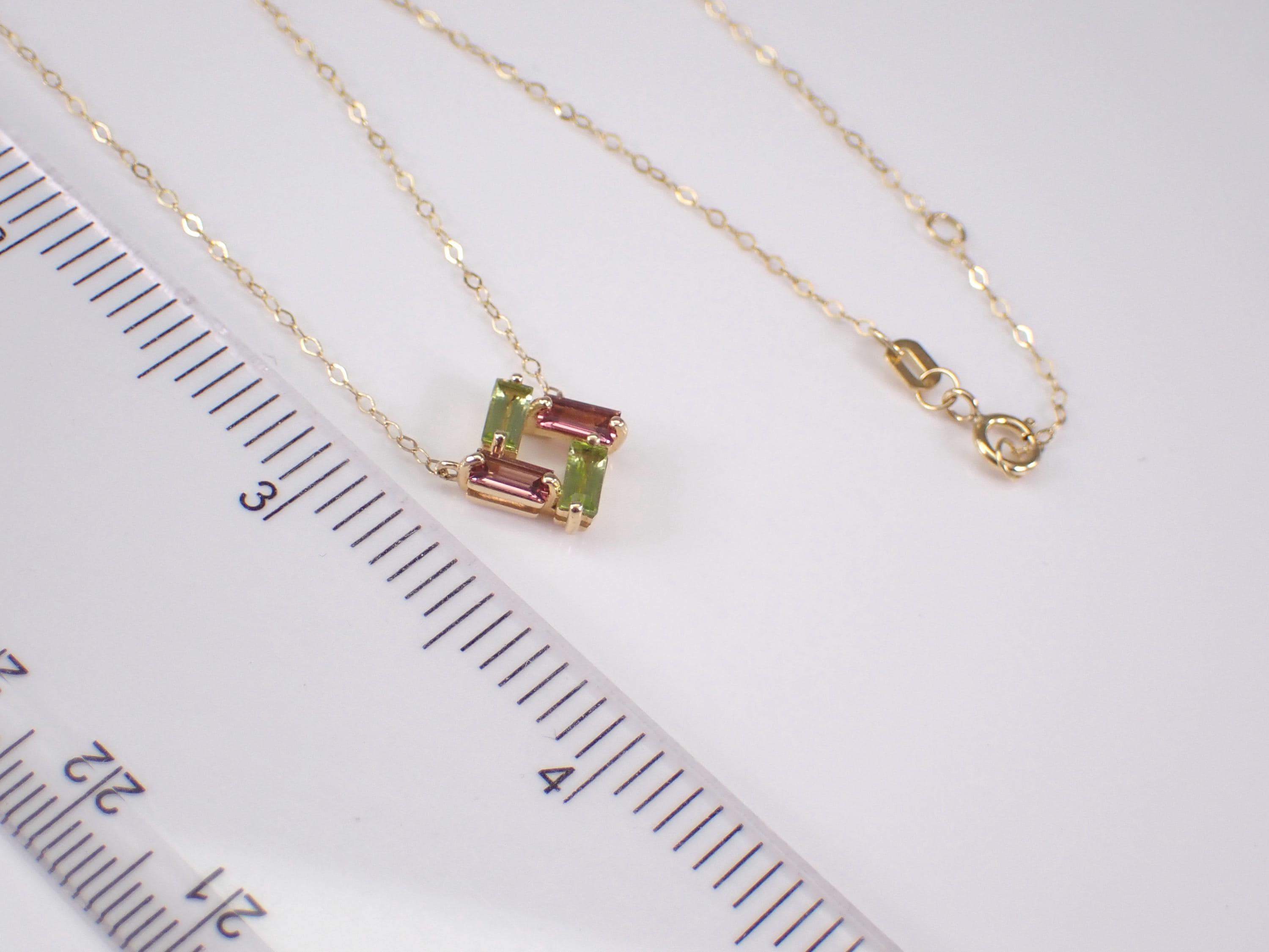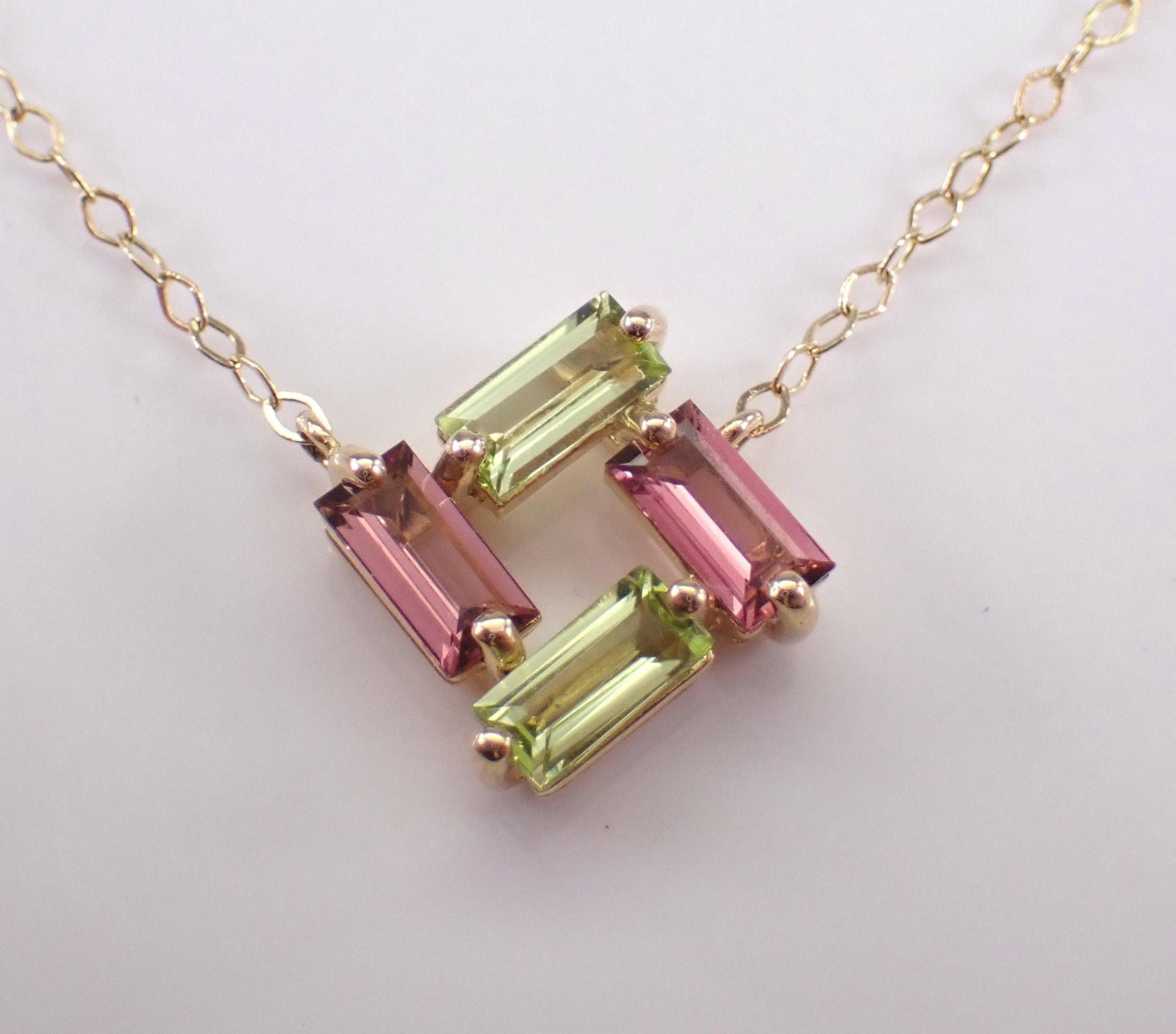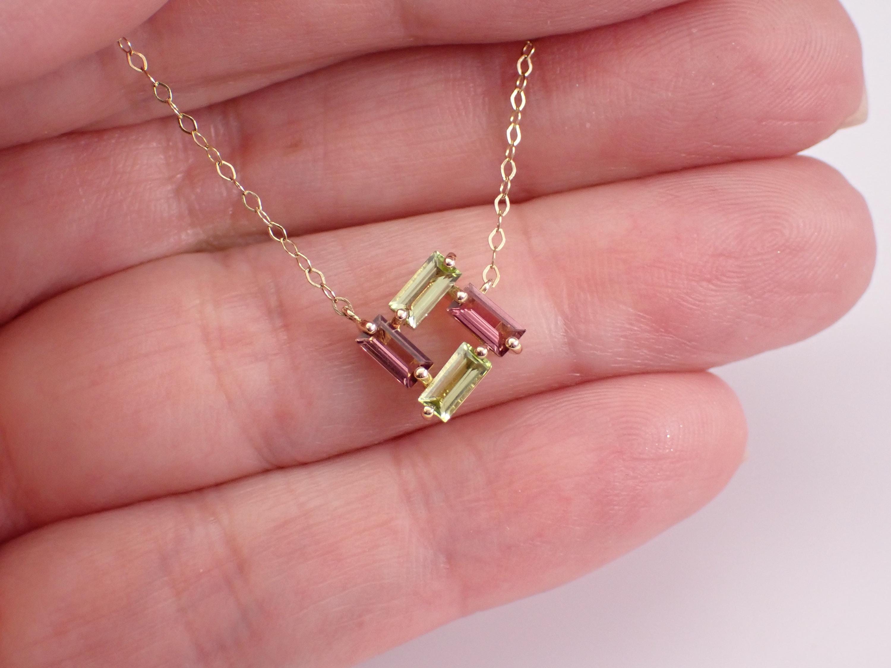 14K Yellow Gold Pink Tourmaline and Peridot Station Necklace. This pendant is set with two Baguette Peridot and two Baguette Pink Tourmaline. These gemstones are 100% genuine and weigh a total of 1/2 carat. This necklace is 14KT Yellow Gold, measures 17" in length and weighs 1.7 grams. This necklace will be accompanied by an appraisal written by a GIA Certified Diamond Grader with the retail replacement value of $1,389.00. I will ship this necklace promptly in a beautiful gift box.