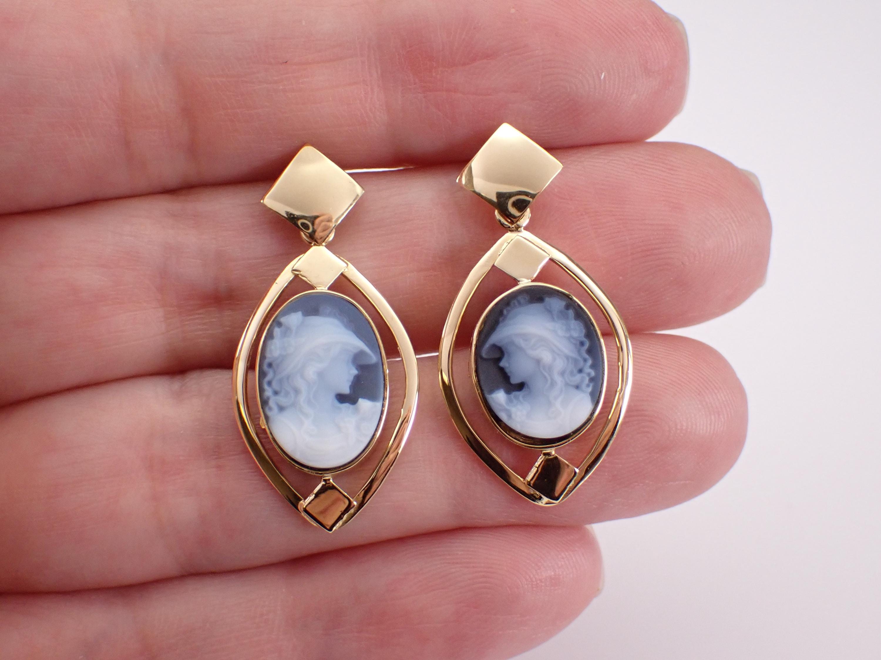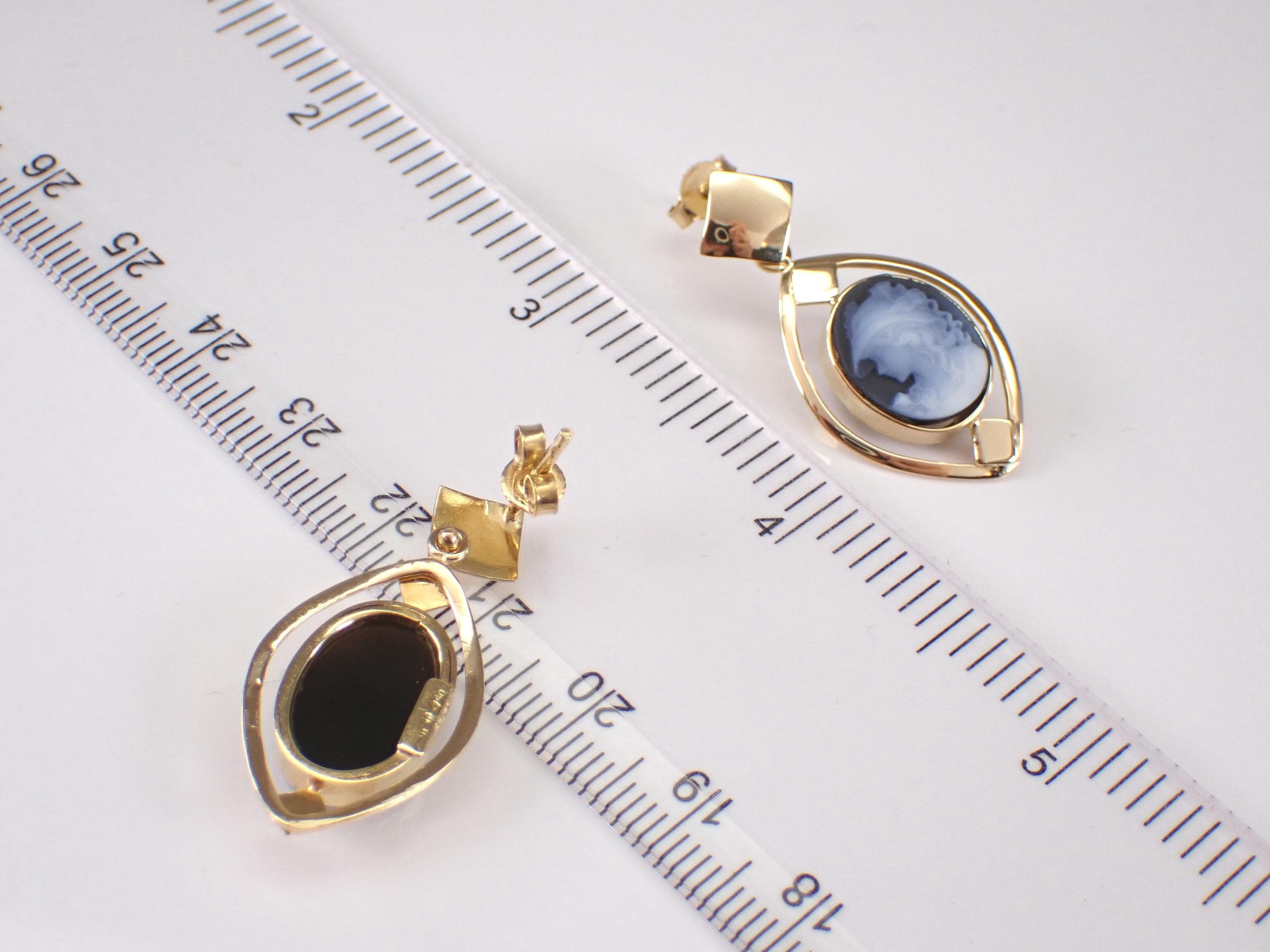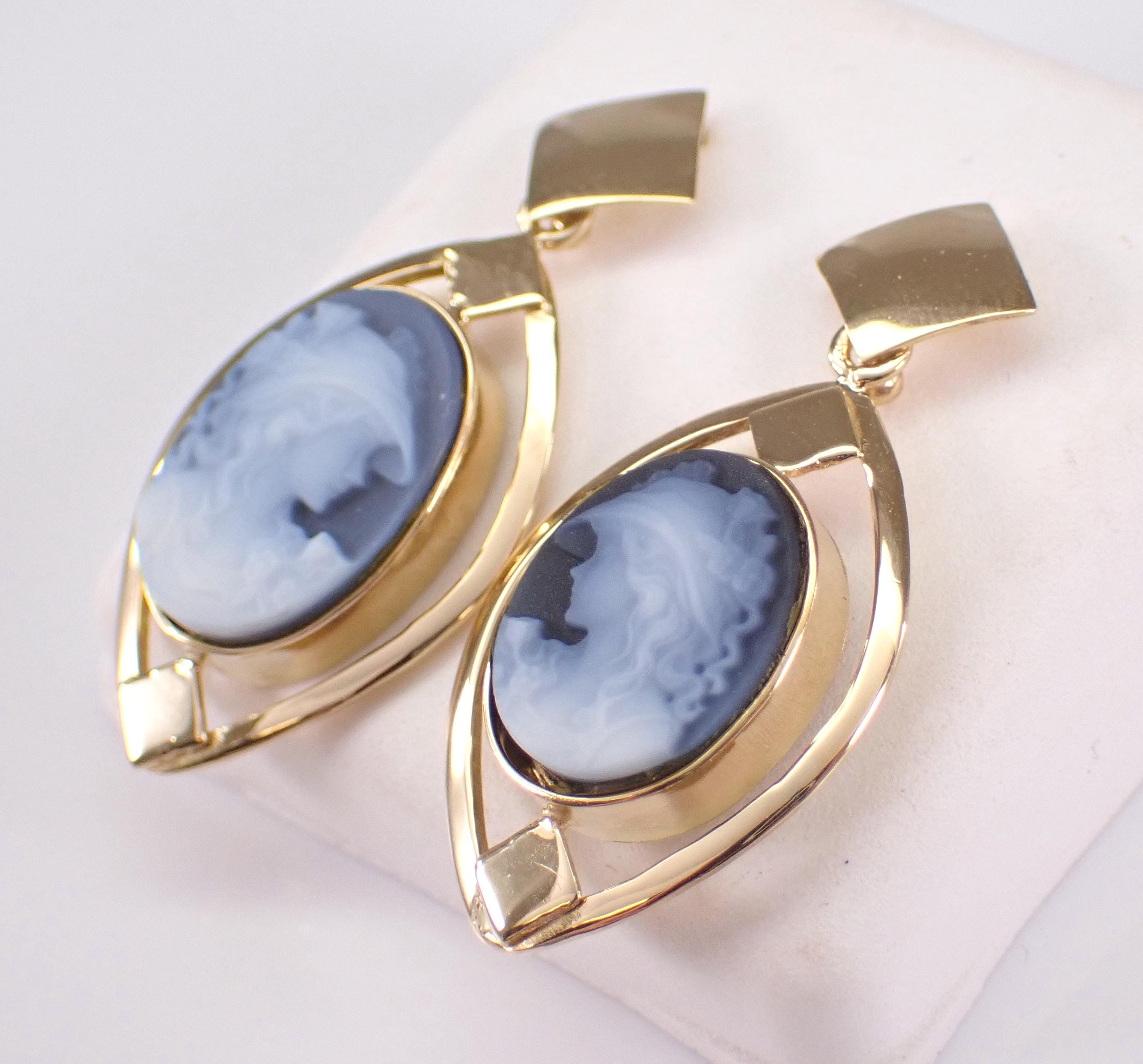 Vintage 18K Yellow Gold Cameo Dangle Earrings. These vintage earrings are in excellent condition. The Cameos in these earrings are carved from Blue Agate and measure 12 x 10 mm each. These earrings weigh a total of 5.6 grams and the earrings measure 31 X 15.5 mm. These earrings are for pierced ears and have friction post backings. These earrings will be shipped promptly in a gift box accompanied by an appraisal for insurance and authentication purposes.
