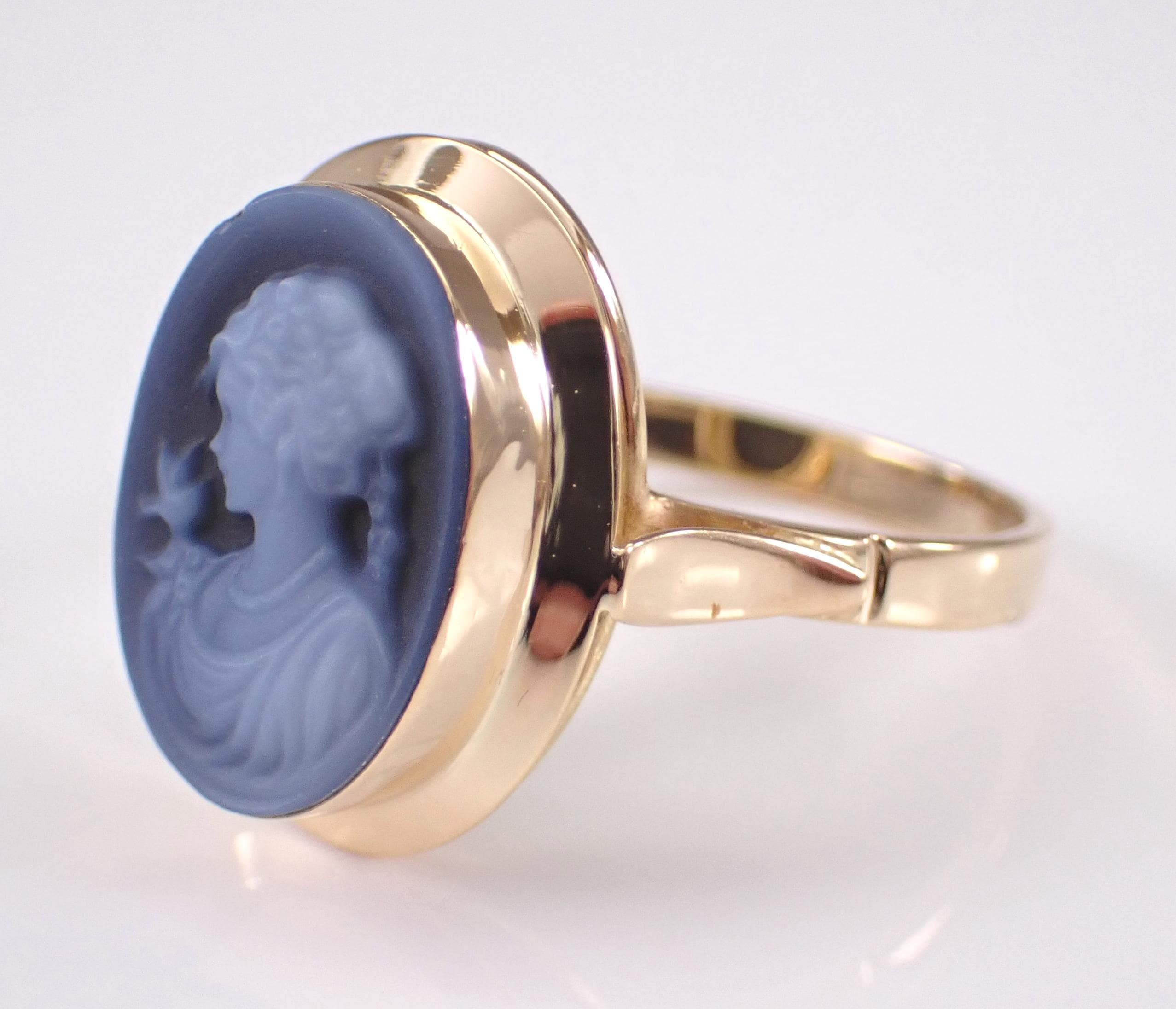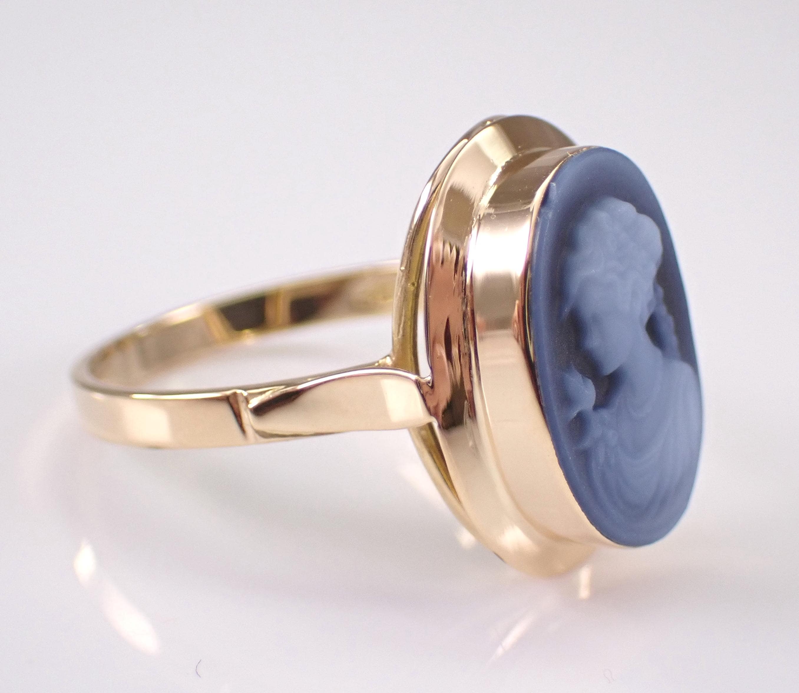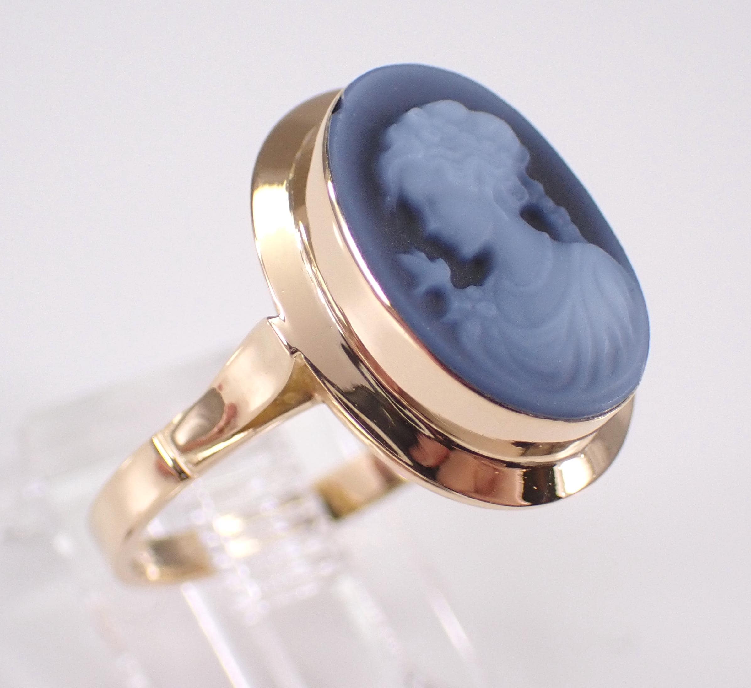 18K Yellow Gold Antique Blue Agate Cameo Ring. This ring is set in the center with an Oval Cameo. This Cameo measures 13.5 X 9.5 mm. This ring is 18KT Yellow Gold, weighs 3.0 grams and is a finger size 6 1/2, can be resized (please inquire about sizing with the finger size you need). This ring dates back to Circa 1950's and the top of the ring measures 16 X 14 mm. This ring will be accompanied by an appraisal for insurance and authentication purposes. I will ship this ring promptly in a beautiful gift box.