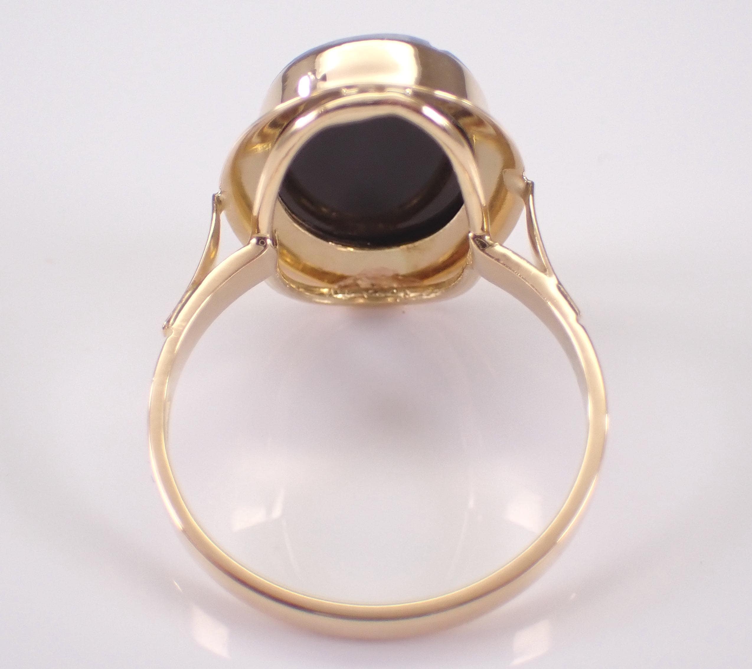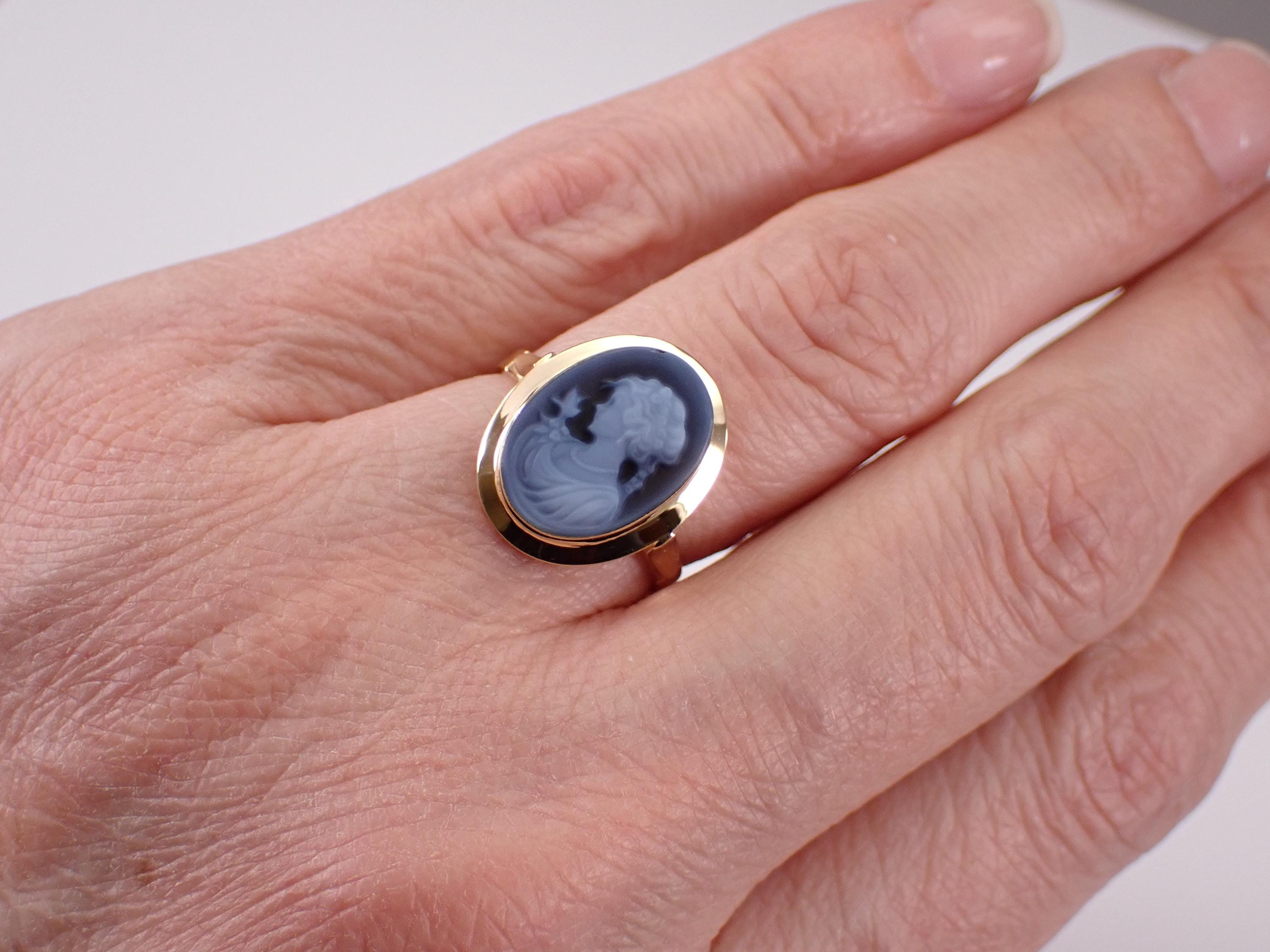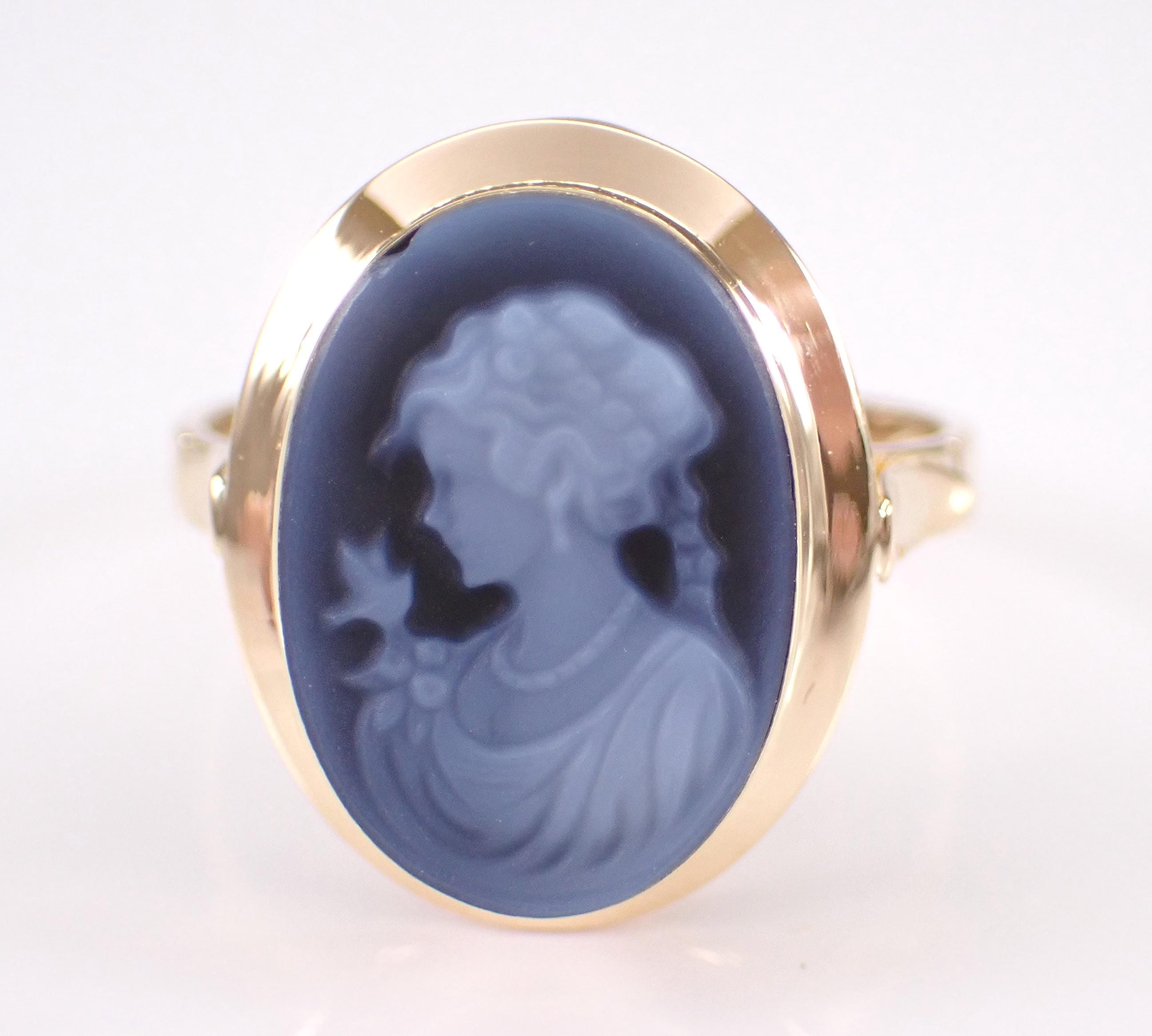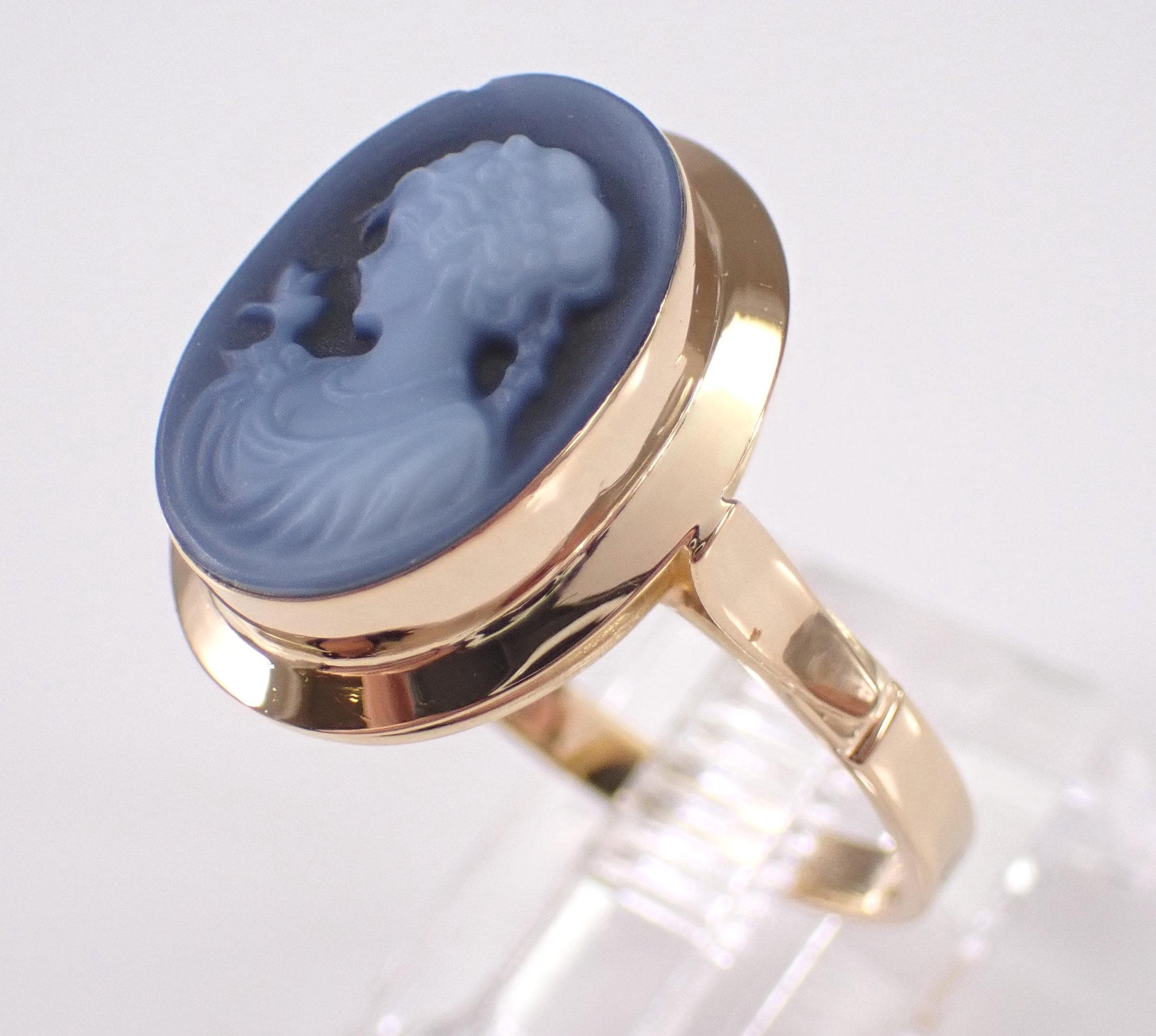18K Yellow Gold Antique Blue Agate Cameo Ring. This ring is set in the center with an Oval Cameo. This Cameo measures 13.5 X 9.5 mm. This ring is 18KT Yellow Gold, weighs 3.0 grams and is a finger size 6 1/2, can be resized (please inquire about sizing with the finger size you need). This ring dates back to Circa 1950's and the top of the ring measures 16 X 14 mm. This ring will be accompanied by an appraisal for insurance and authentication purposes. I will ship this ring promptly in a beautiful gift box.