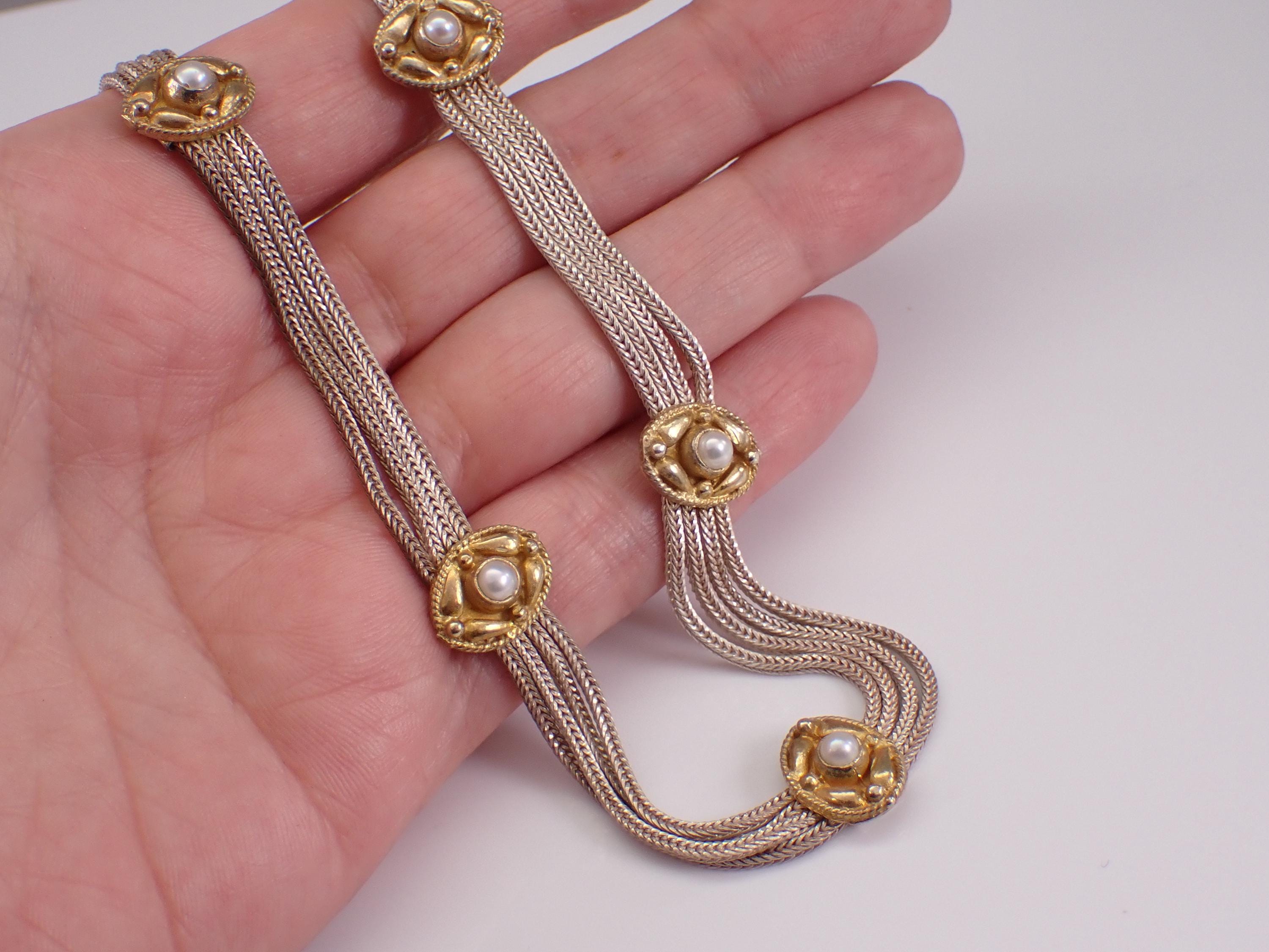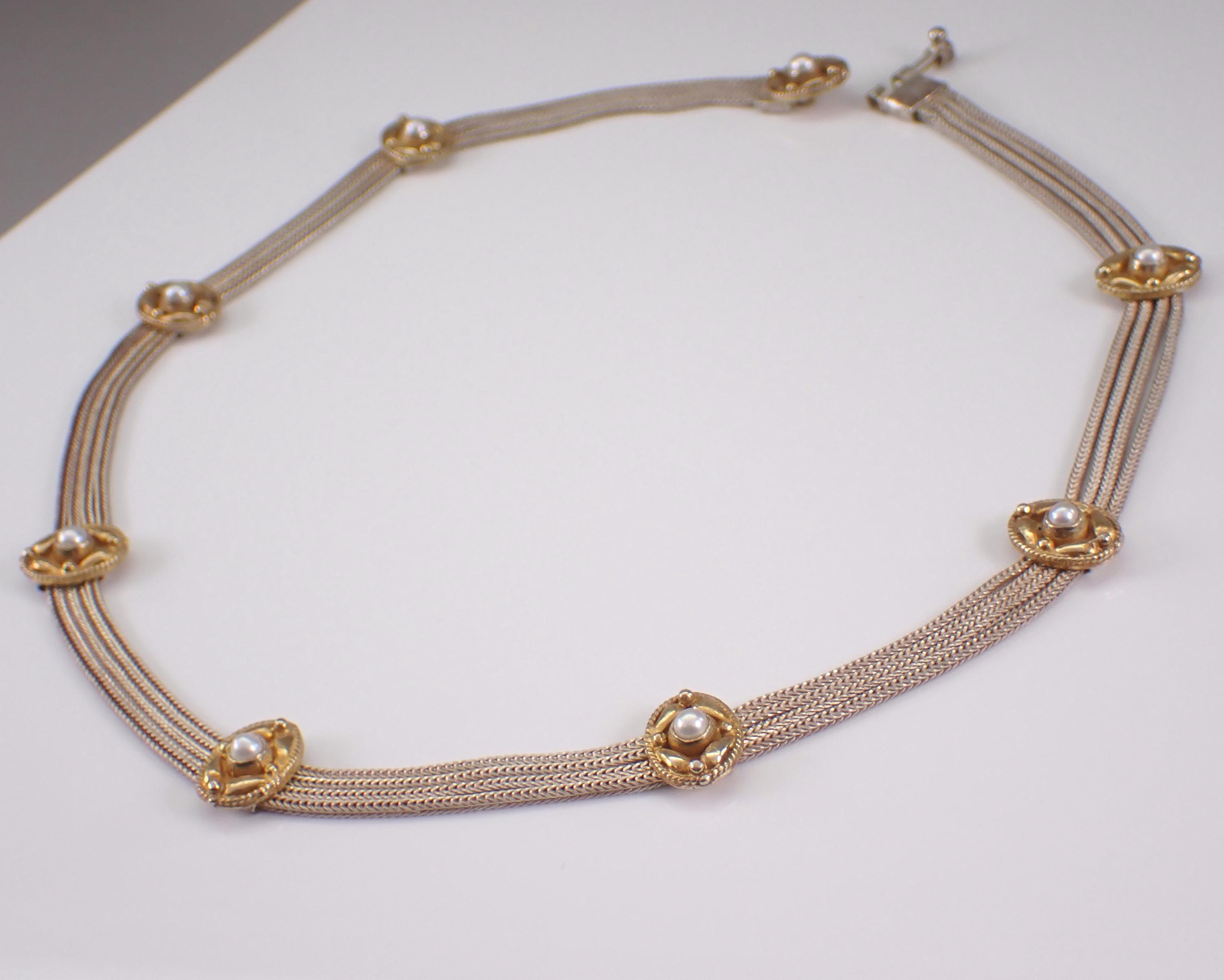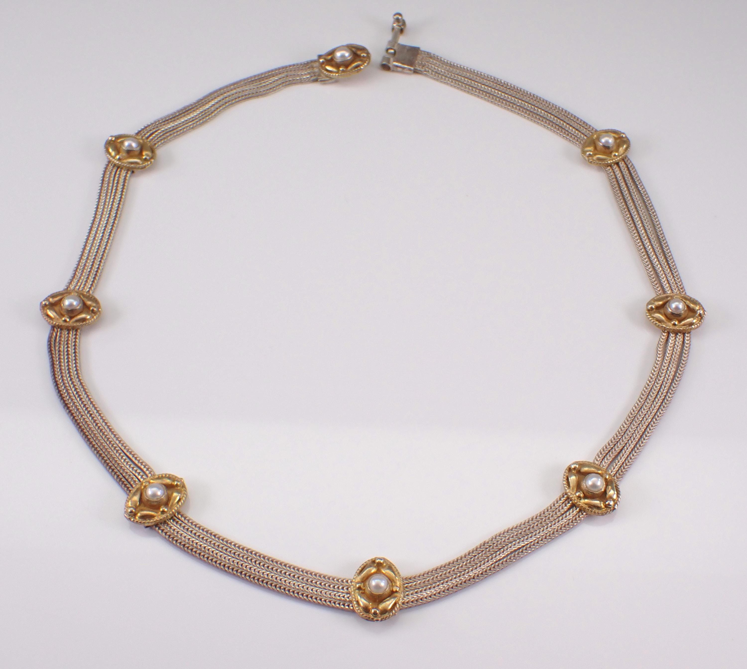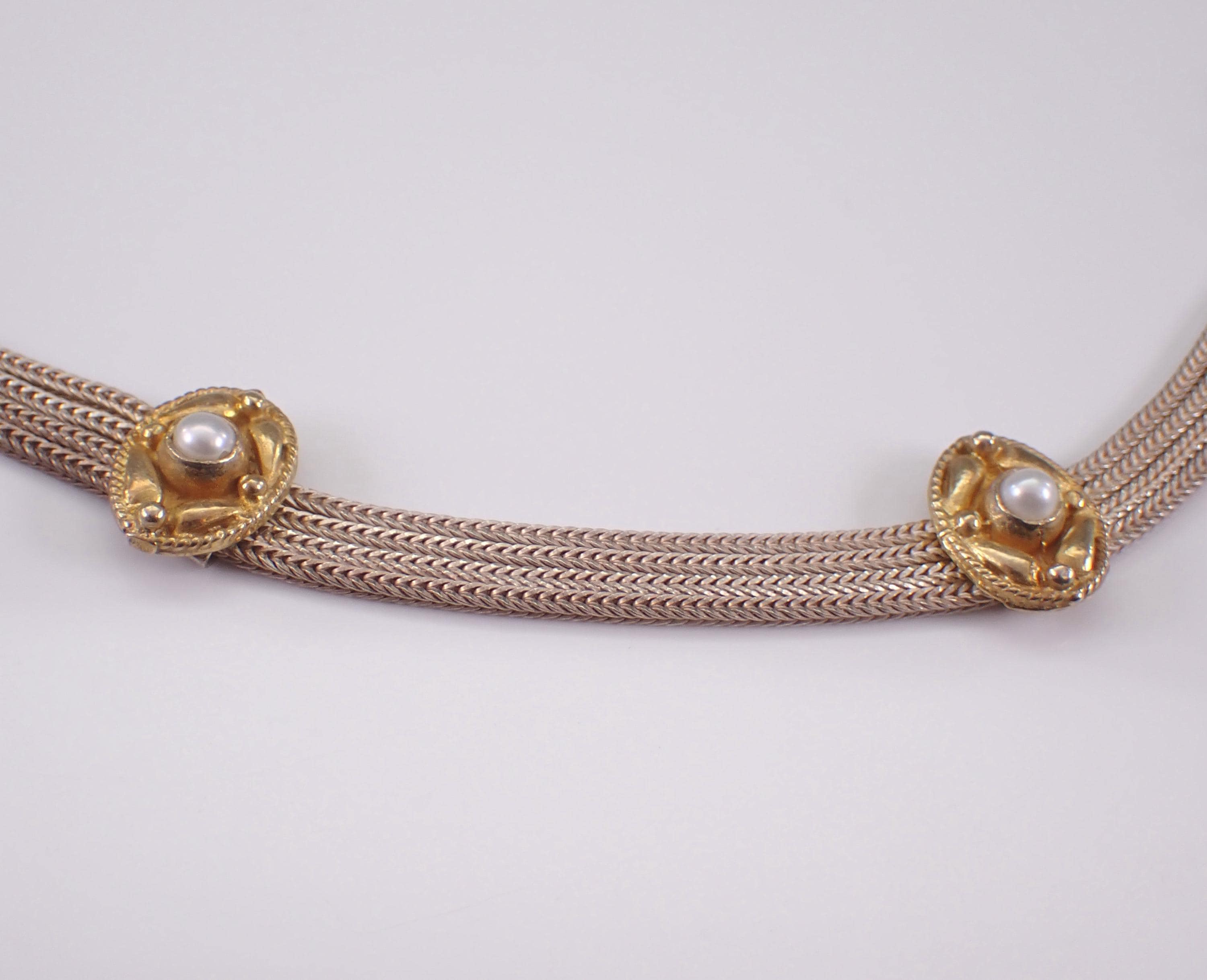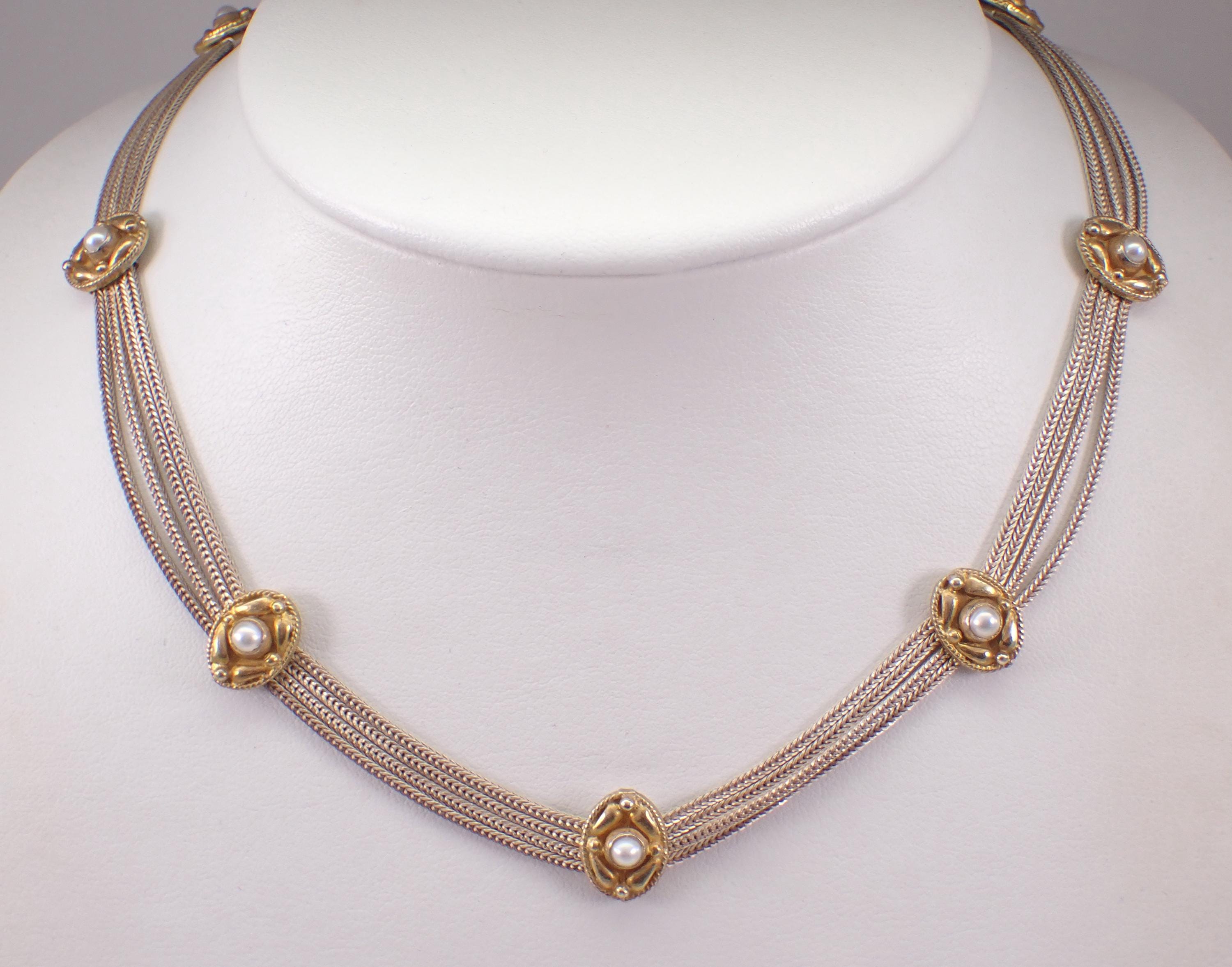 Sterling Silver Pearl Station Two Tone Choker Necklace.