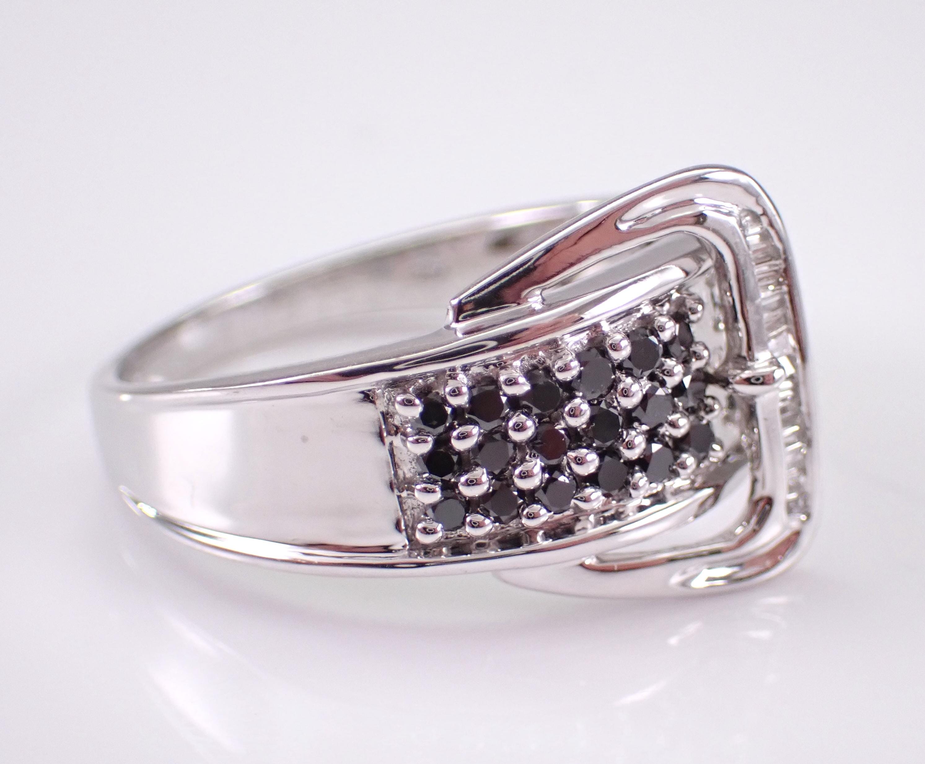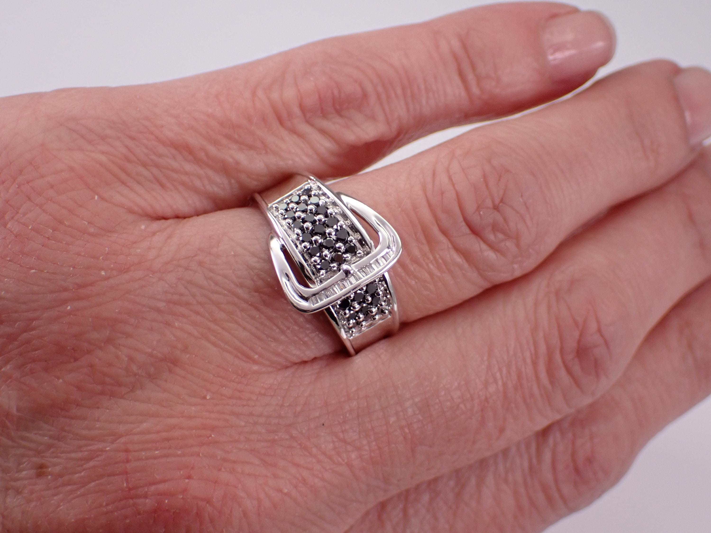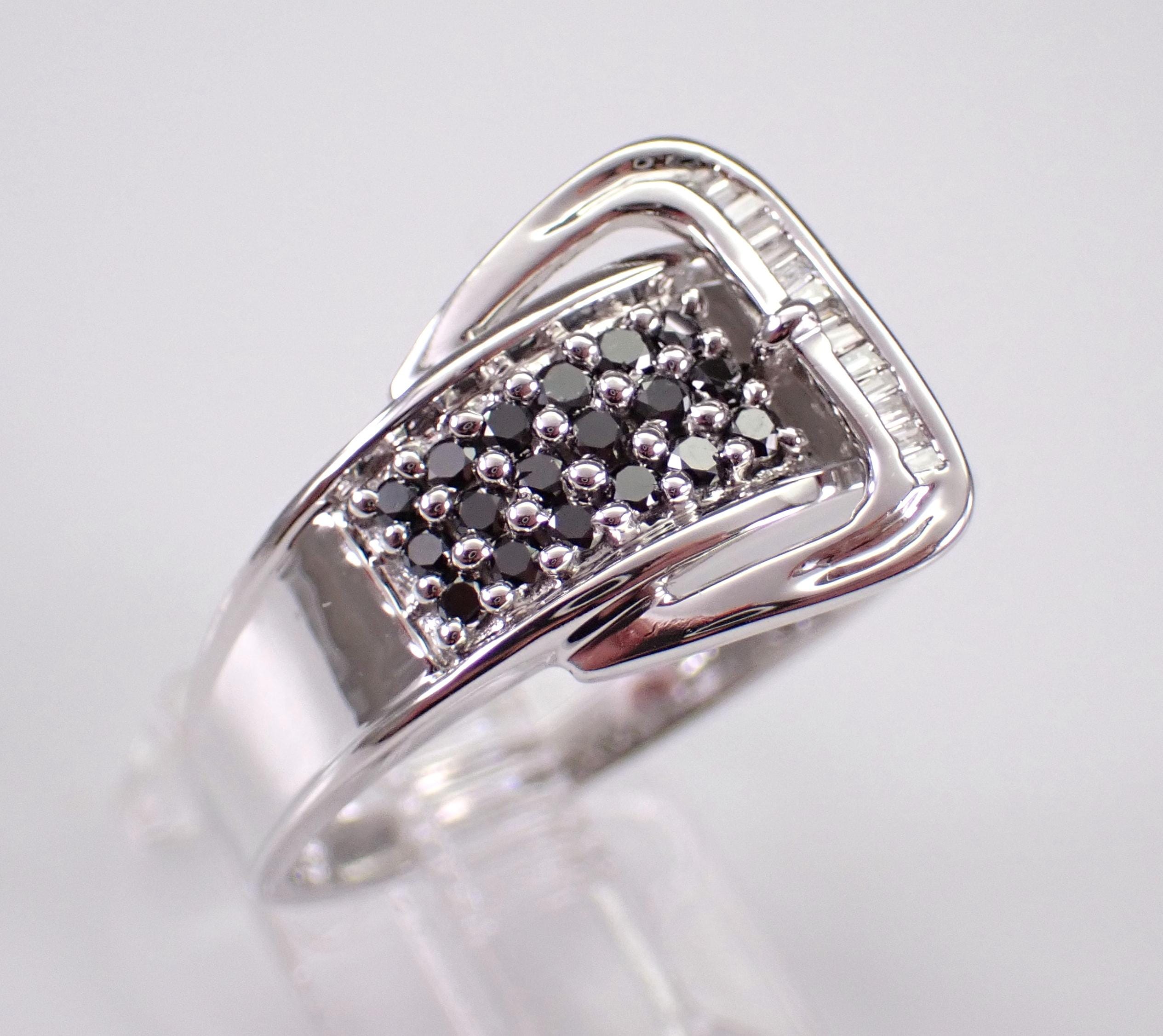 14K White Gold Diamond Buckle Belt Band. This ring is set with twenty-seven genuine Round Black Diamonds and fourteen natural Baguette Diamonds. These diamonds are H color (white), SI/I1 clarity and weigh a total of 1/2 carat. This ring is 14KT White Gold, weighs 5.7 grams, measures 8 mm in width and is a finger size 9, which can be sized (please inquire about sizing with the finger size you need). The ring will be accompanied by an appraisal by a GIA Certified Diamond Grader with the retail replacement value of $2,895.00. I will ship this ring promptly in a gift box.