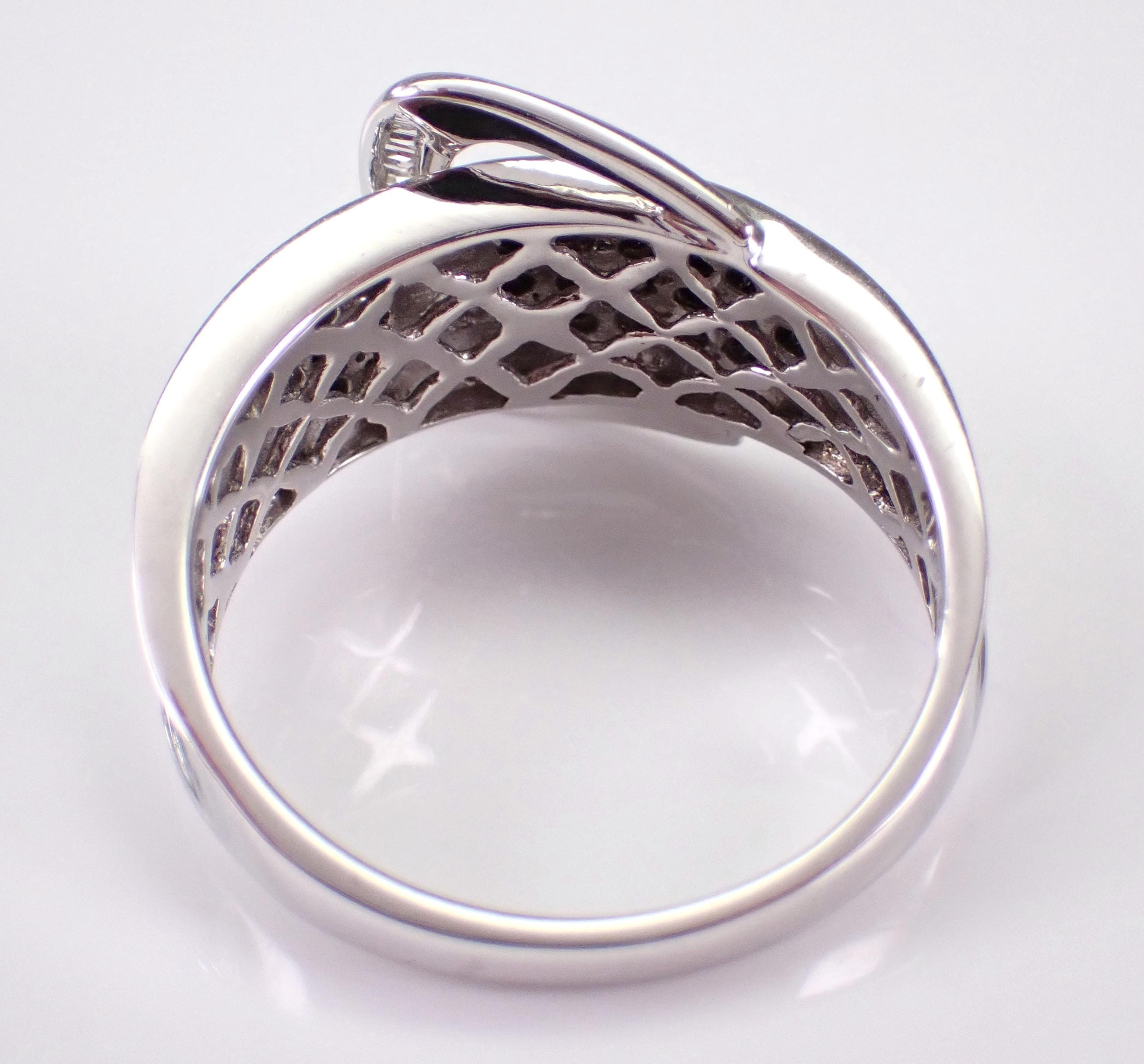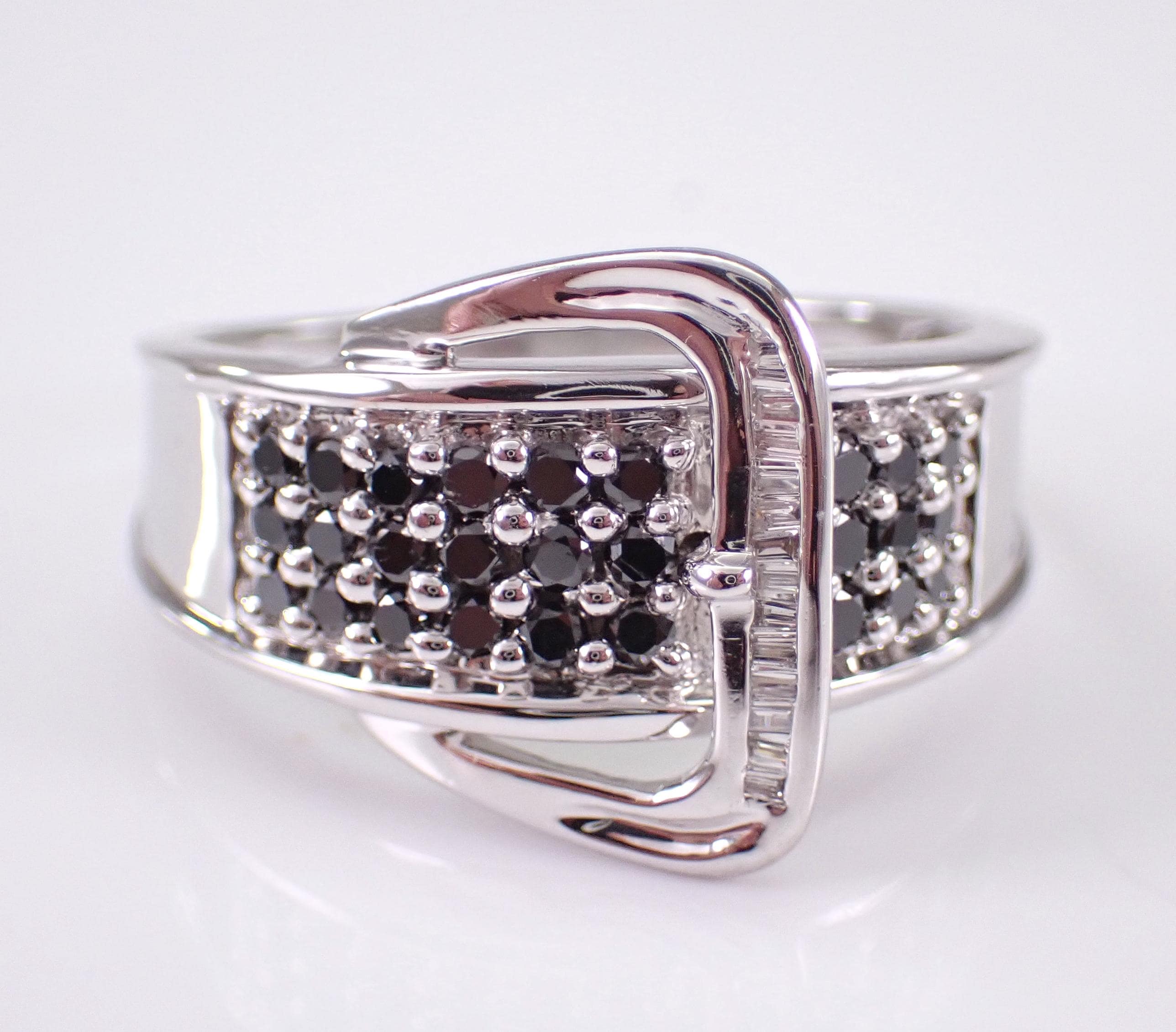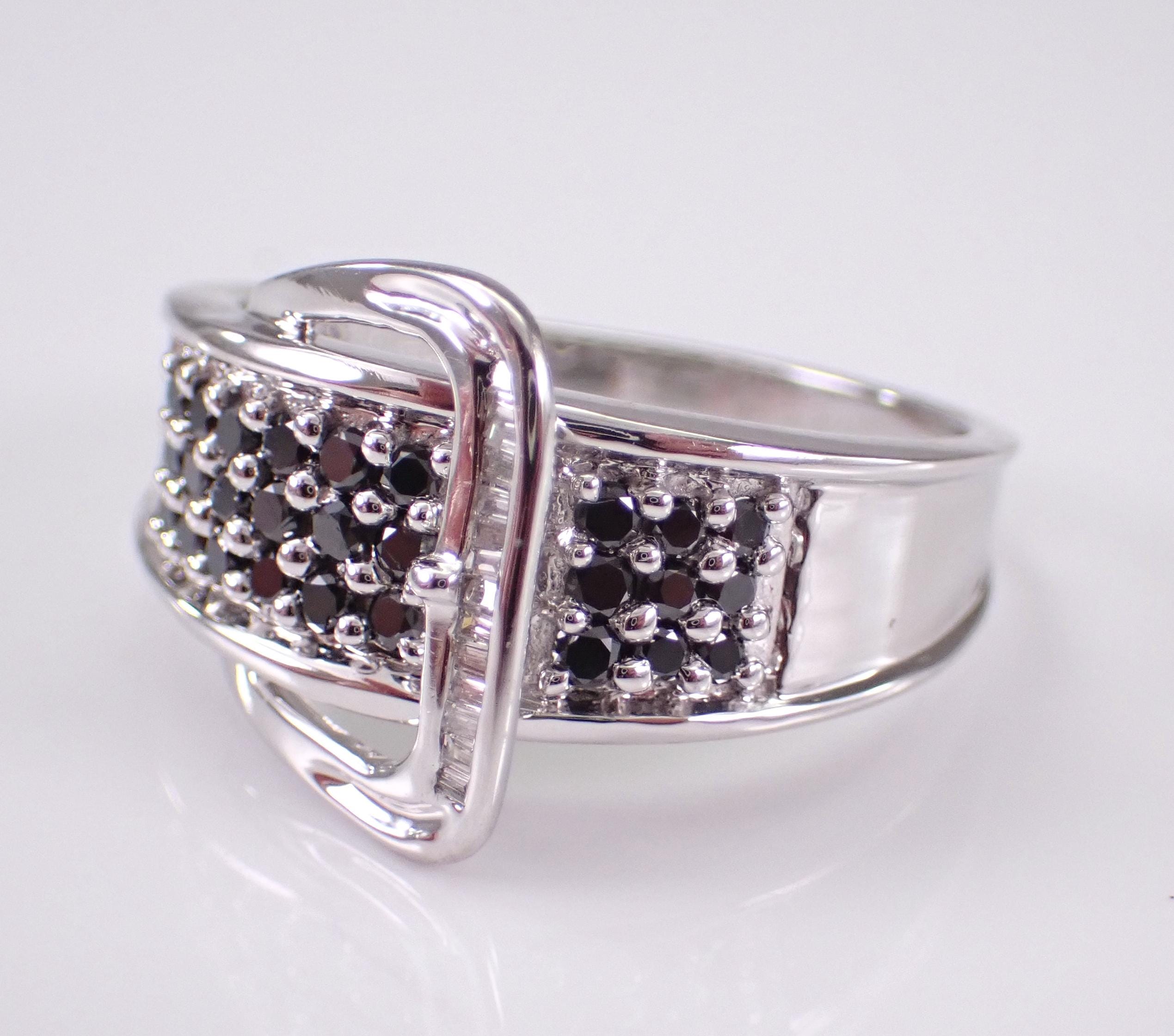14K White Gold Diamond Buckle Belt Band. This ring is set with twenty-seven genuine Round Black Diamonds and fourteen natural Baguette Diamonds. These diamonds are H color (white), SI/I1 clarity and weigh a total of 1/2 carat. This ring is 14KT White Gold, weighs 5.7 grams, measures 8 mm in width and is a finger size 9, which can be sized (please inquire about sizing with the finger size you need). The ring will be accompanied by an appraisal by a GIA Certified Diamond Grader with the retail replacement value of $2,895.00. I will ship this ring promptly in a gift box.