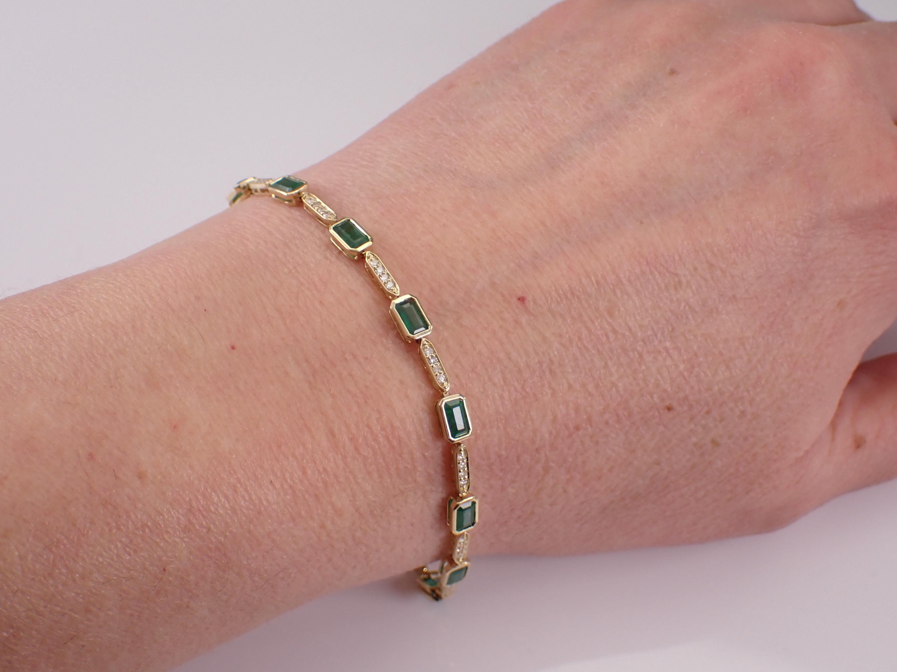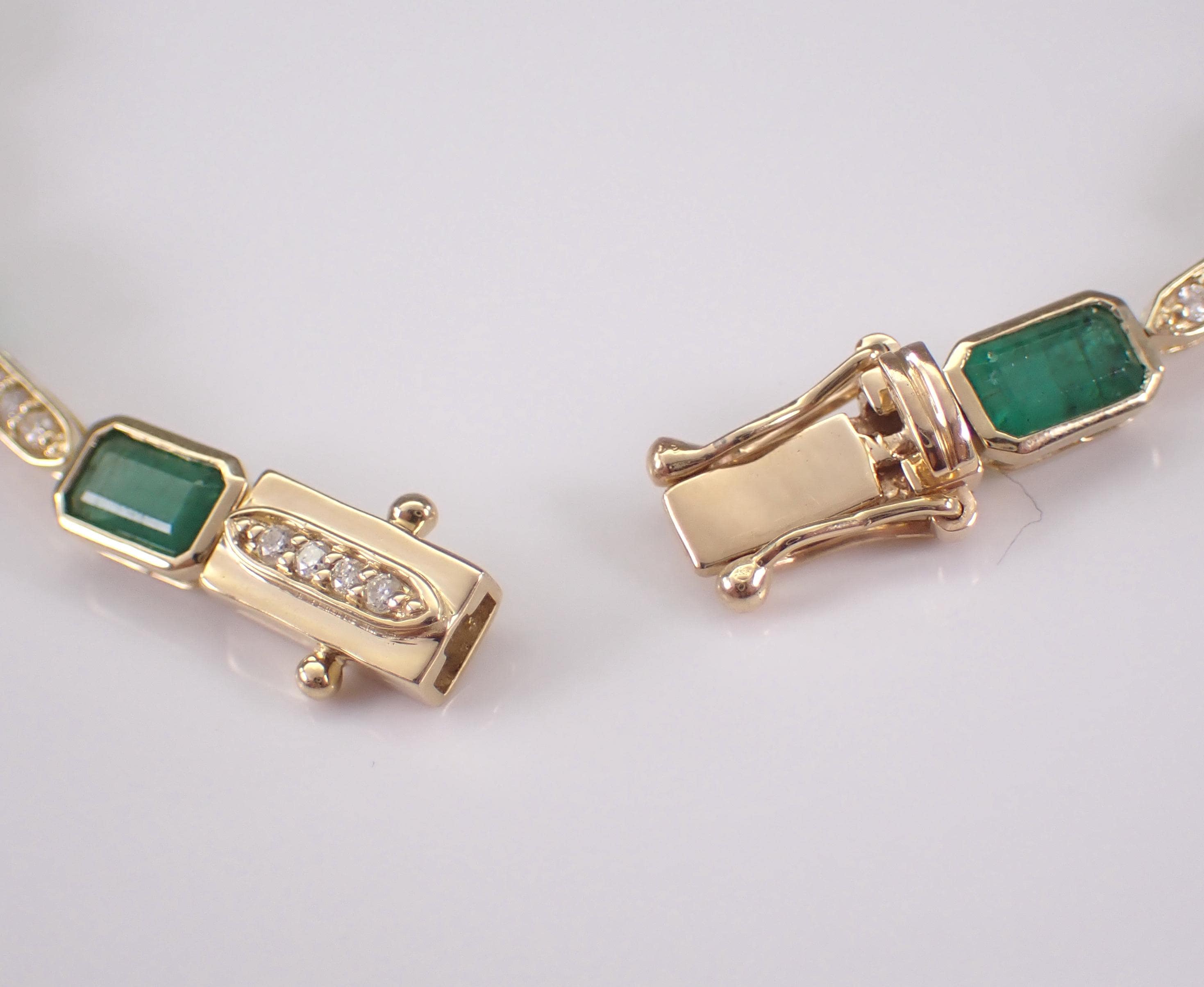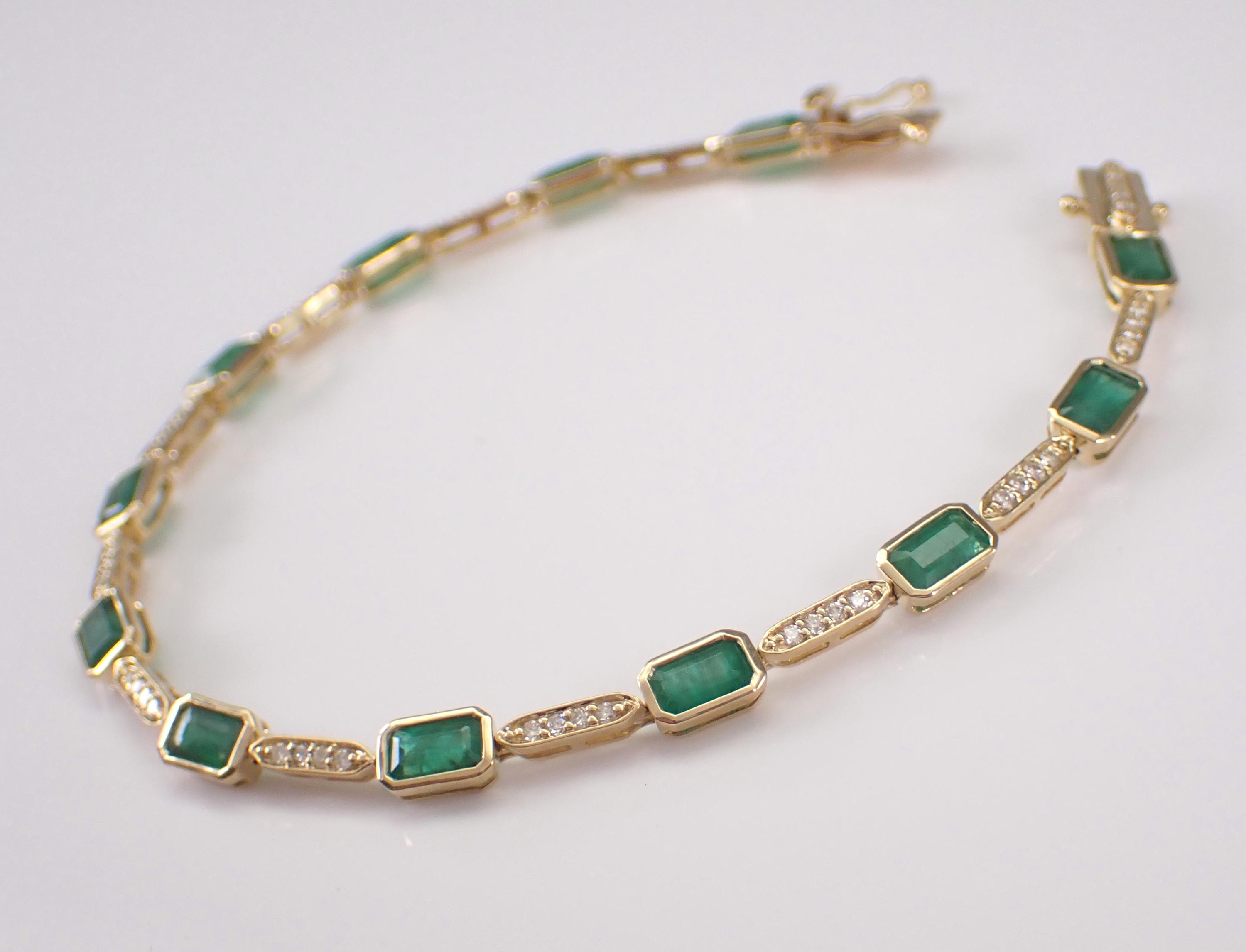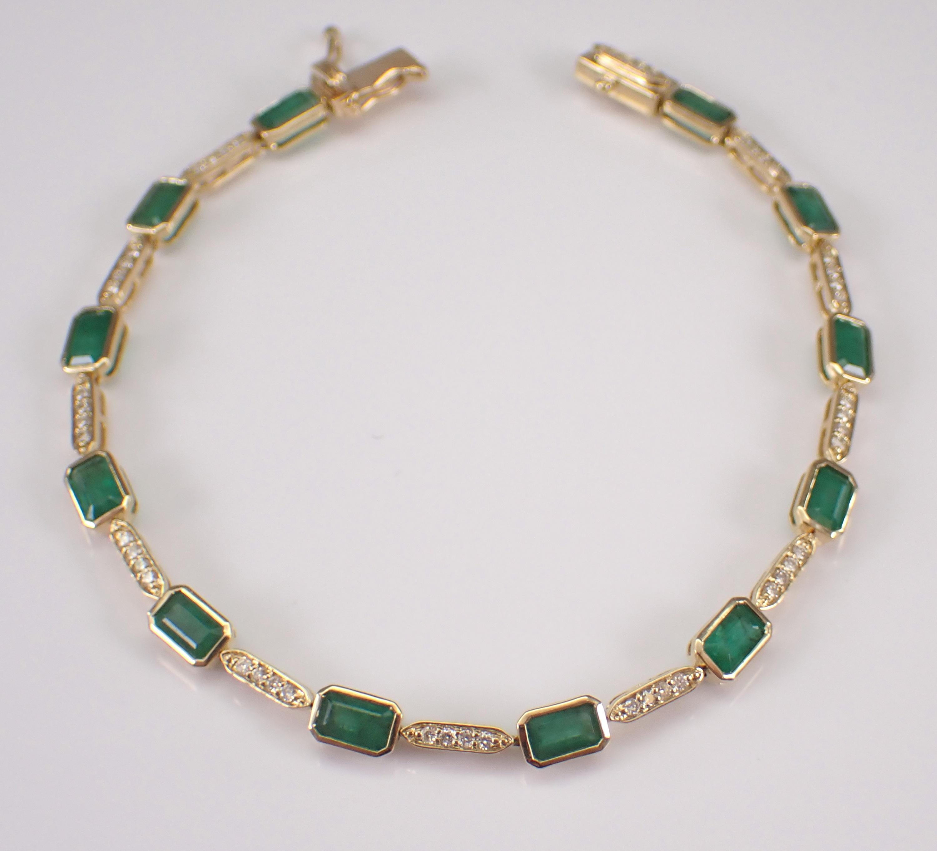 14K Yellow Gold Emerald and Diamond Tennis Bracelet. This bracelet is set with twelve natural Emerald cut Emeralds and forty-eight genuine Round Brilliant Diamonds. These Emeralds measure 5 X 3 mm each and amount to a total weight of 3 carats. The diamonds in this bracelet are H color, SI clarity and weigh a total of 1/2 carats. The bracelet is 14K Yellow Gold, weighs 6.5 grams and measures 6 3/4" in length. This bracelet will be accompanied by an appraisal by a GIA Certified Diamond Grader with the retail replacement value of $5,285.00. I will ship this bracelet promptly in a gift box.