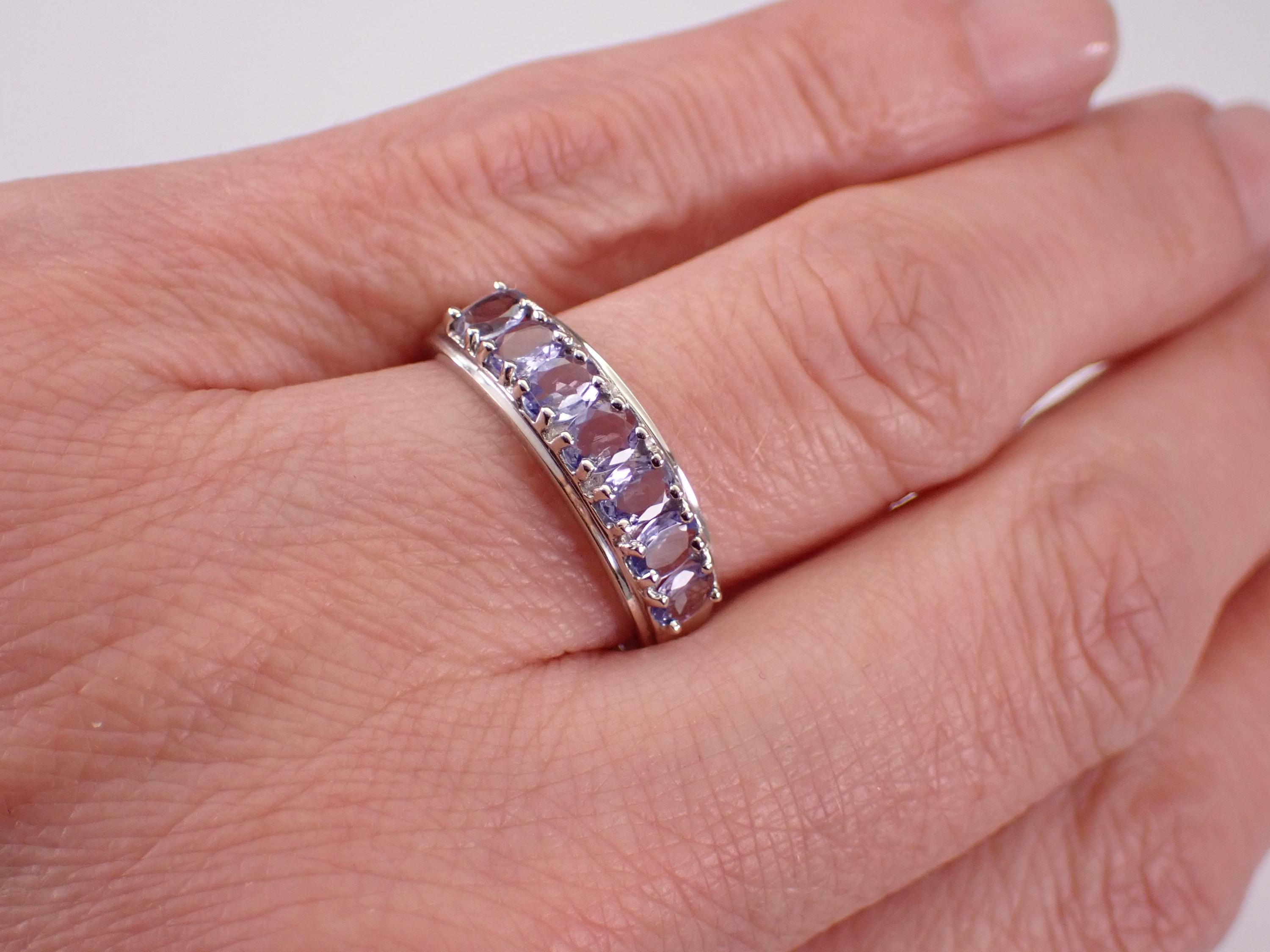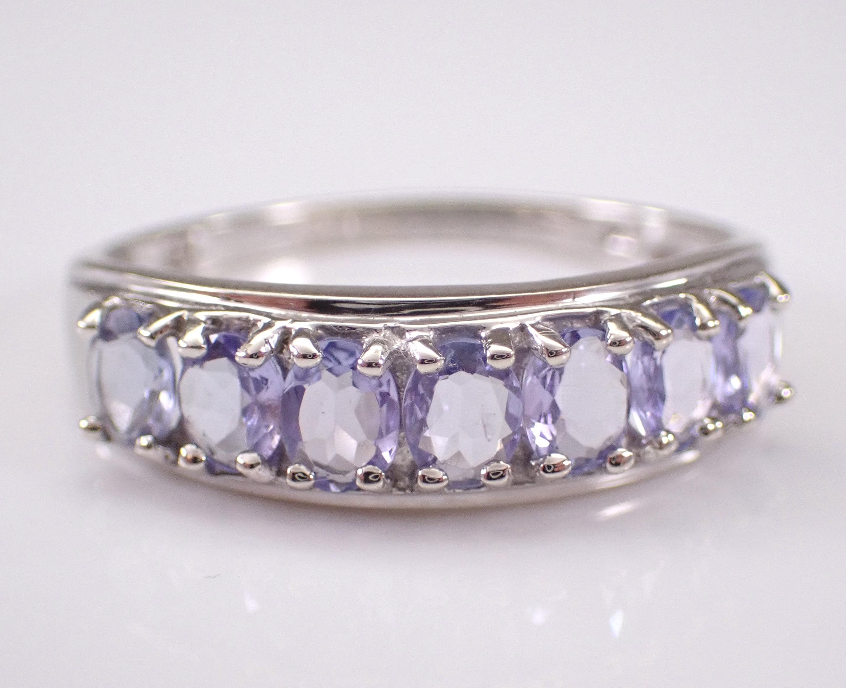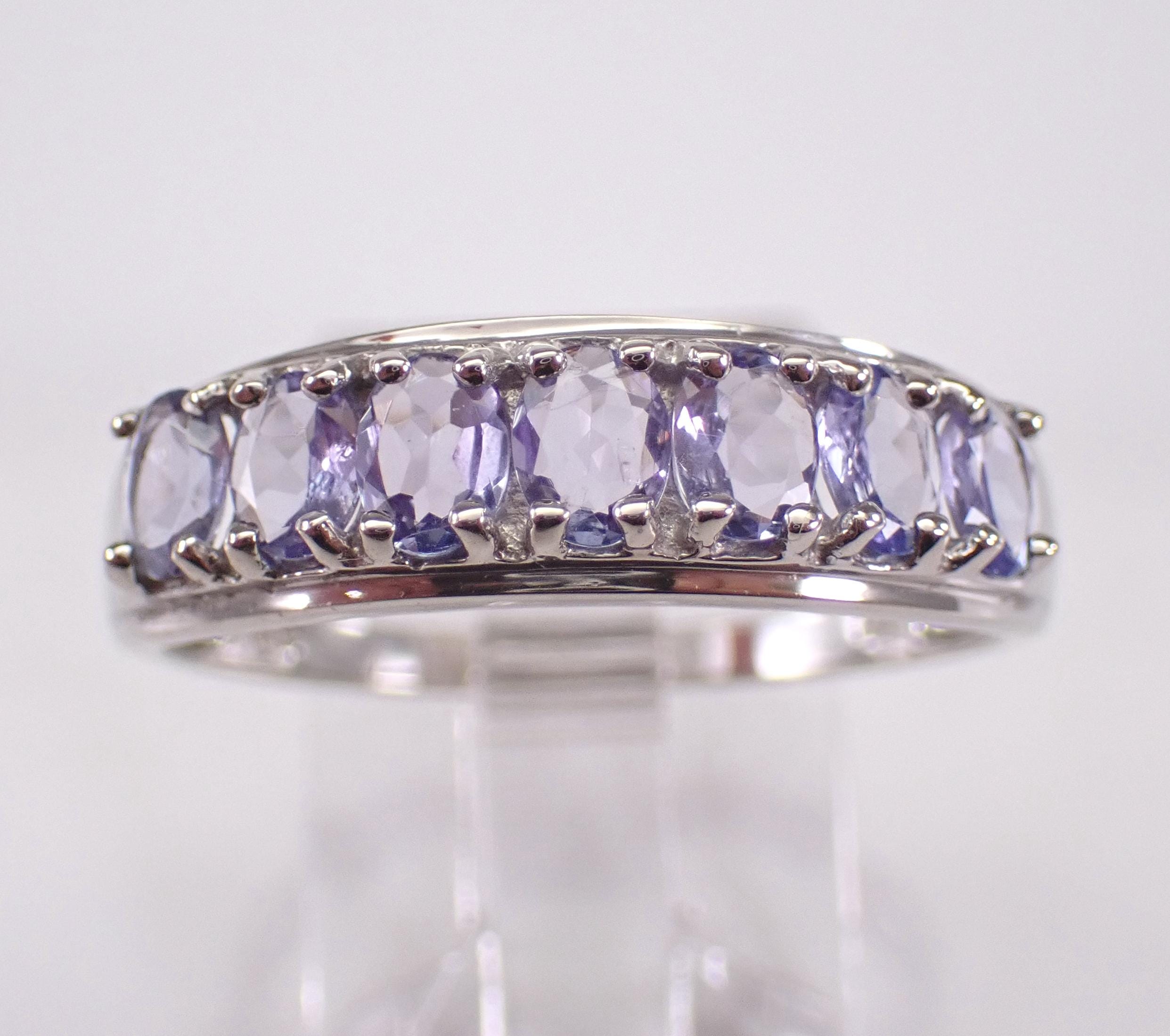White Gold Tanzanite Wedding Ring Anniversary Band. This ring set with seven genuine Oval Tanzanite. These Tanzanite are a beautiful light pale purple color, measure 4 X 3 mm each and amount to a total weight of 1 1/2 carats. This ring is 10KT White Gold, weighs 2.1 grams, measures 6 mm in width and is a finger size 9 1/4, which can be resized (please inquire about sizing with the finger size you need). I will ship this ring promptly in a beautiful gift box.