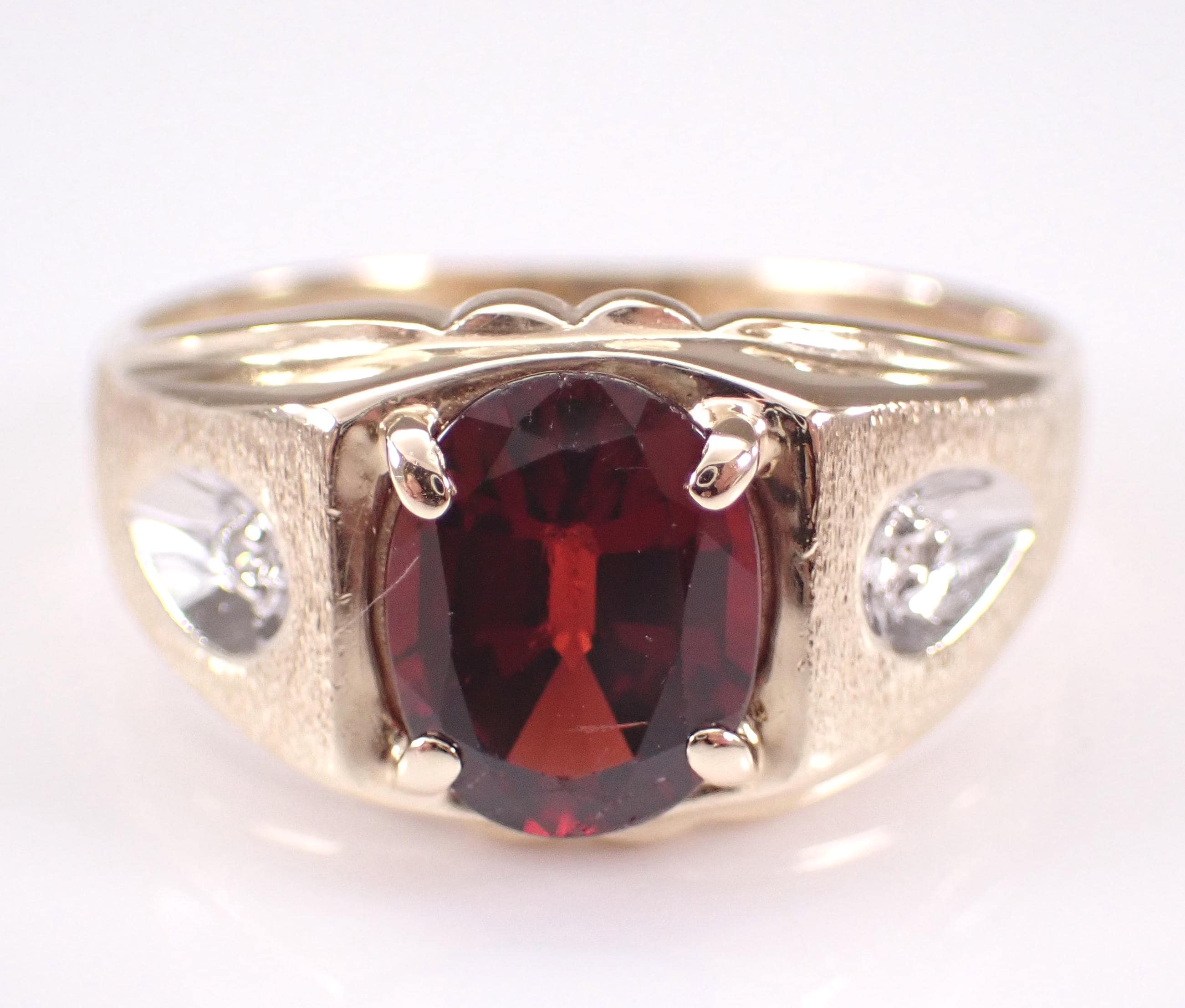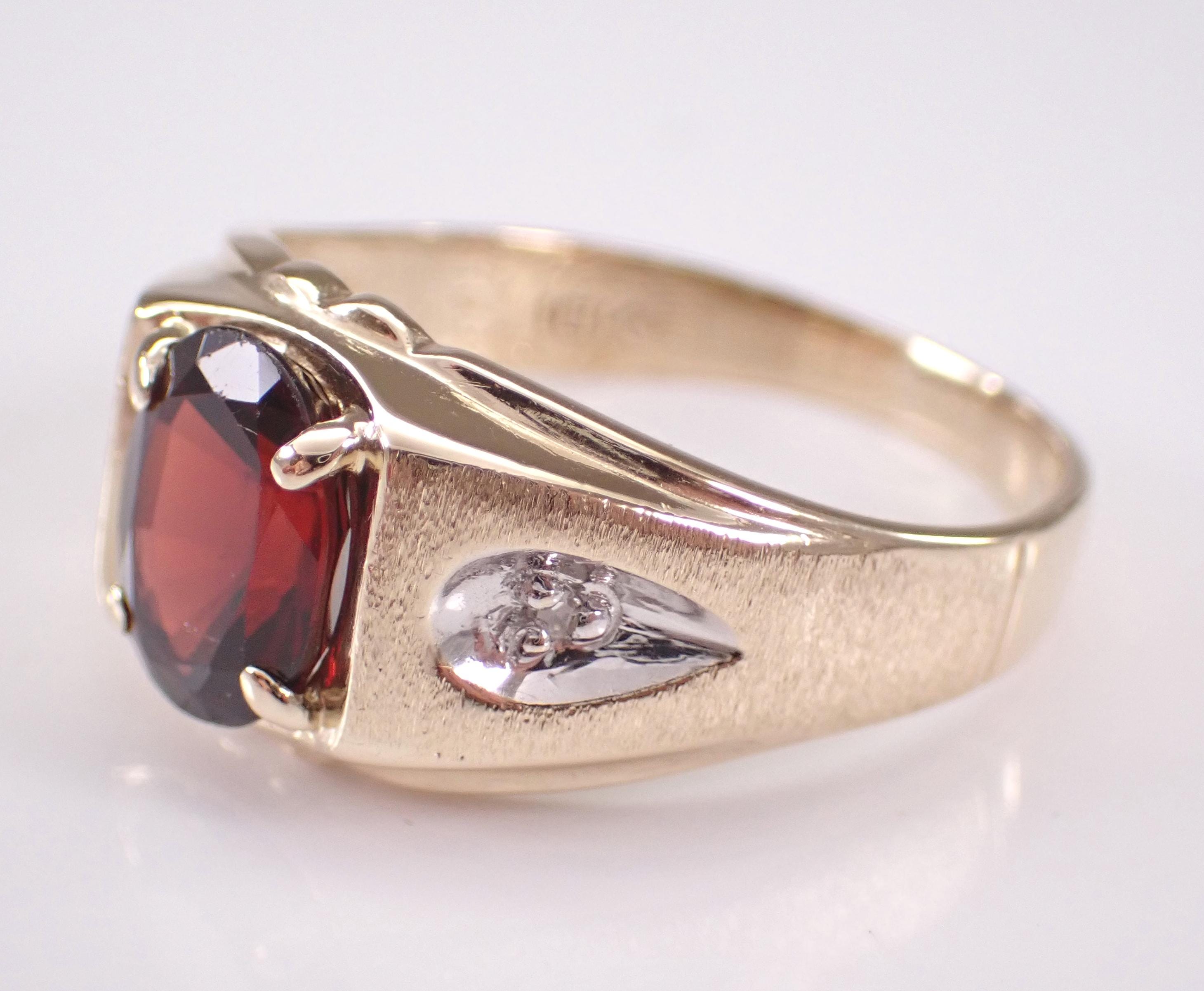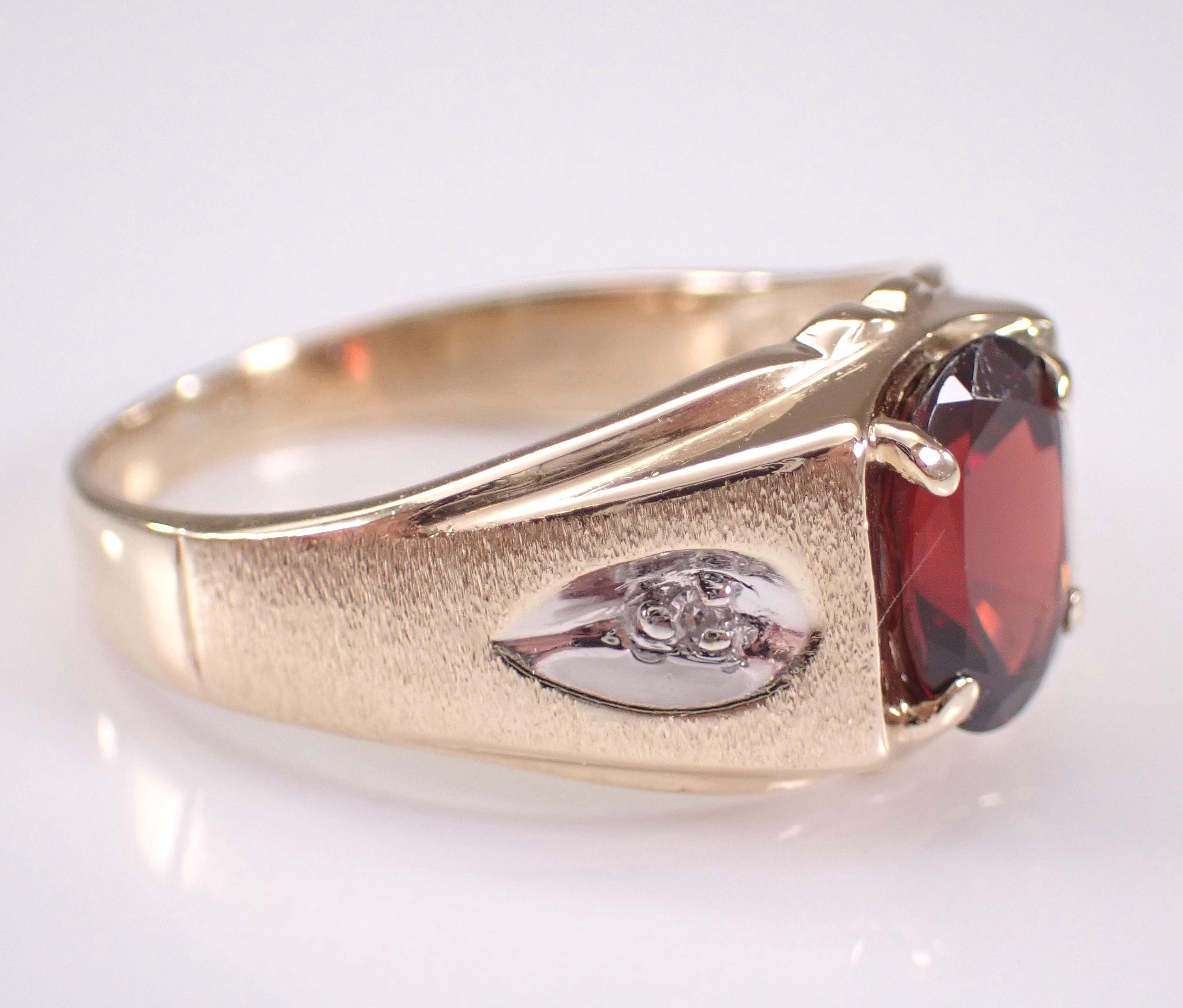 Yellow Gold Men's Diamond and Garnet Ring. This ring is set with two genuine round diamonds and one natural Oval Garnet. The diamonds in this ring are H color, I1 clarity and weigh a total of .02 carat. The garnet in this ring measures 9 X 7 mm and weighs 2 carats (the speck on the stone in the photos is a piece of lint and not a scratch). The ring is 10KT Yellow Gold, weighs 4.8 grams, measures 11 mm in width at its widest point and is a finger size 10, which can be sized (please inquire about sizing with the finger size you need). This ring will be accompanied by an appraisal for insurance and authentication purposes. I will ship this ring promptly in a gift box.