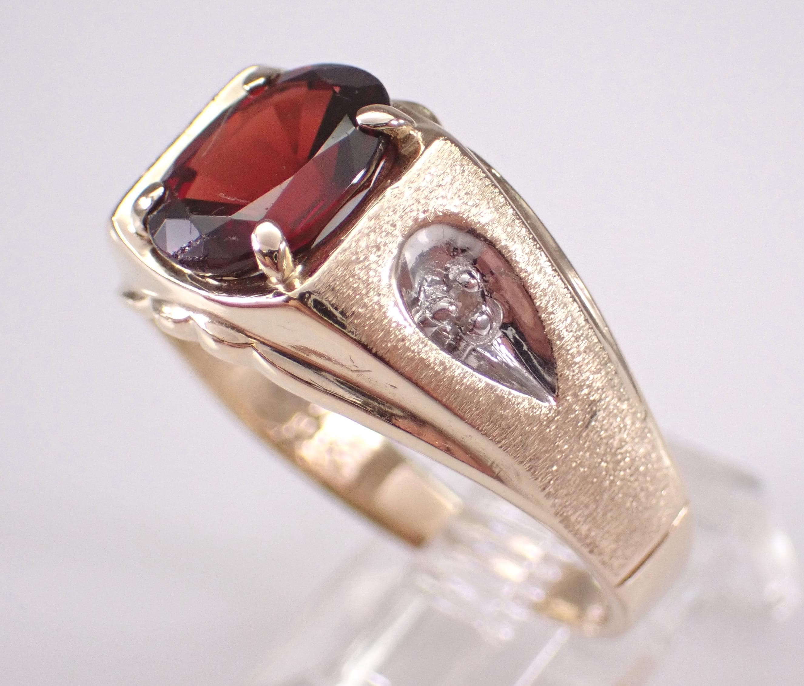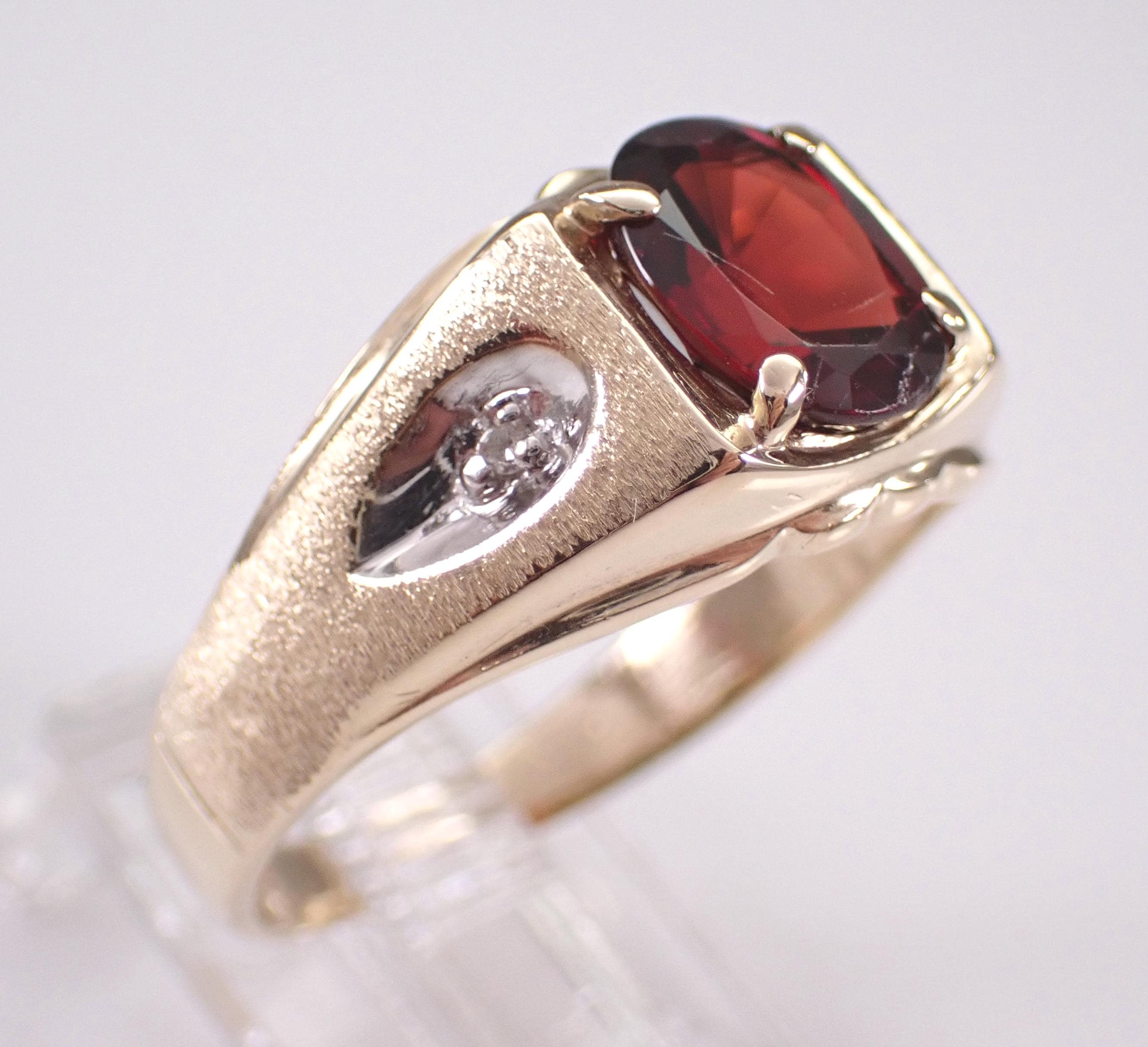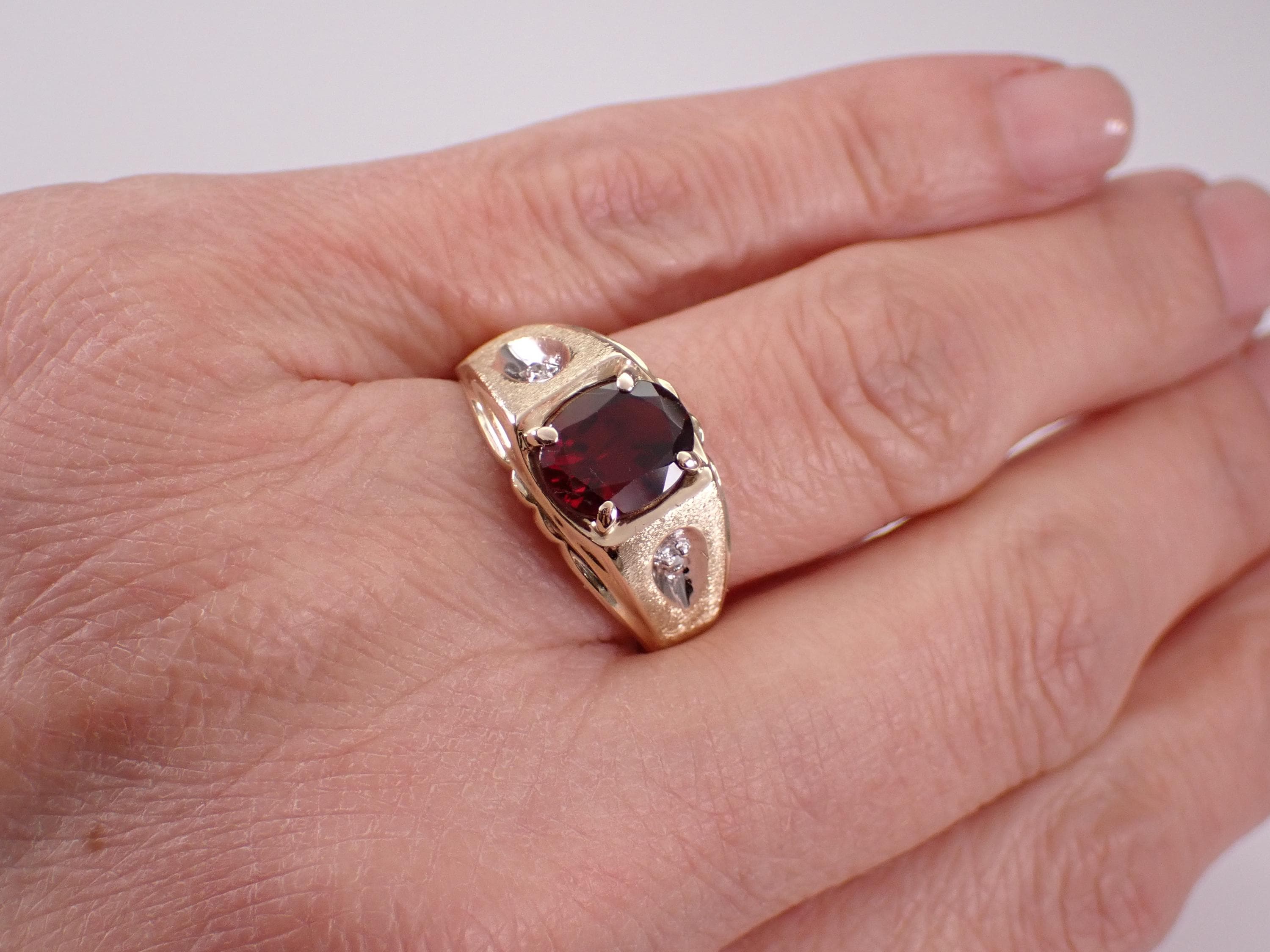 Yellow Gold Men's Diamond and Garnet Ring. This ring is set with two genuine round diamonds and one natural Oval Garnet. The diamonds in this ring are H color, I1 clarity and weigh a total of .02 carat. The garnet in this ring measures 9 X 7 mm and weighs 2 carats (the speck on the stone in the photos is a piece of lint and not a scratch). The ring is 10KT Yellow Gold, weighs 4.8 grams, measures 11 mm in width at its widest point and is a finger size 10, which can be sized (please inquire about sizing with the finger size you need). This ring will be accompanied by an appraisal for insurance and authentication purposes. I will ship this ring promptly in a gift box.