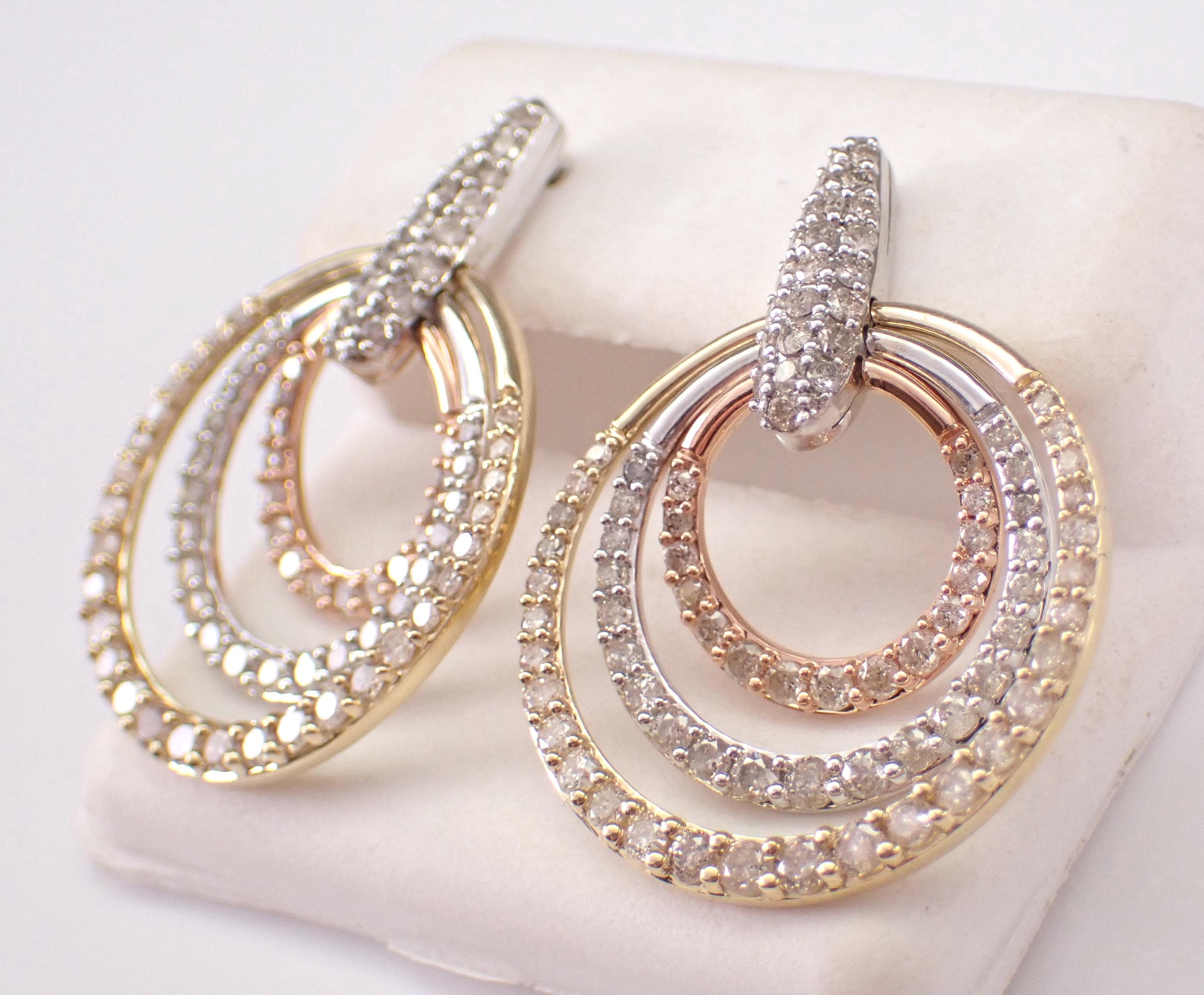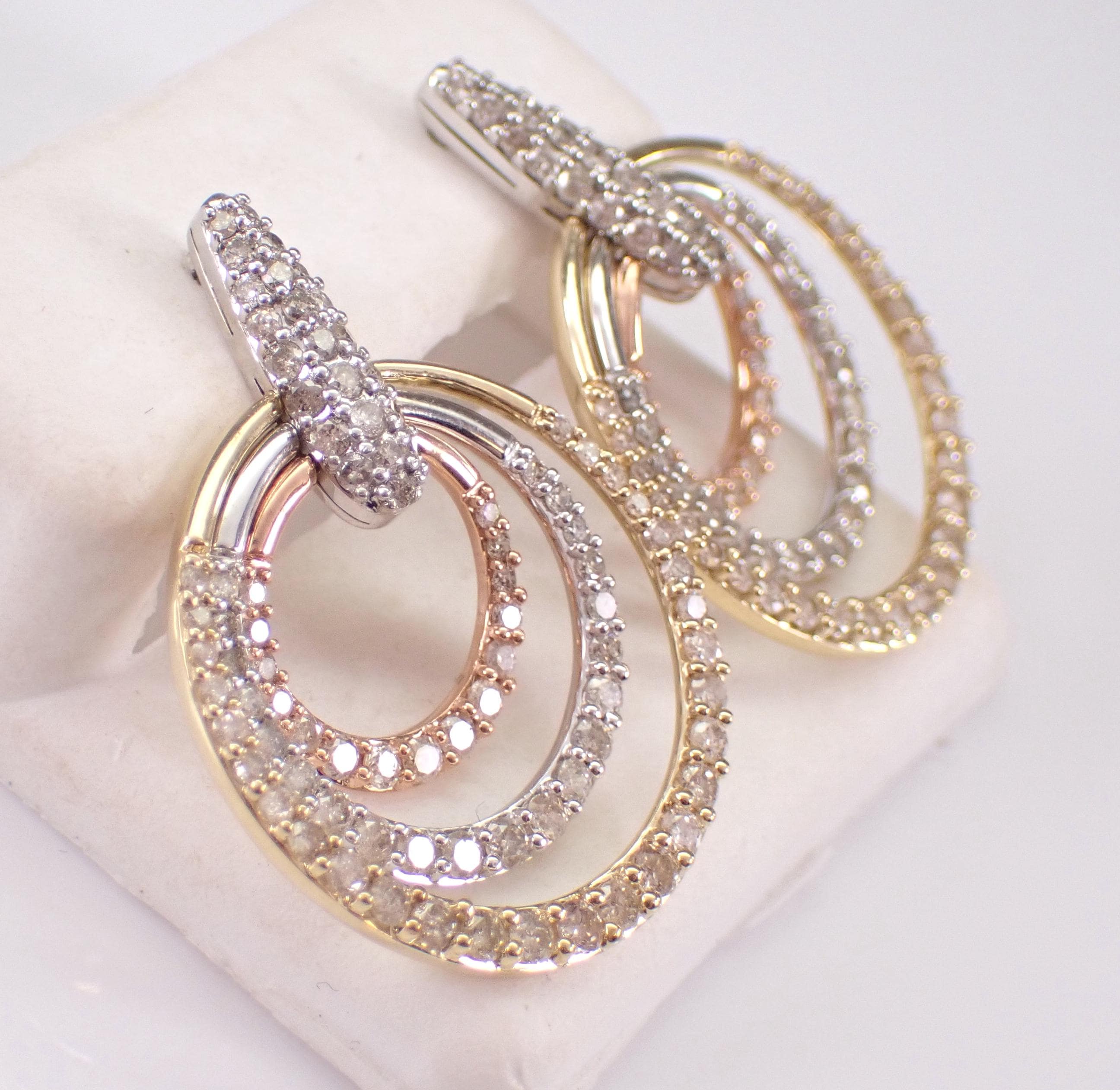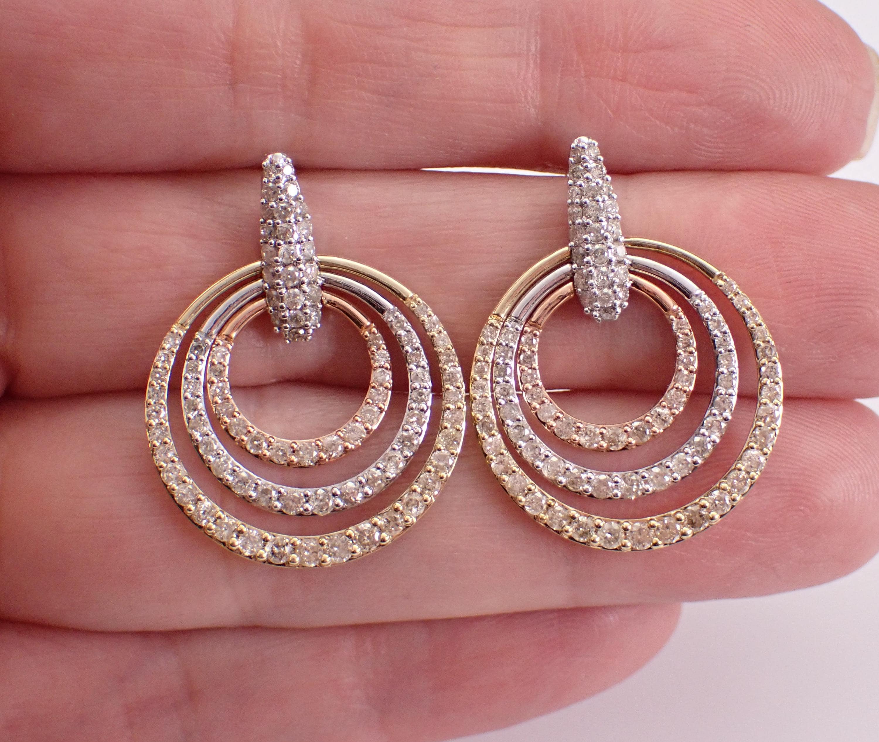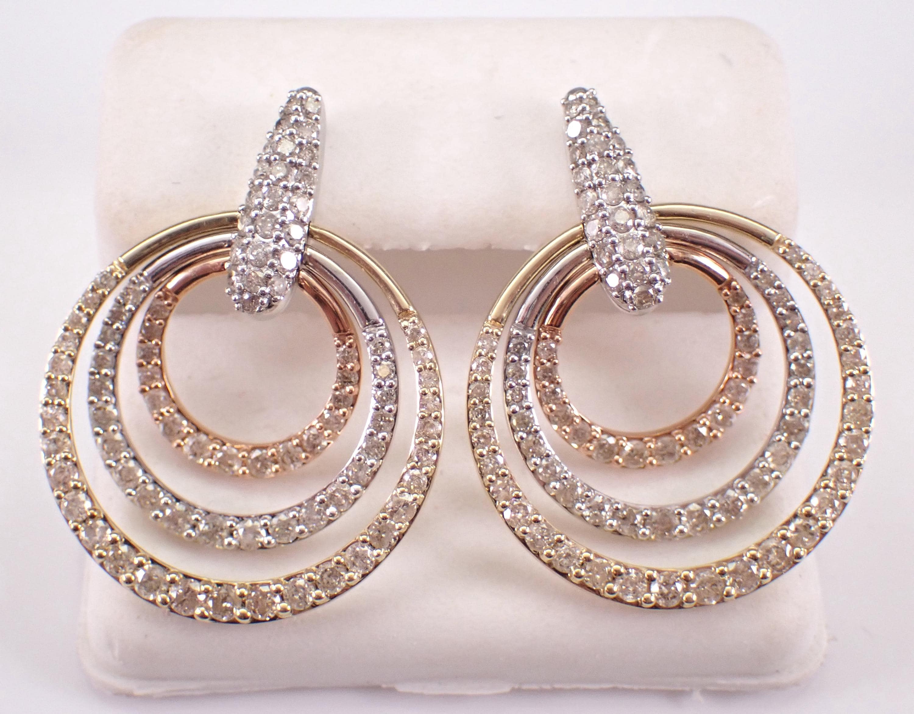 Tri Color Gold Diamond Earrings. There are eighty-seven natural Round Brilliant Diamonds set in these earrings. These diamonds are H color, SI/I1 clarity and weigh a total of 2.04 carats. These earrings are 10KT Yellow, Rose and White Gold and weigh a total of 6.2 grams. These earrings are for pierced ears, measure 29 X 21.5 mm. These earrings will be accompanied by an appraisal written by a GIA Certified Diamond Grader with the retail replacement value of $3,685.00. I will ship these earrings promptly in a gift box.
