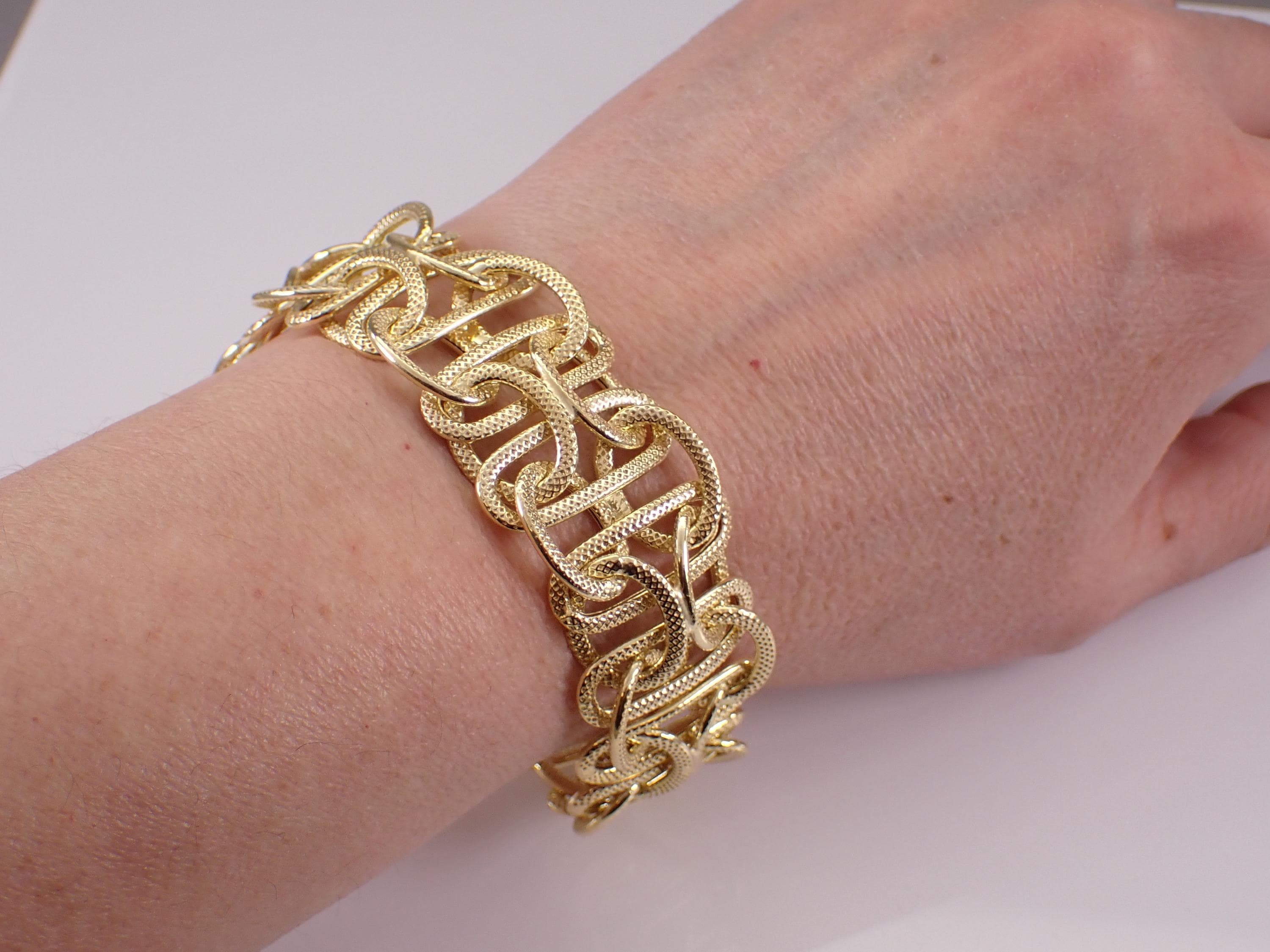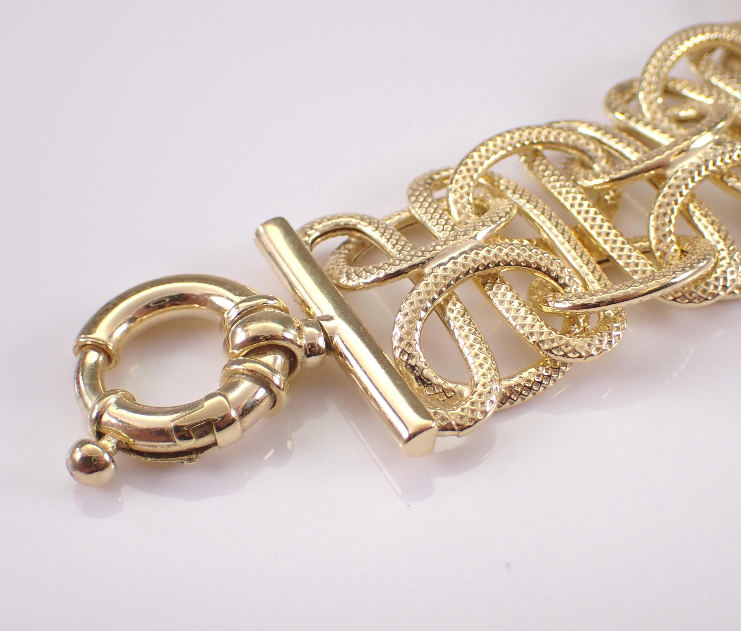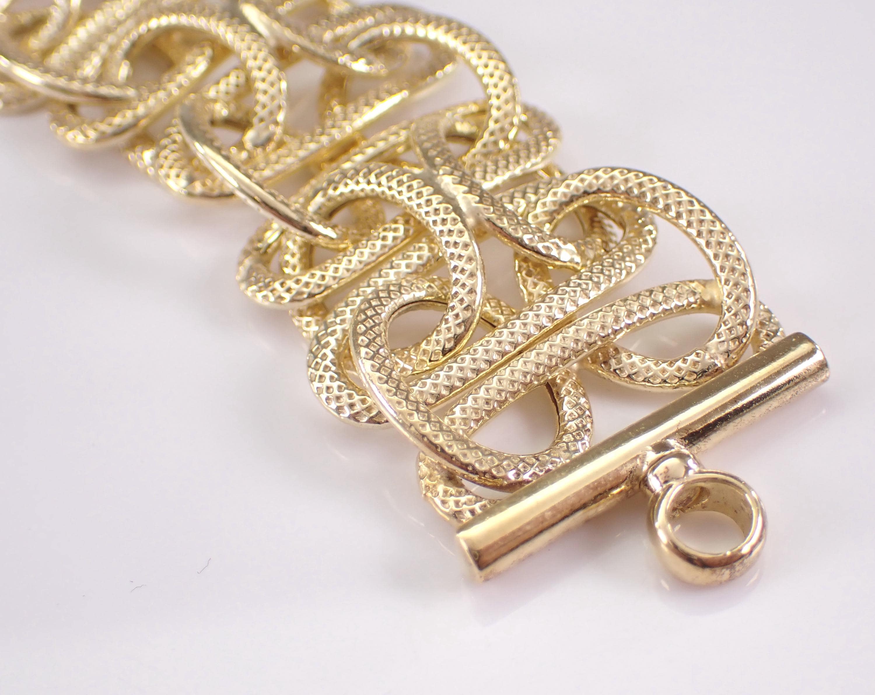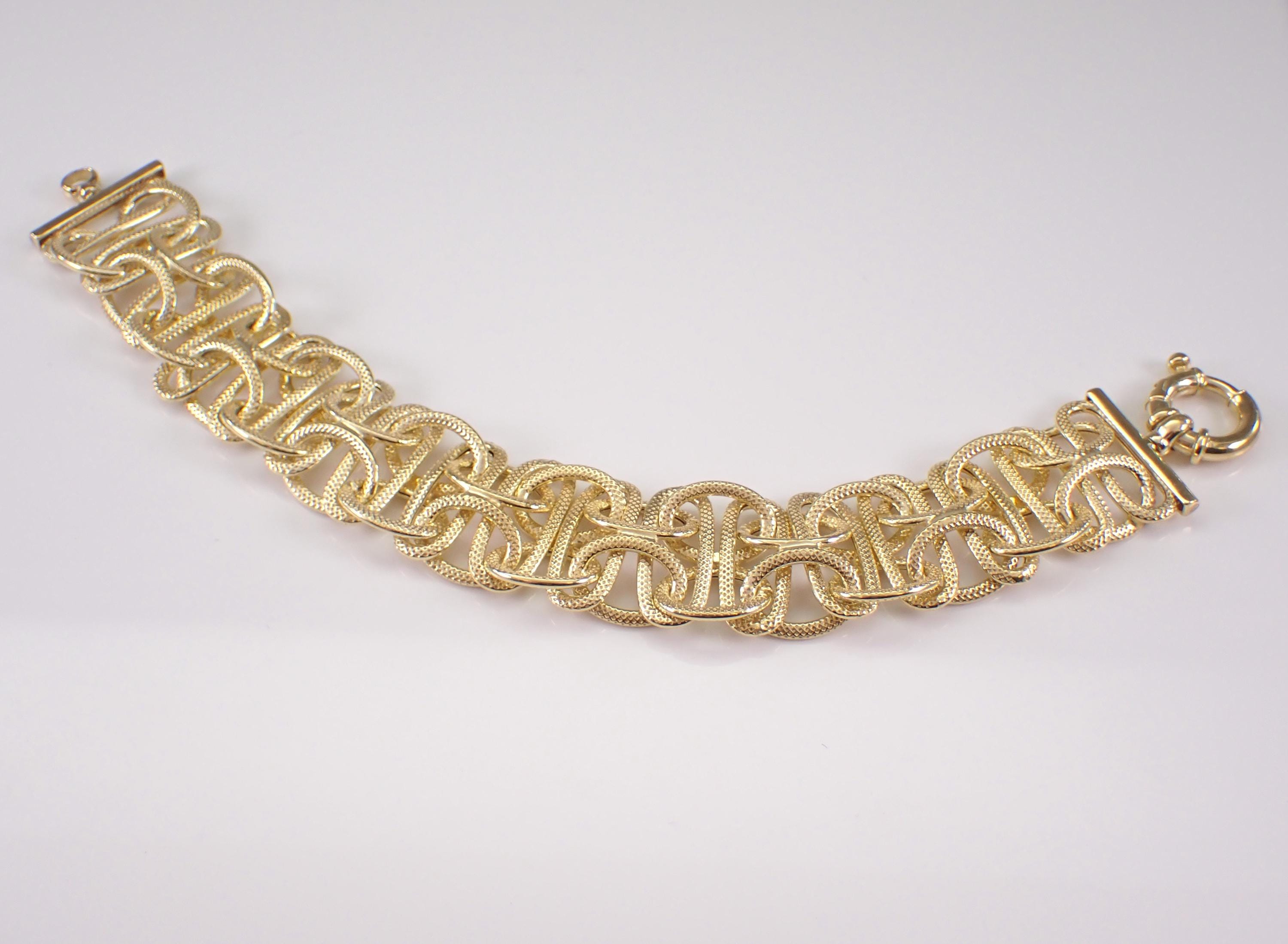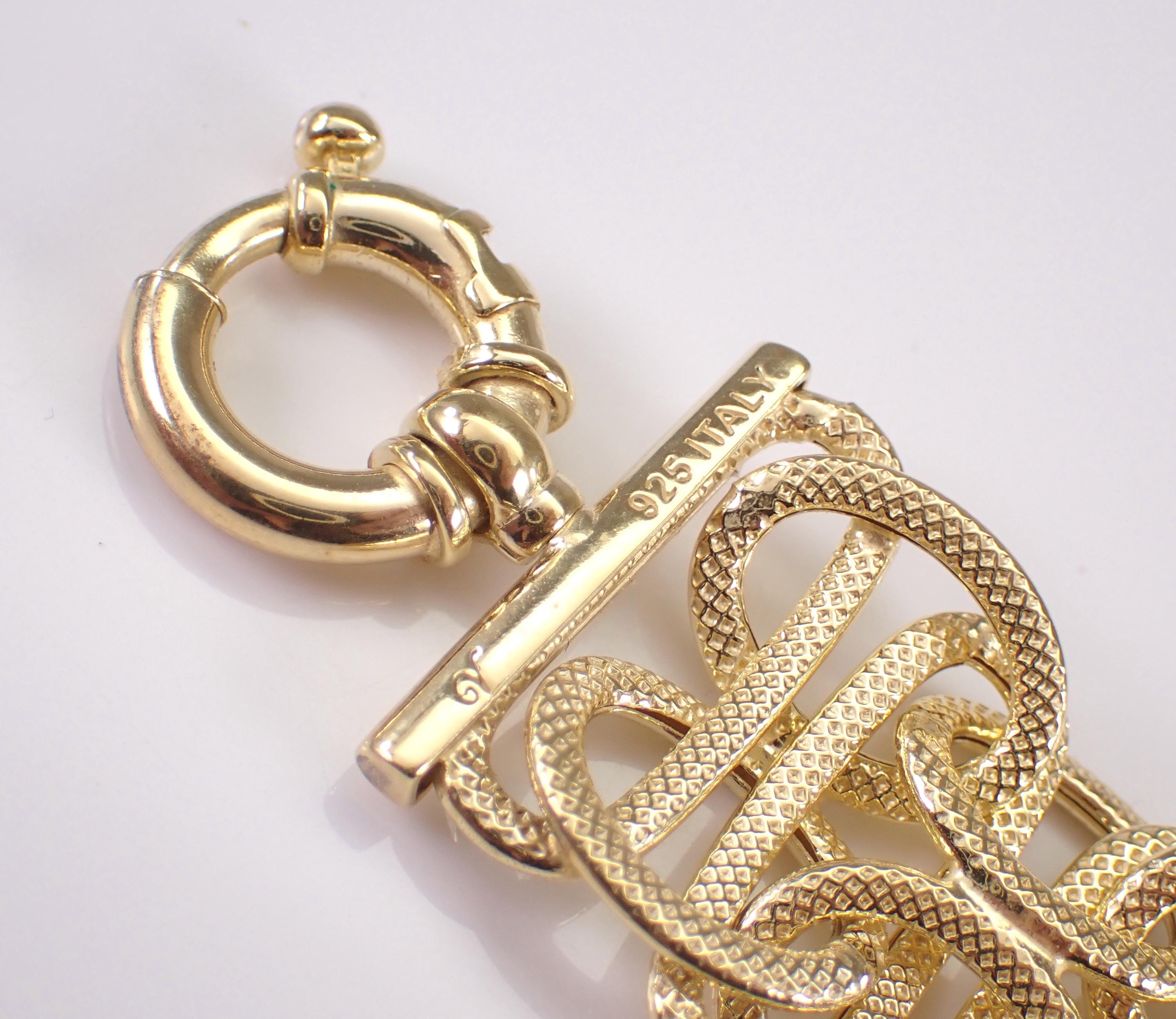 Vintage Sterling Silver Gold Plated Bracelet. This bracelet weighs 30.6 grams, measures 23.5 mm in width and 8 1/4" in length. This bracelet is perfect for everyday wear or any special occasion, like Mothers Day, Birthday, Anniversary, Graduation, etc. The Bracelet will be shipped promptly in a gift pouch.