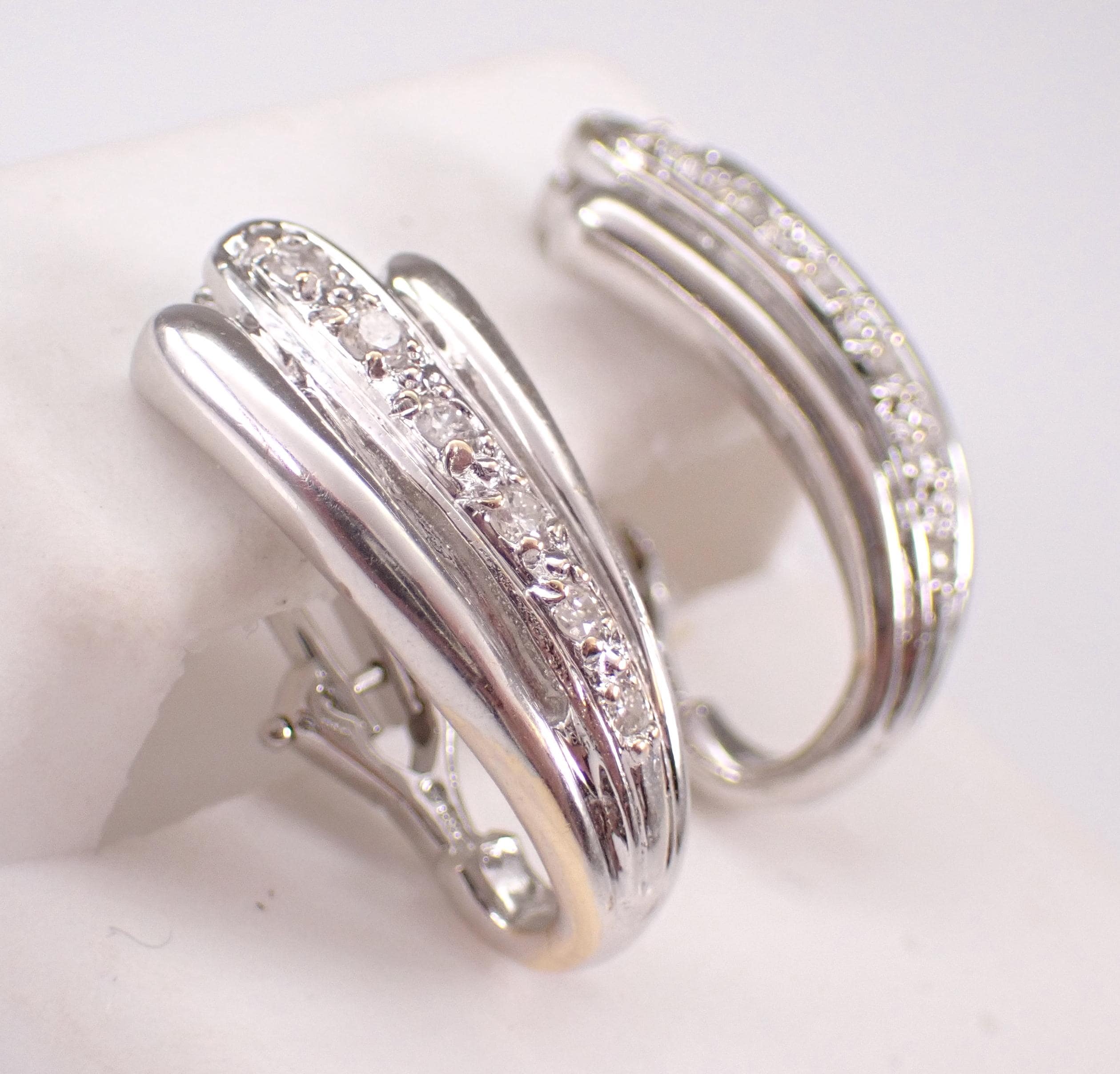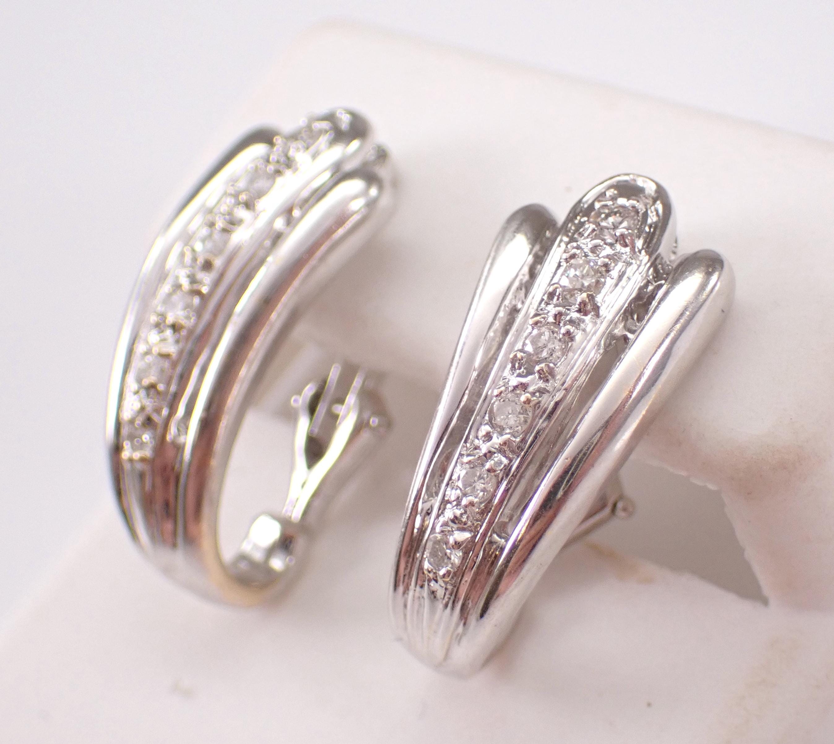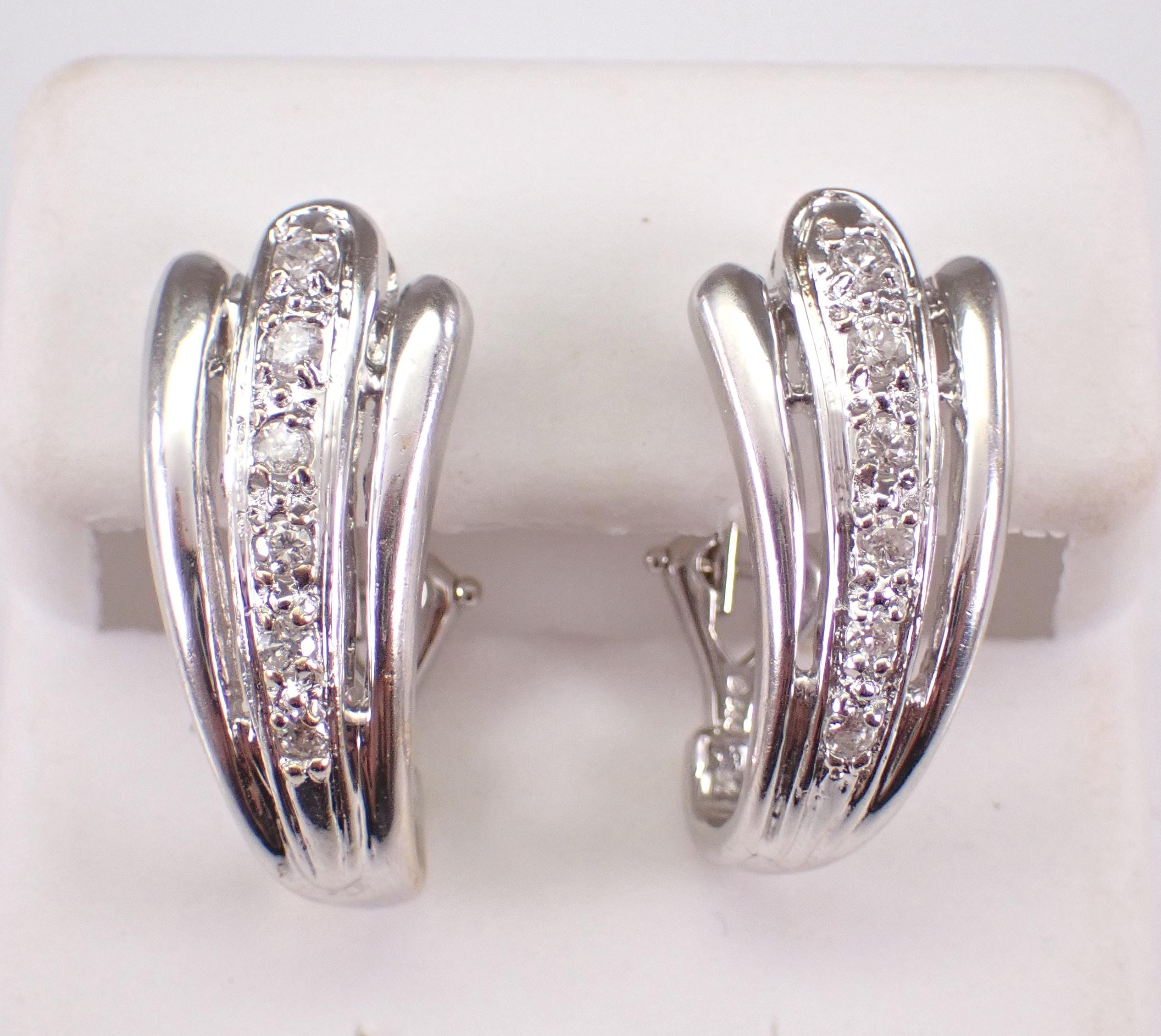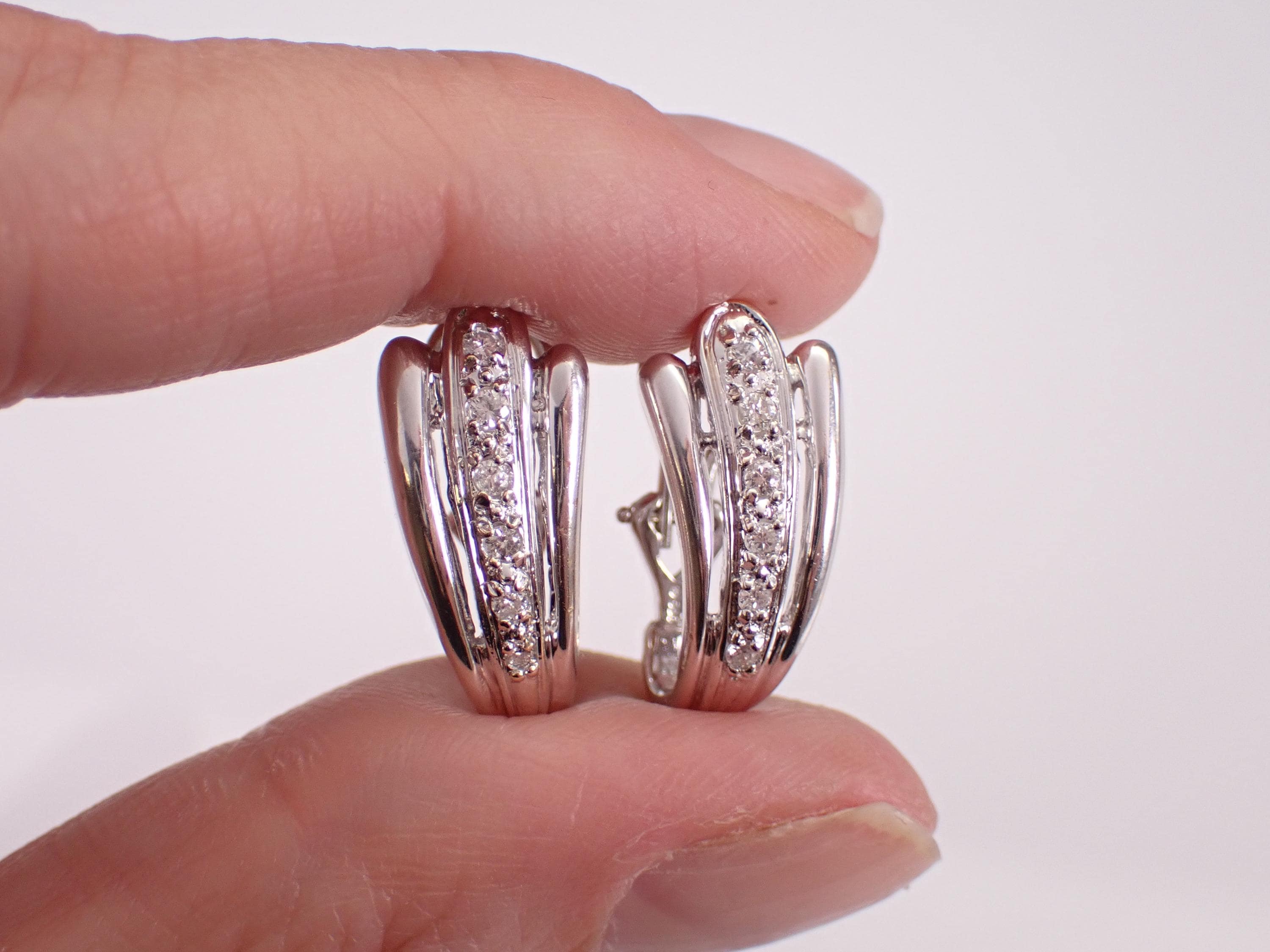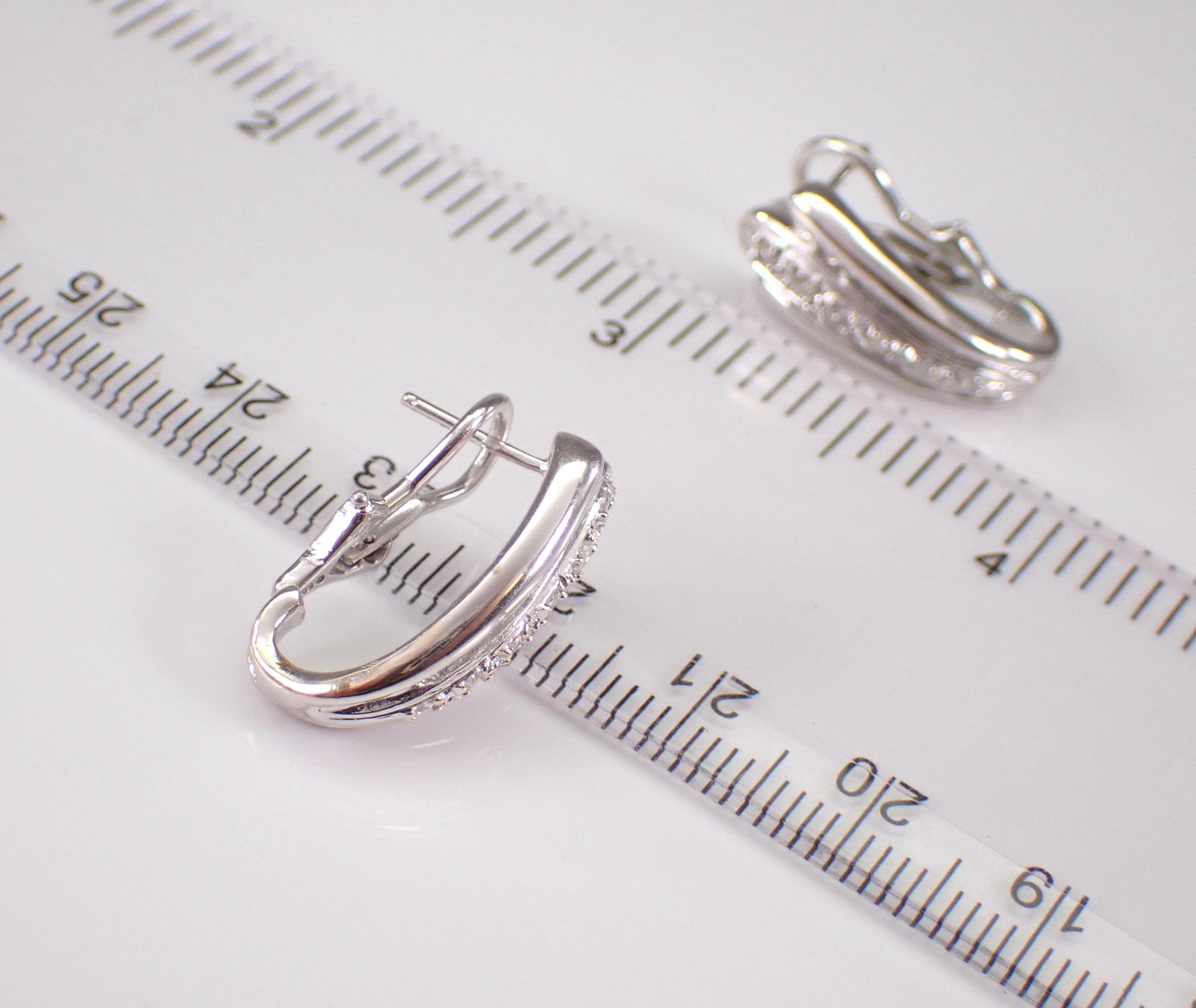 14K White Gold Diamond Half Hoop Earrings. These earrings are set with six genuine Round Diamonds in EACH earring. These diamonds are H color, I1 clarity and weigh a total of 1/4 carat. These earrings are 14K White Gold and weigh a total of 6.2 grams. These earrings are for pierced ears and measure 19 X 9.5 mm. These earrings will be accompanied by an appraisal written by a GIA Certified Diamond Grader with the retail replacement value of $2,495.00. I will ship these earrings promptly in a gift box.