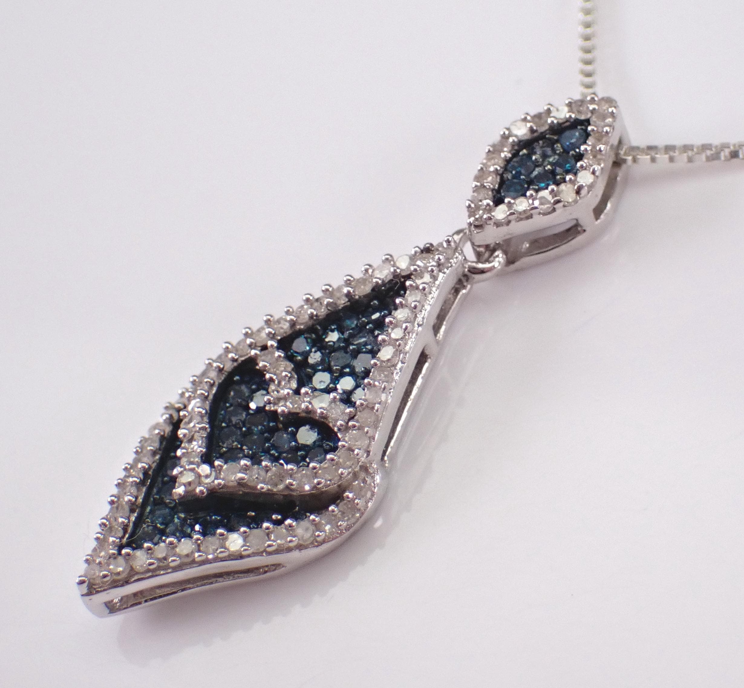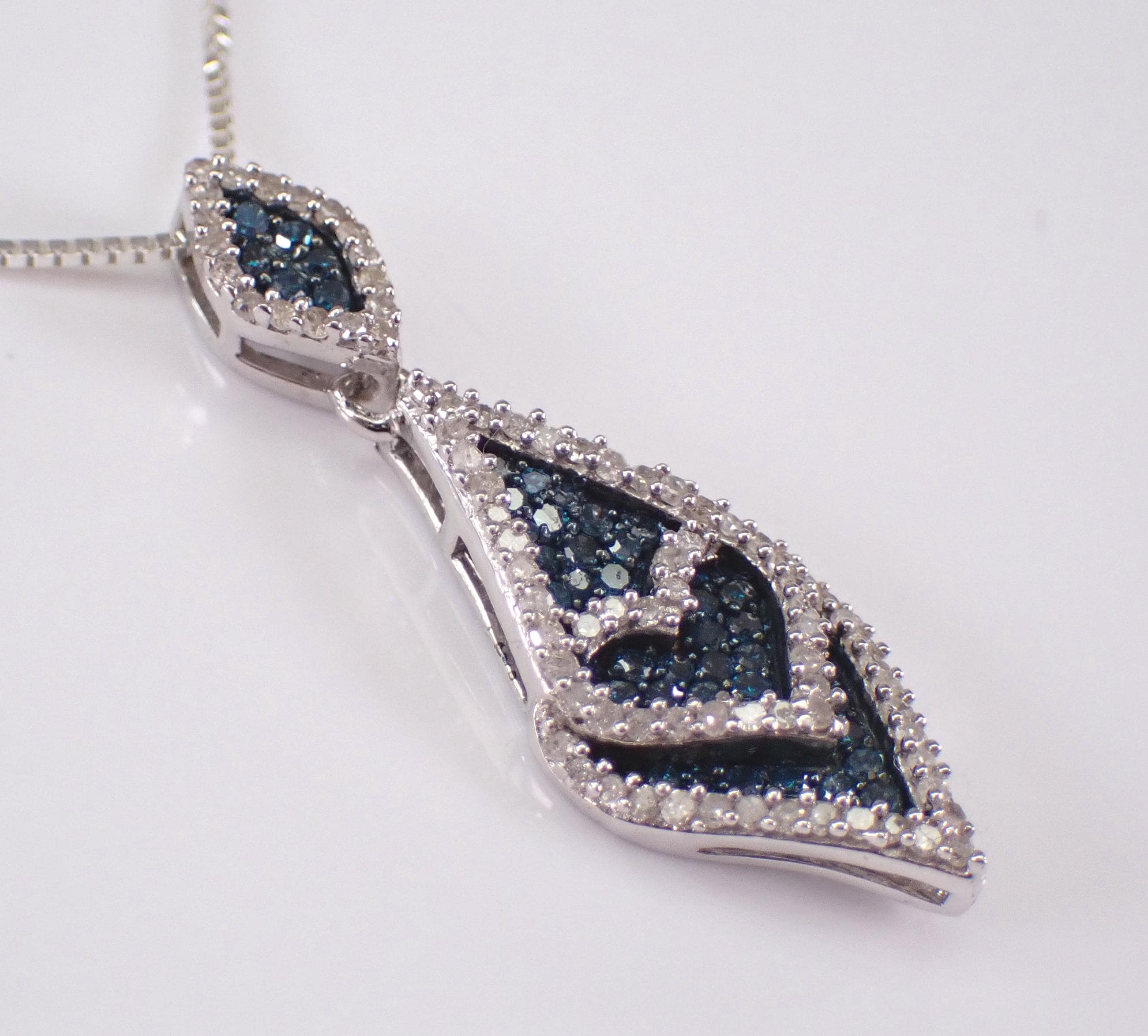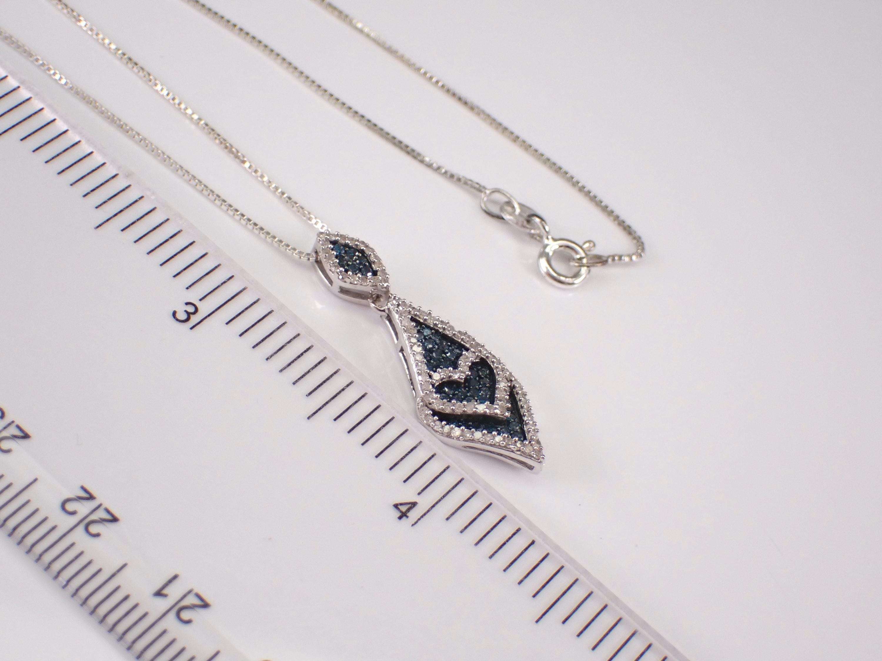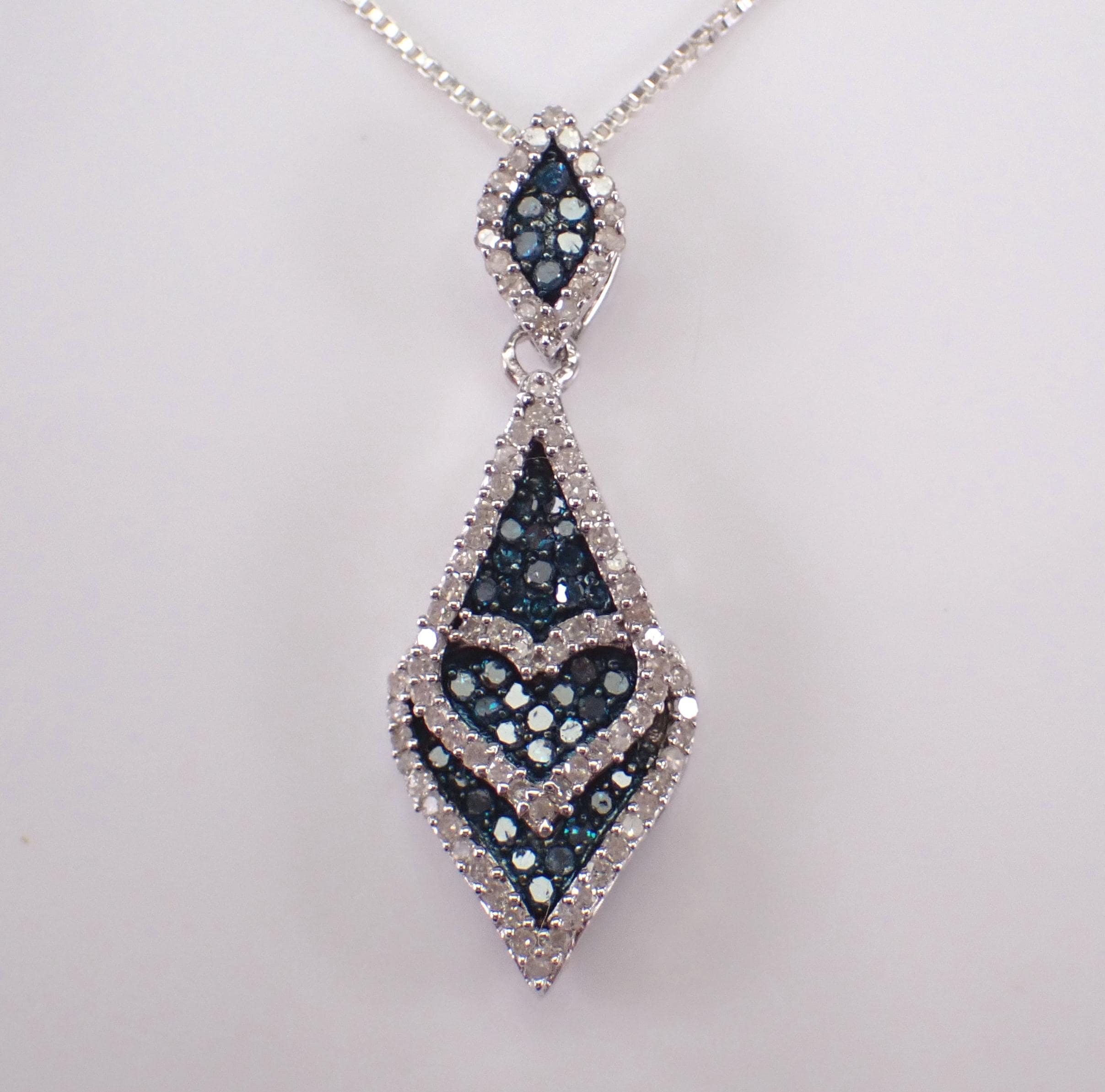 A unique vintage sterling silver blue and white diamond charm necklace. This vintage silver necklace is in excellent condition. This pendant set with eighty-four genuine Round Diamonds and forty-three natural Fancy Blue Round Diamonds. These diamonds weigh a total of 1/2 carat. This necklace weighs 3.2 grams and measures 18" in length. The pendant measures 29 mm in length.