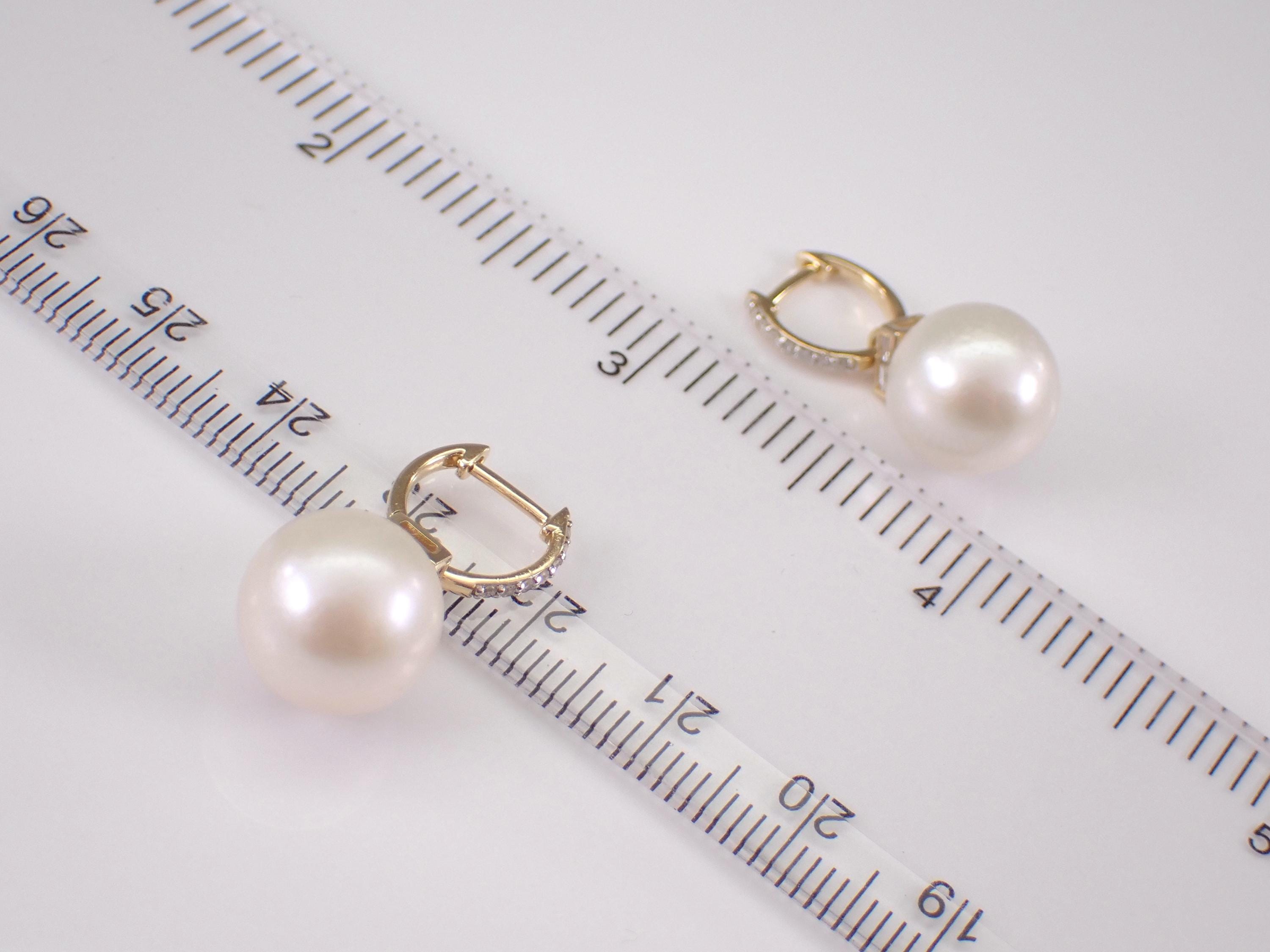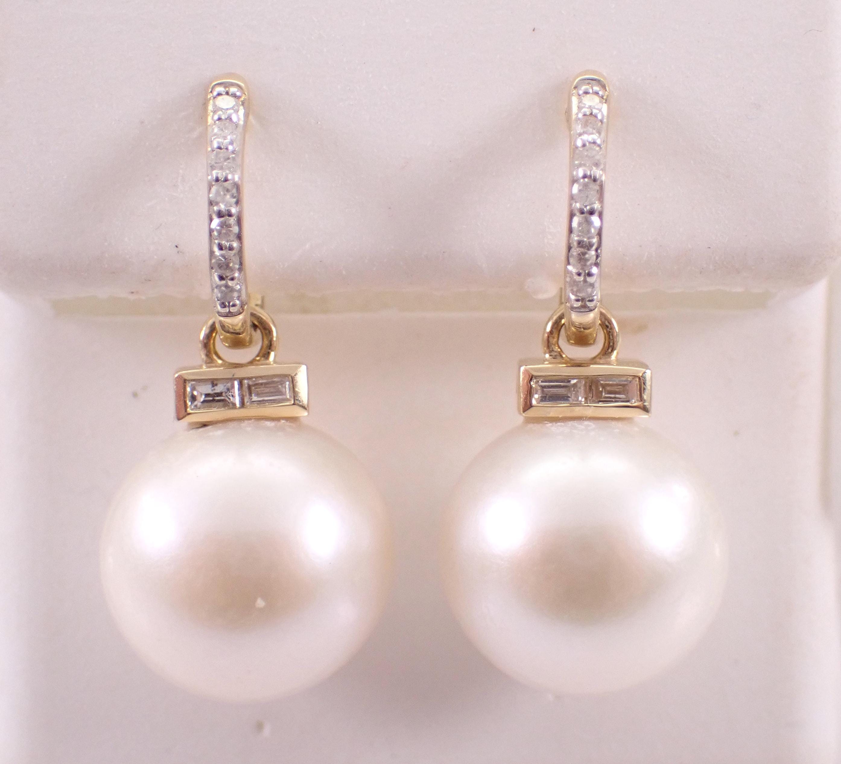 14K Yellow Gold Pearl and Diamond Dangle Earrings. There is one South Sea Pearl set in each earring. These Pearls measure 11.2 mm in diameter each. There are also two natural Baguette Diamonds and seven genuine Round Brilliant Diamond set in EACH earring. These diamonds are H color, SI clarity and weigh a total of .20 carat. These earrings are 14KT Yellow Gold and weigh a total of 6.0 grams. These earrings are for pierced ears, measure 24 mm in length and the earrings have a latch back closures. These earrings will be accompanied by an appraisal written by a GIA Certified Diamond Grader with the retail replacement value of $2,295.00. I will ship these earrings promptly in a gift box.