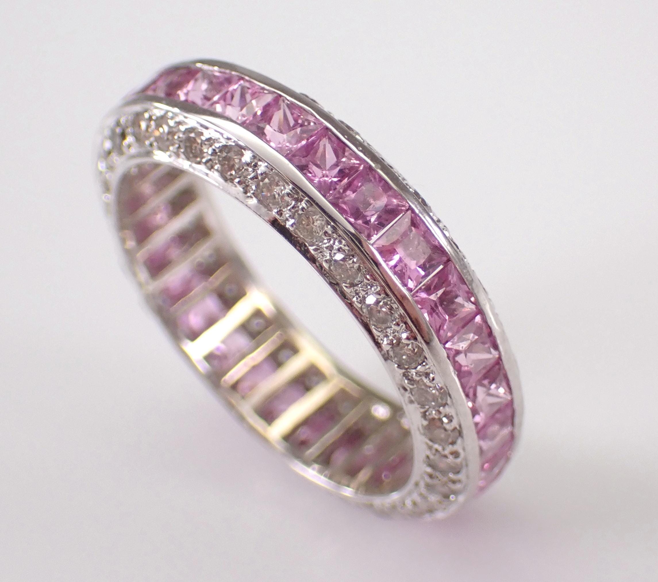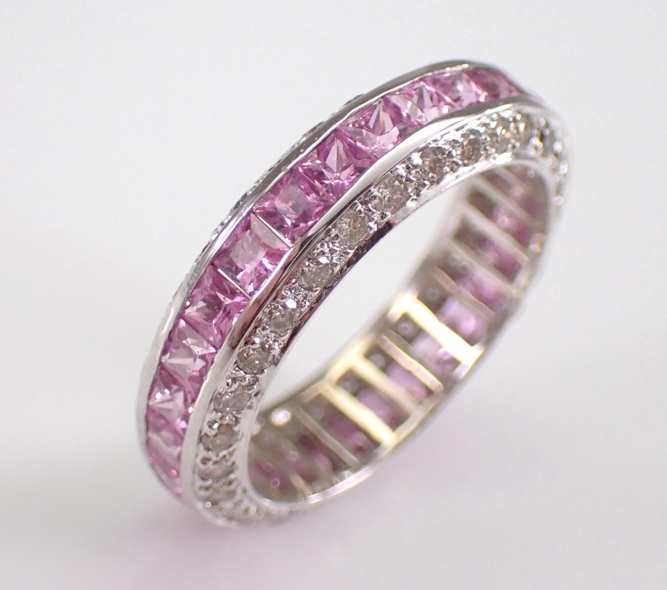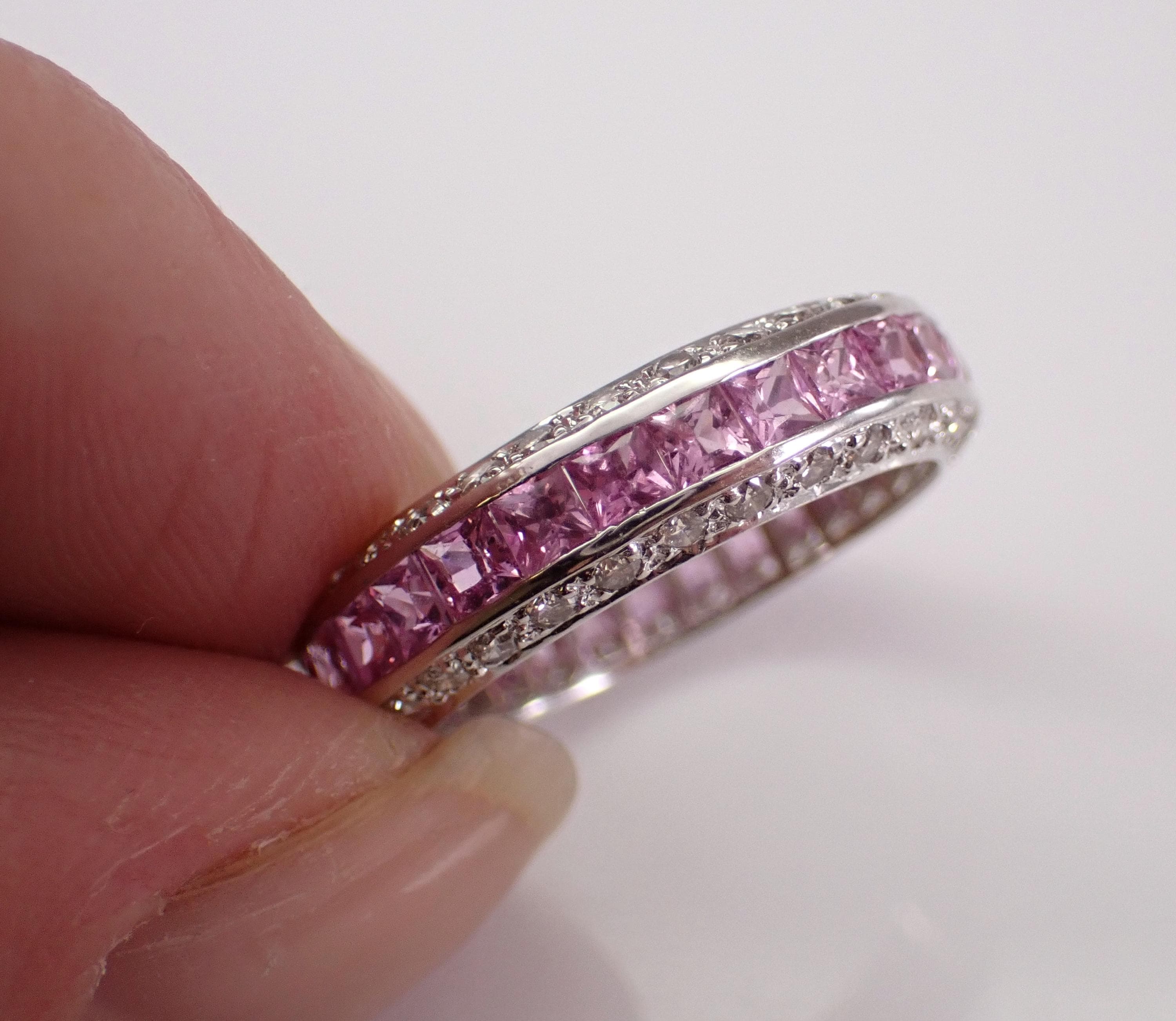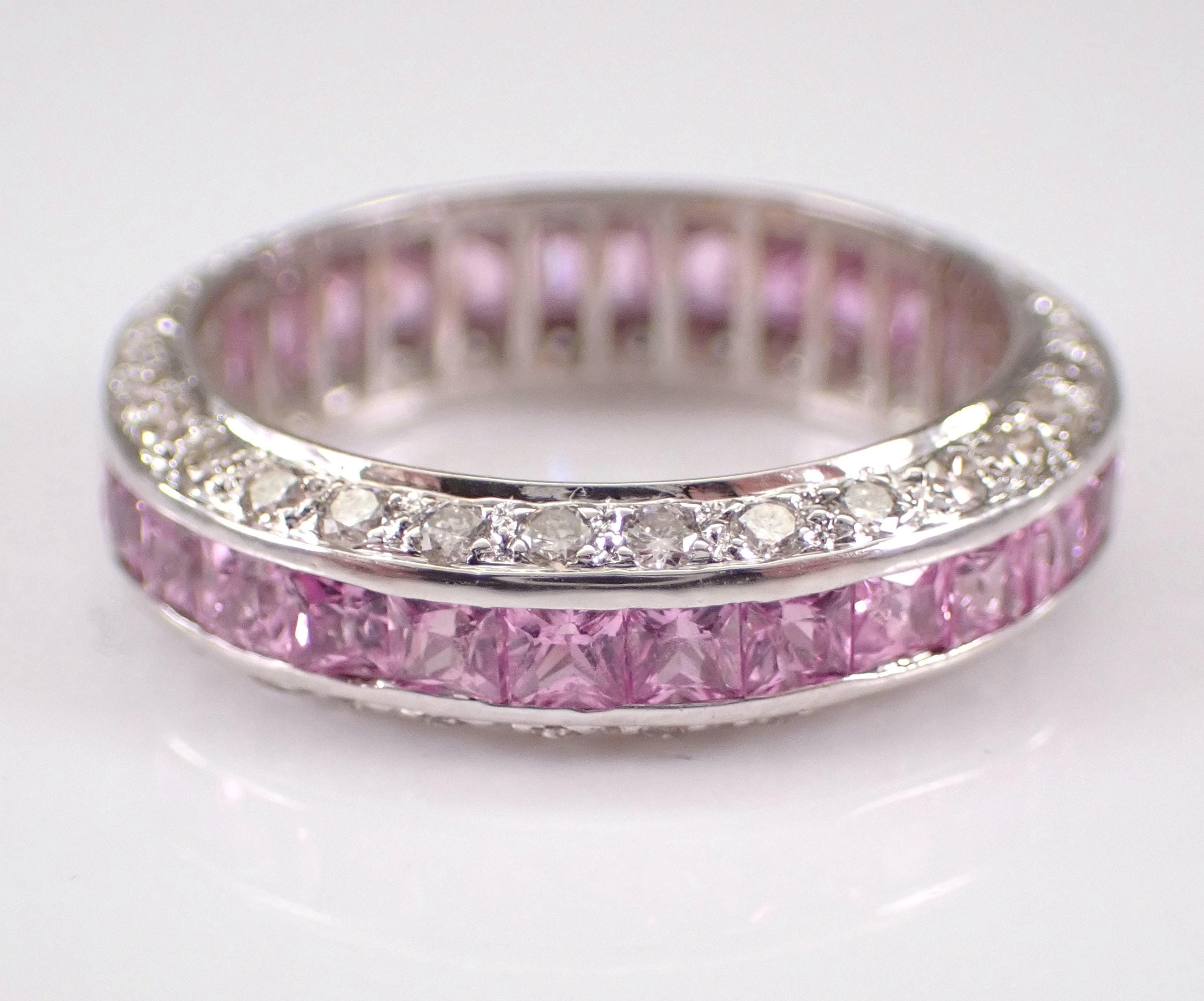 18K White Gold Pink Sapphire and Diamond Eternity Wedding Ring Anniversary Band. This ring is set with twenty-nine genuine Princess Cut Pink Sapphires. All these Sapphires are 100% Genuine and amount to a total weight of 1 1/2 carats. There are sixty natural Round Brilliant Diamonds set in this ring. These Diamonds are G color, SI clarity and weigh a total of .85 carat. This ring is 18KT White Gold, weighs 3.5 grams, measures 5 mm in width and is a finger size 5 3/4. This ring will be accompanied by an appraisal by a GIA Certified Diamond Grader with the replacement value of $5,895.00. I will ship this ring promptly in a beautiful gift box.