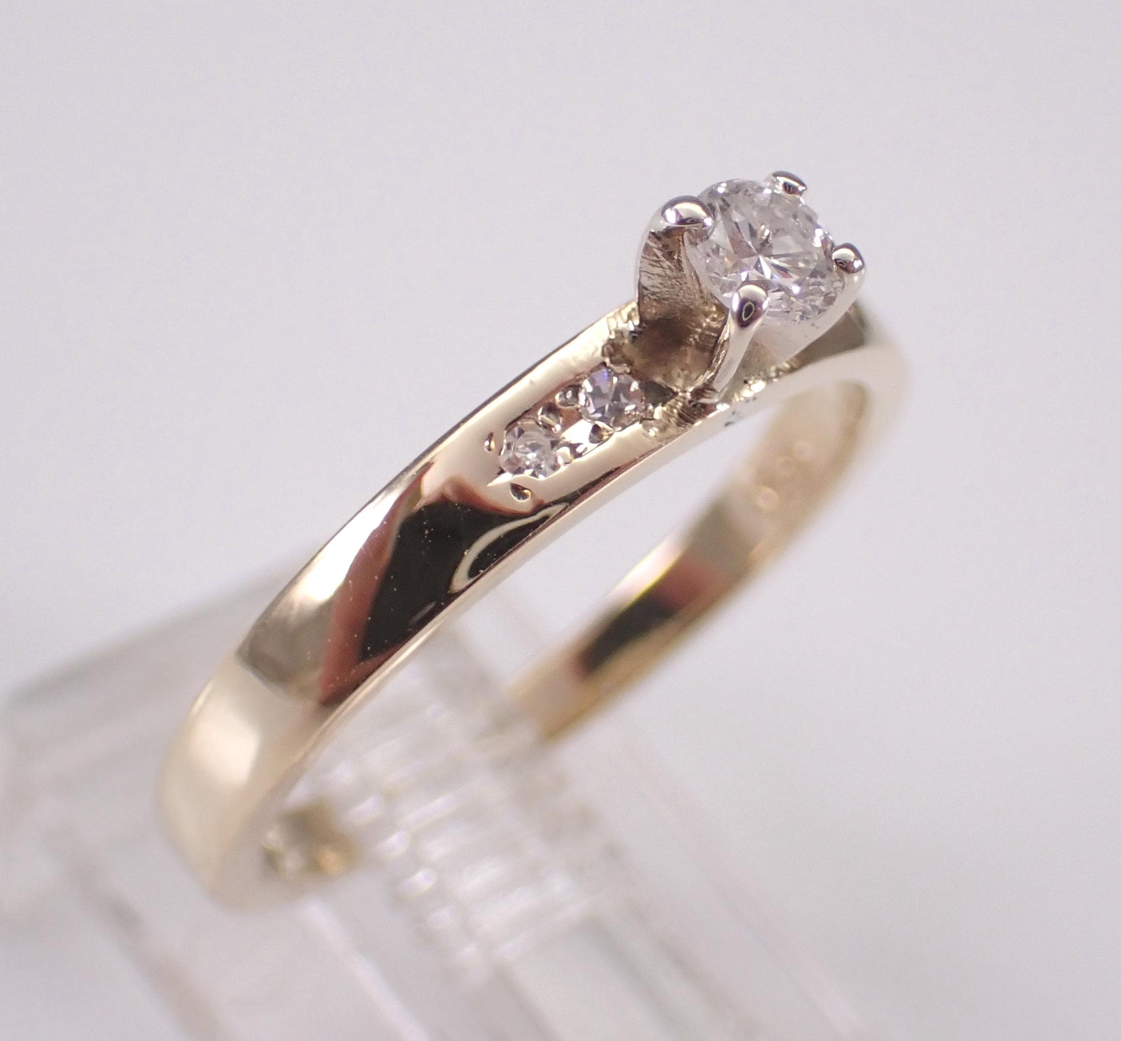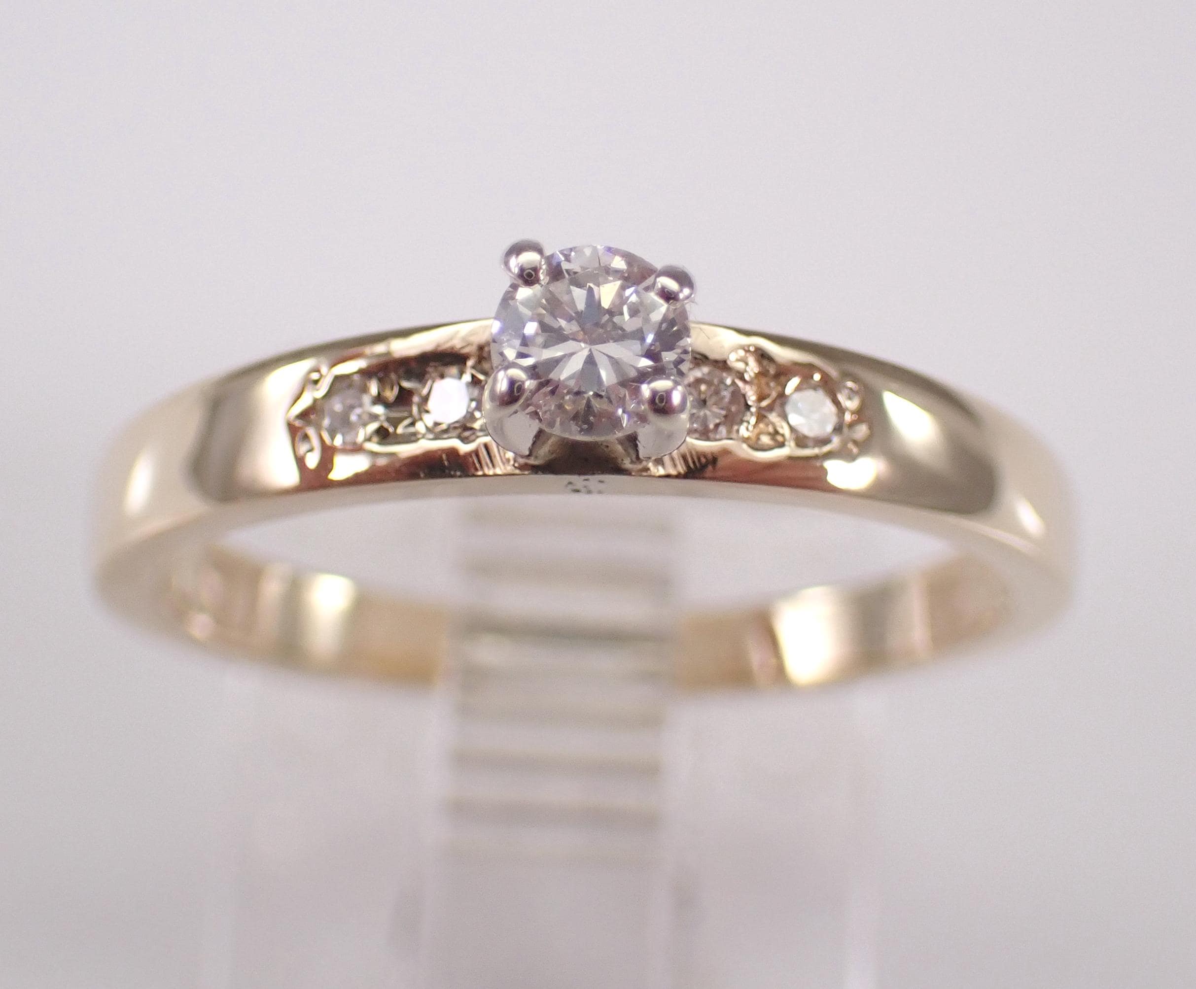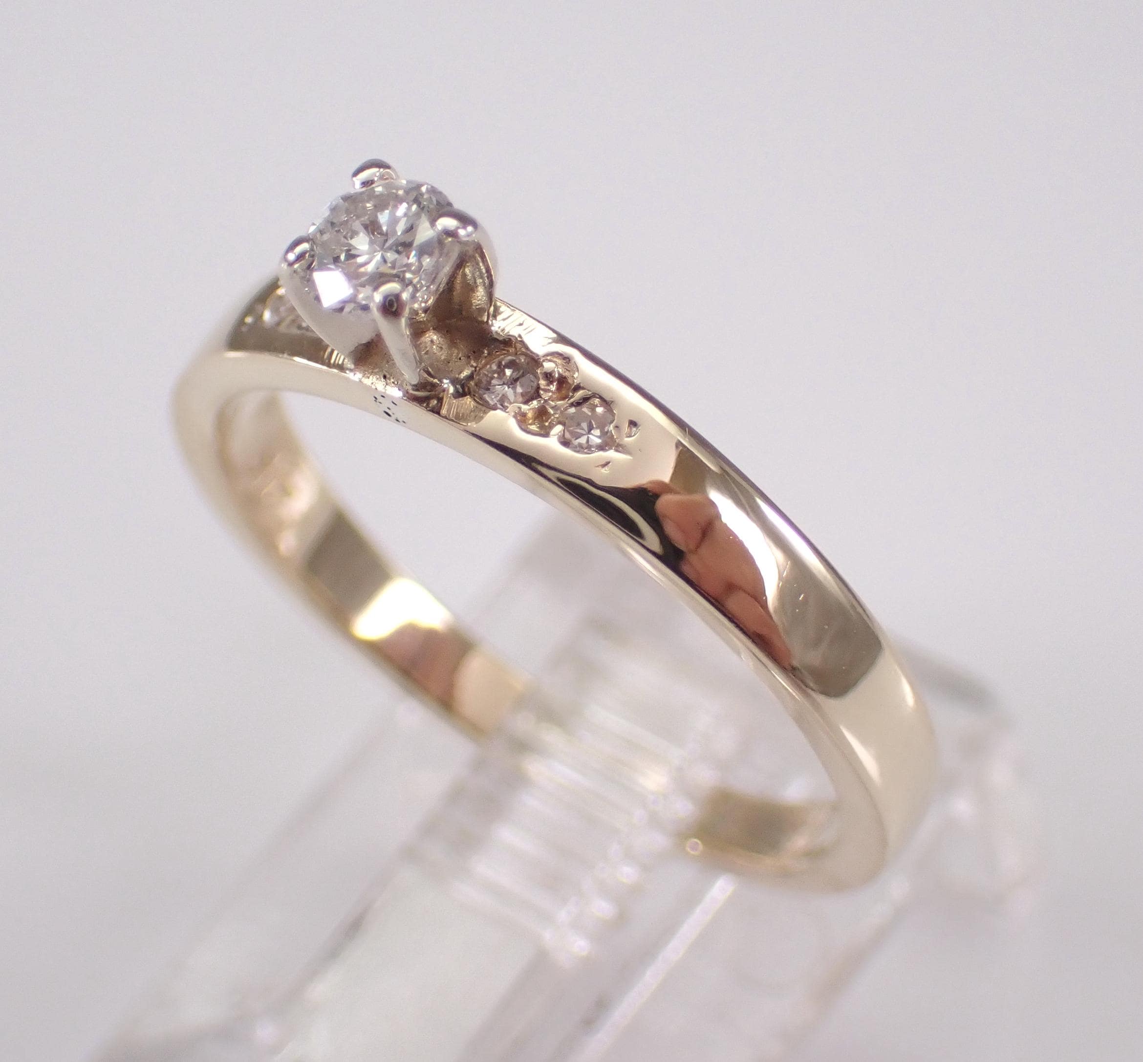 14K Yellow Gold Estate Diamond Engagement Ring. This ring is set with a center Round Brilliant Diamond. This diamond is H color, SI1 clarity and weighs .15 carat. There are four round brilliant diamonds set along the shank of this ring. These diamonds are H color, SI clarity and weigh a total of .05 carat. This ring is 14KT Yellow Gold, weighs 2.2 grams and is a finger size 5 1/4, can be easily resized (please inquire about sizing with the finger size you need). This ring will be accompanied by an appraisal by a GIA Certified Diamond Grader with the retail replacement value of $1,389.00. I will ship these rings promptly in a beautiful gift box.