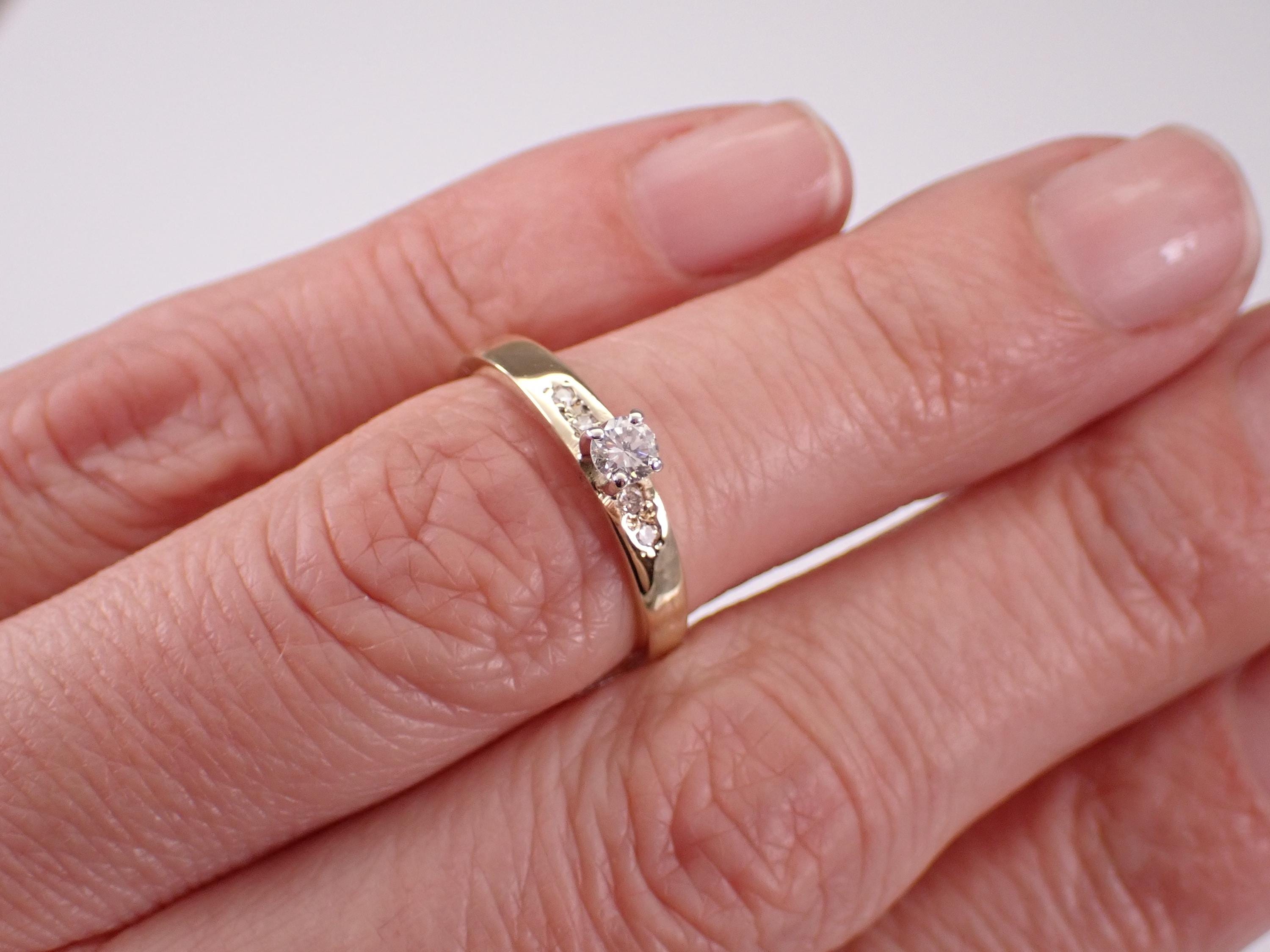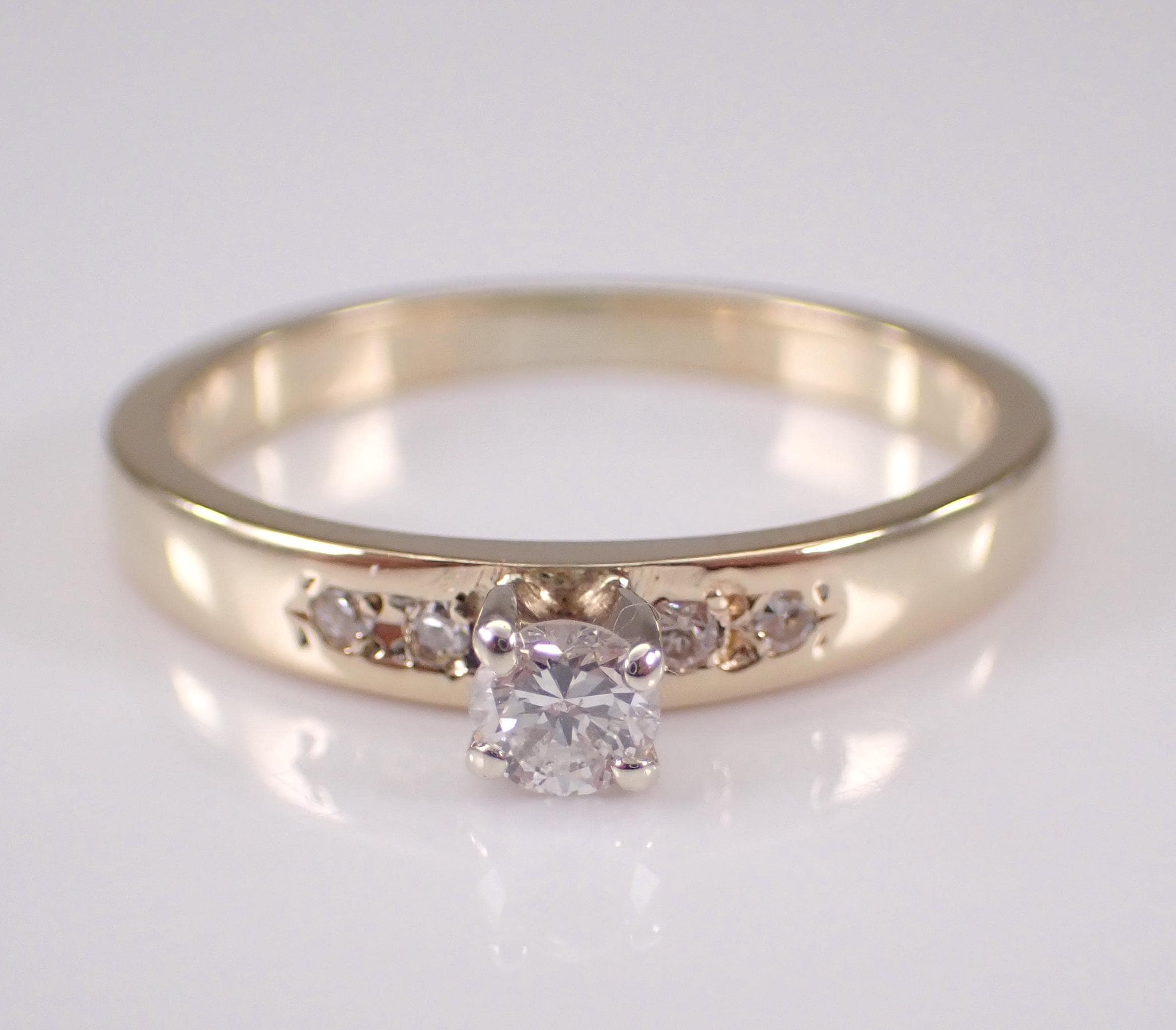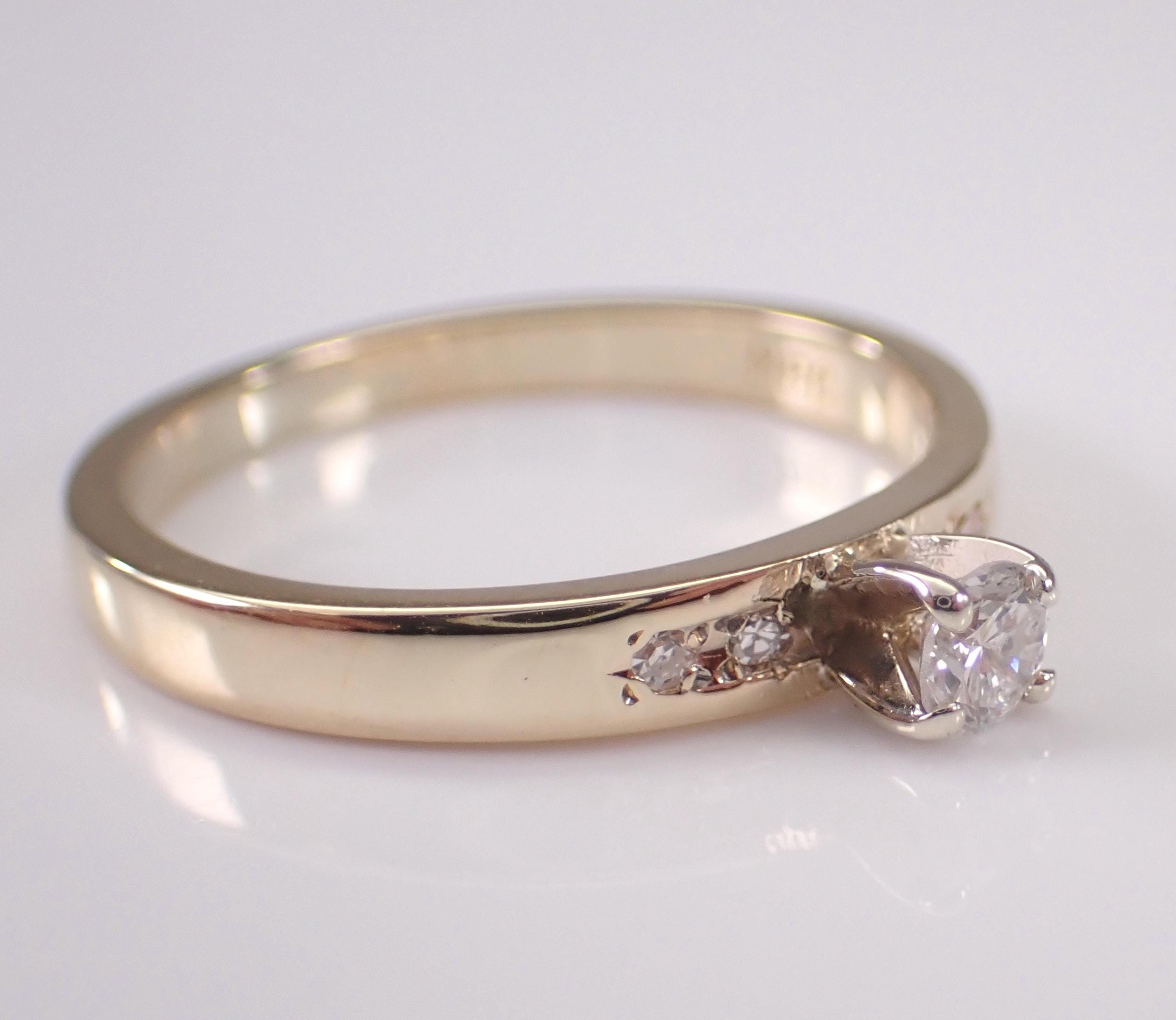 14K Yellow Gold Estate Diamond Engagement Ring. This ring is set with a center Round Brilliant Diamond. This diamond is H color, SI1 clarity and weighs .15 carat. There are four round brilliant diamonds set along the shank of this ring. These diamonds are H color, SI clarity and weigh a total of .05 carat. This ring is 14KT Yellow Gold, weighs 2.2 grams and is a finger size 5 1/4, can be easily resized (please inquire about sizing with the finger size you need). This ring will be accompanied by an appraisal by a GIA Certified Diamond Grader with the retail replacement value of $1,389.00. I will ship these rings promptly in a beautiful gift box.