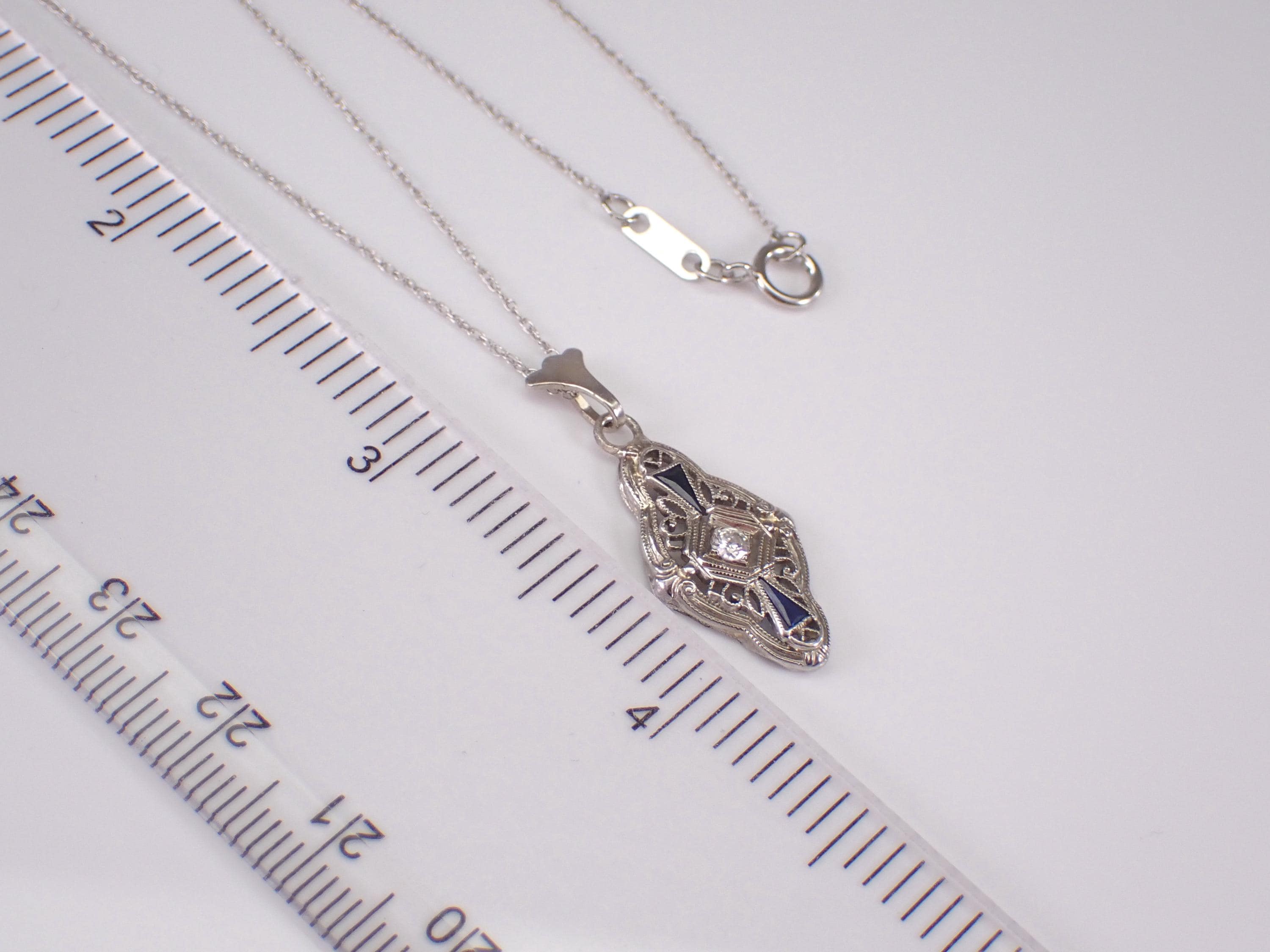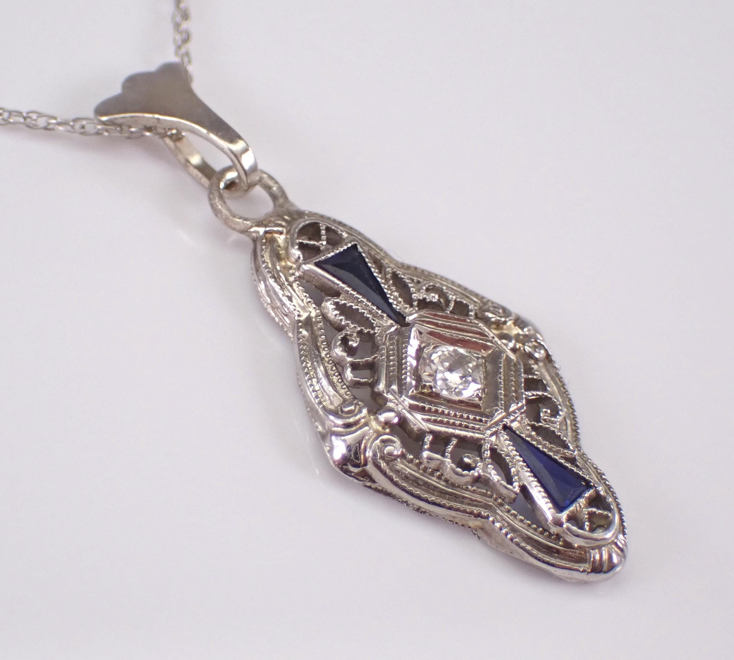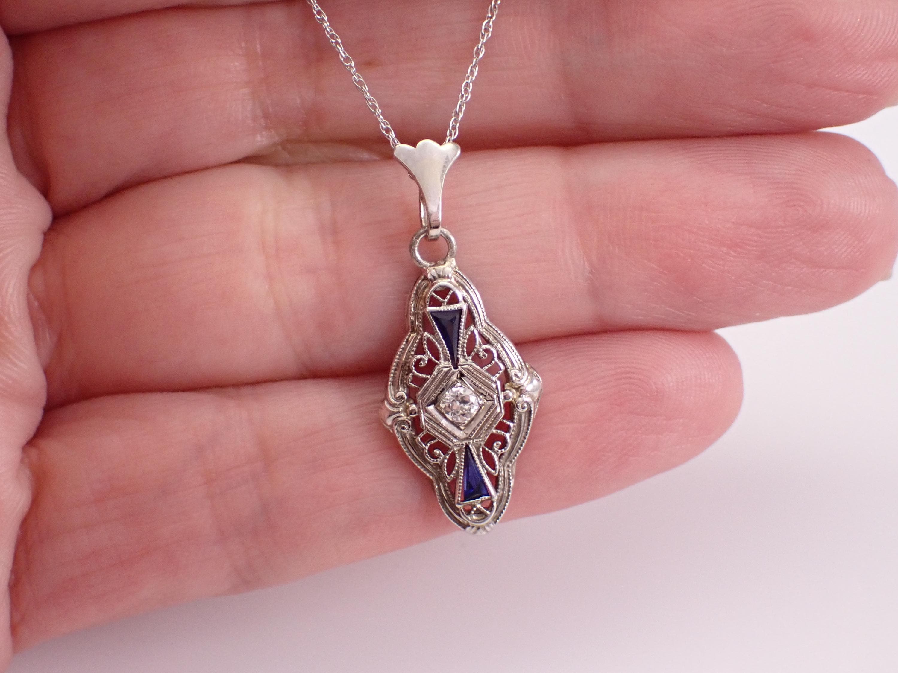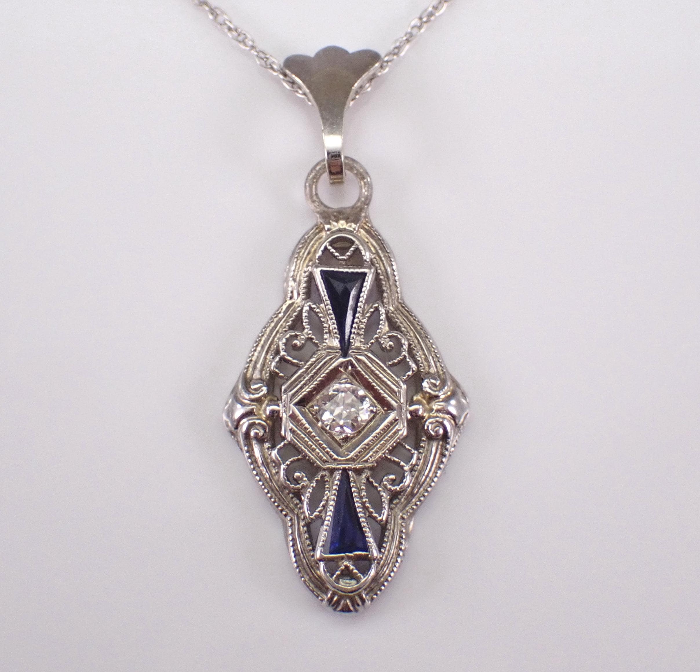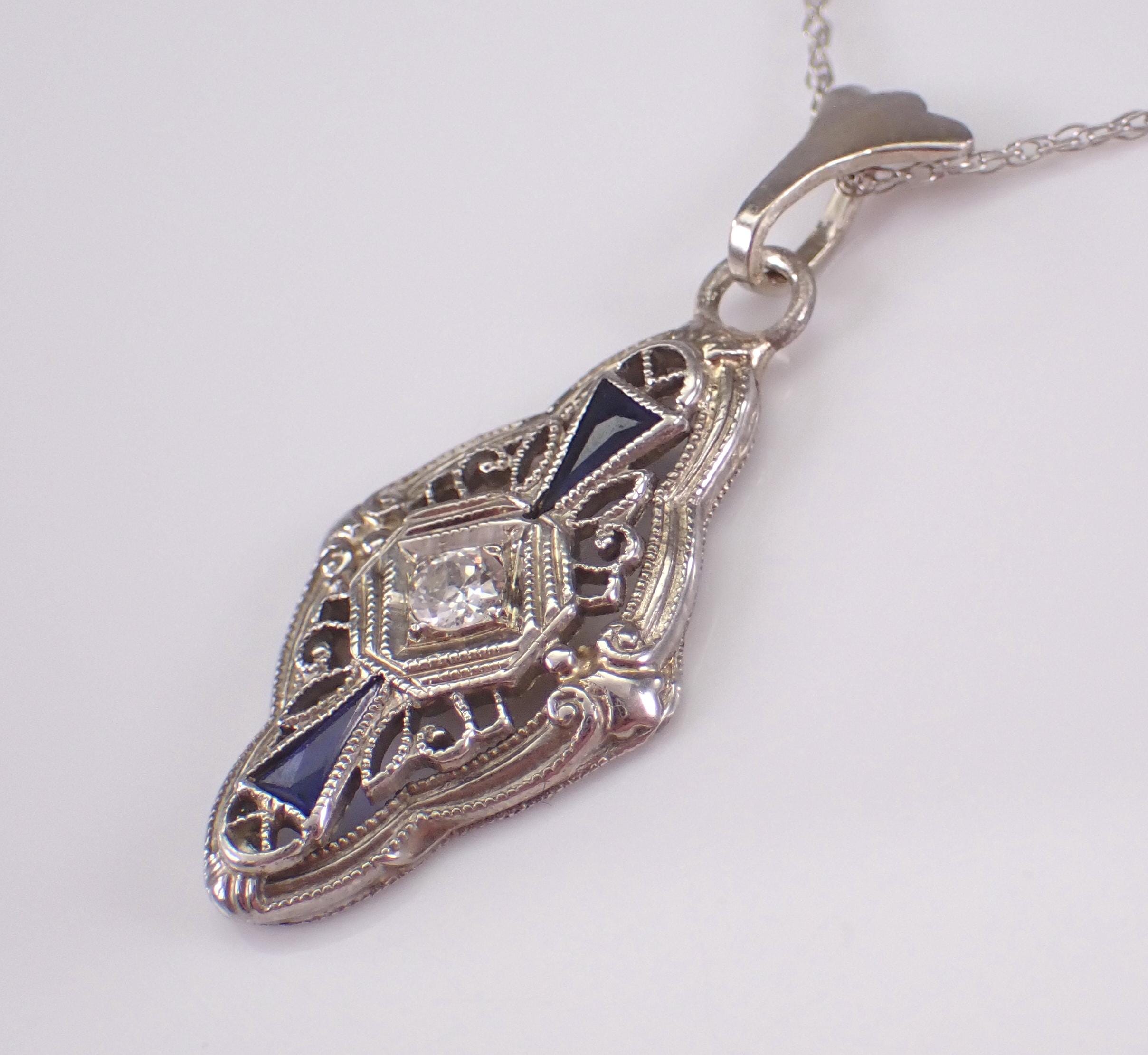 White Gold Antique Old Miner Diamond and Sapphire Pendant and Chain. This pendant is set with one genuine Round Old Miner Diamond and two Trillion shaped Sapphires. The Diamond is H color, SI1 clarity and weighs .09 carat. The sapphires in this pendant are original to the piece. This pendant is 10K White Gold (used to be a ring at some point in its long life) and comes with an 18" 10KT White Gold chain. This necklace weighs 2.3 grams and the pendant measures 21 X 12 mm. I will ship this necklace promptly in a beautiful gift box.