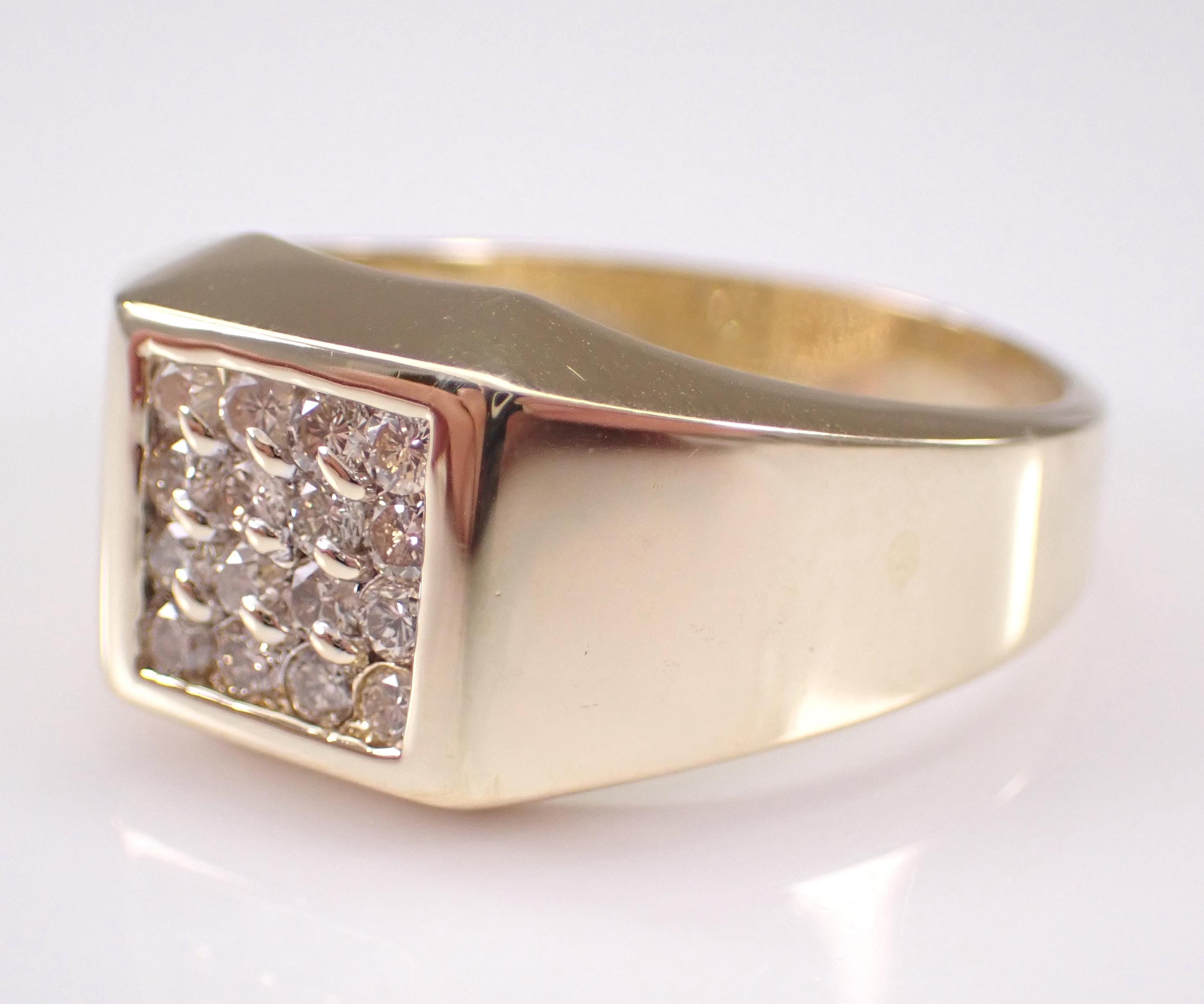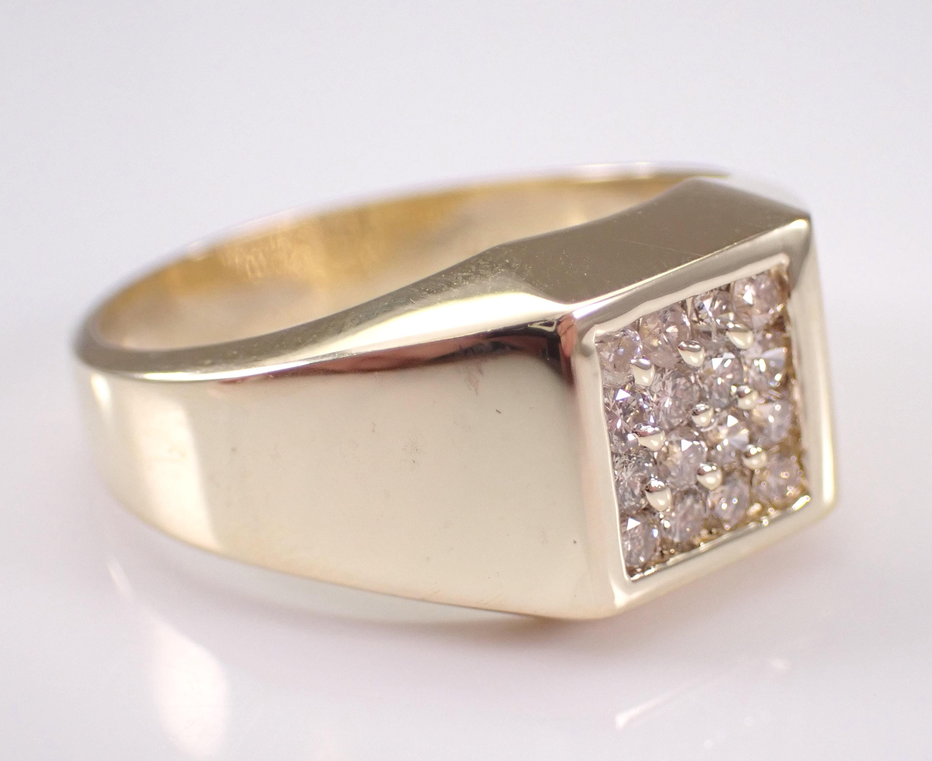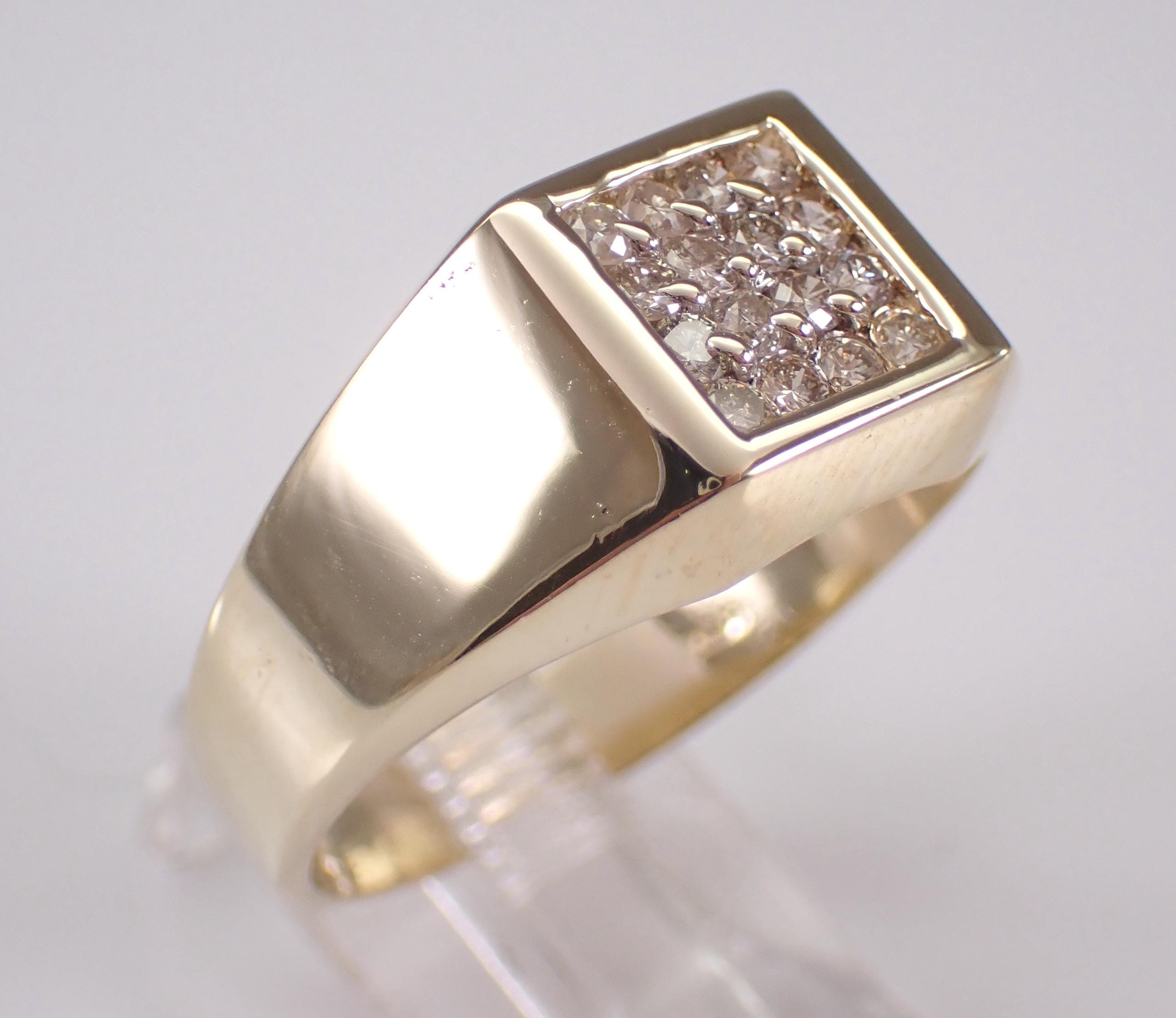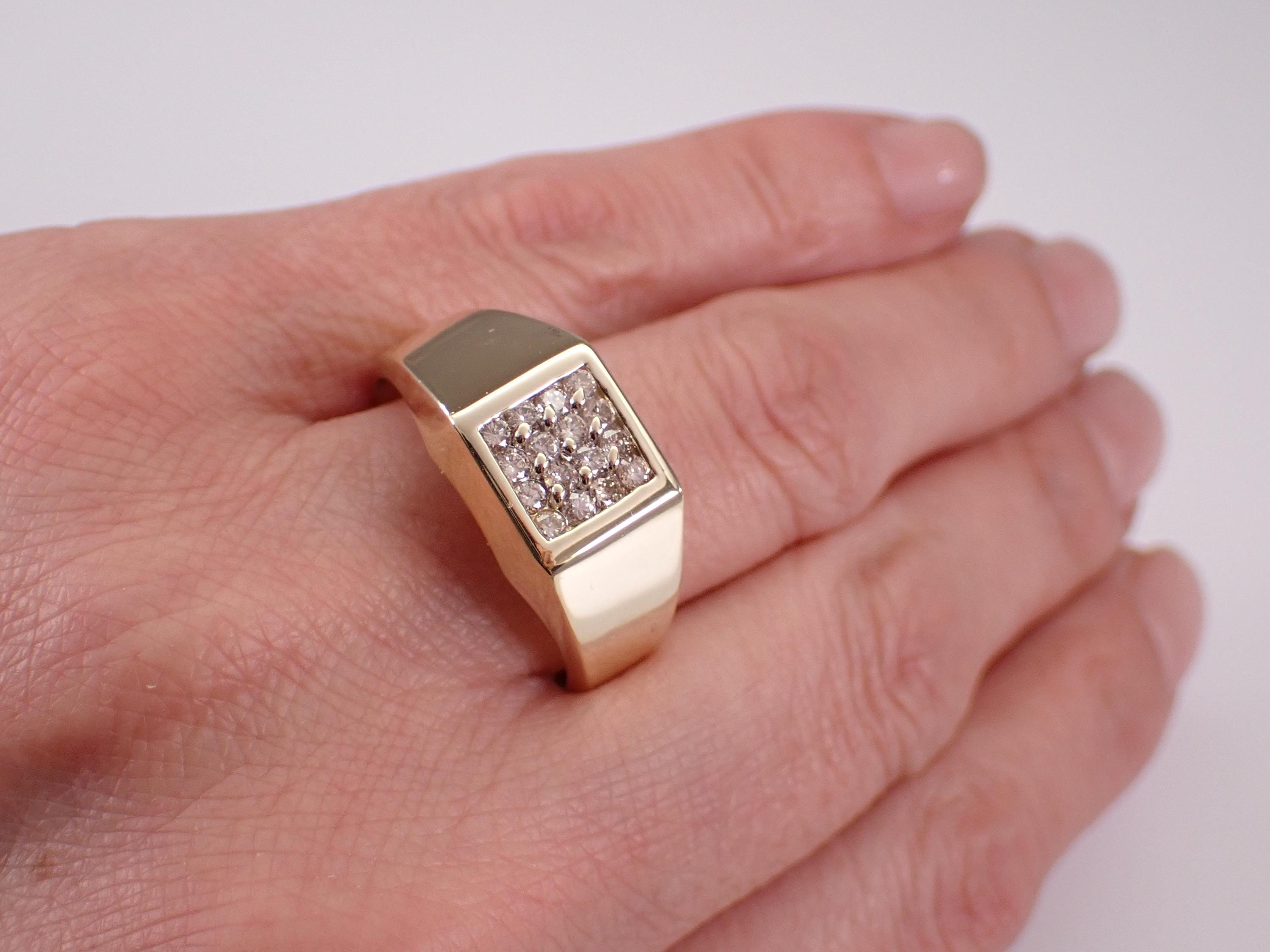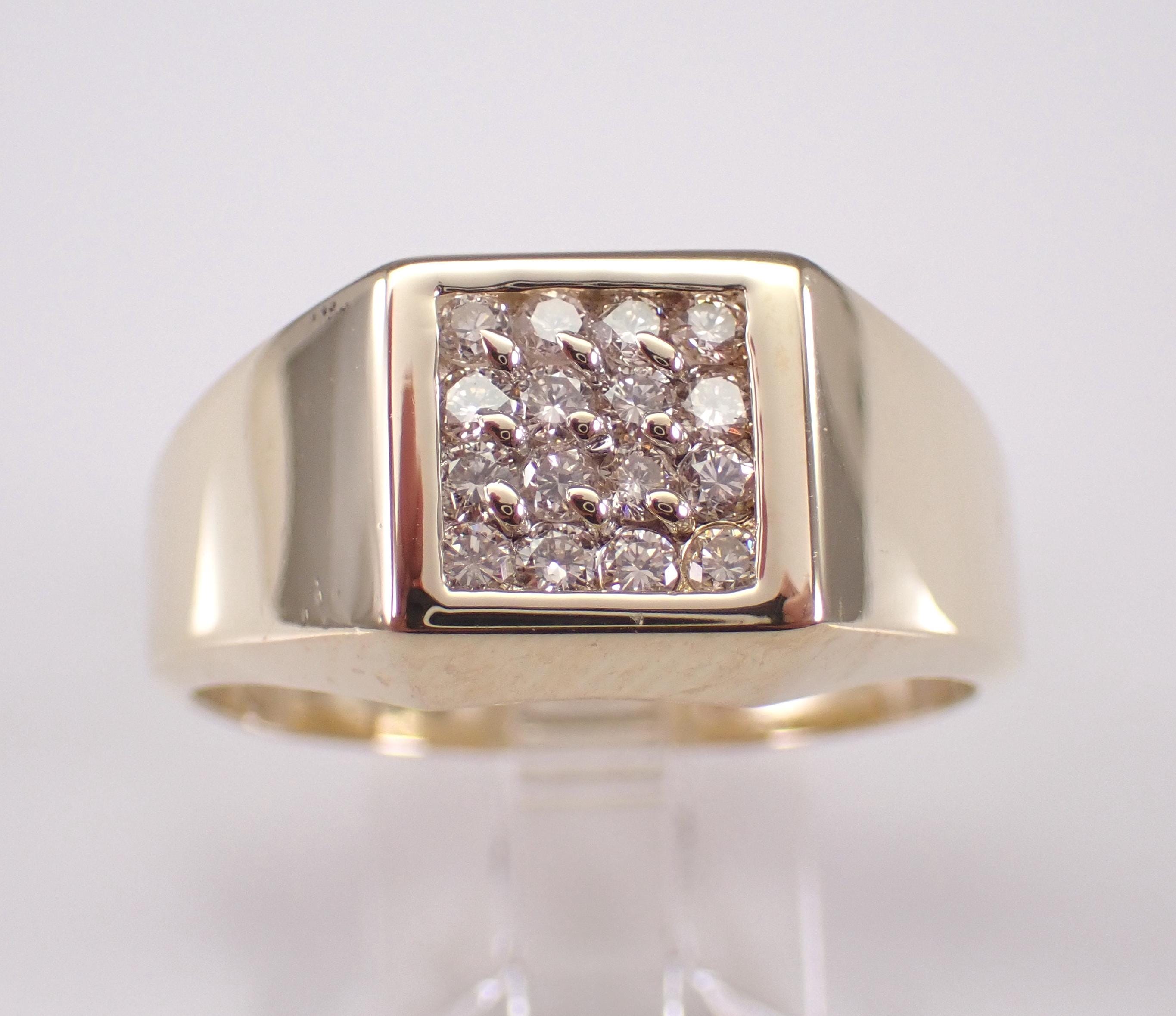 14K Yellow Gold Men's Diamond Cluster Engagement Ring. This is a beautiful ring set with sixteen genuine, natural round brilliant diamonds. These diamonds are J color, VS2 clarity and weigh a total of .40 carat. The ring is 14KT Yellow Gold, weighs 8.3 grams and is a finger size 12 1/2, which can be sized free of charge (please inquire about sizing with the finger size you need). This ring will be accompanied by an appraisal by a GIA Certified Diamond Grader with the retail replacement value of $3,985.00. I will ship this ring promptly in a gift box.