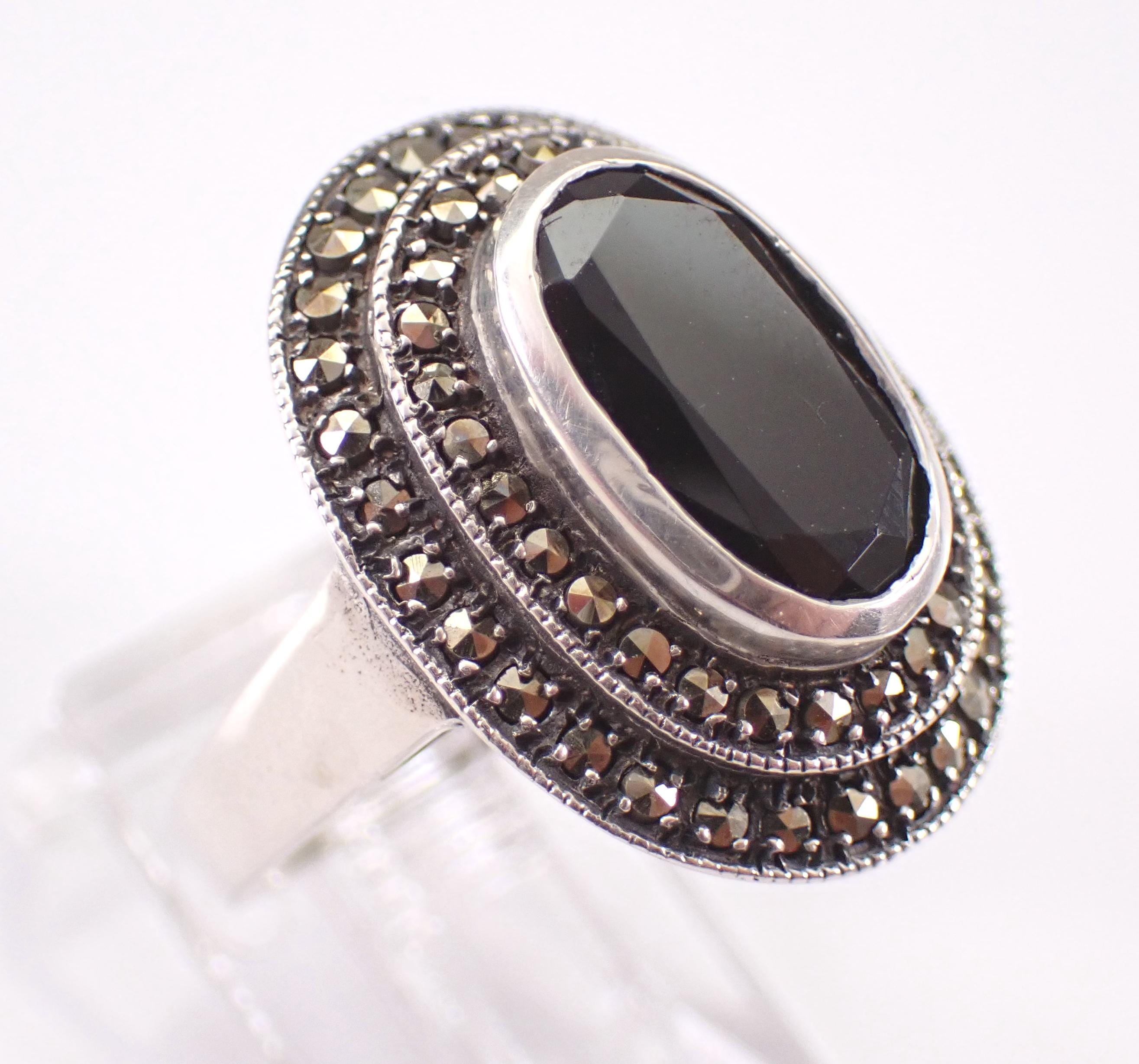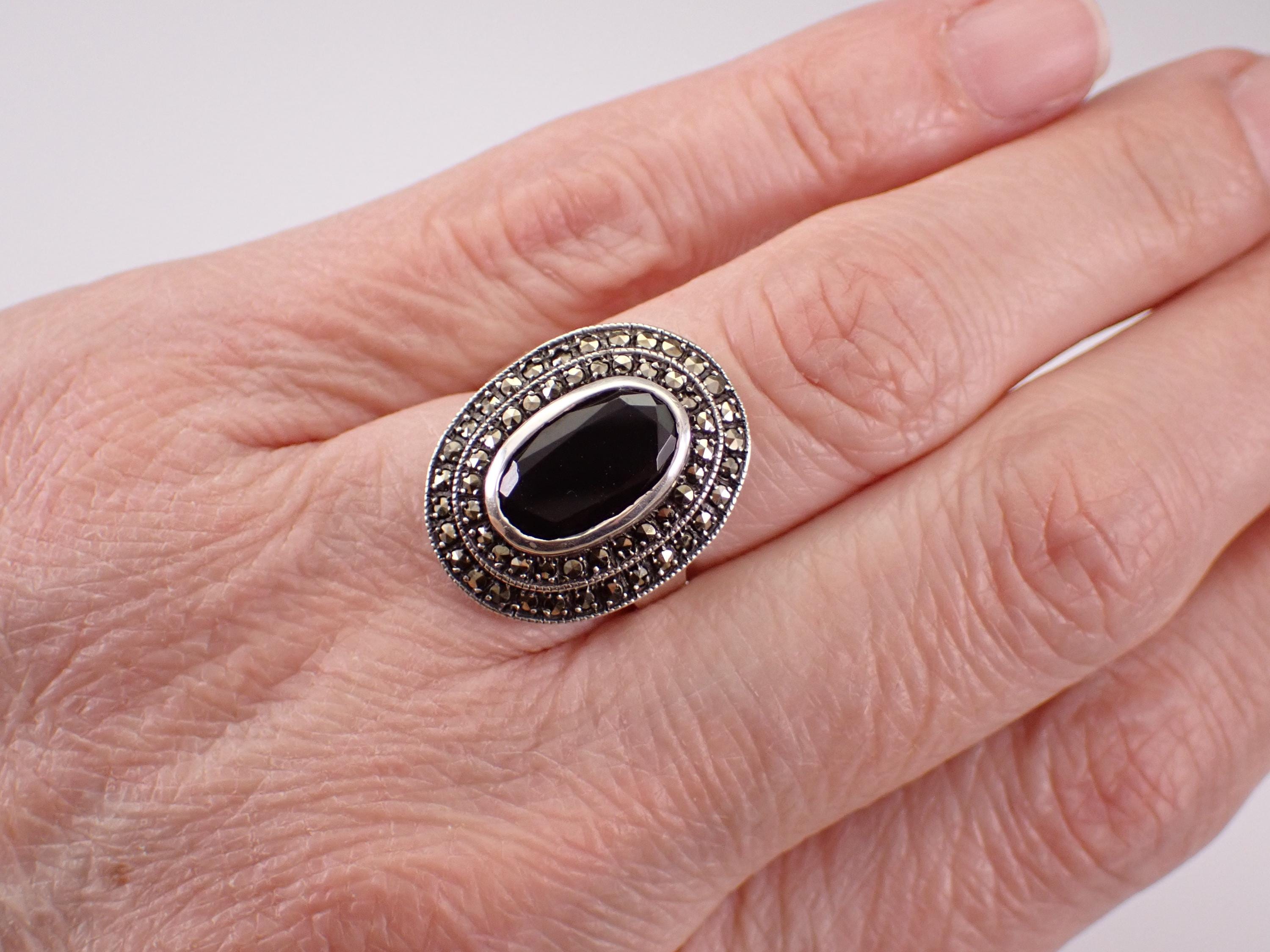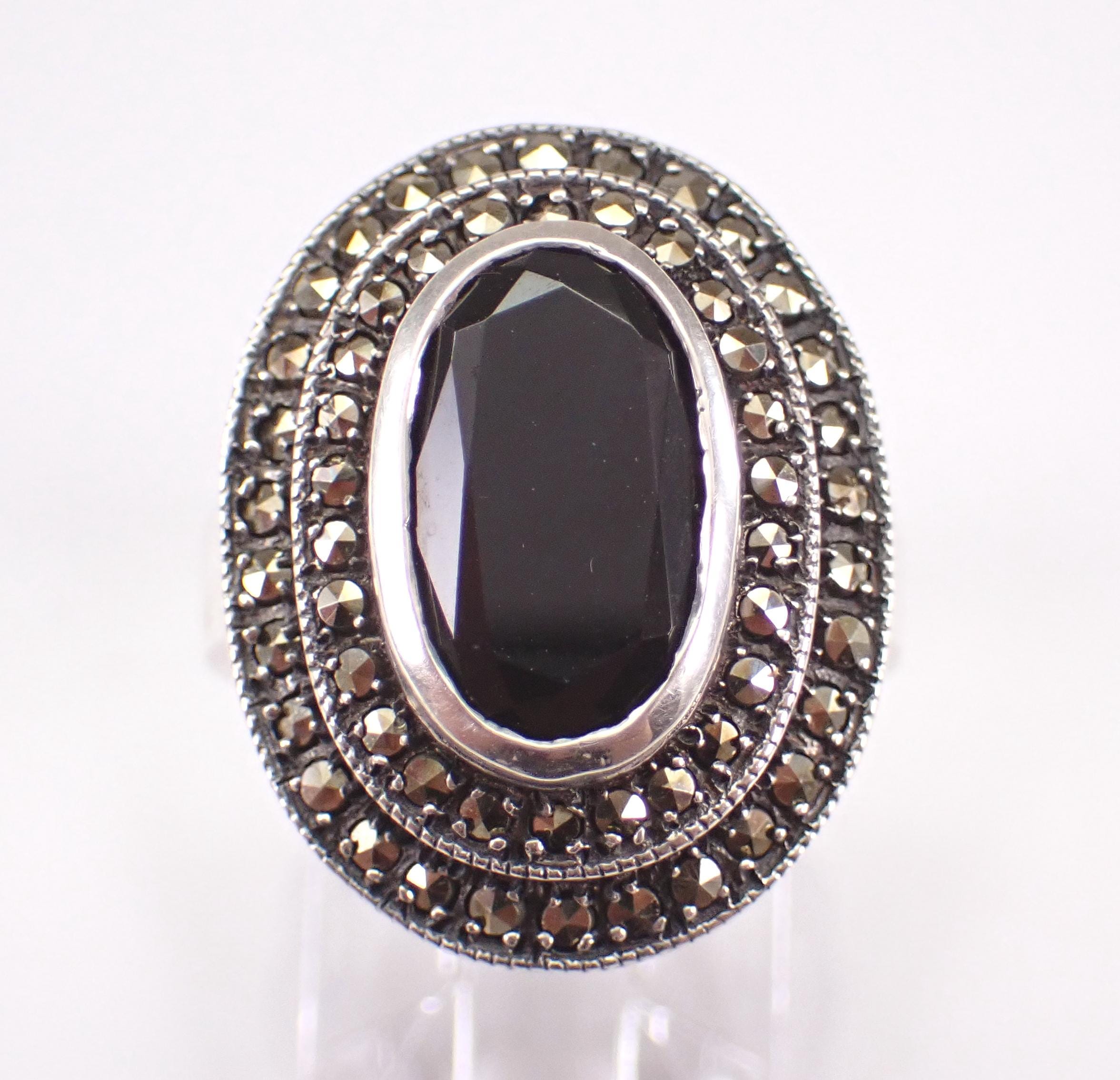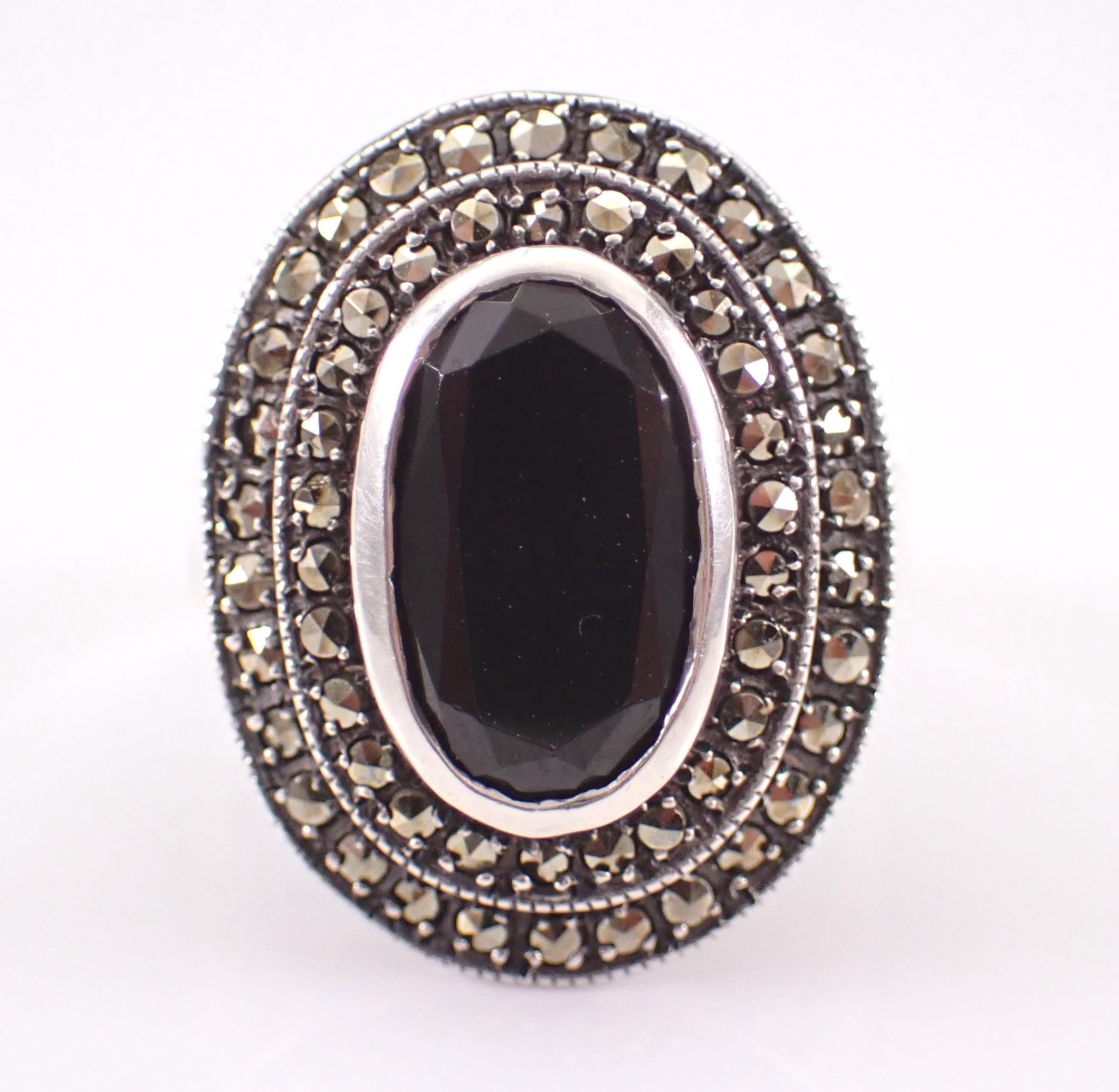 Vintage Sterling Silver Black Onyx and marcasite ring. This ring is set with a genuine Oval Onyx in the center. This Onyx measures 11 X 7 mm. This ring is in very good condition and weighs 6.2 grams. The top of this ring measures 21x17 mm. This ring will be shipped promptly in a gift pouch.