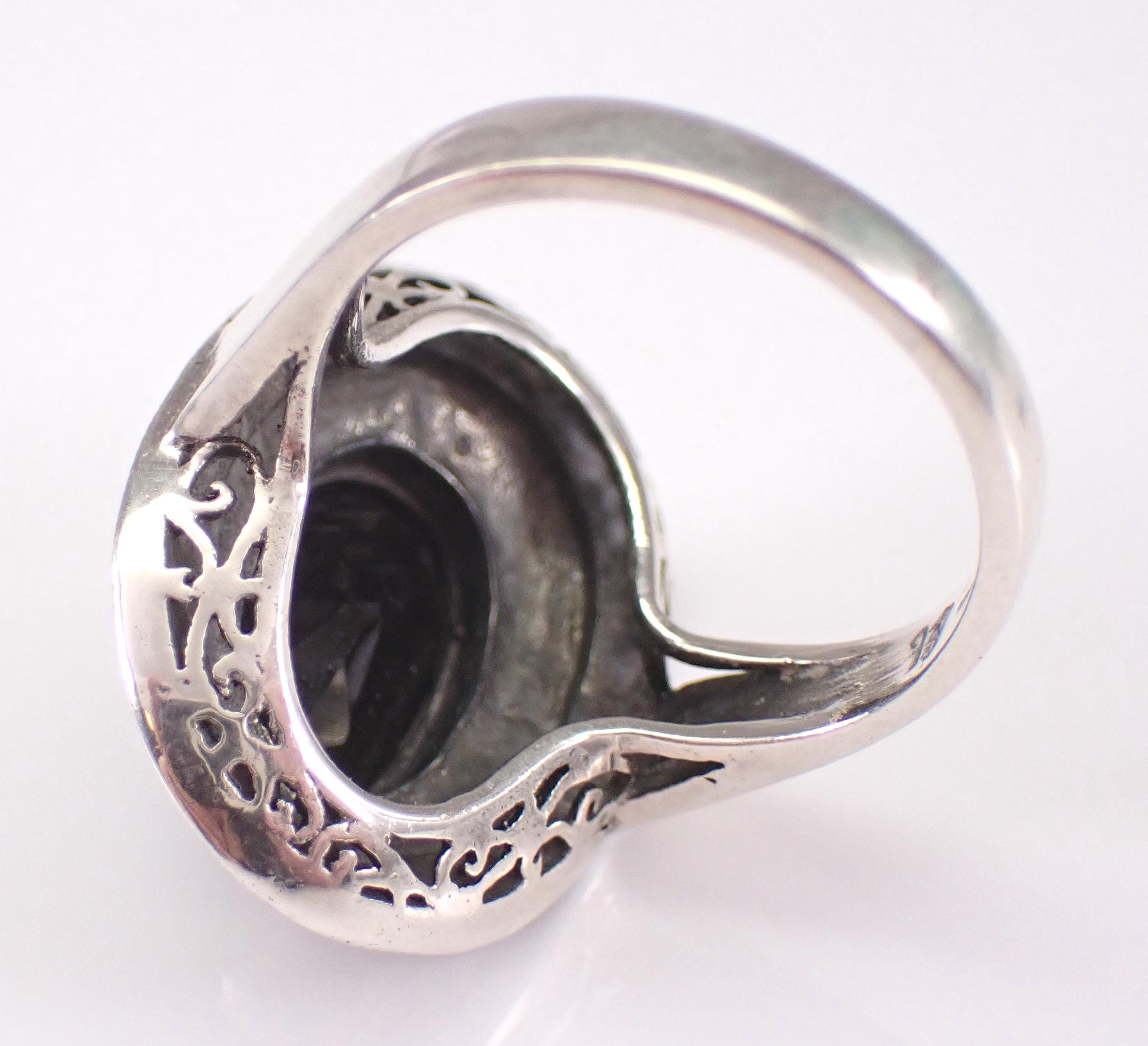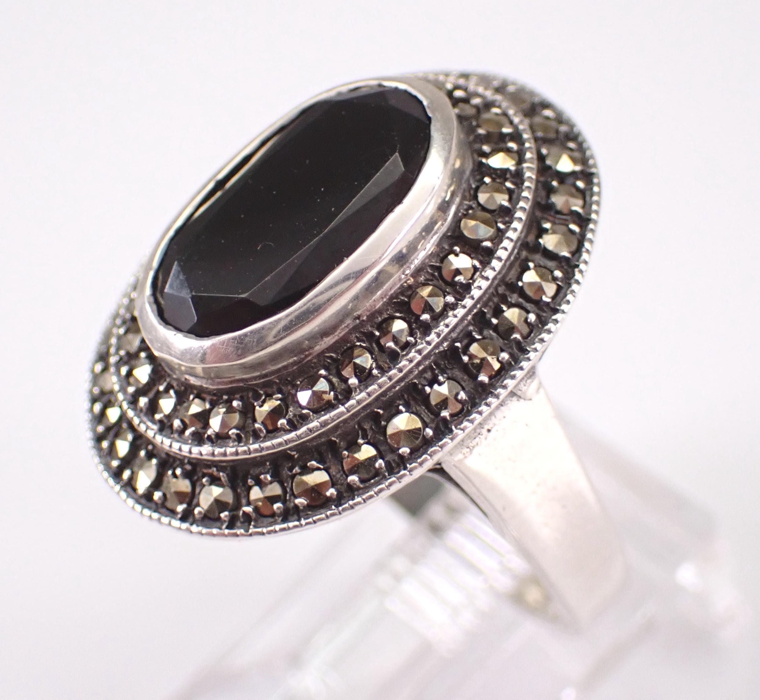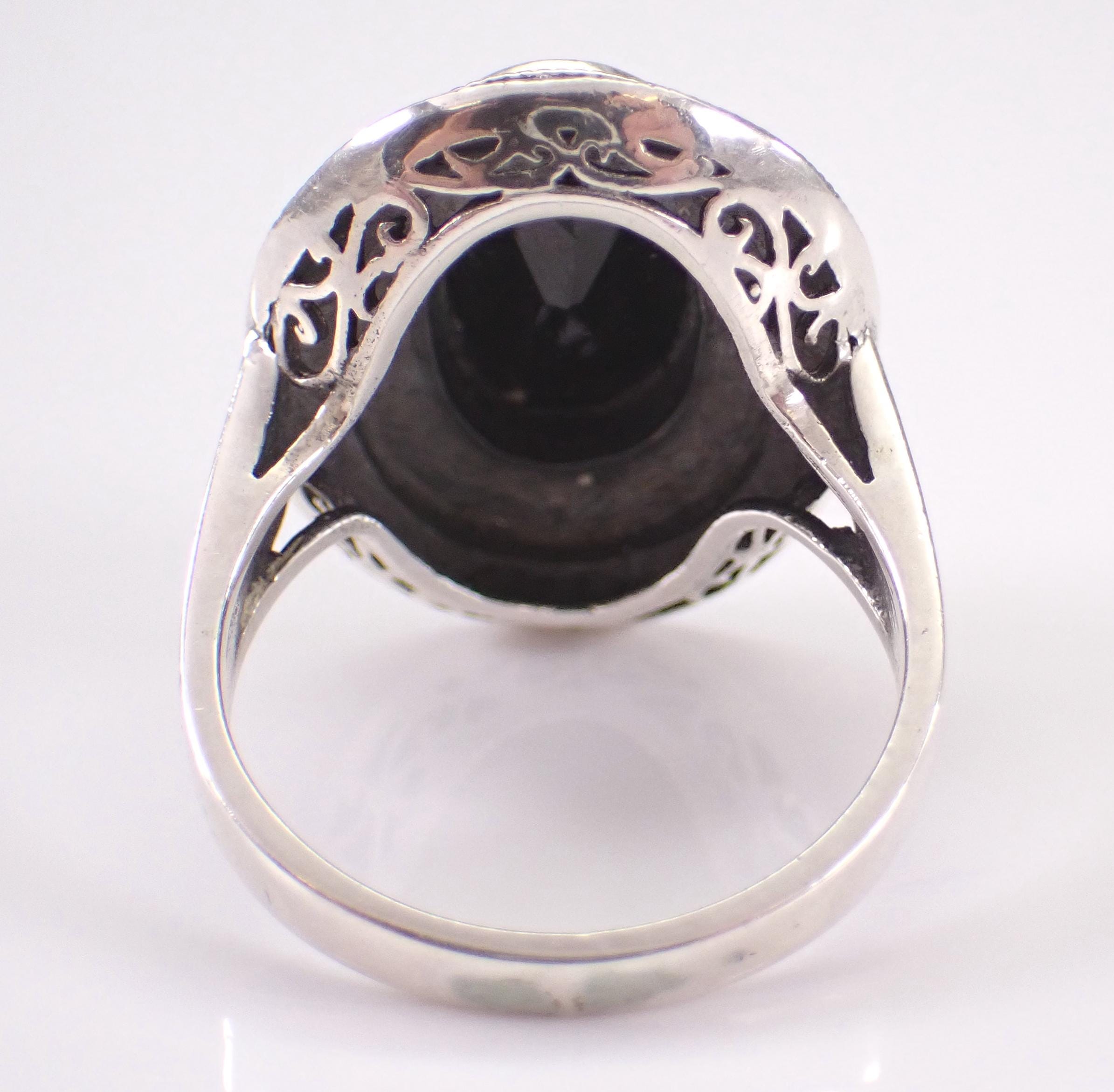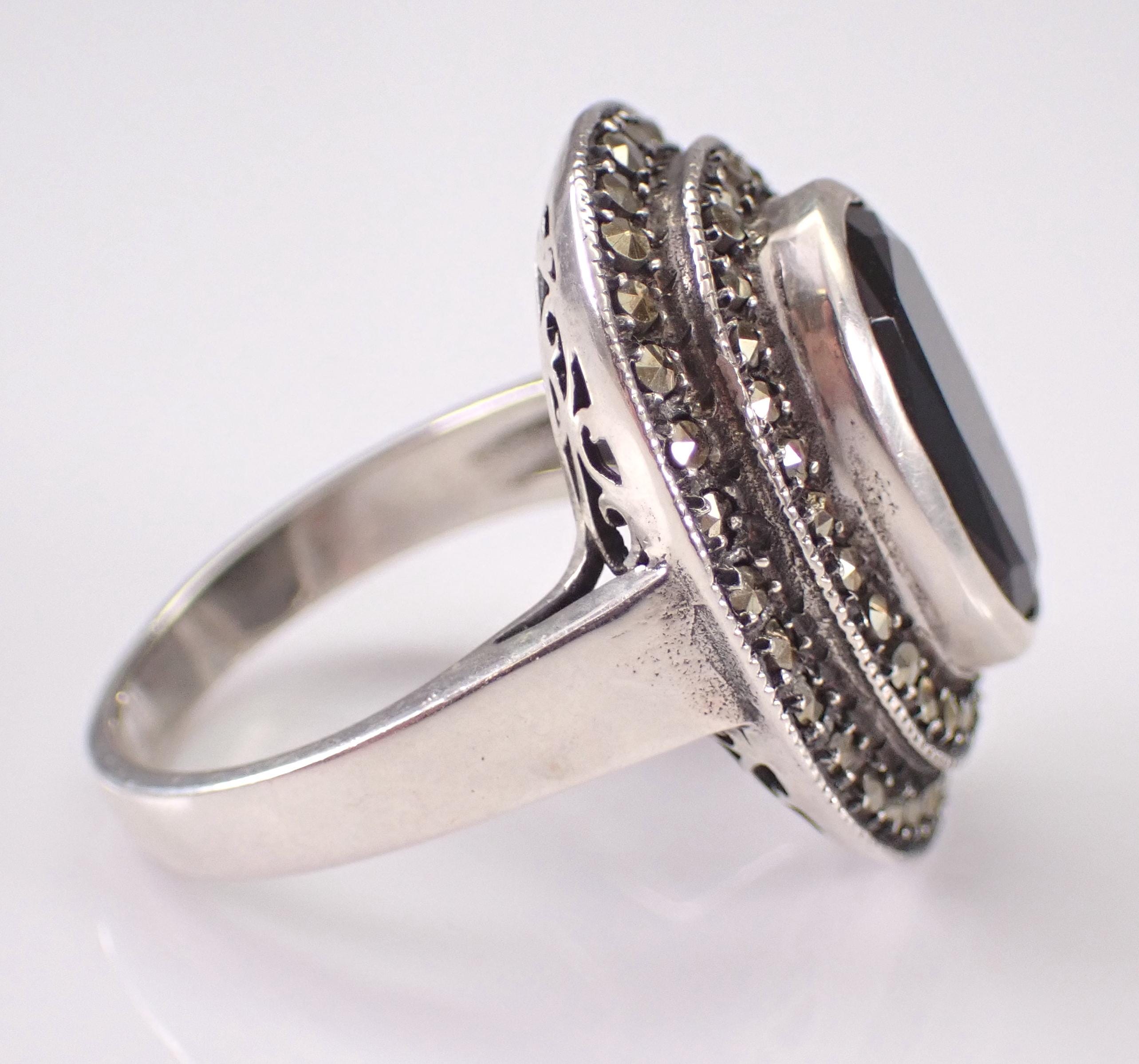 Vintage Sterling Silver Black Onyx and marcasite ring. This ring is set with a genuine Oval Onyx in the center. This Onyx measures 11 X 7 mm. This ring is in very good condition and weighs 6.2 grams. The top of this ring measures 21x17 mm. This ring will be shipped promptly in a gift pouch.