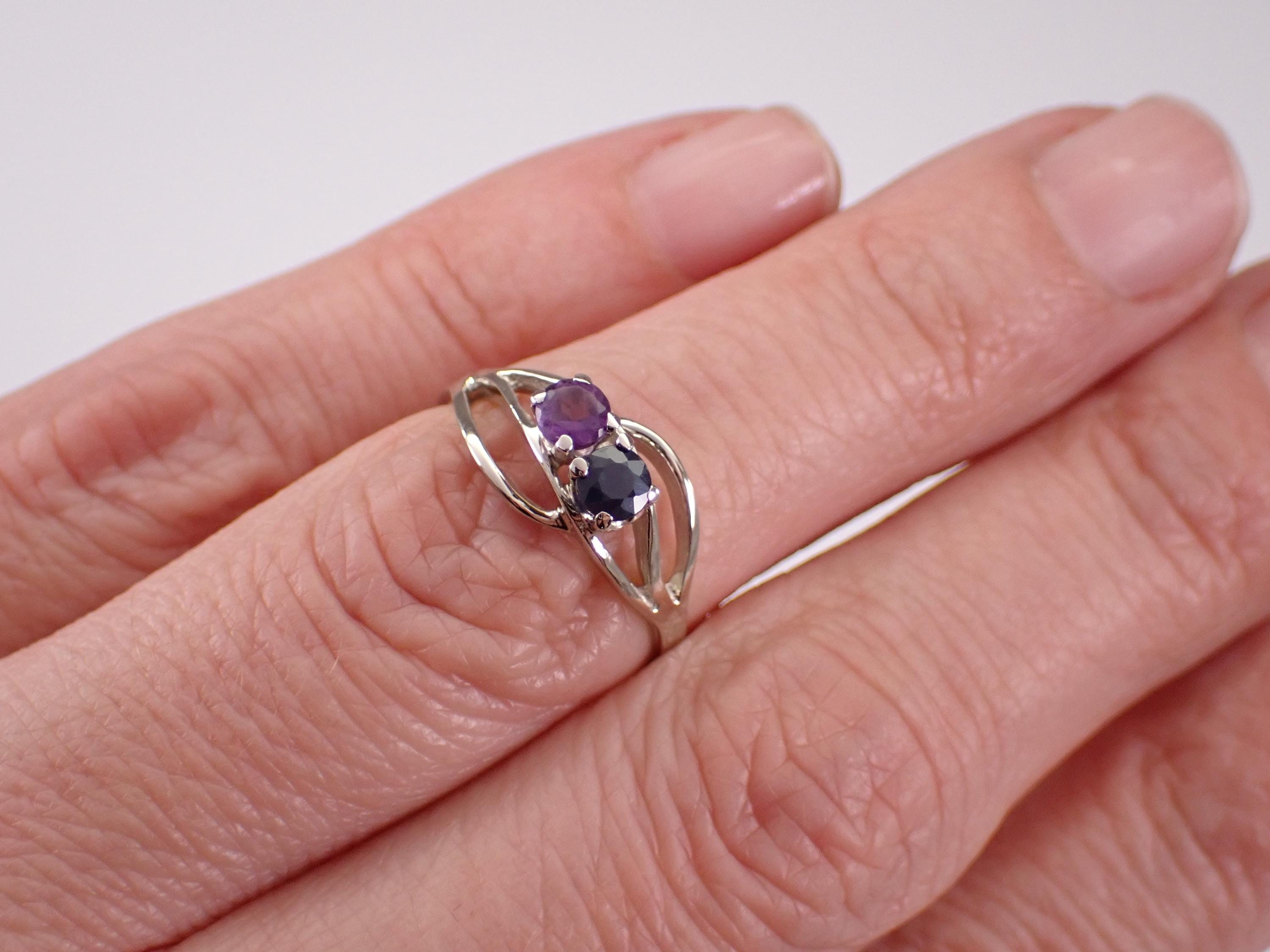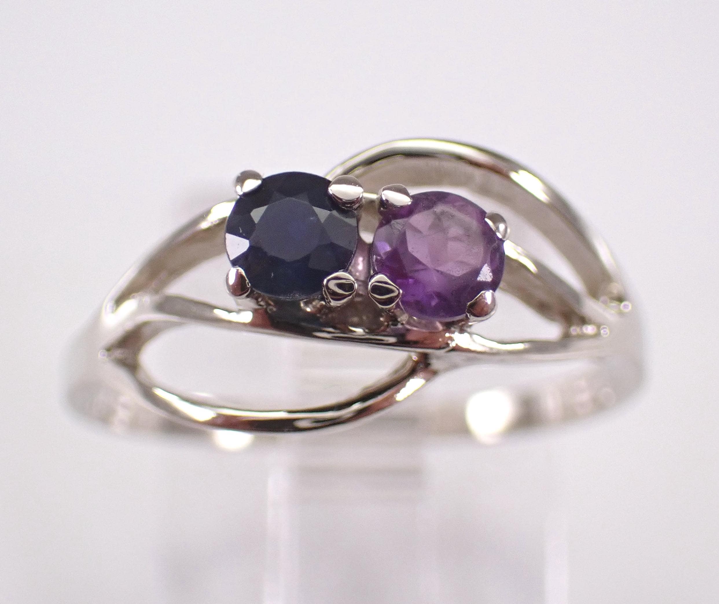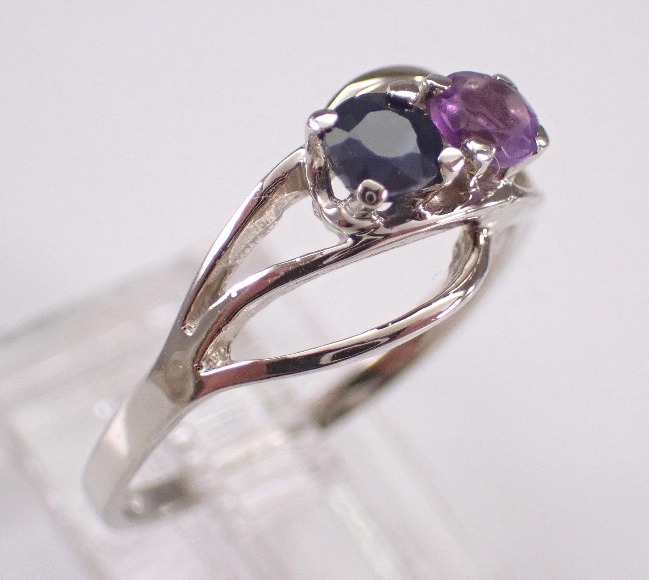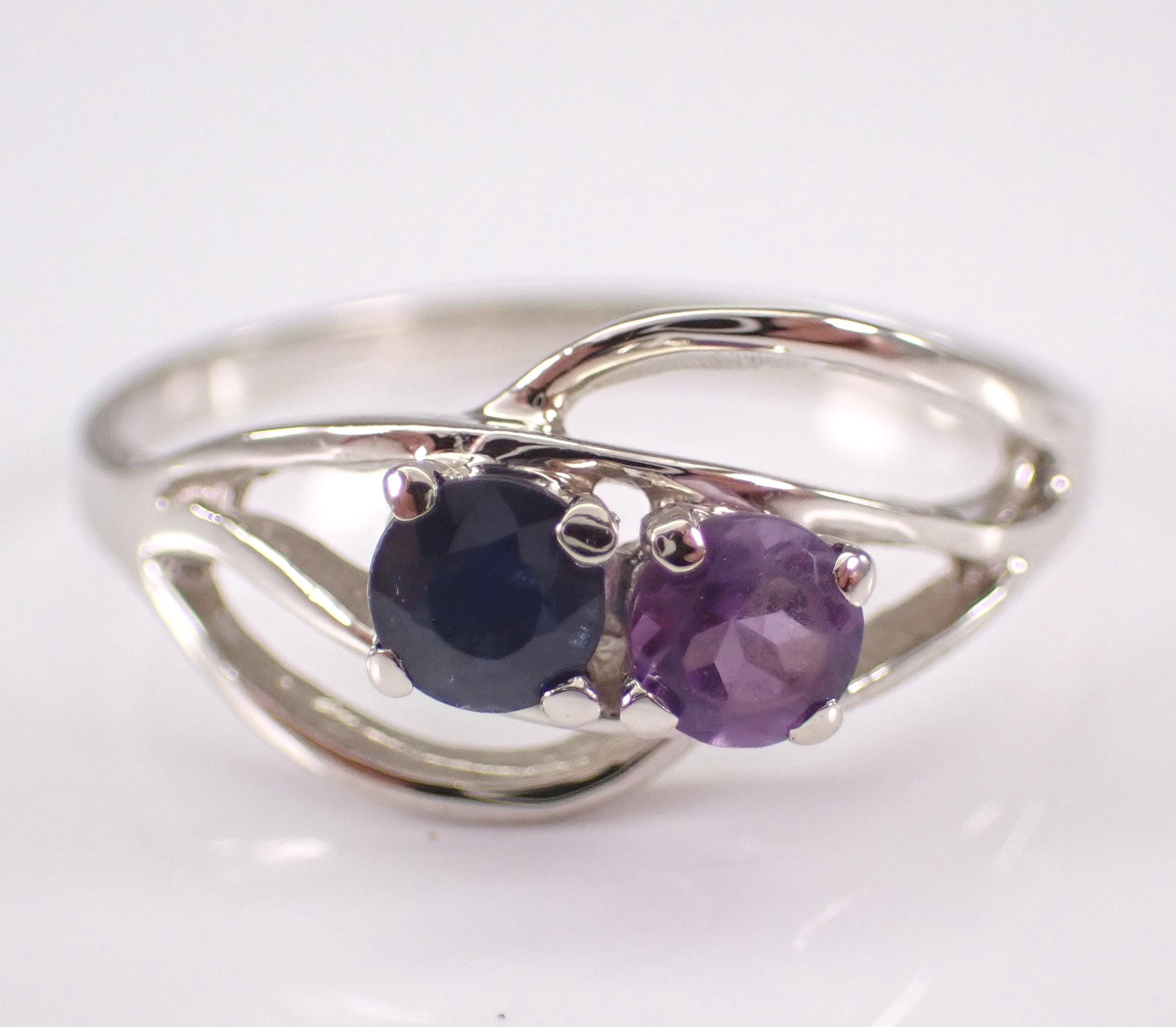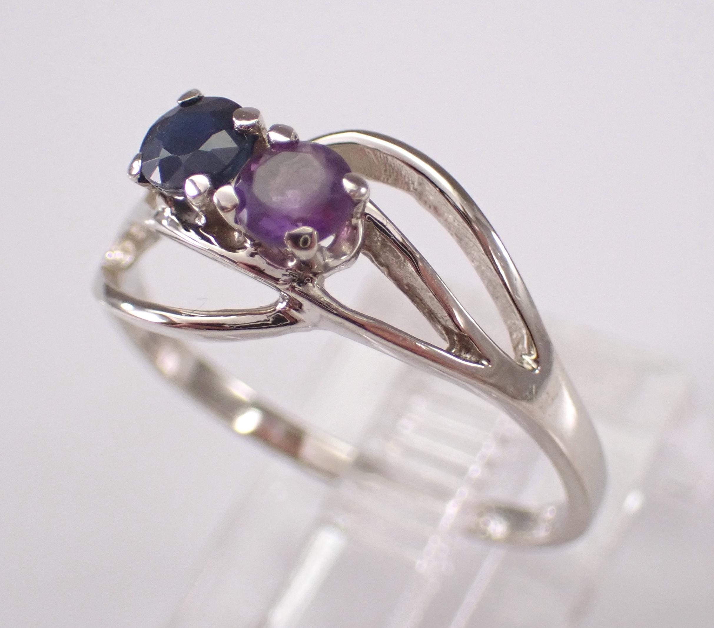 Vintage 14K White Gold Amethyst and Sapphire Ring. This ring is set with one genuine Round Sapphire and one natural Round Amethyst. The sapphire weighs .20 carat and the amethyst weighs .20 carat. This ring is 14KT White Gold, weighs 1.8 grams and is a finger size 6, can be resized (please inquire about sizing with the finger size you need). This ring will be shipped promptly in a gift box.