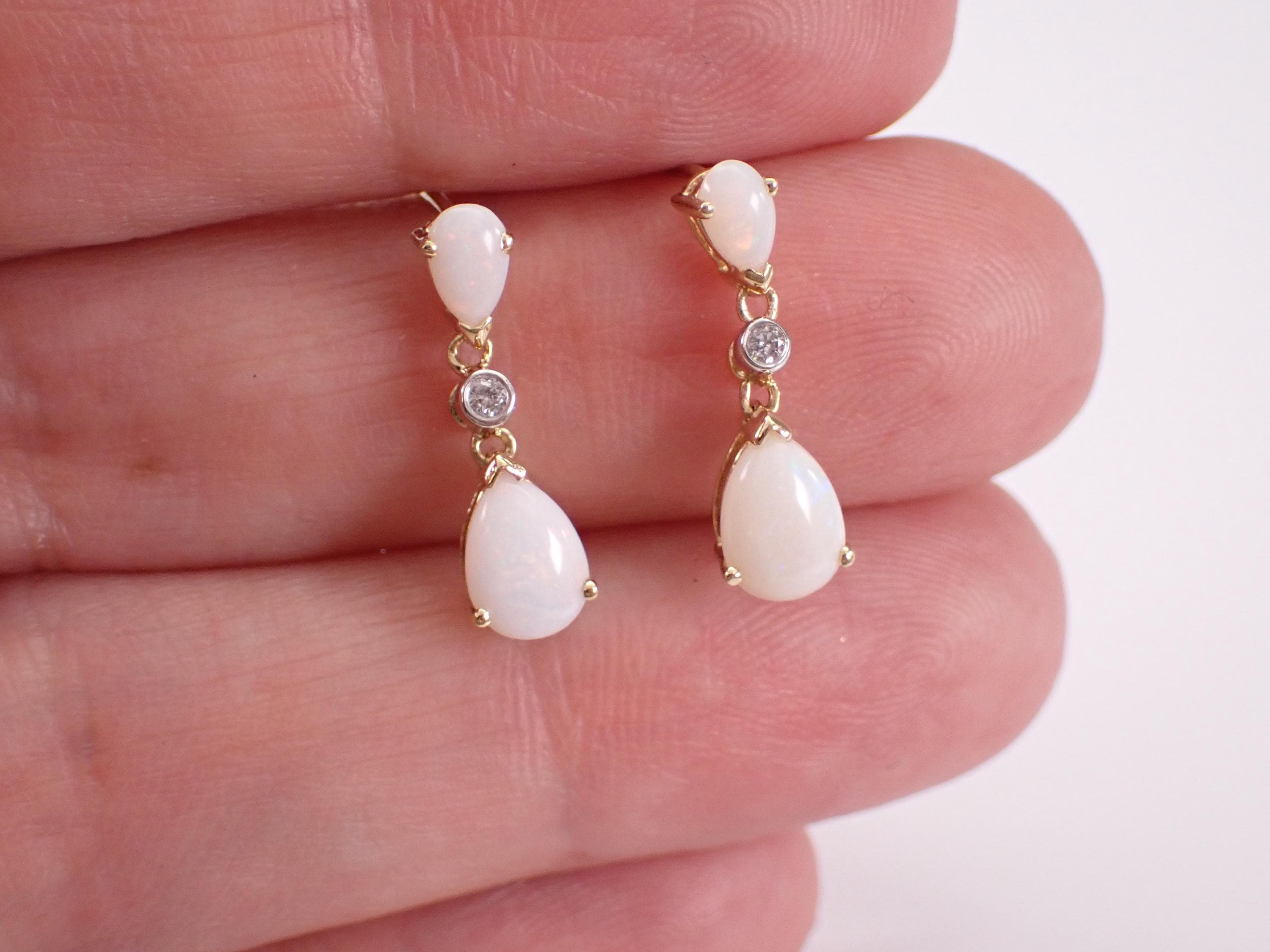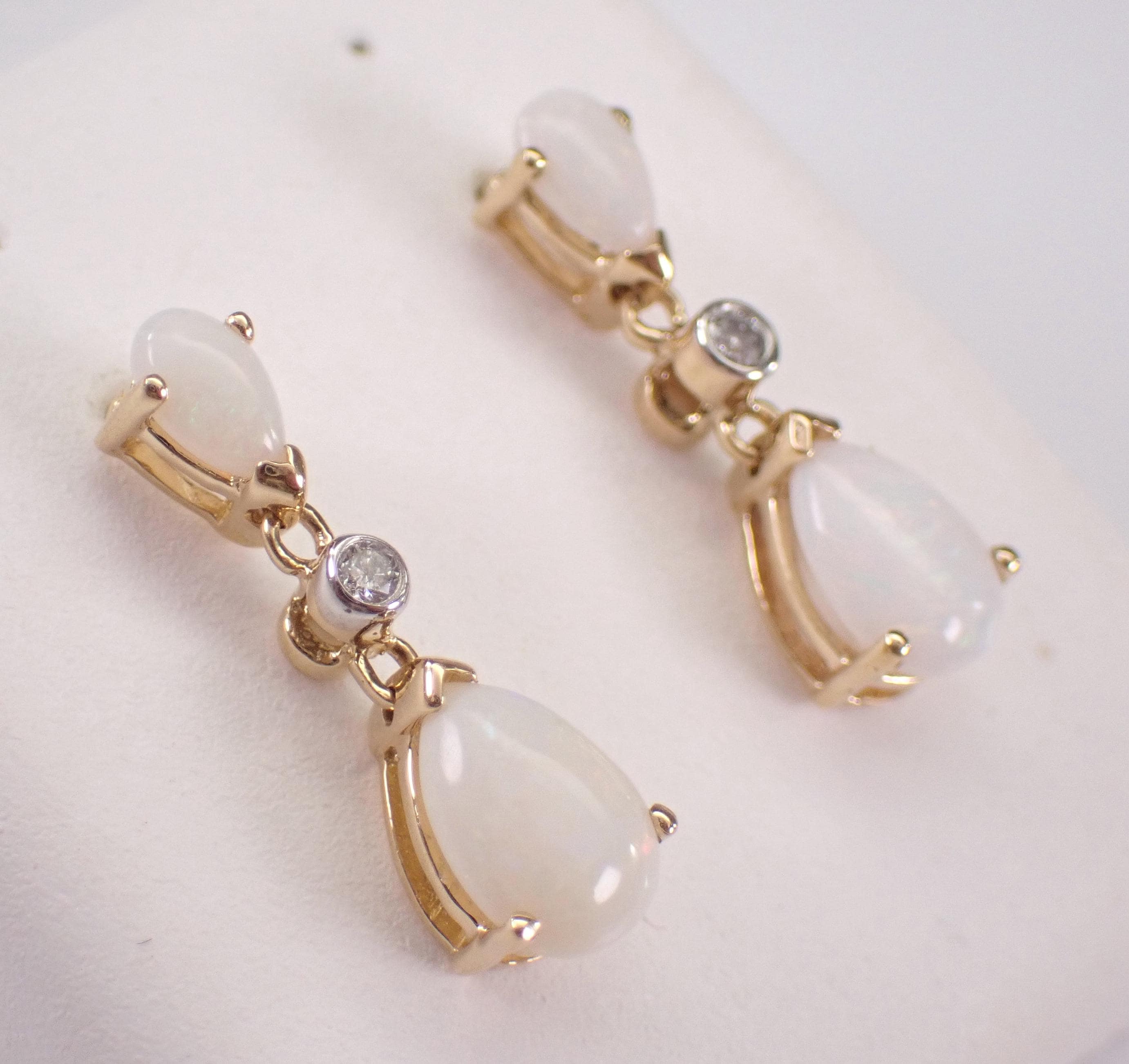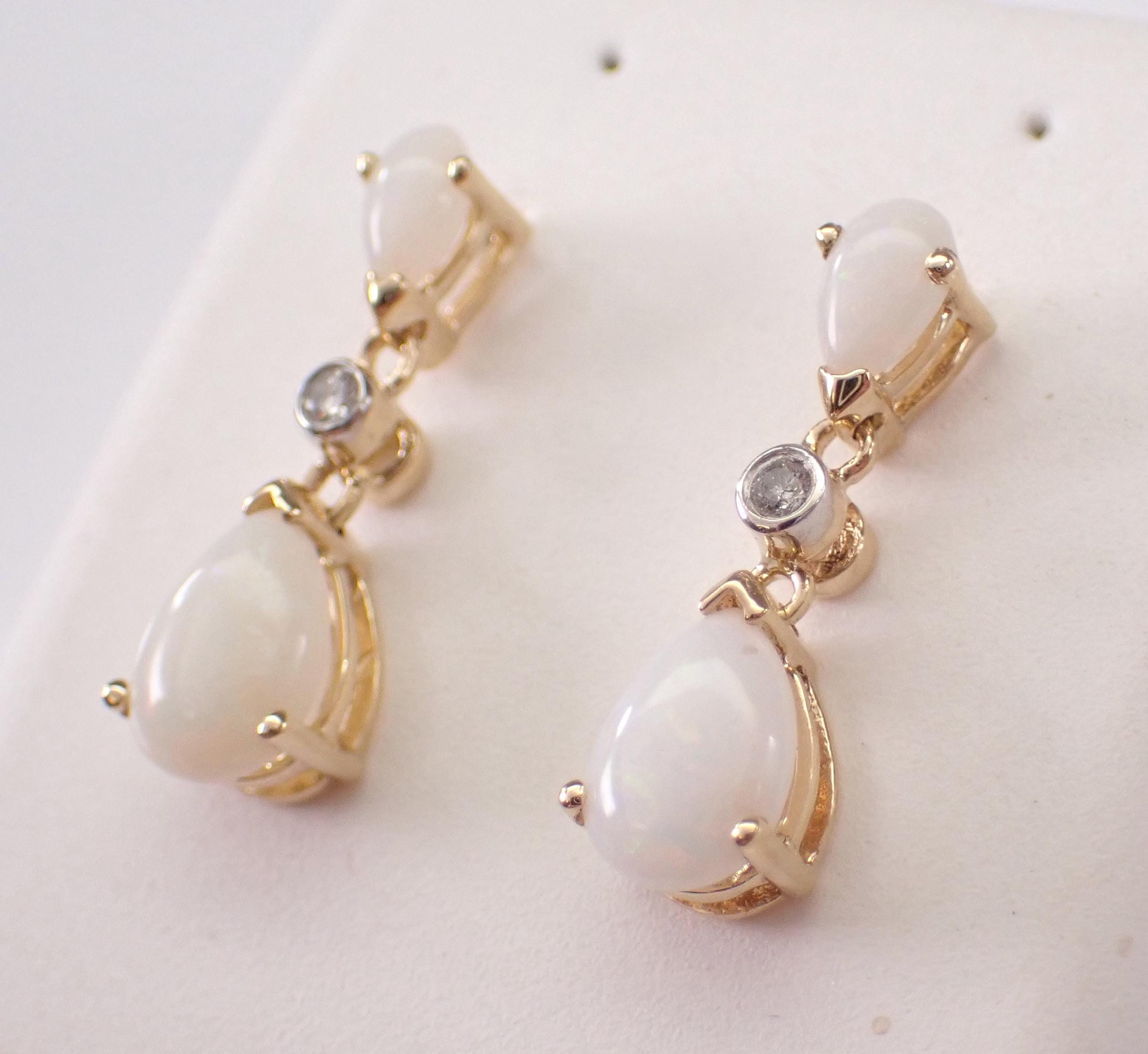 14K Yellow Gold Vintage Opal and Diamond Dangle Earrings. These earrings are set with two genuine Round Diamonds and four natural Pearl shaped Opal. The diamonds in these earrings are H color, I1 clarity and weigh a total of .02 carat. The top Opal measure 5 X 3 mm and the dangle Opal measure 7 X 5 mm each. These earrings are 14KT Yellow Gold and weigh a total of 1.6 grams. These earrings are for pierced ears, measure 12.5 mm in length and the earrings have friction post backings. These earrings will be accompanied by an appraisal written by a GIA Certified Diamond Grader with the retail replacement value of $1,295.00. I will ship these earrings promptly in a gift box.