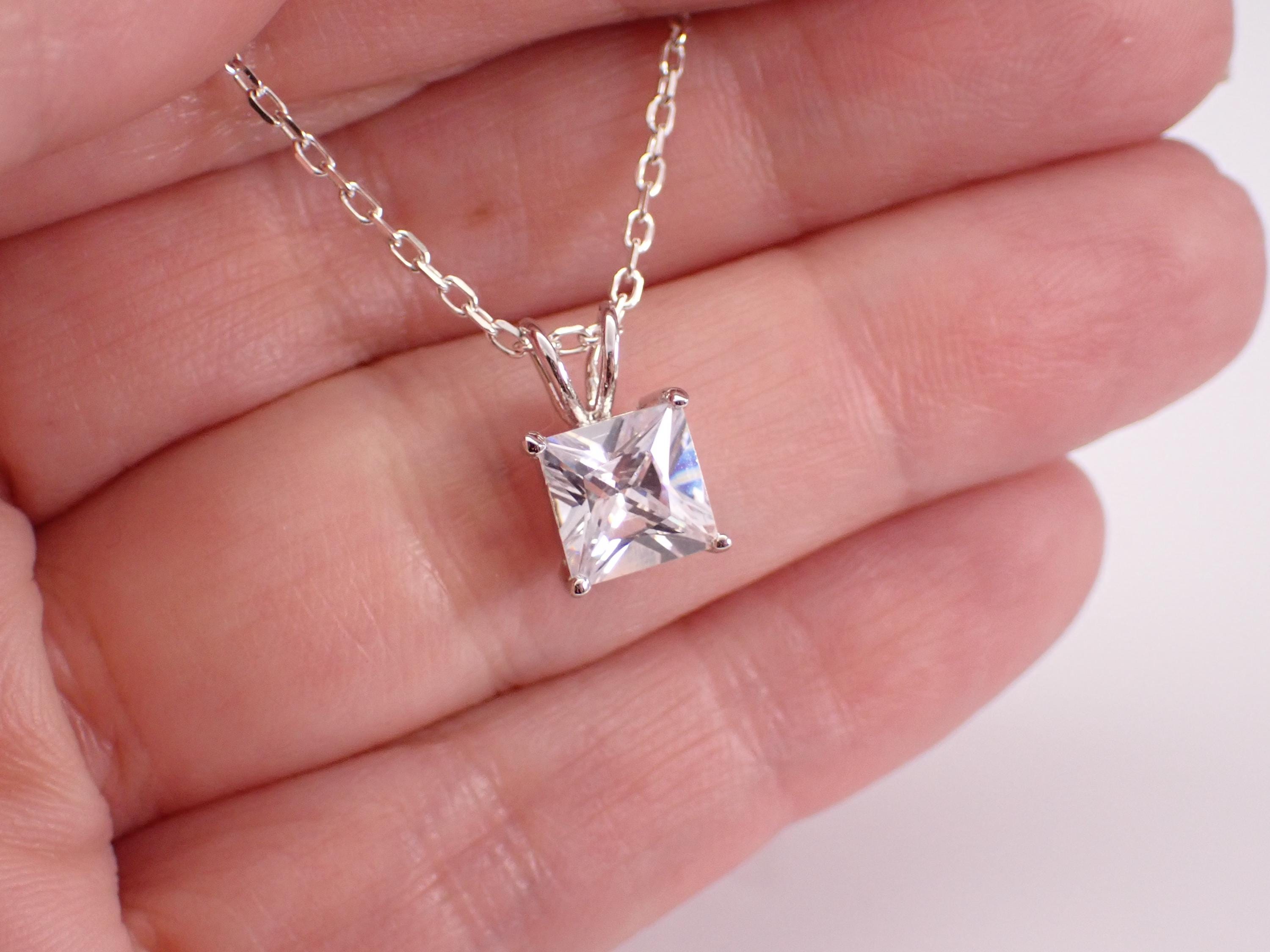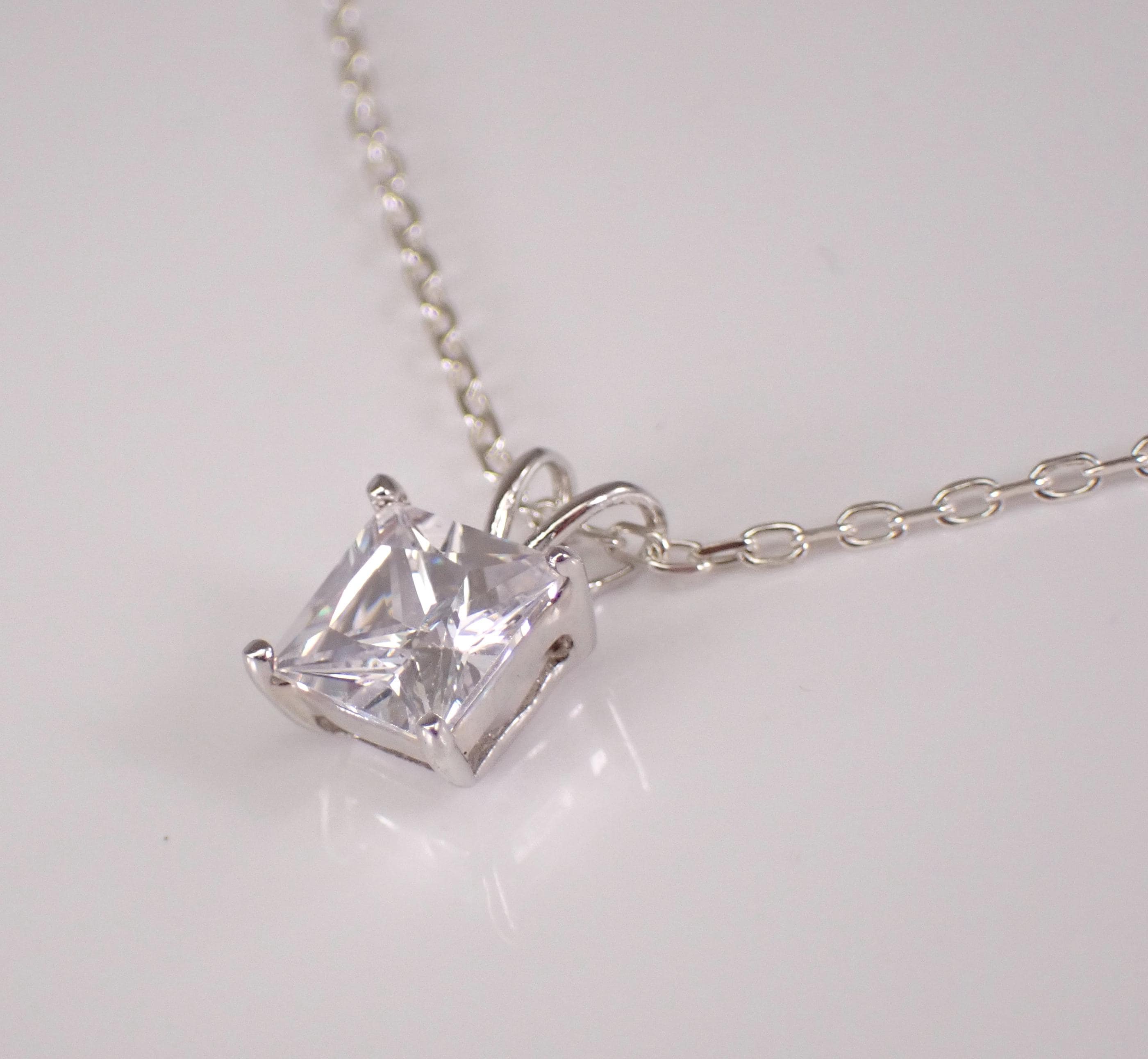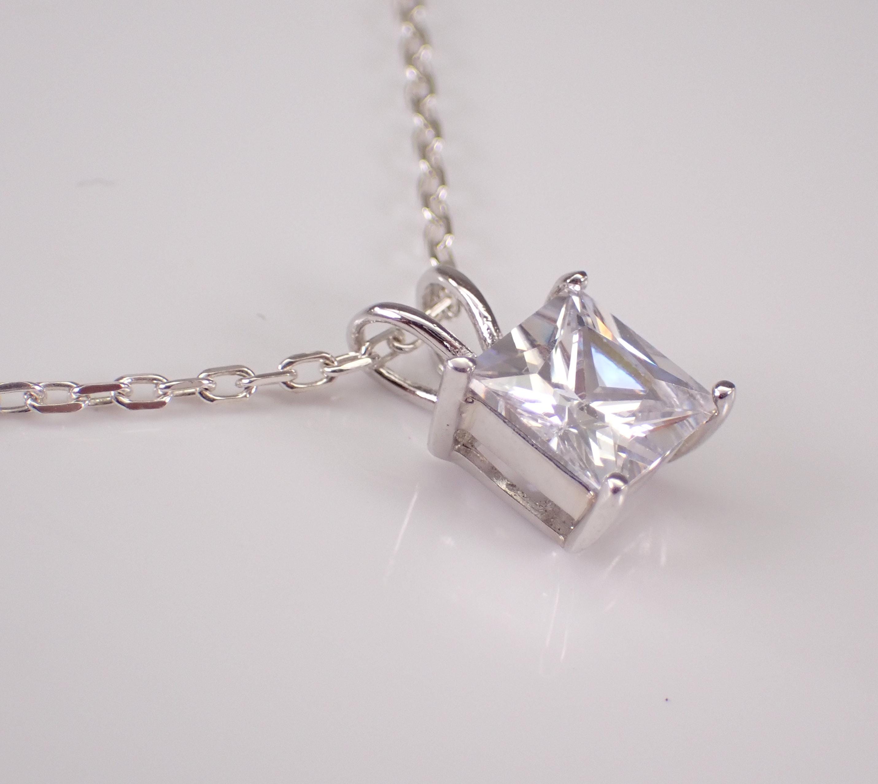 A unique estate sterling silver Cubic Zirconia necklace. This vintage silver necklace is in excellent condition and is set with a Princess Cut Cubic Zirconia in the center.