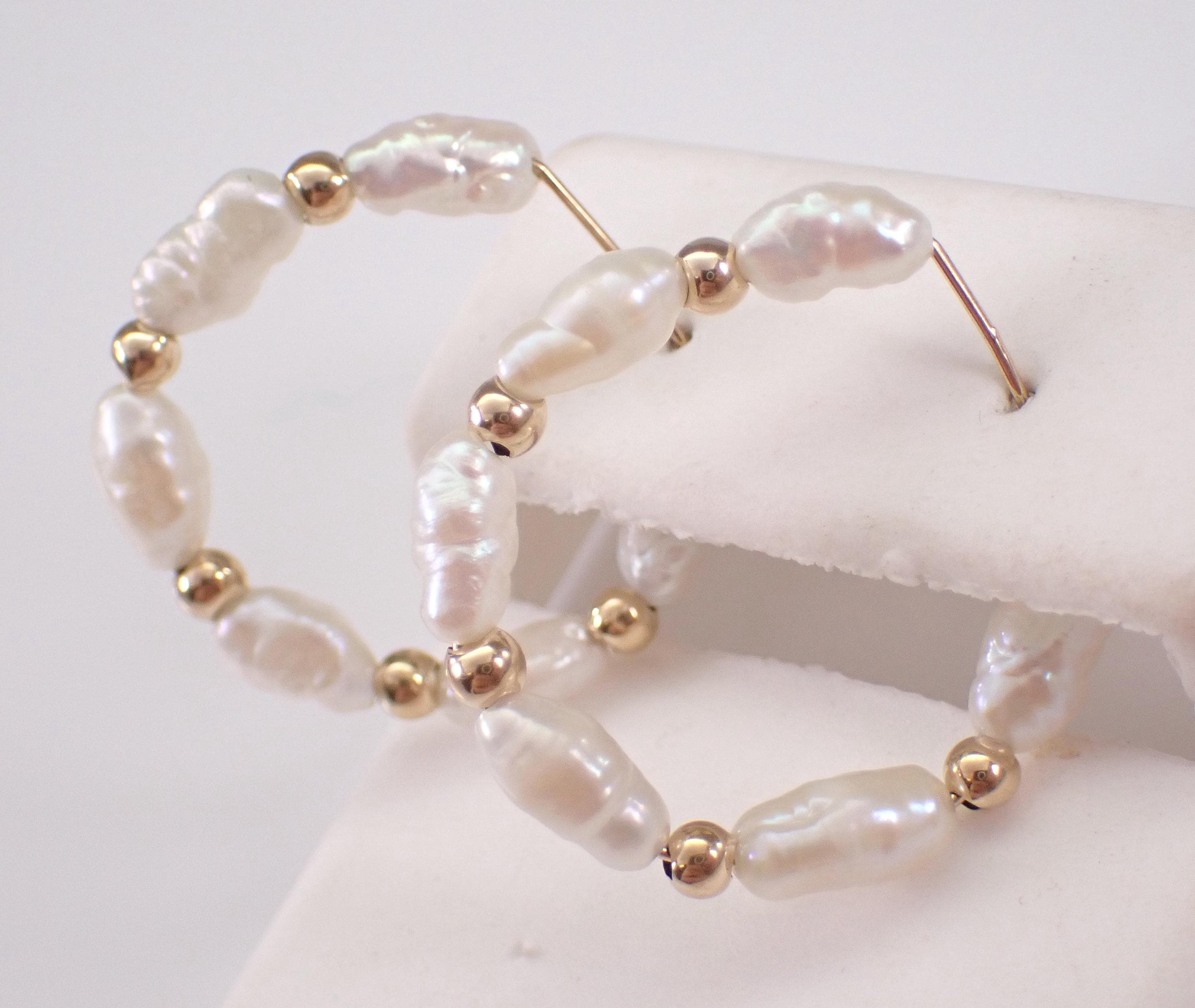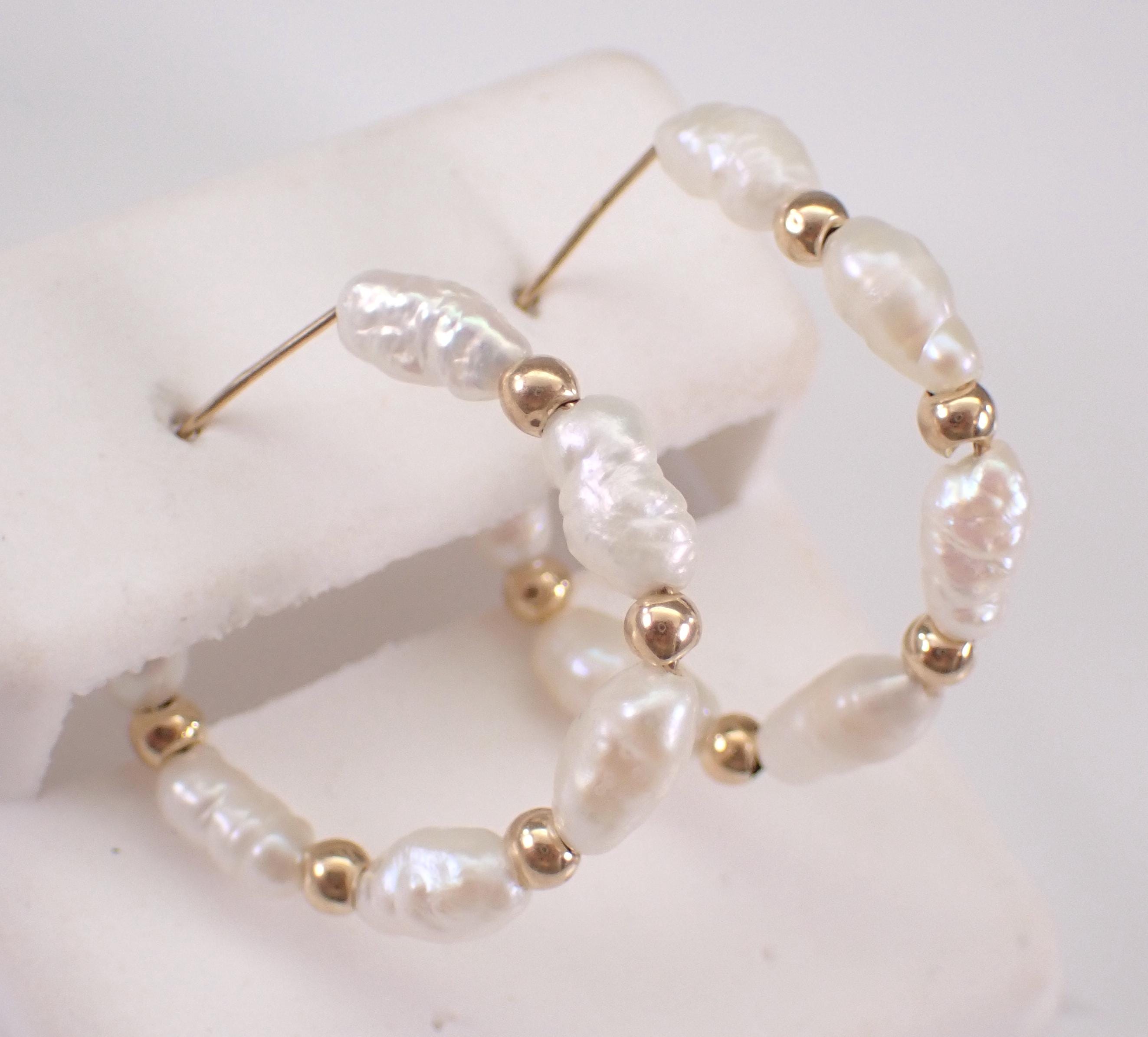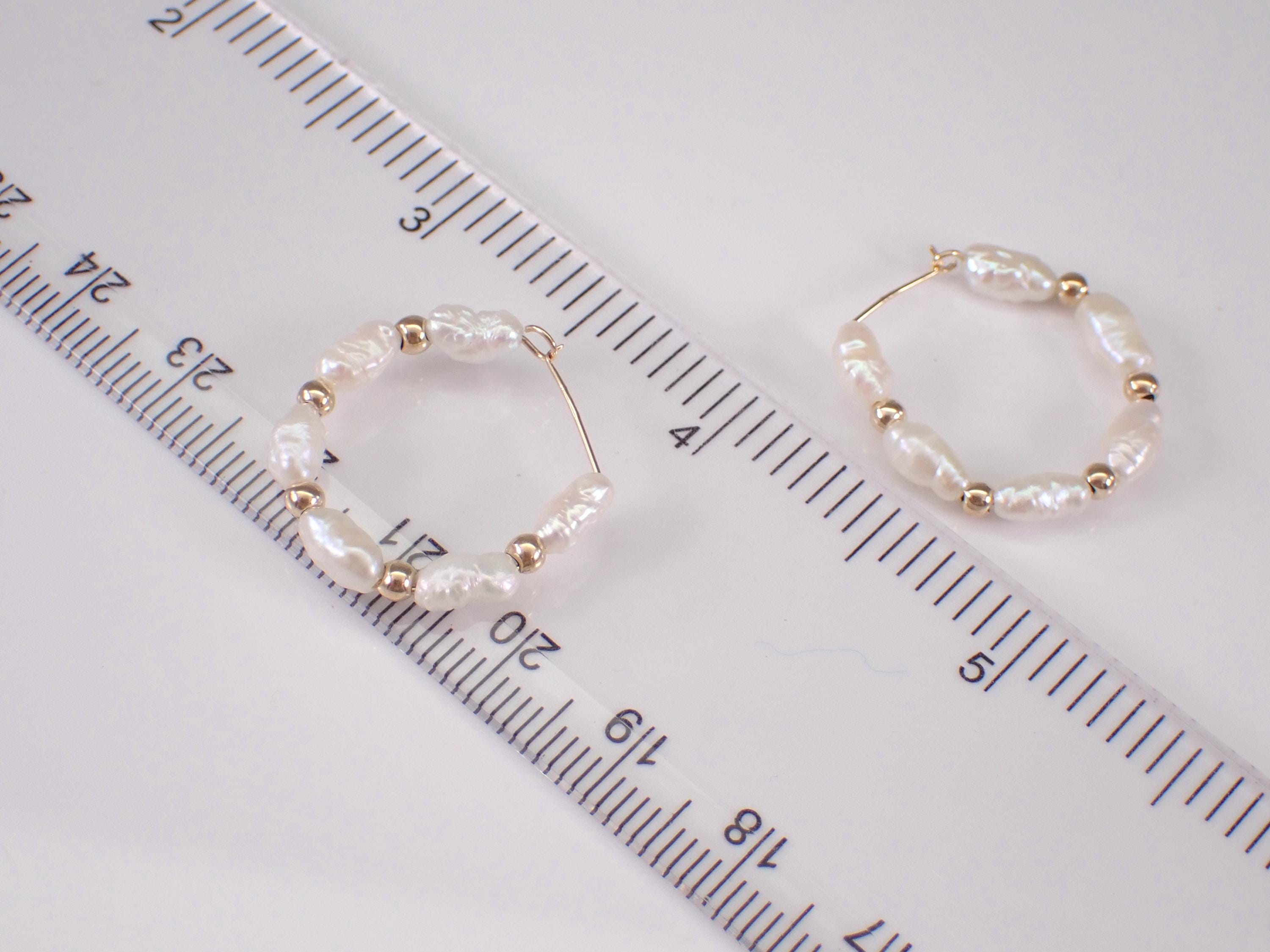 Vintage 14K Yellow Gold Pearl Hoop Earrings. These earrings are 14K Yellow Gold and weigh a total of 1.8 grams. These earrings are for pierced ears and measure 23 mm in diameter each. There are freshwater pearls strung up on 14k gold wire with gold beads between each. I will ship these earrings promptly in a gift box.