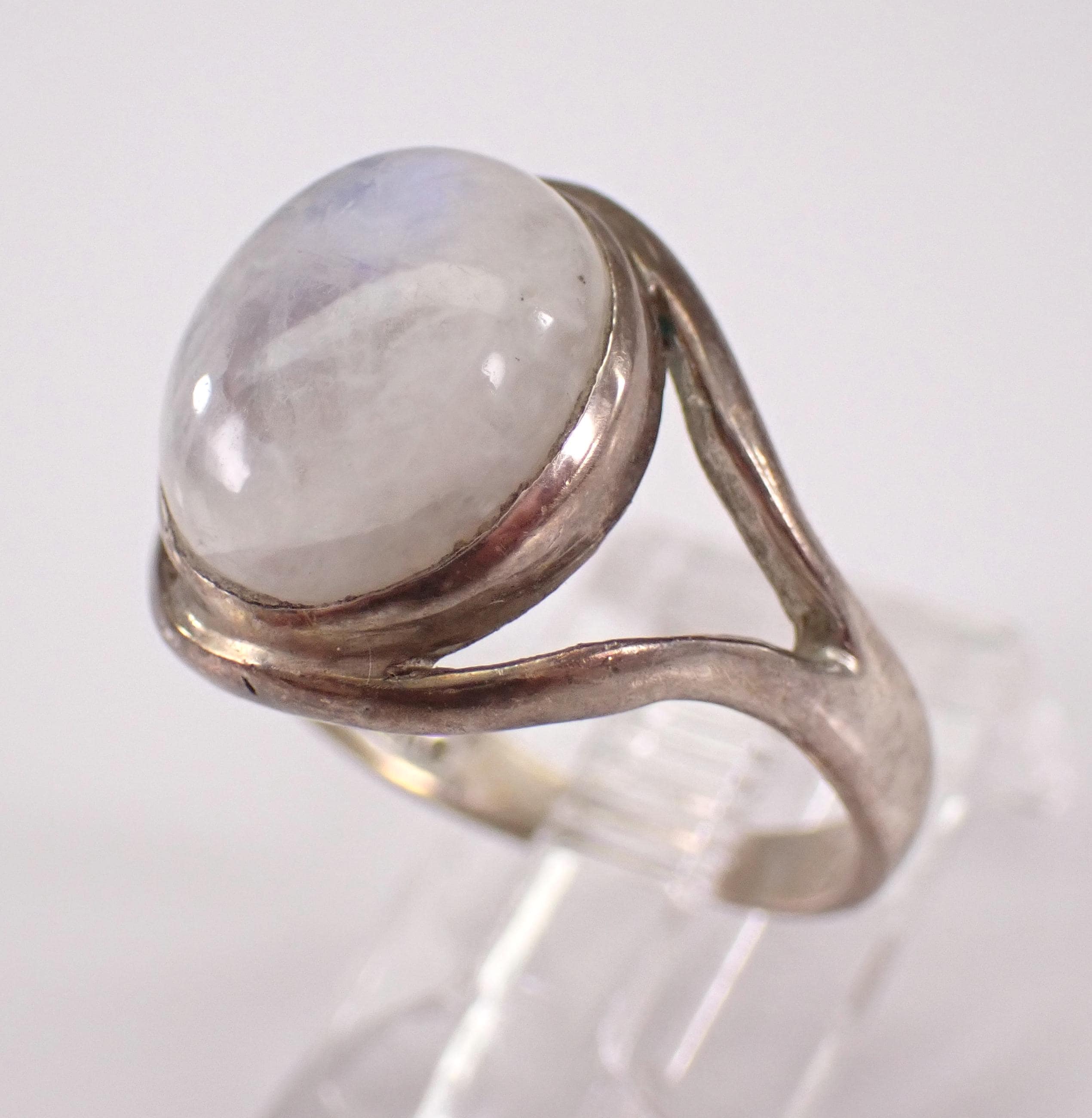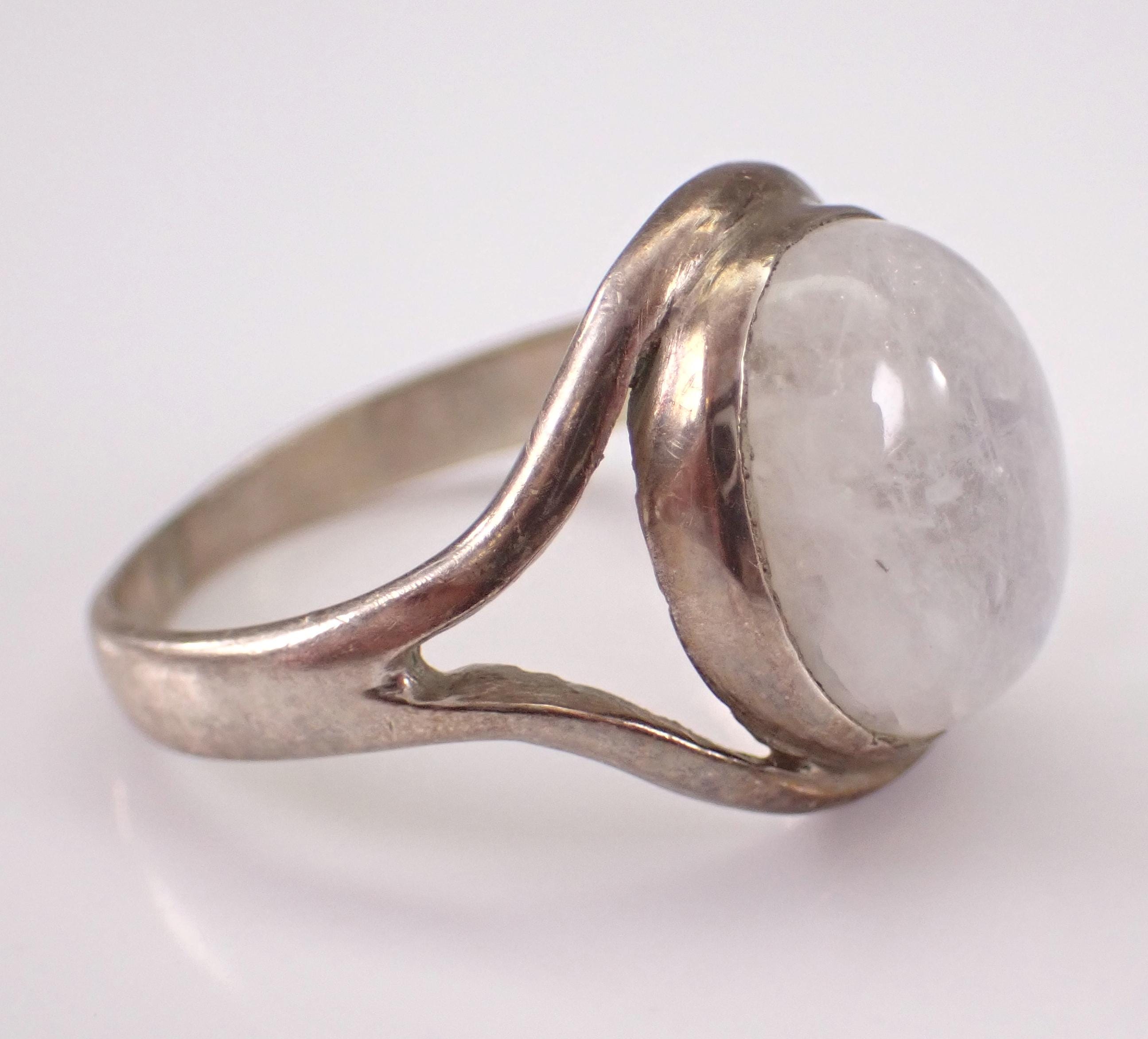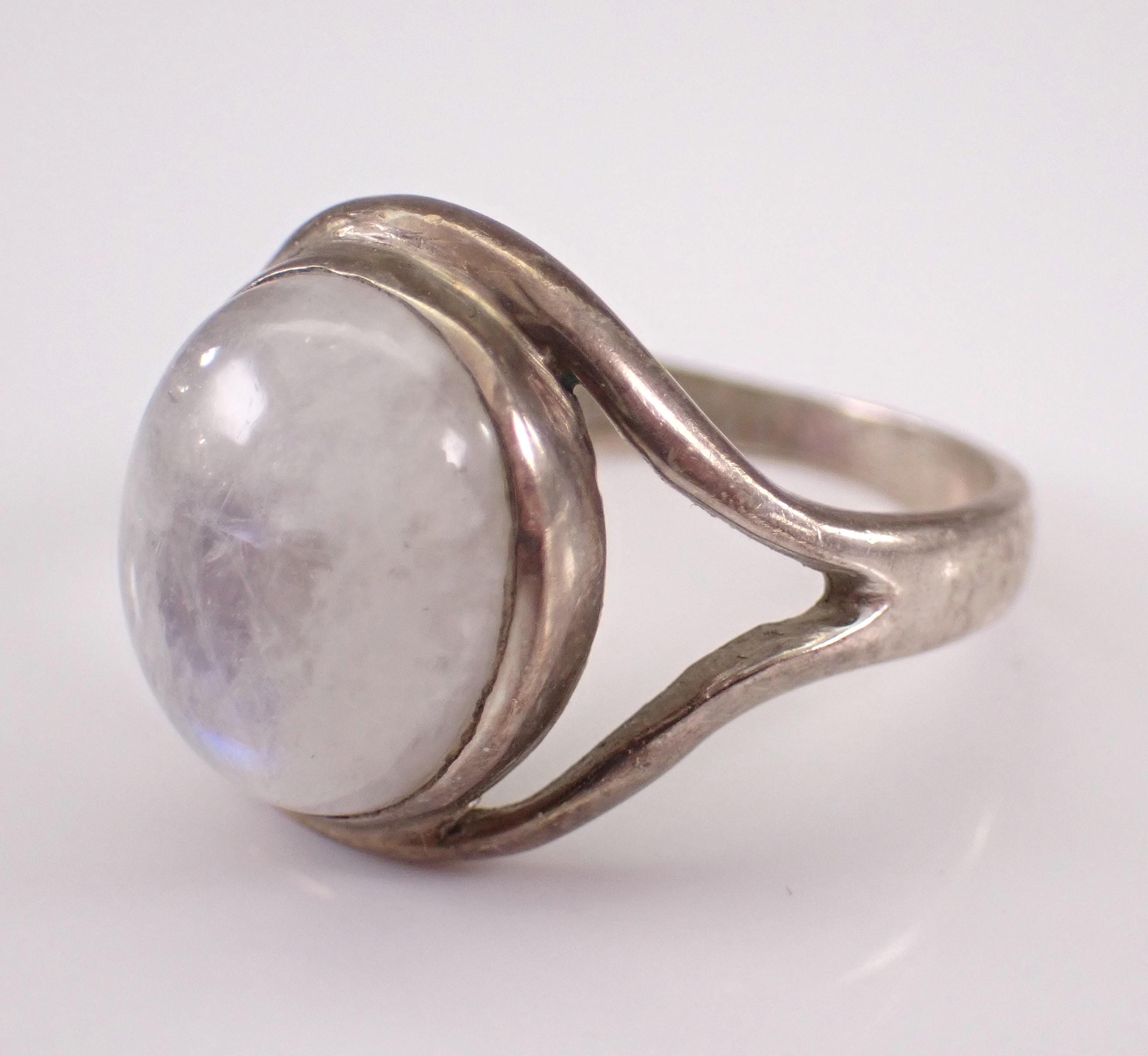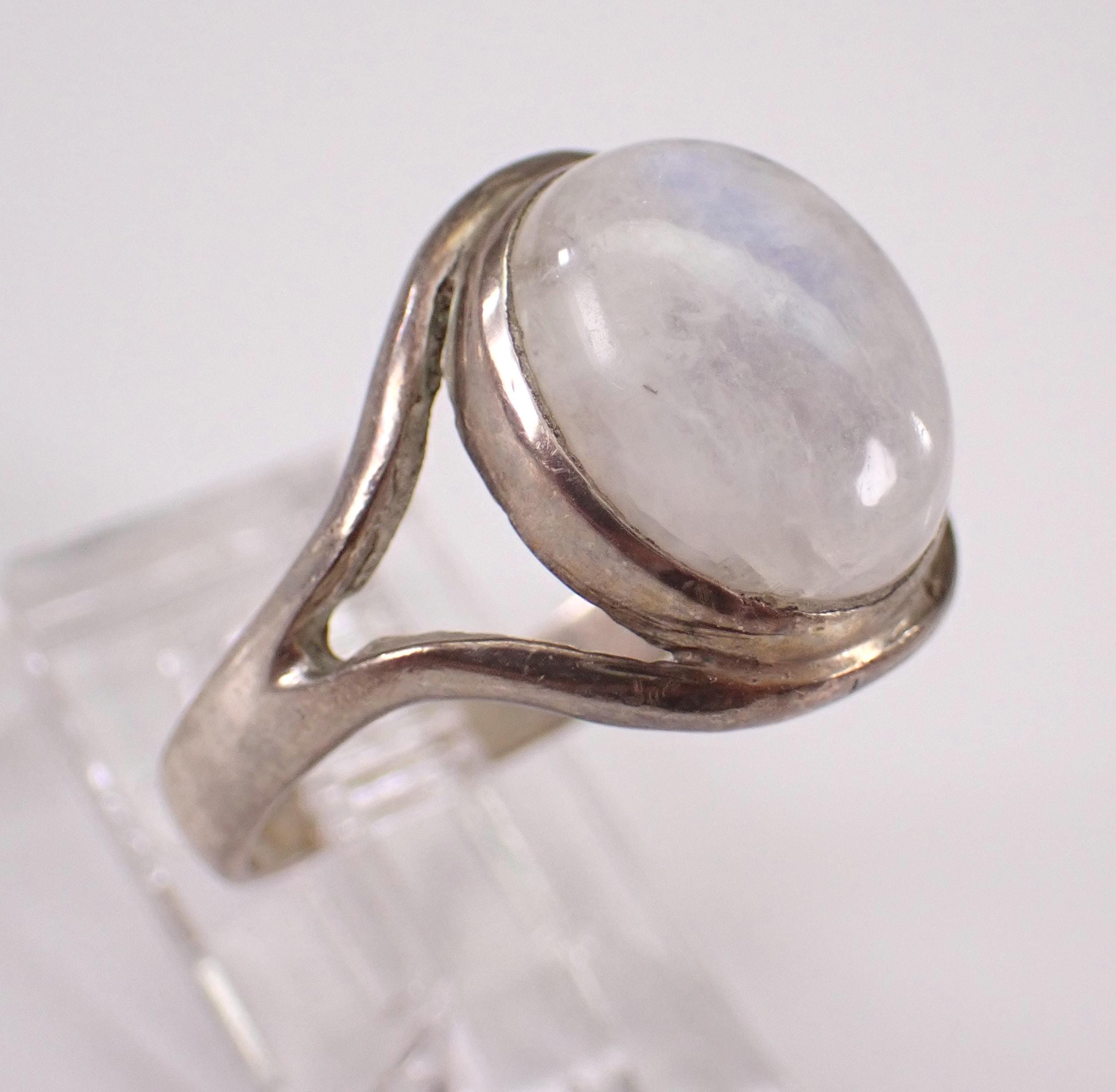 Vintage Sterling Silver Moonstone ring. There is an Oval Moonstone set in the center of this ring. This Moonstone measures 12 X 10 mm. This ring weighs 4.6 grams and is a finger size 7 1/2. This ring will be shipped promptly in a gift pouch.