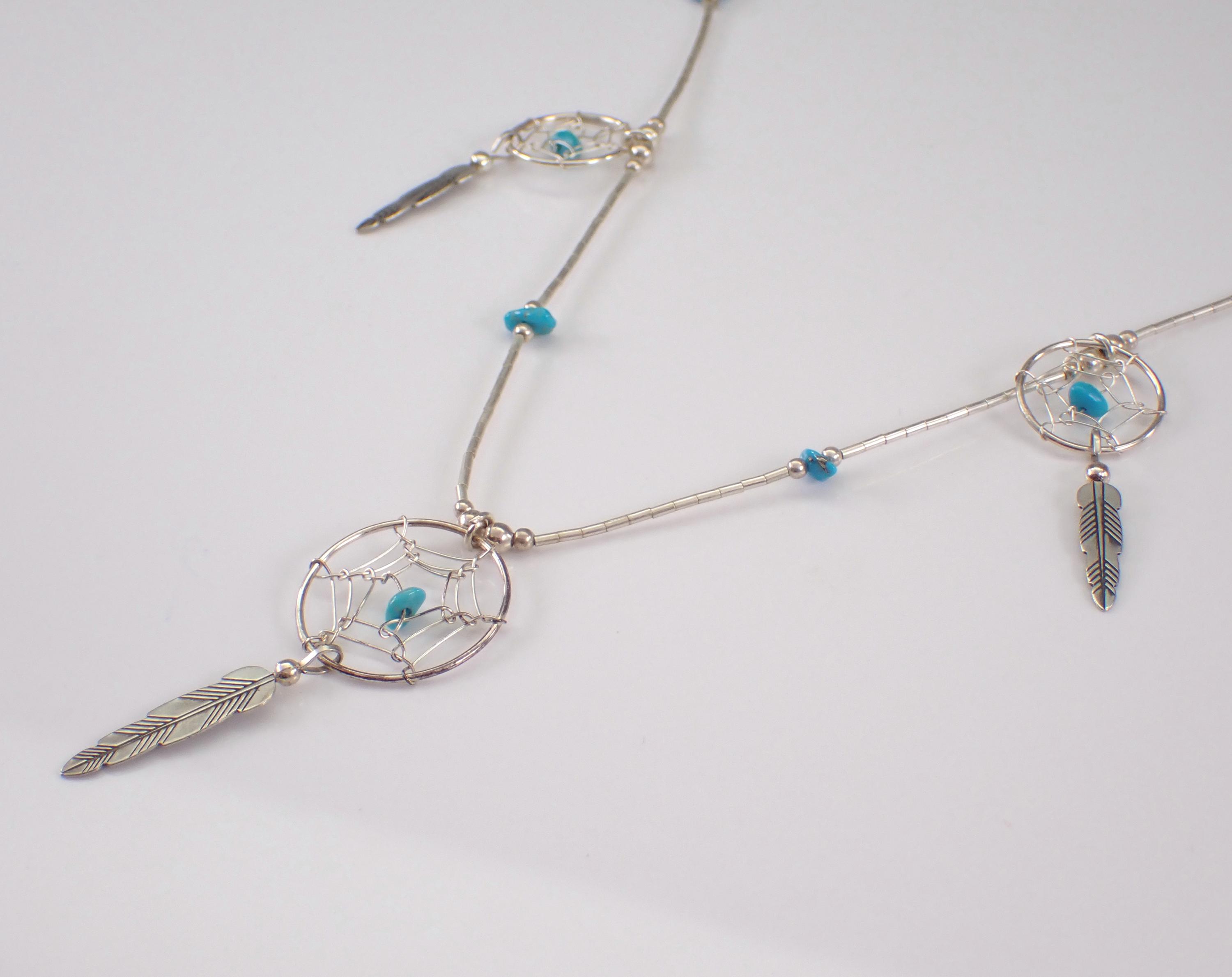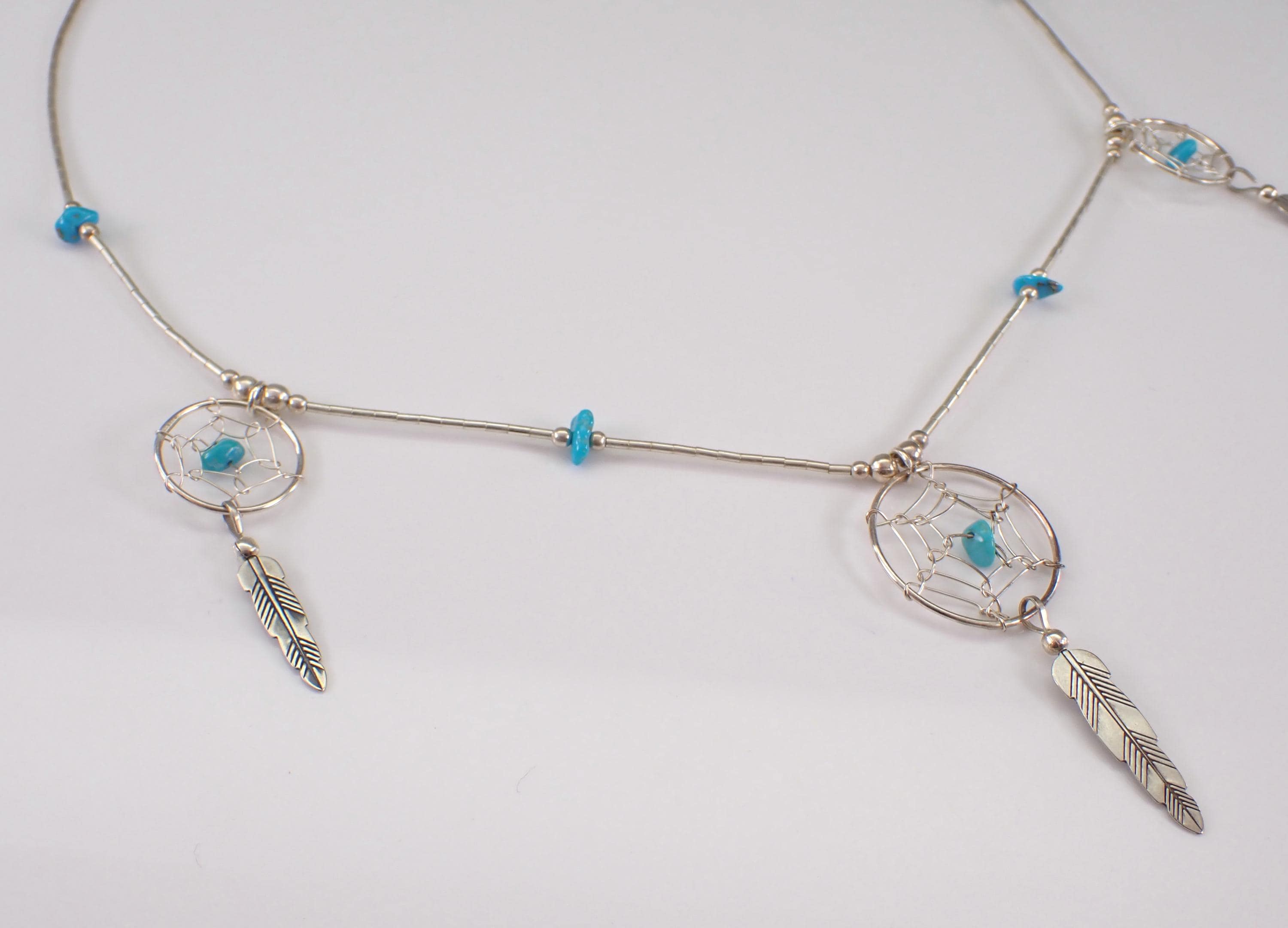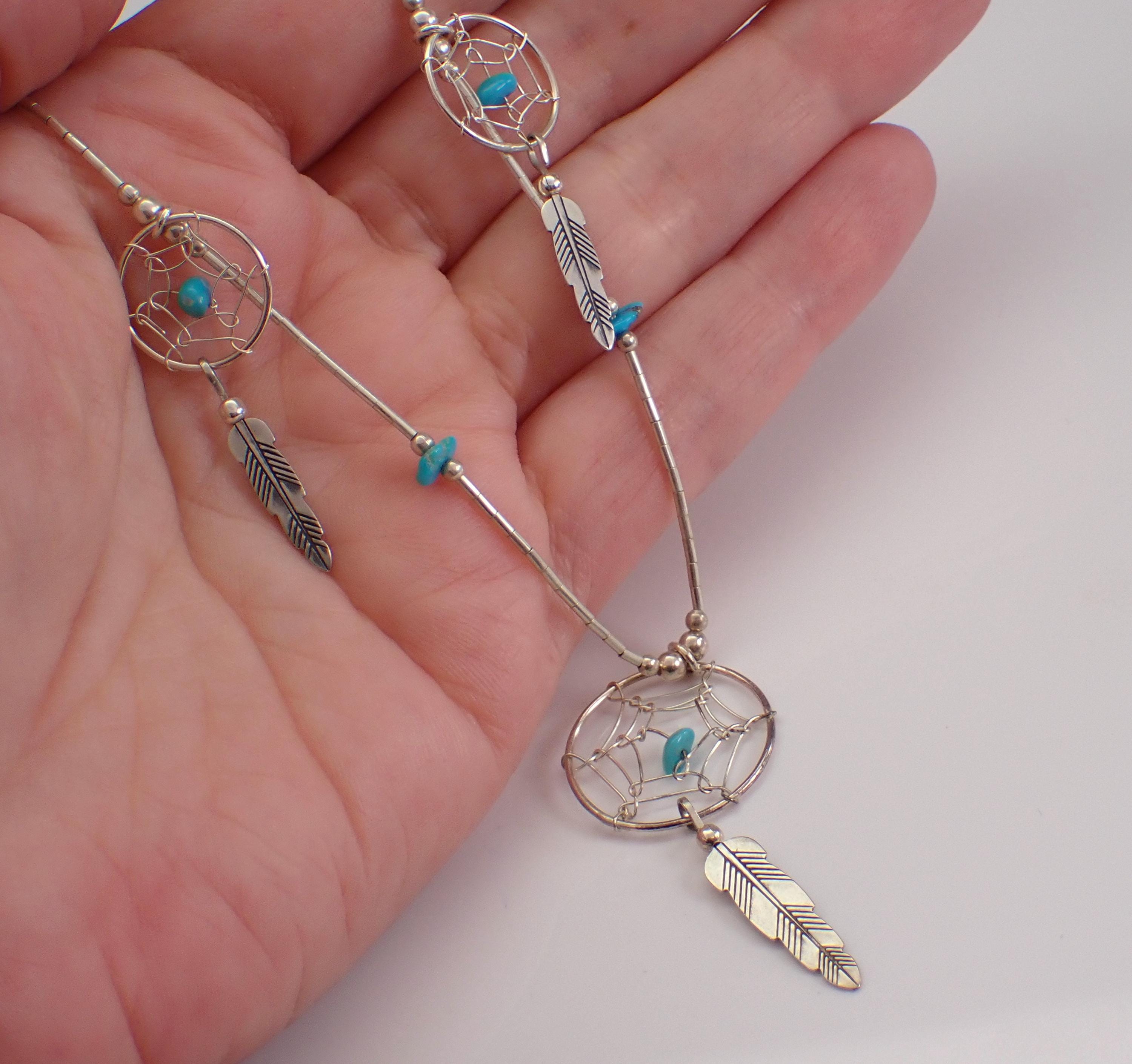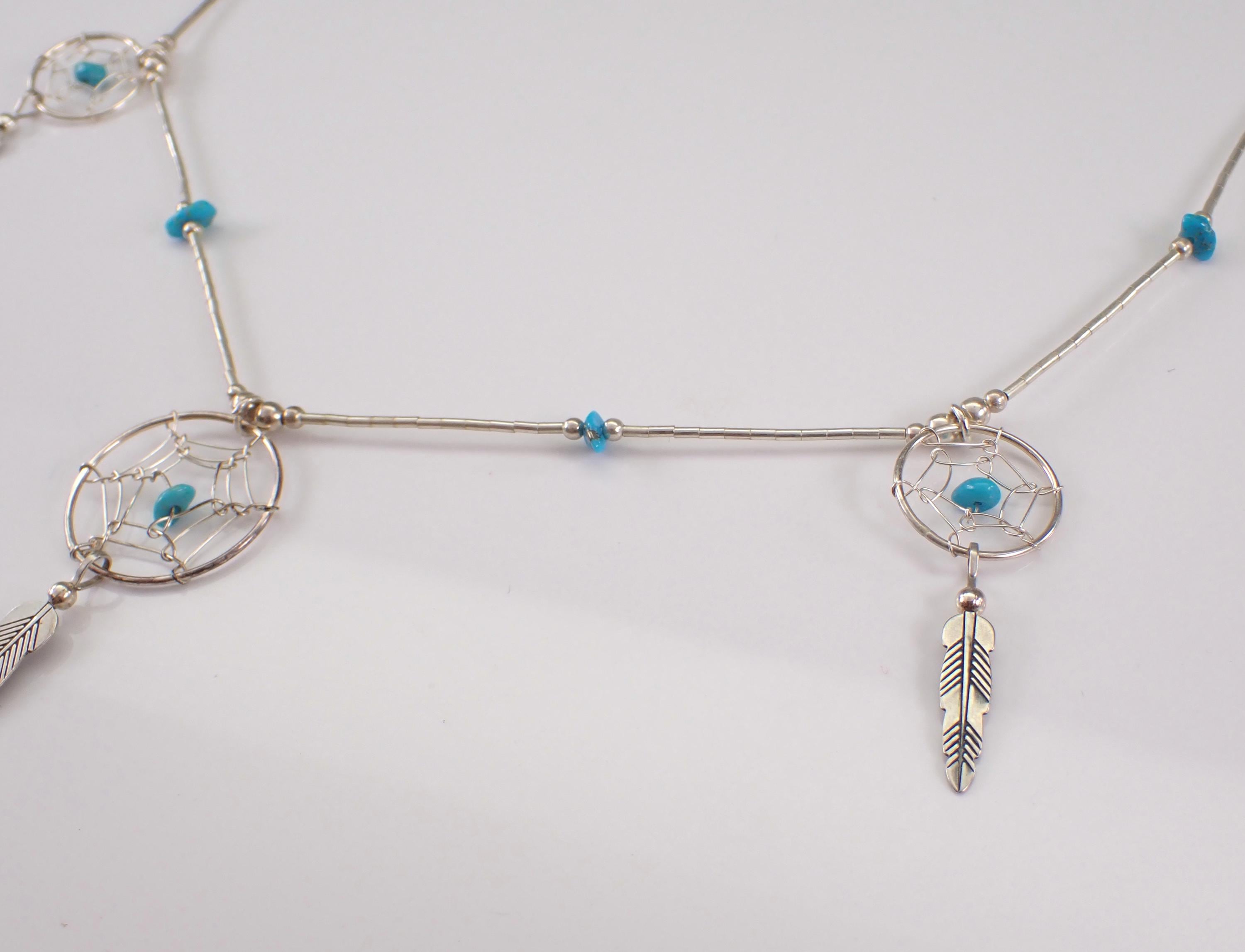 This necklace is Sterling Silver and the chain measures 16" in length. This necklace is set with genuine Turquoise on the chain and in the Dreamcatchers. There is also a feather dangling off each station. This necklace weighs 5.3 grams. This necklace is a very unusual and perfect for everyday wear, great gift for any occasion!