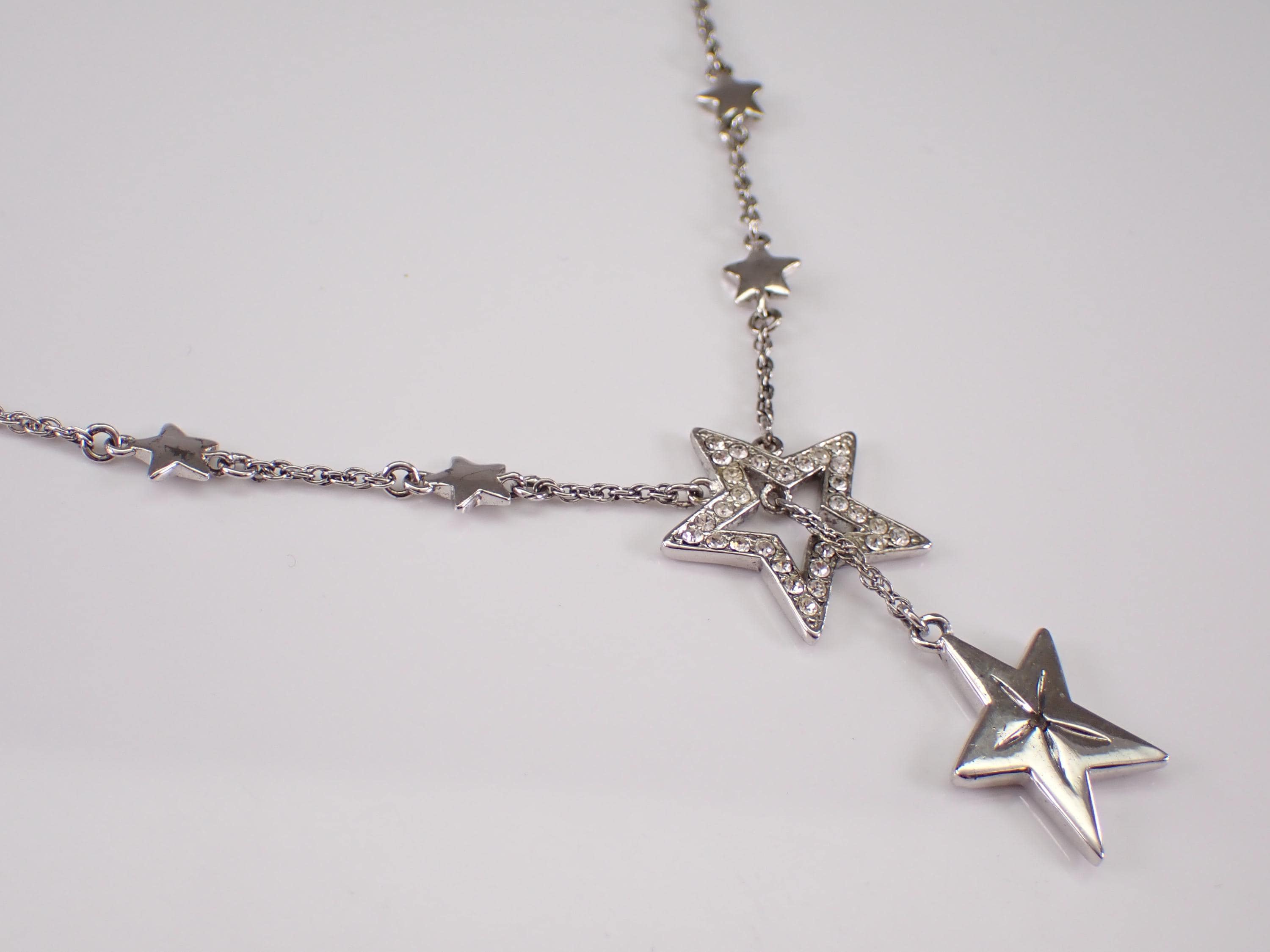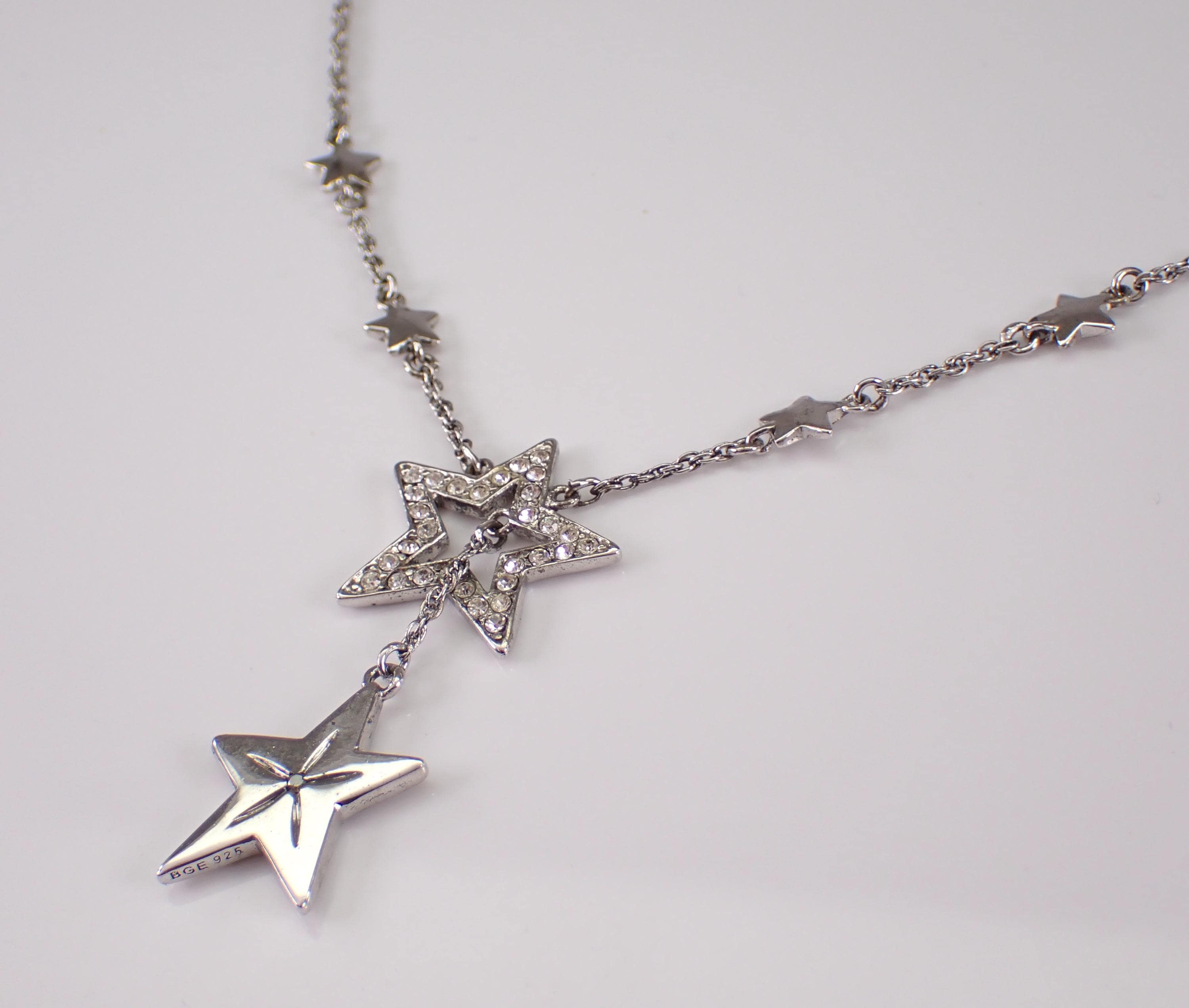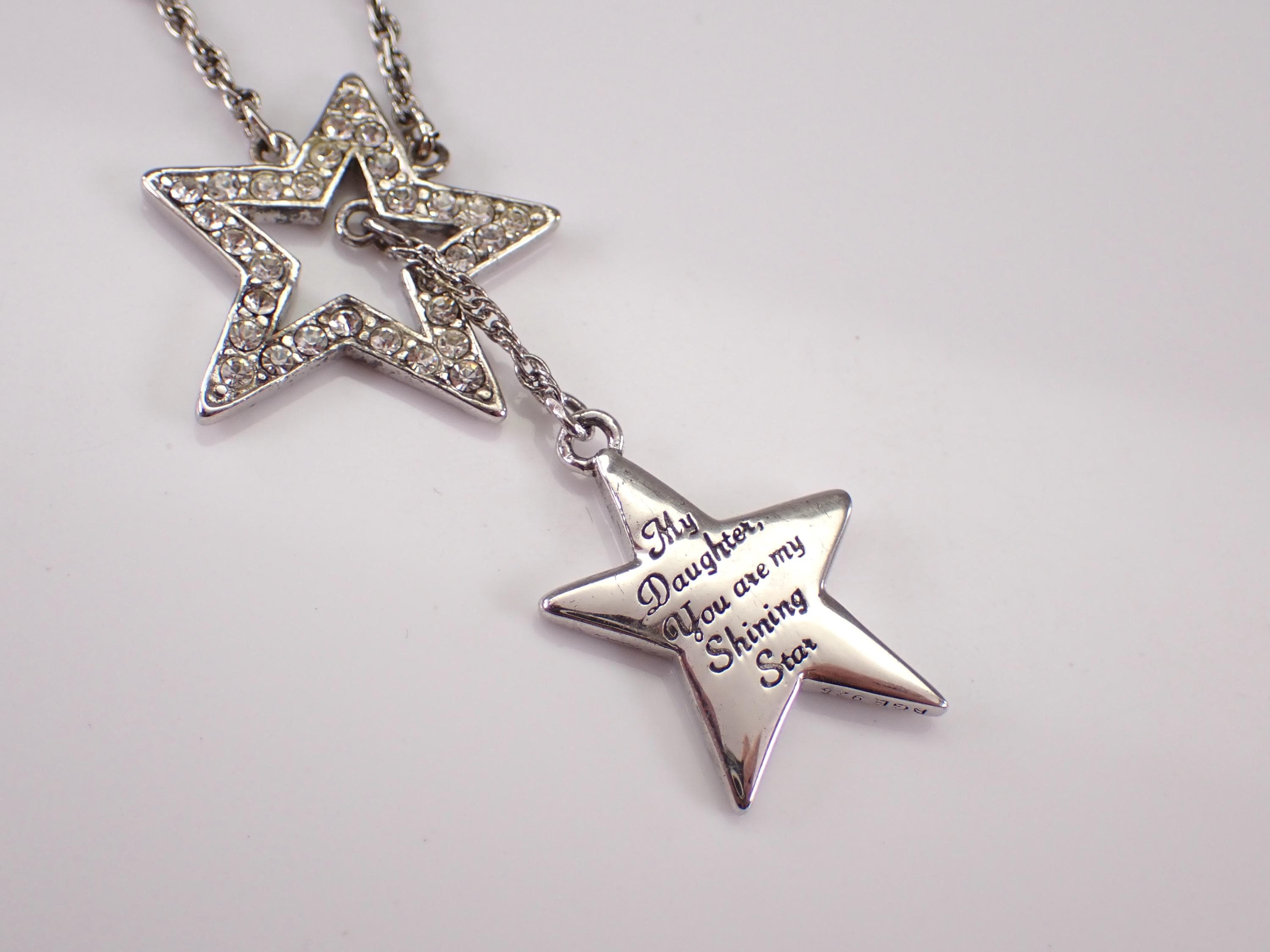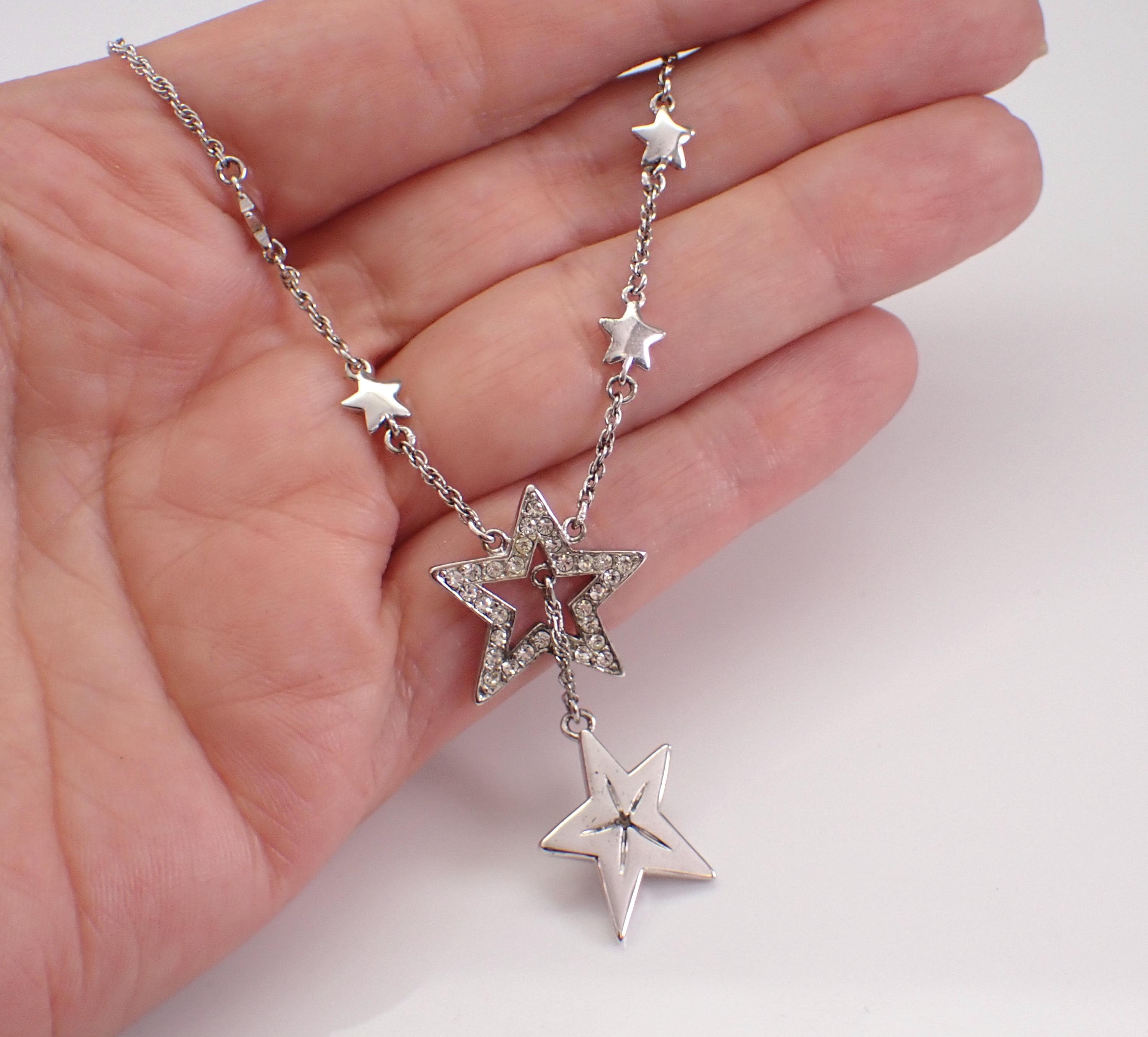 This necklace is Sterling Silver and the chain measures 18" in length. The center star charm is set with Cubic Zirconia. There is a dangling lariat star with engraving on the back. The larger star measures 18.5 X 20 mm and the smaller star measures 19 X 15 mm. This necklace weighs 8.0 grams. This necklace is a very unusual and perfect for everyday wear, great gift for any occasion!