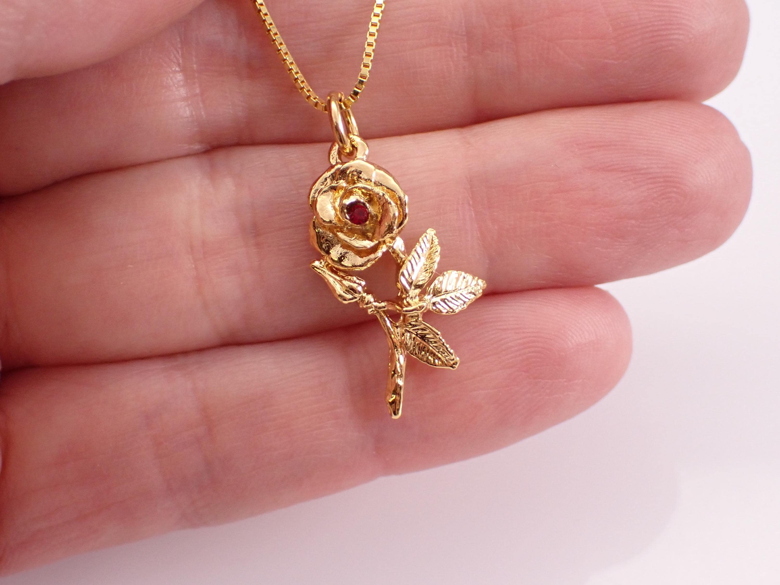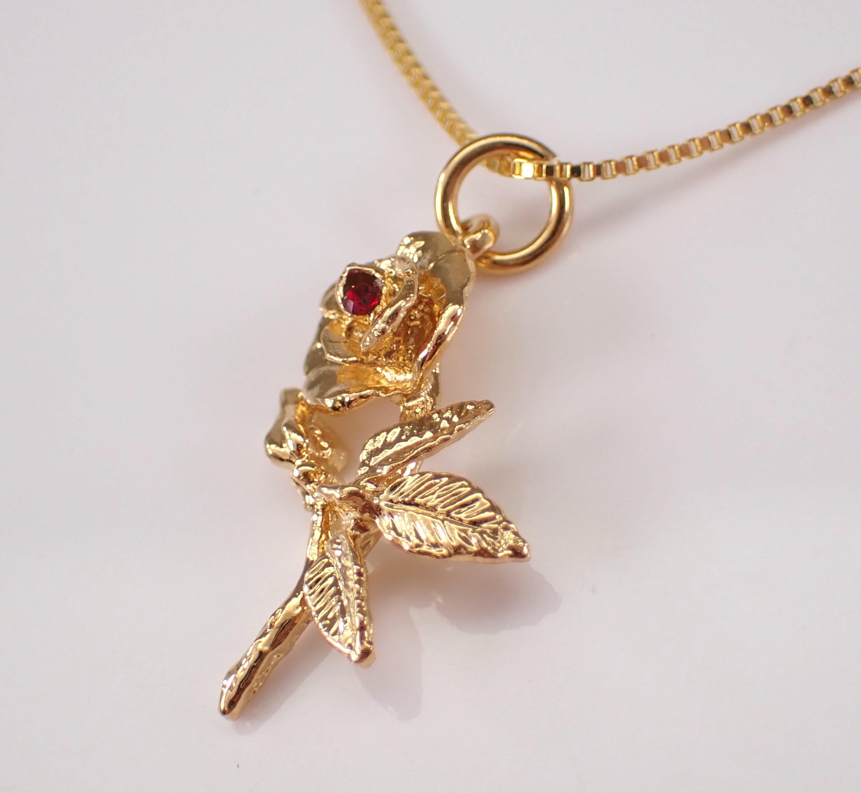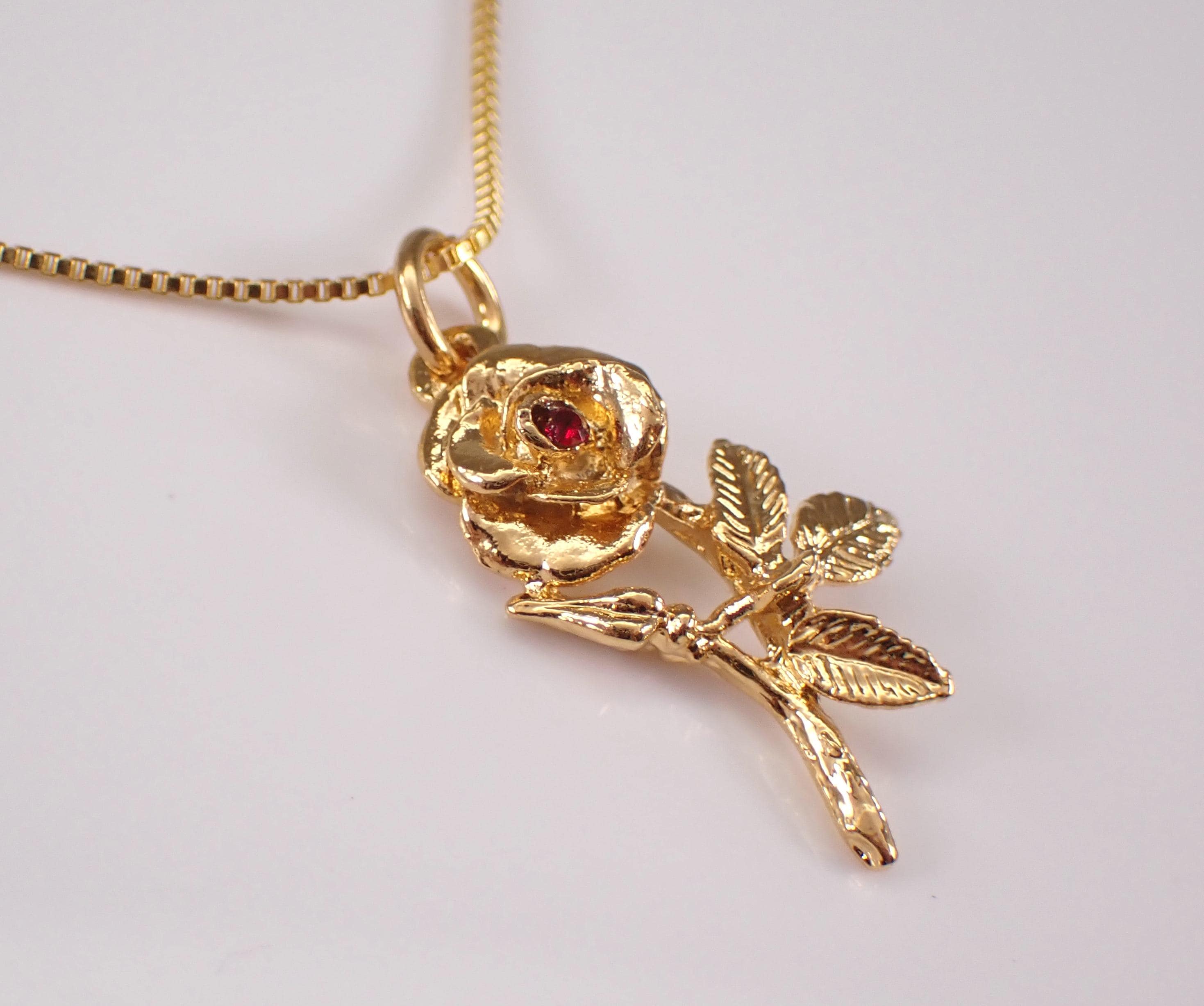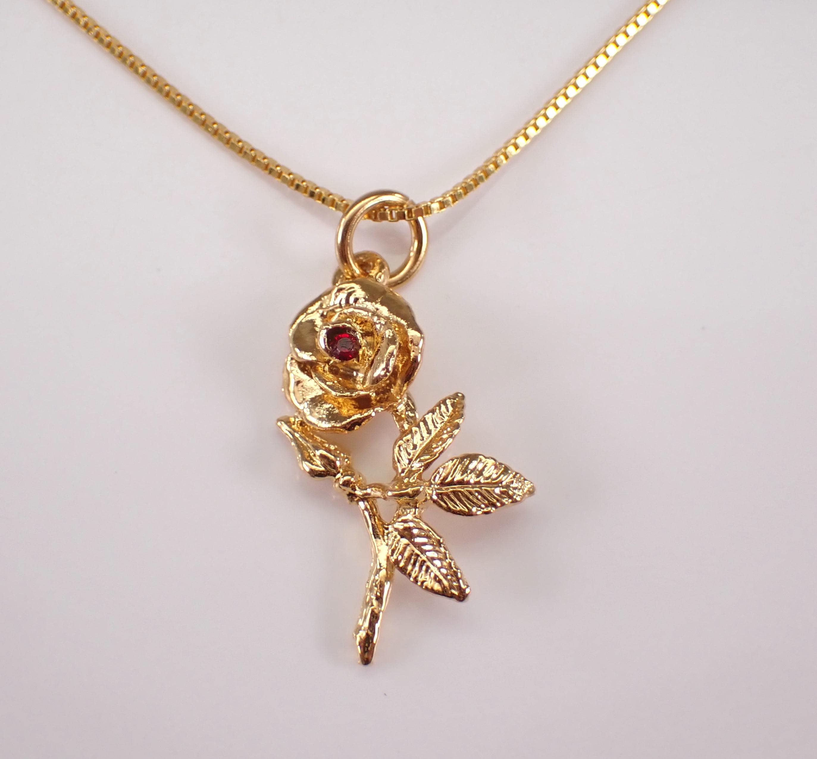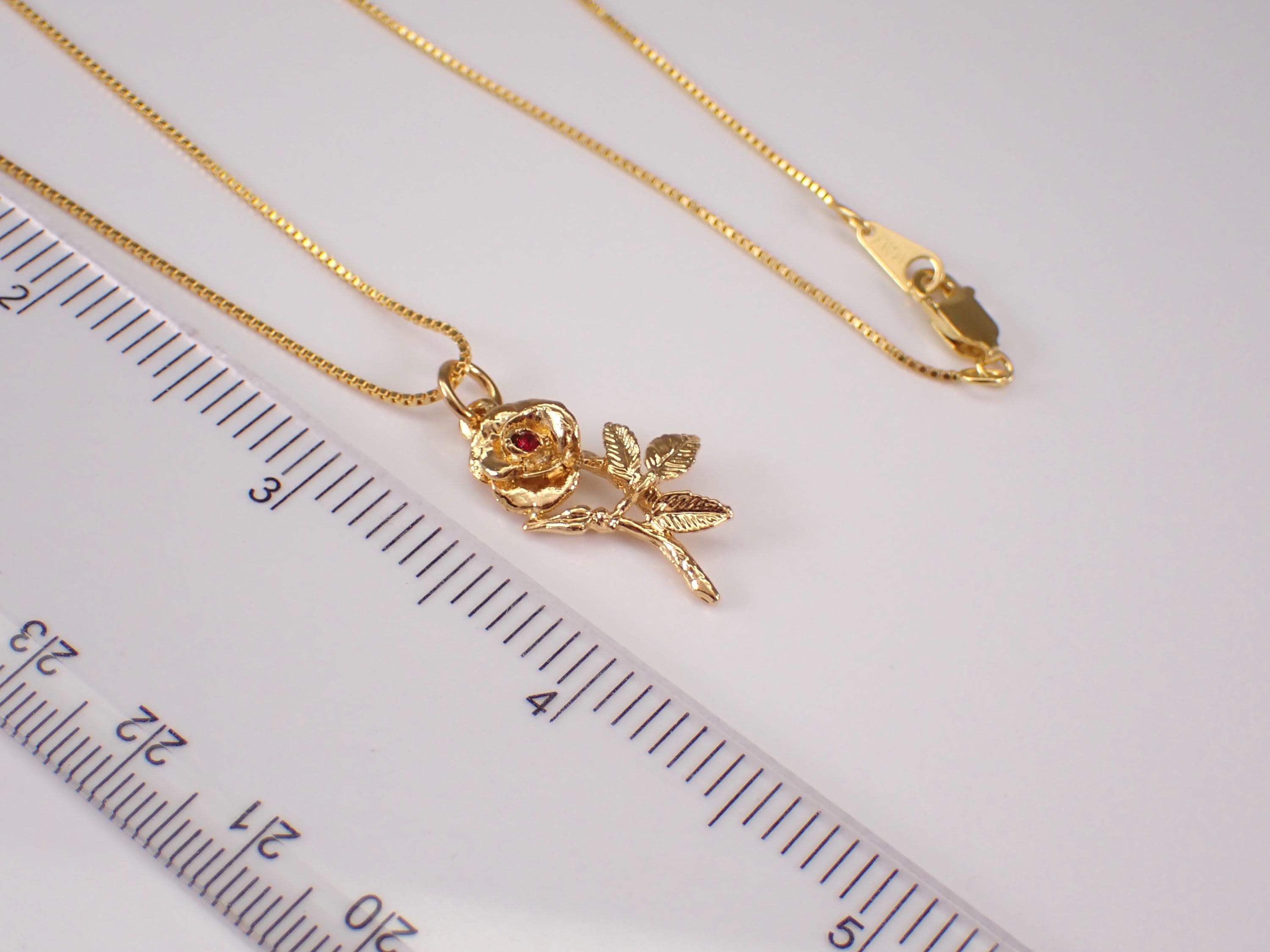 This pendant and chain are both Sterling Silver (gold plated) and the chain measures 22" in length. The pendant is set with a round Lab created ruby. This charm that measures 22 mm in length without the bail. This necklace weighs 3.9 grams. This necklace is perfect for everyday wear, great gift for any occasion! Will be shipped promptly in a gift pouch.